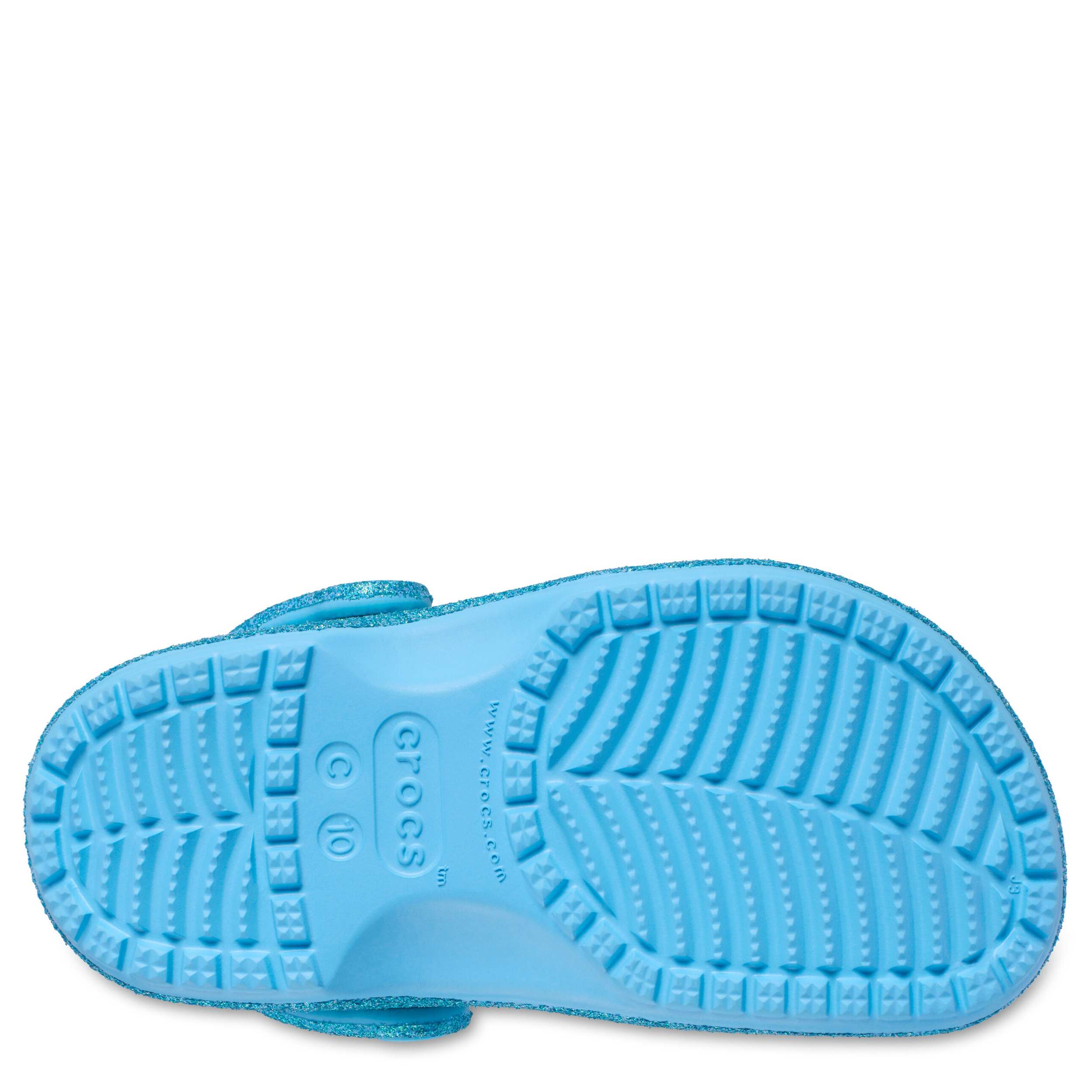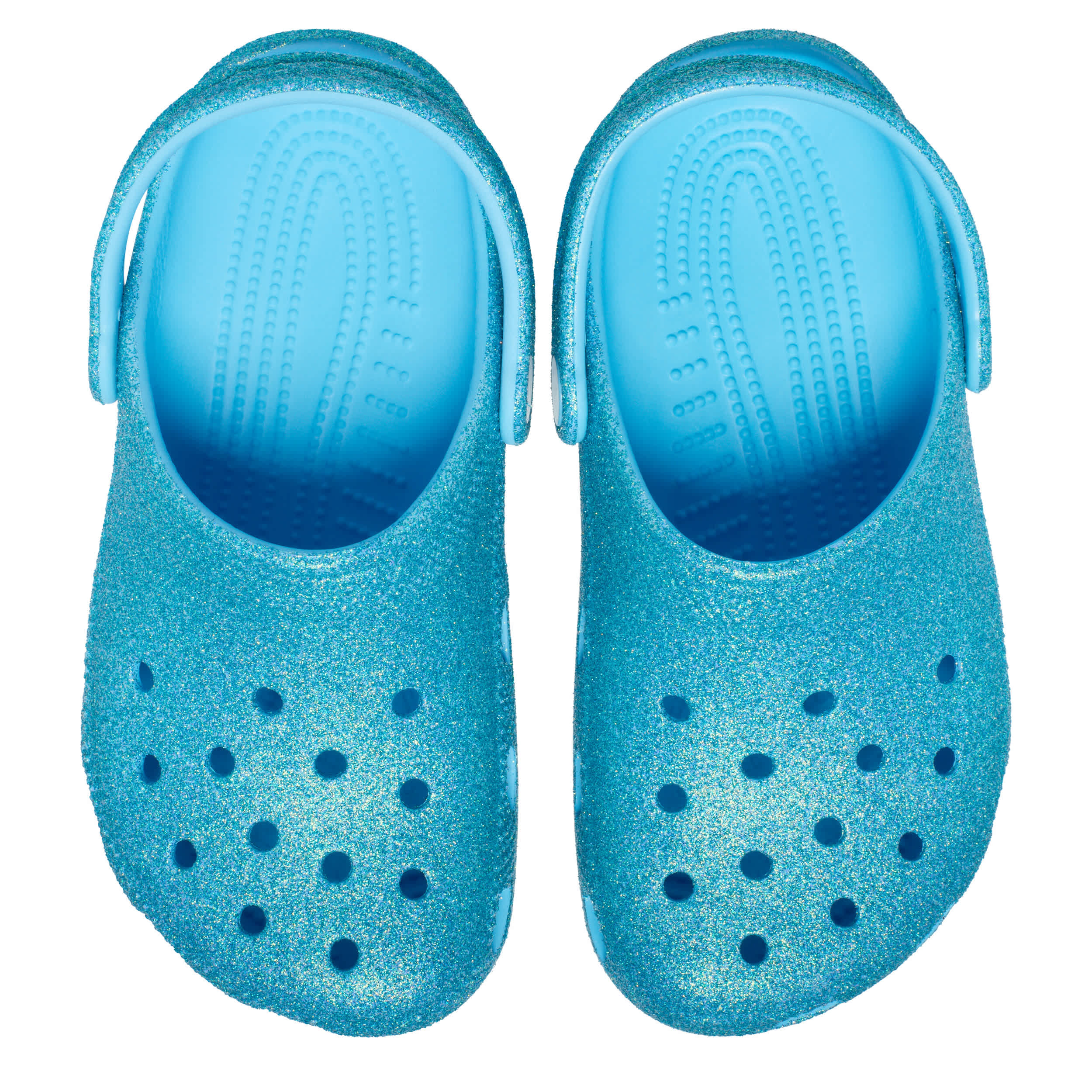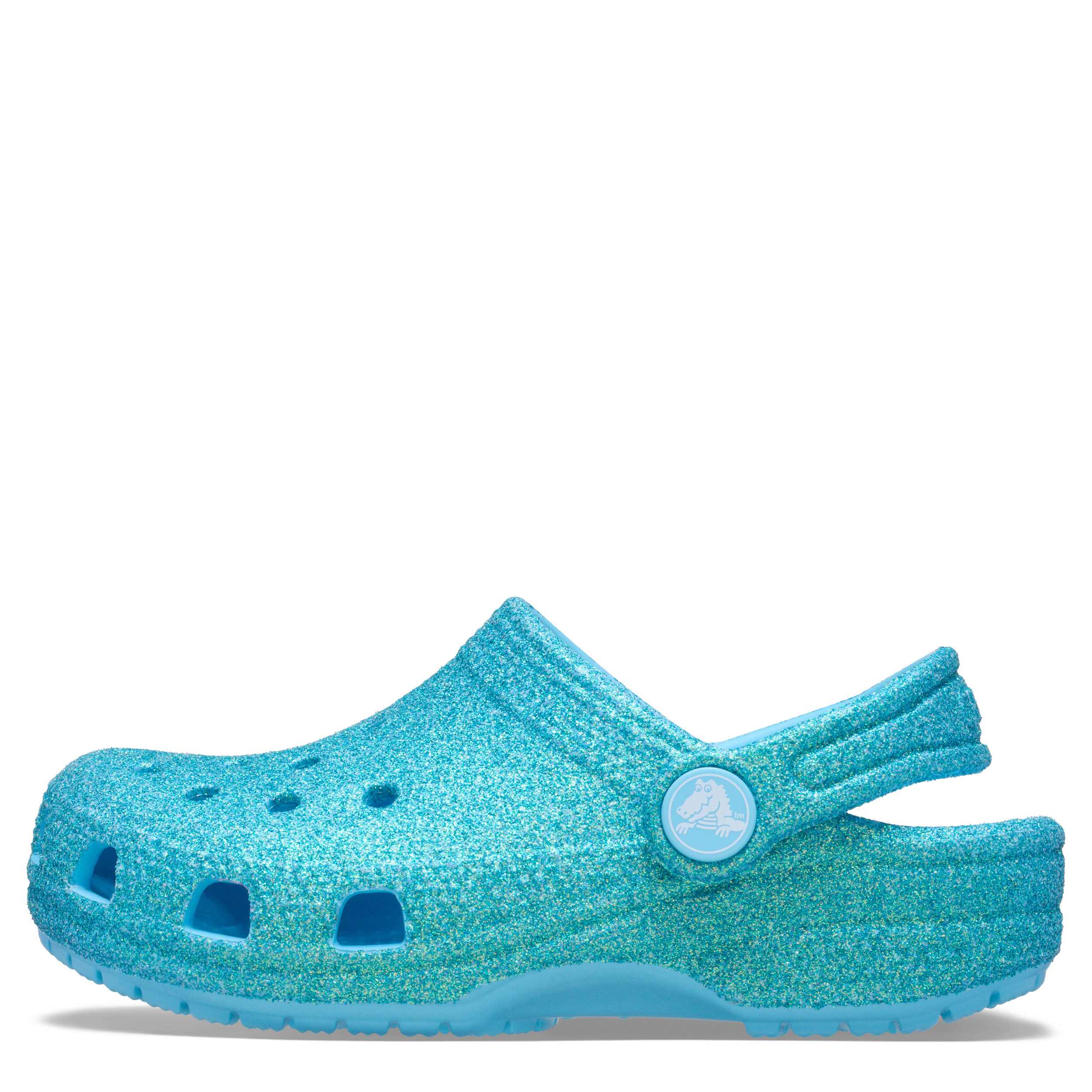 She can't go wrong with the Classic Glitter girls' clog by Crocs. The Iconic Crocs Comfort material offers lightweight, flexible cushioning and a gentle massaging sensation, while the well-ventilated upper circulates air for a cool, dry fit in these blue glitter Crocs.