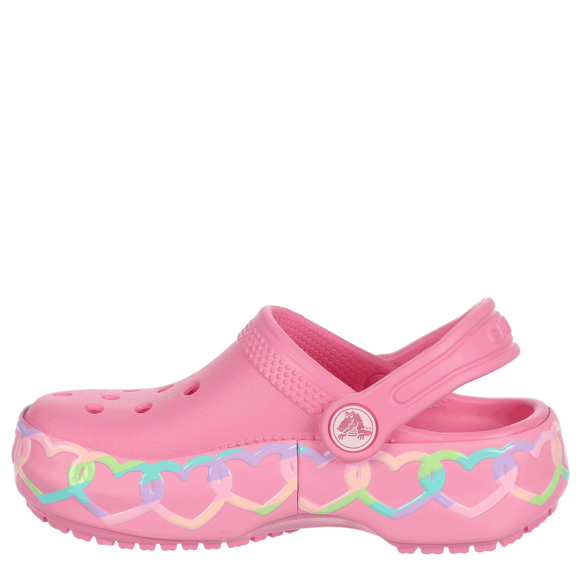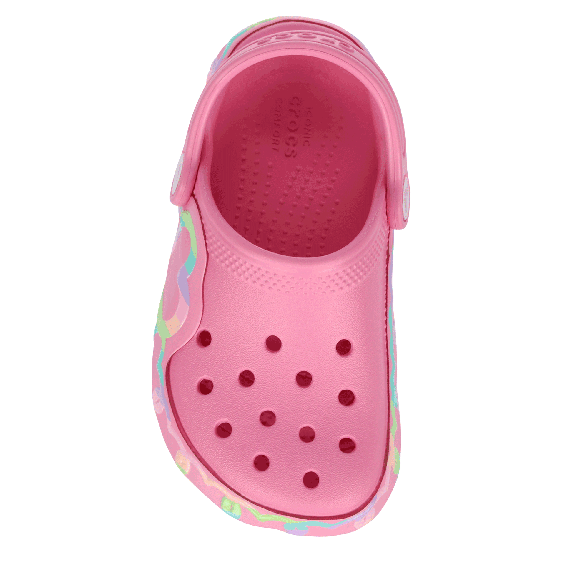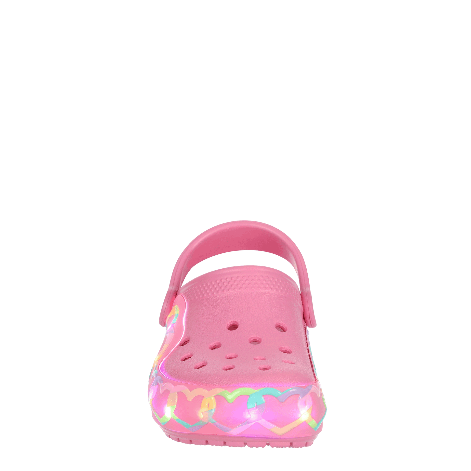 A rainbow heart chain and fun lights make the Classic Heart girls' light up clog by Crocs a treat for your daughter. The Iconic Crocs Comfortâ„¢ material offers lightweight, flexible 360-degree comfort, while the Crosliteâ„¢ foam upper circulates air for enhanced breathability. Batteries for the long-lasting LED lights are not replaceable.