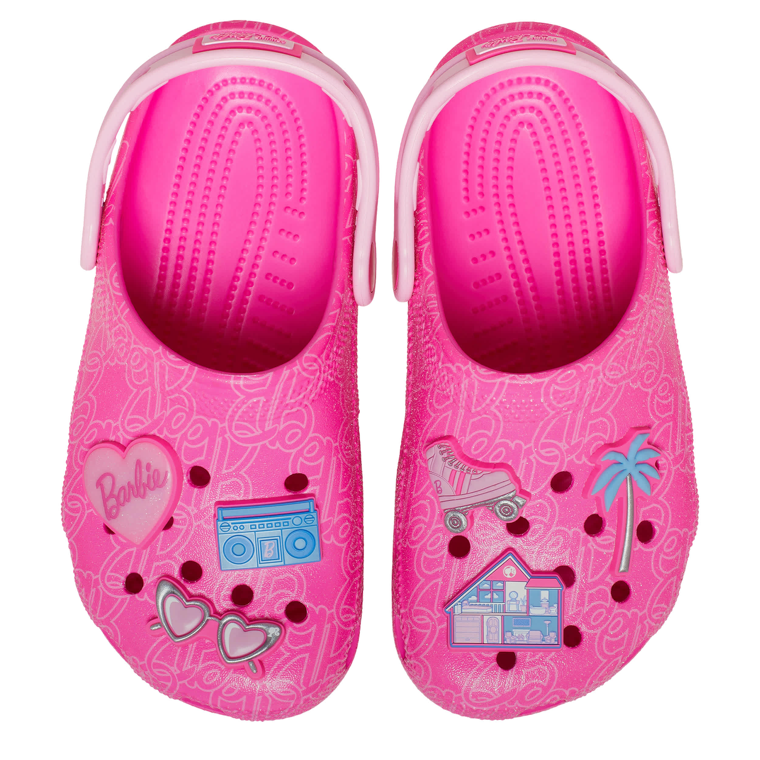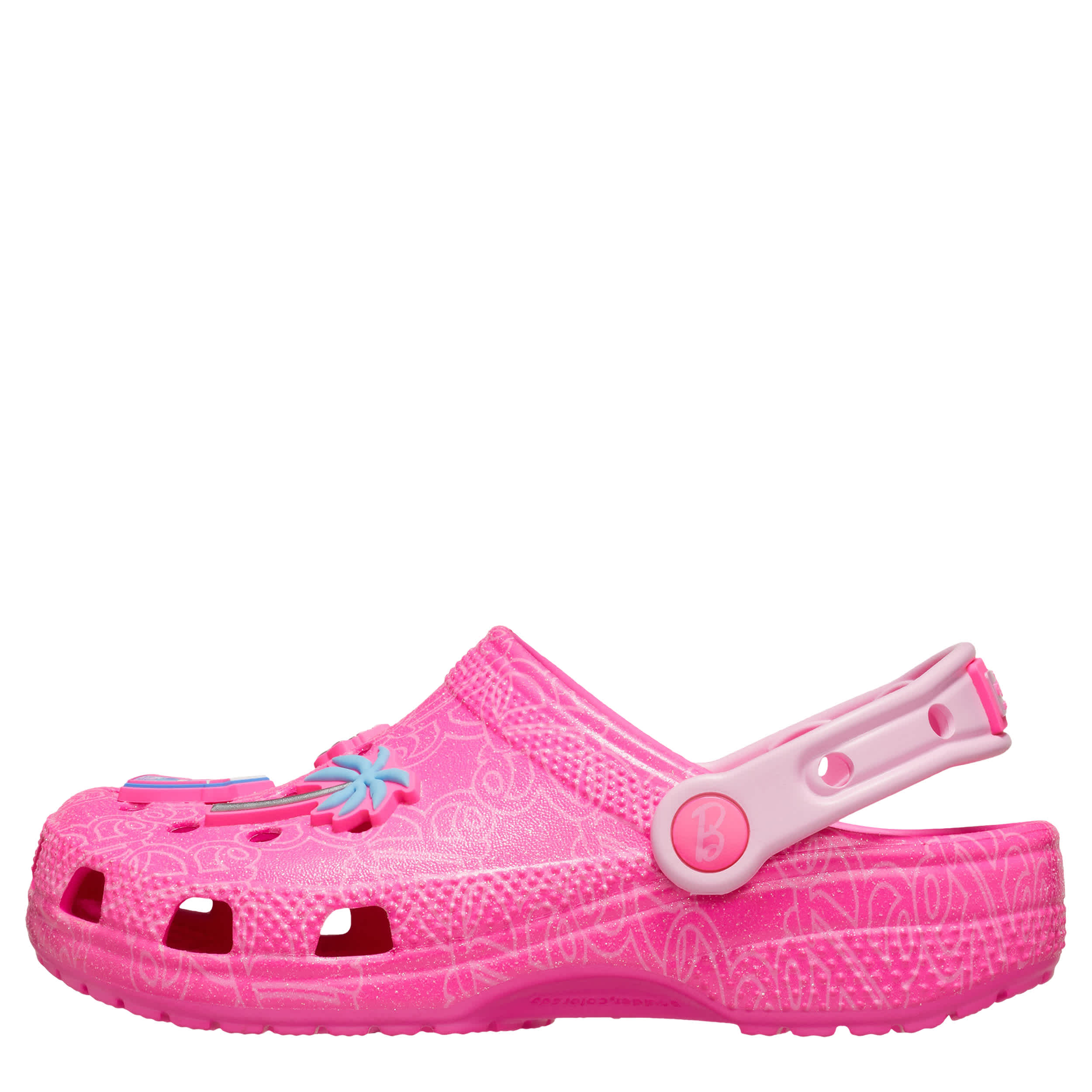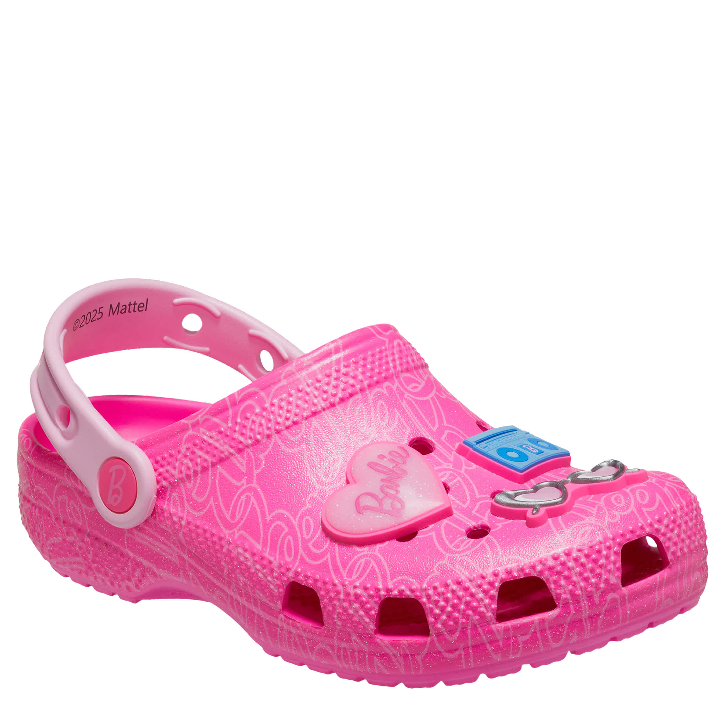 The new Barbieâ„¢ Classic Clog is the perfect statement shoe for fashion icons everywhere. This comfortably chic style comes in a power pink hue with a stylish all-over monogram print. Make your look shine with exclusive Jibbitzâ„¢ charms featuring a Dreamhouseâ„¢, roller skate, palm tree, heart sunglasses, and Barbieâ„¢ logo.