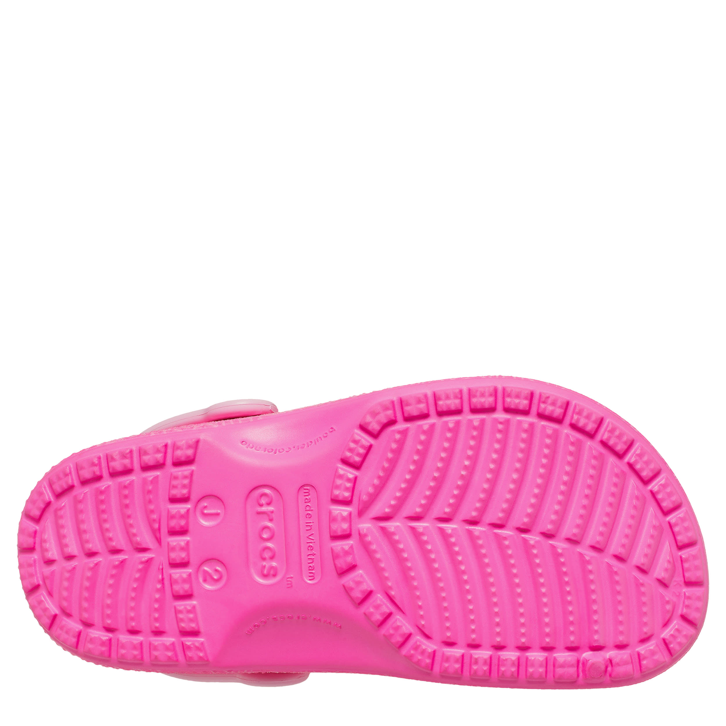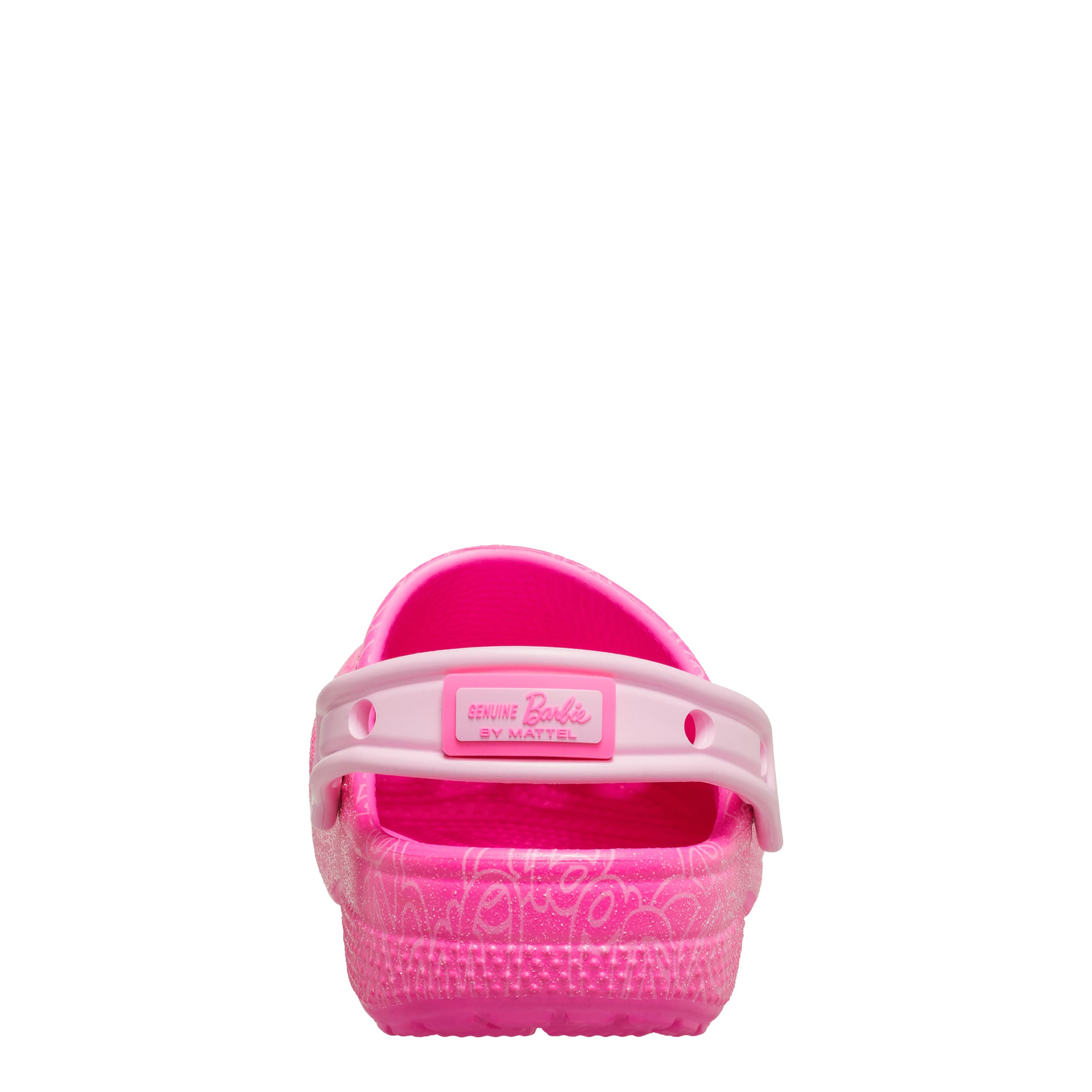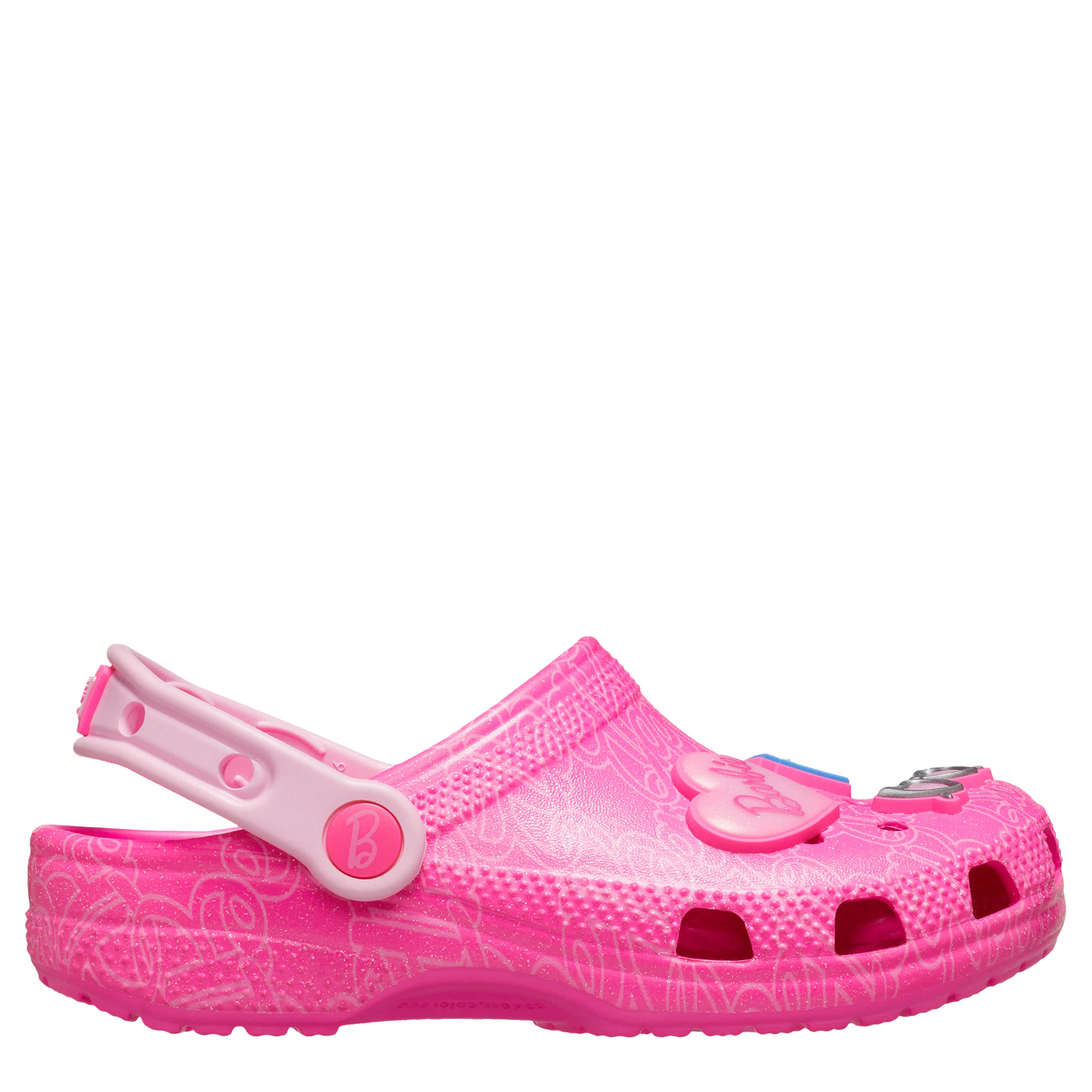 The new Barbieâ„¢ Classic Clog is the perfect statement shoe for fashion icons everywhere. This comfortably chic style comes in a power pink hue with a stylish all-over monogram print. Make your look shine with exclusive Jibbitzâ„¢ charms featuring a Dreamhouseâ„¢, roller skate, palm tree, heart sunglasses, and Barbieâ„¢ logo.