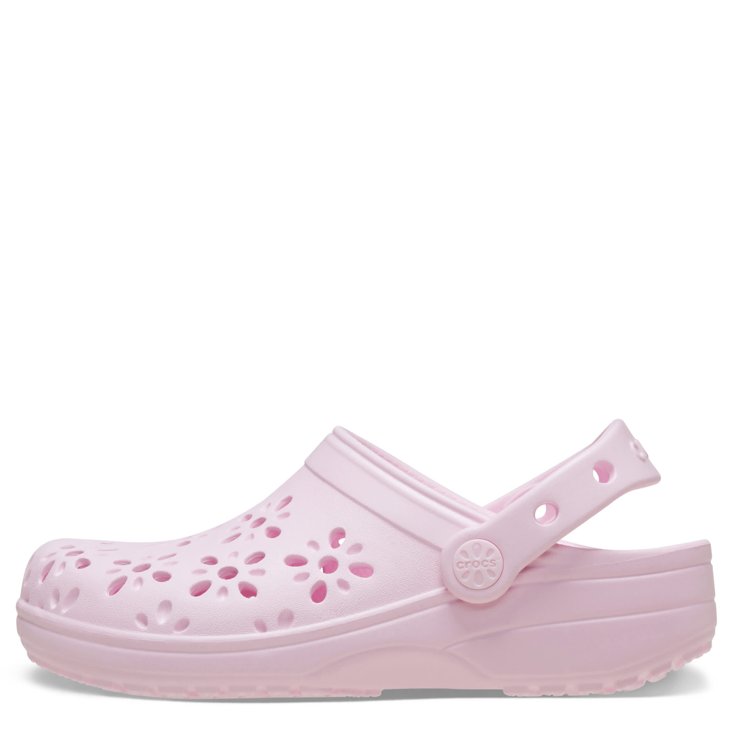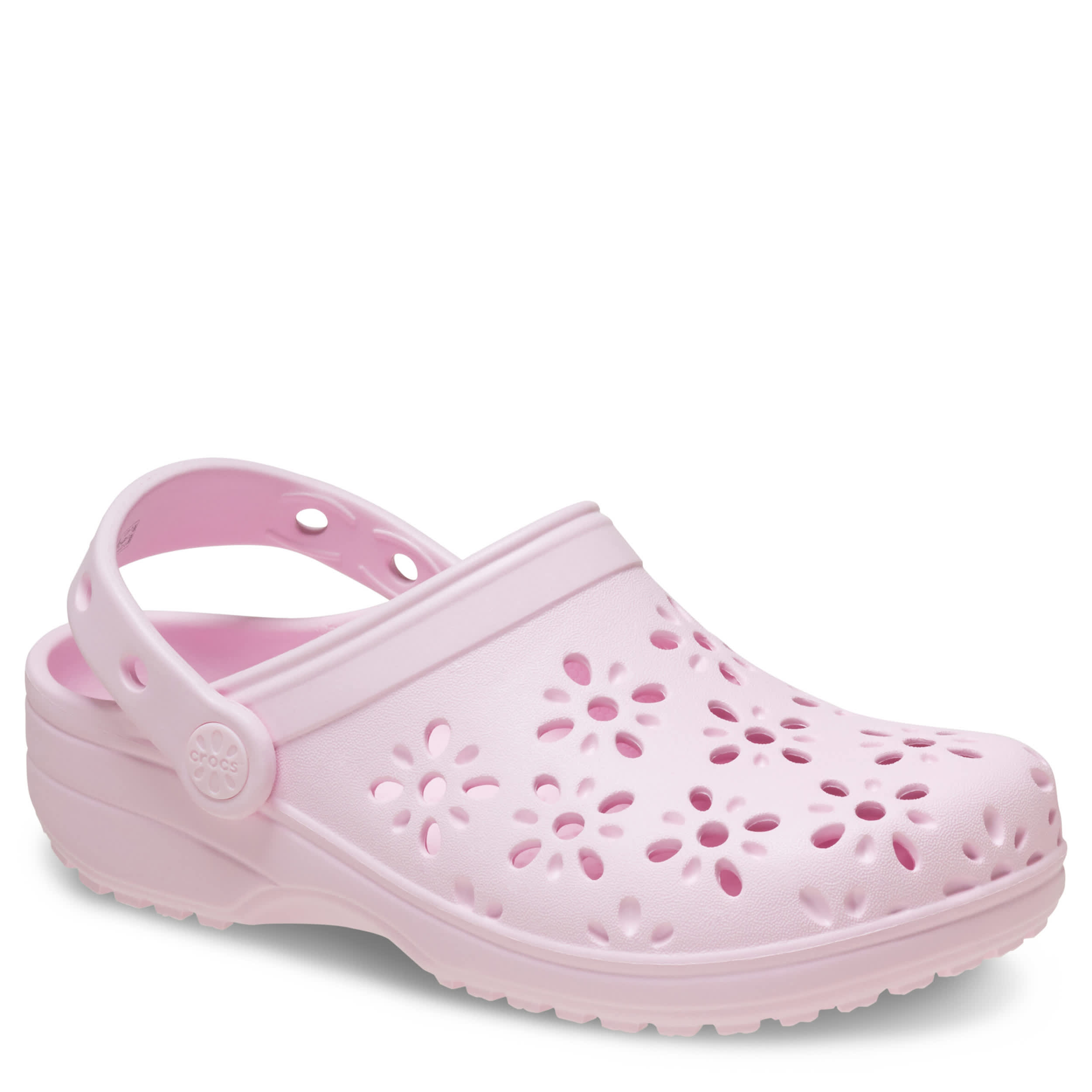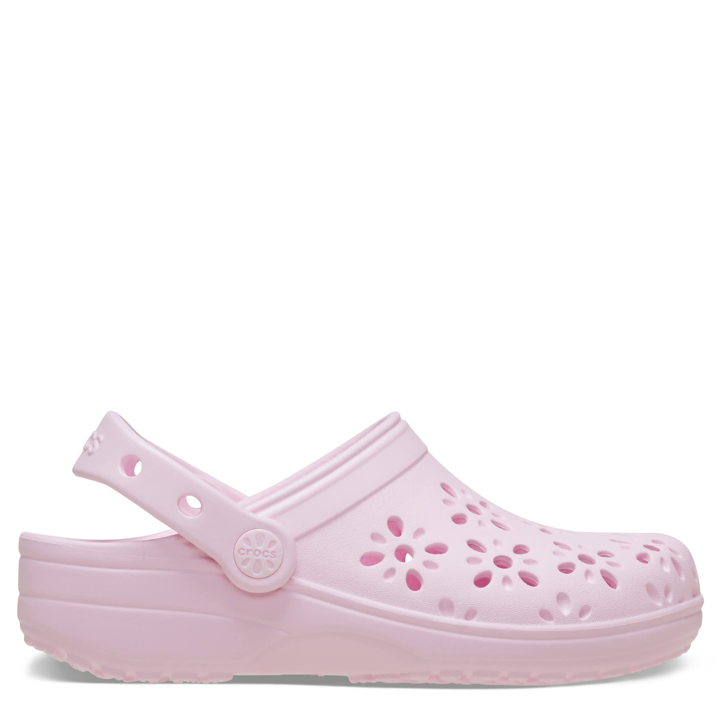 She'll smile in the Classic Floral Cut Out clog by Crocs. The Iconic Crocs Comfort material offers lightweight, flexible cushioning and a fun wearability, while the floral cutout upper circulates air for a breathable fit in these cute Crocs.