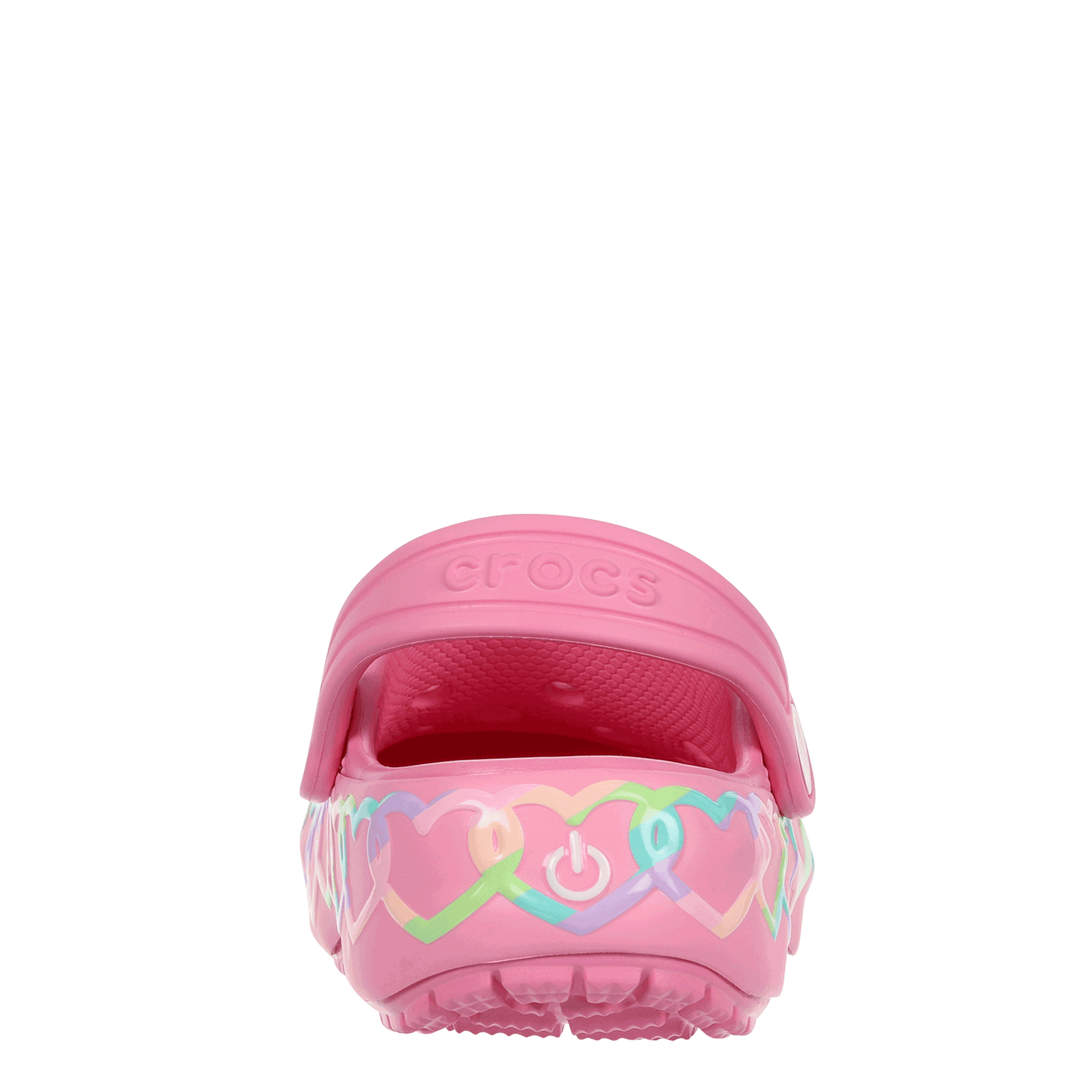 A rainbow heart chain and fun lights make the Classic Heart infant girls' light up clog by Crocs a treat for your little one. The Iconic Crocs Comfortâ„¢ material offers lightweight, flexible 360-degree comfort, while the Crosliteâ„¢ foam upper circulates air for enhanced breathability. Batteries for the long-lasting LED lights are not replaceable.