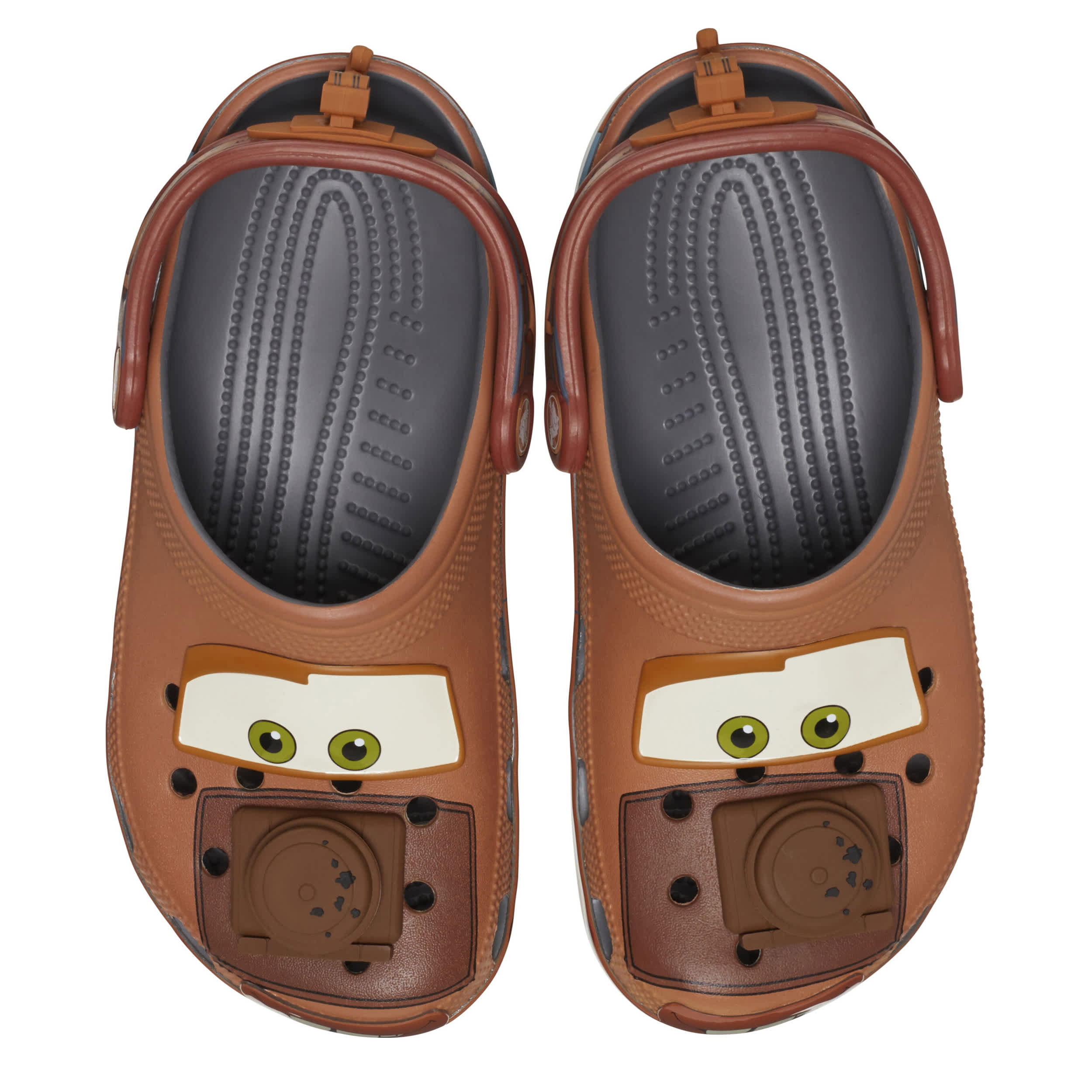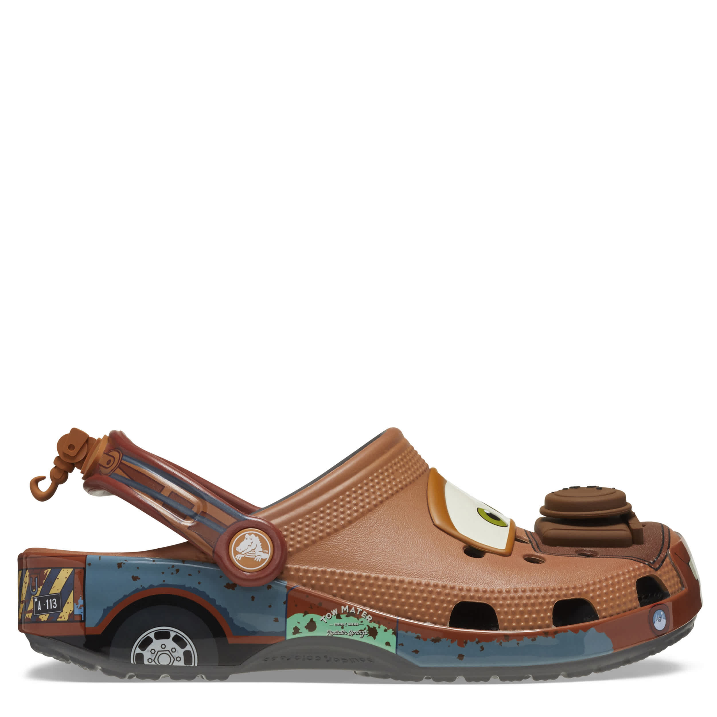 Who's up for some tractor tippin'? Mater just pulled up to join his best friend, Lightning McQueen, in our collection of Disney and Pixar Cars Classic Clogs. Each pair features Cars' illustrative graphics unique to Tow Mater. Delight in soft TPU details like an exposed engine on the toe and a tow hook on the heel strap. Ultra-comfy cushioned footbeds will have your feet happier 'n a tornado in a trailer park!