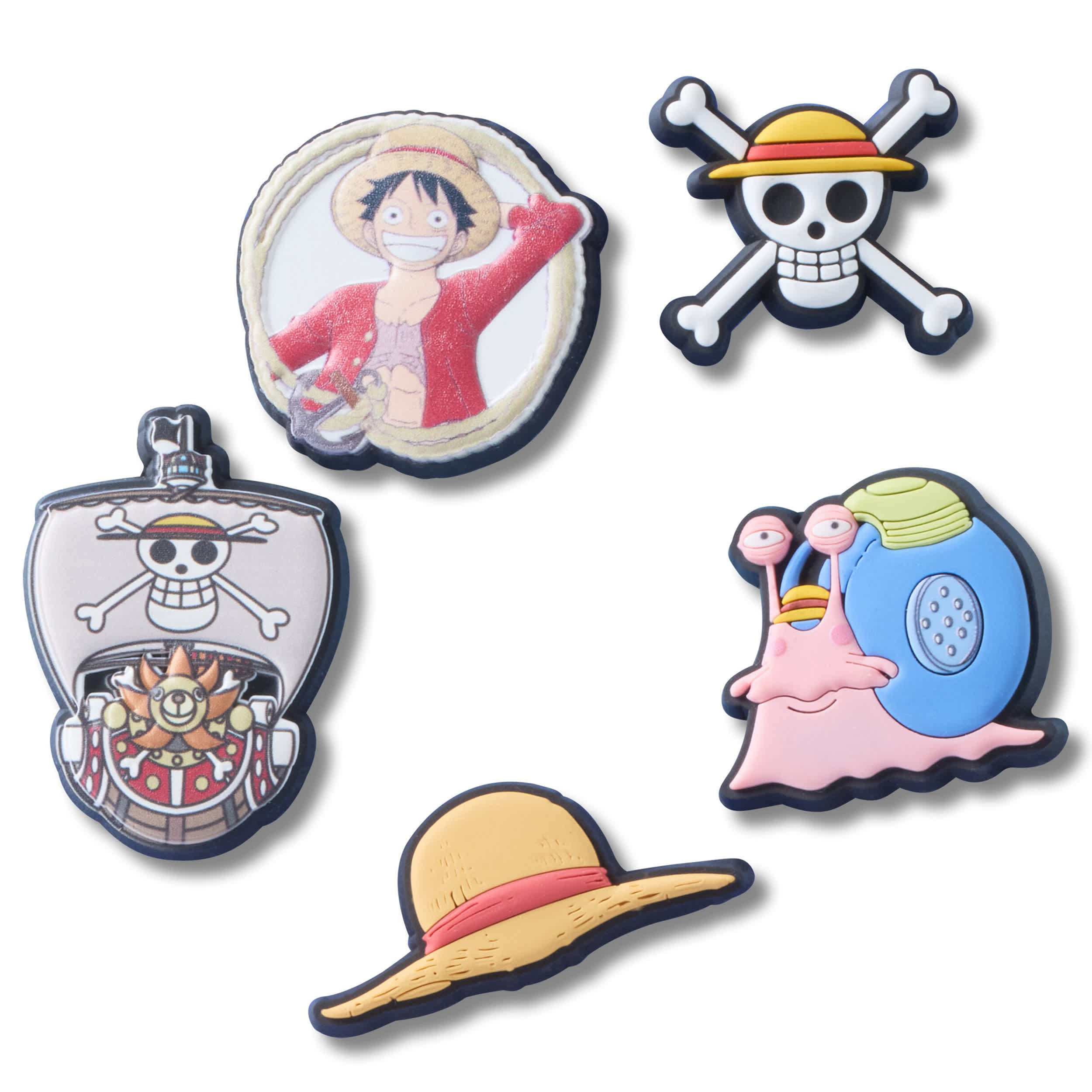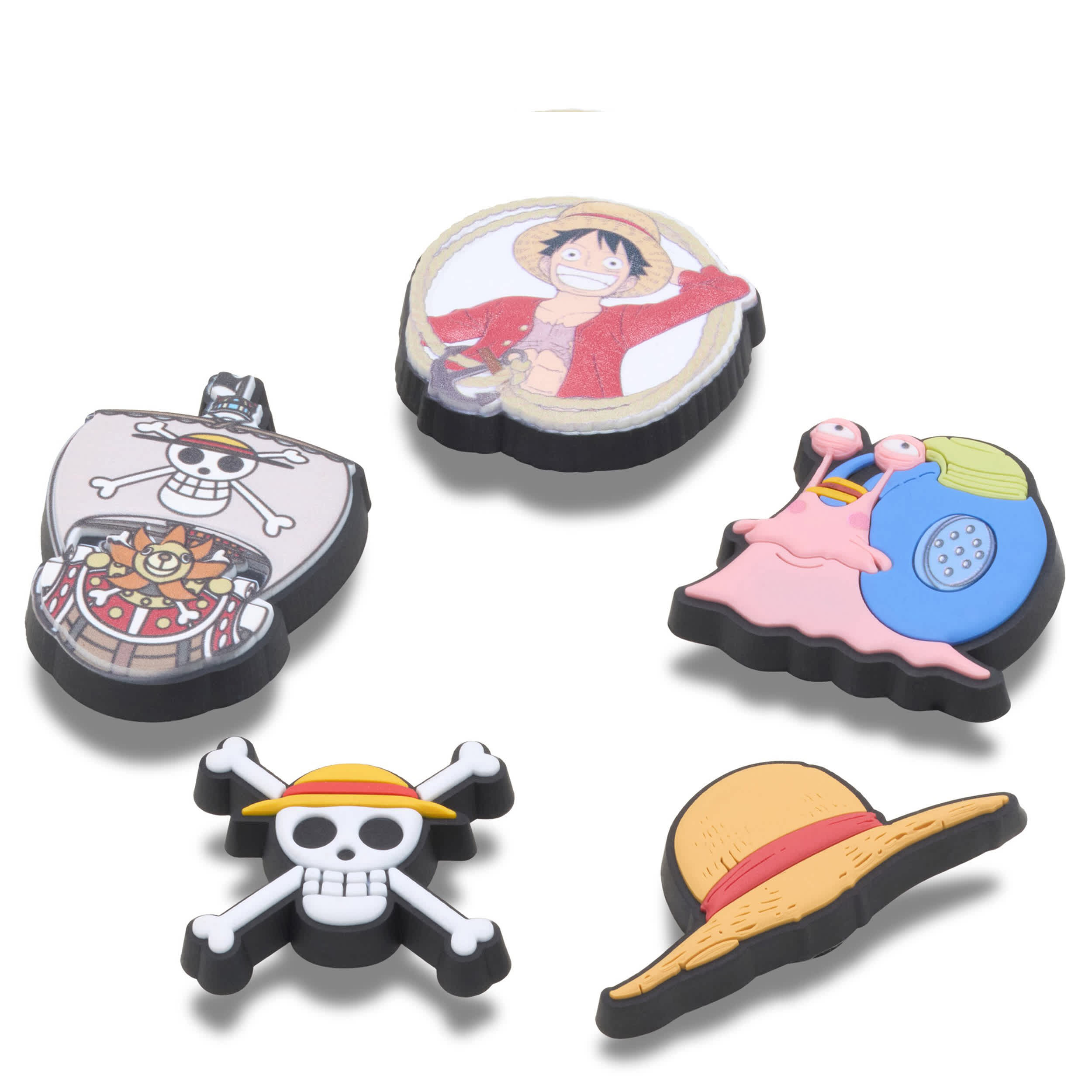 The Luffy 5-Pack of Jibbitzâ„¢ charms from the ONE PIECE collection includes two charms featuring the Thousand Sunny ship, Monkey D. Luffy's straw hat, the Straw Hat Crew skull insignia, devil fruit, and a portrait of Luffy framed in a rope and anchor. Not a toy. Not intended for children under 3 years of age.