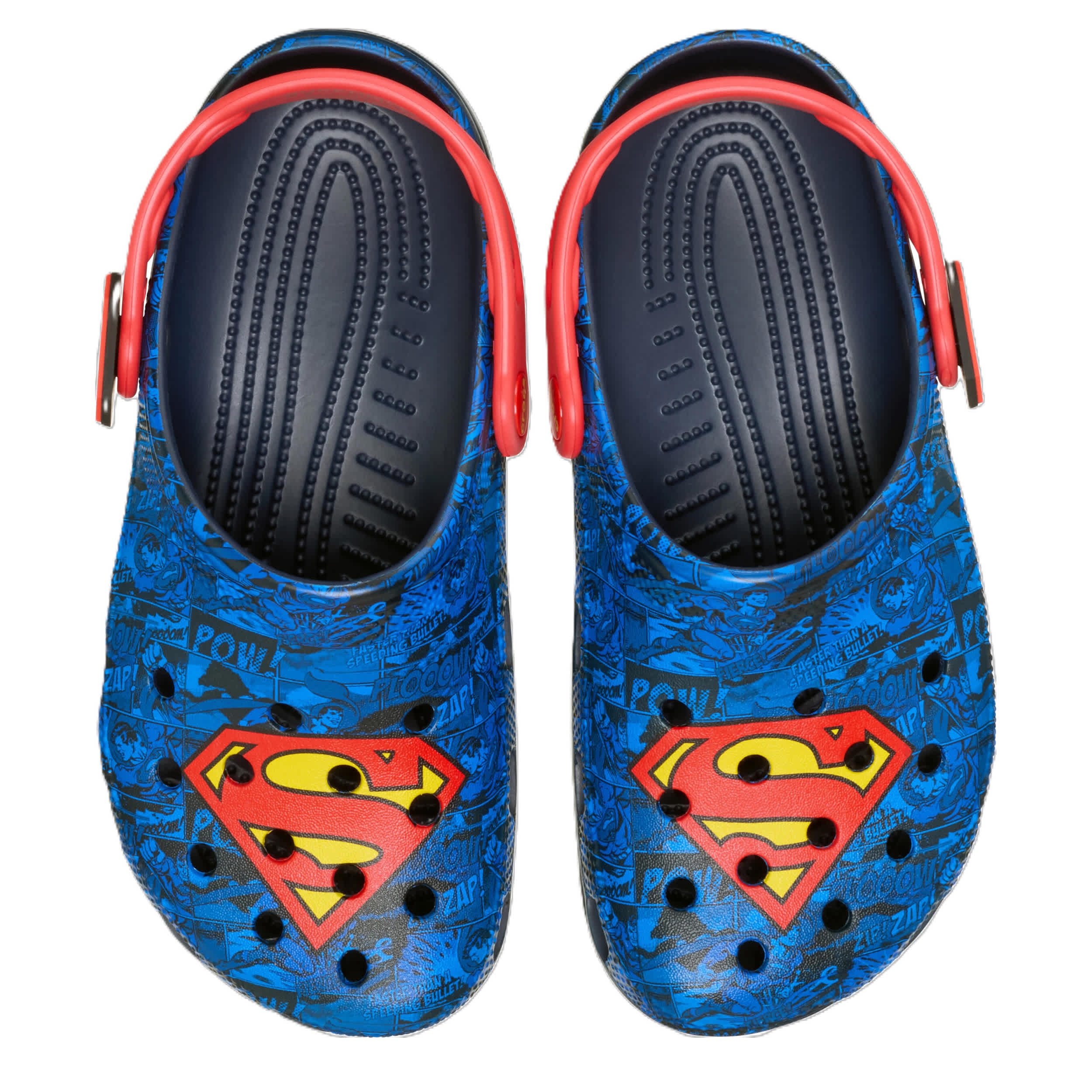 The Superman collection has landed. And the classic Super Hero inspired this Classic Clog. An allover comic book print serves as the background. But the real hero of the design is the Superman S-shield on the upper and rivets. It's style with a capital “S".