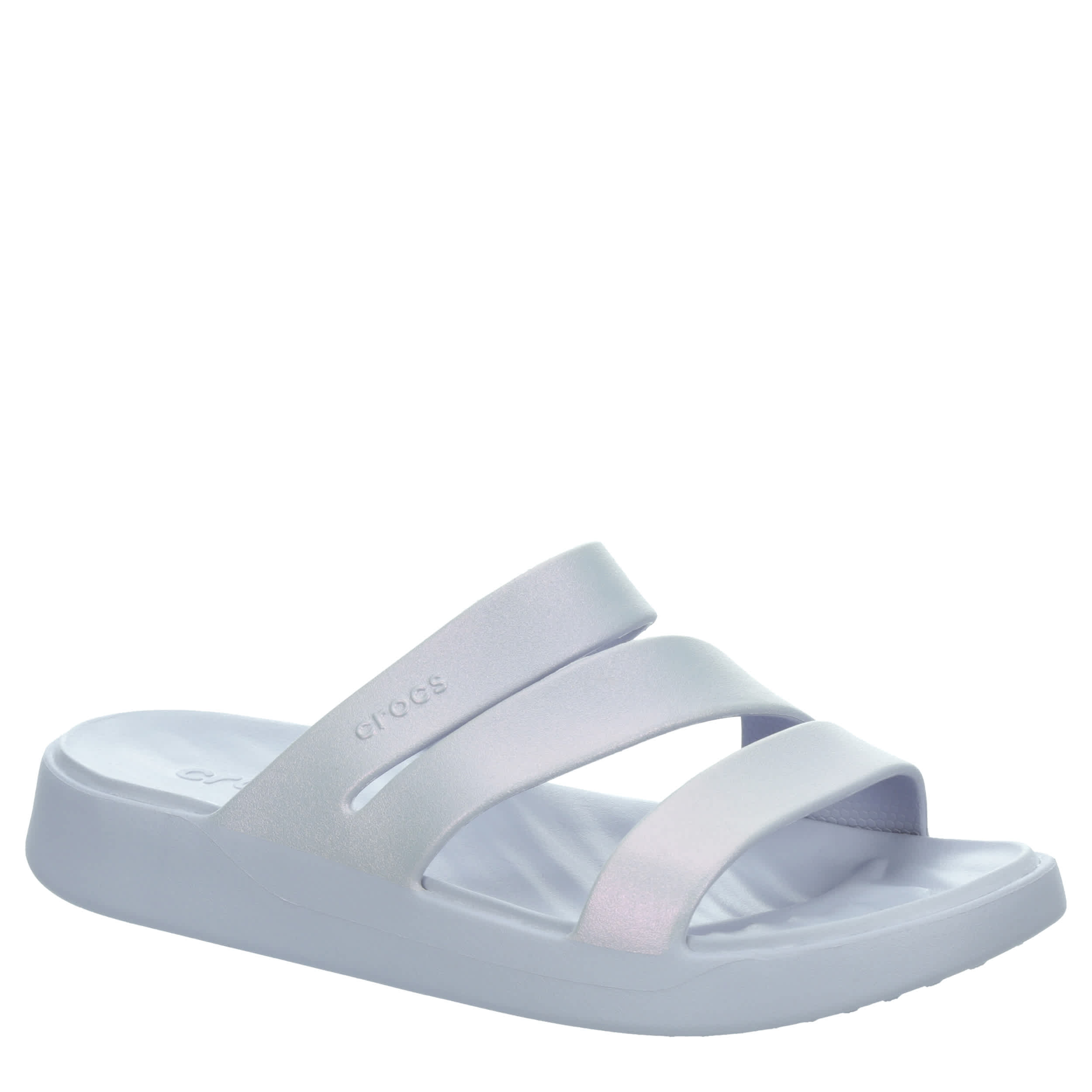 Transport yourself instantly in the Getaway Shimmer Strappy women's sandal from Crocs. With a lightweight shimmer treated upper featuring a seamless comfort innovation in the Free Feel Technologyâ„¢, this sandal moves with you for a floating feeling. The platform adds nice lift that will make these a must-have for any trip.
