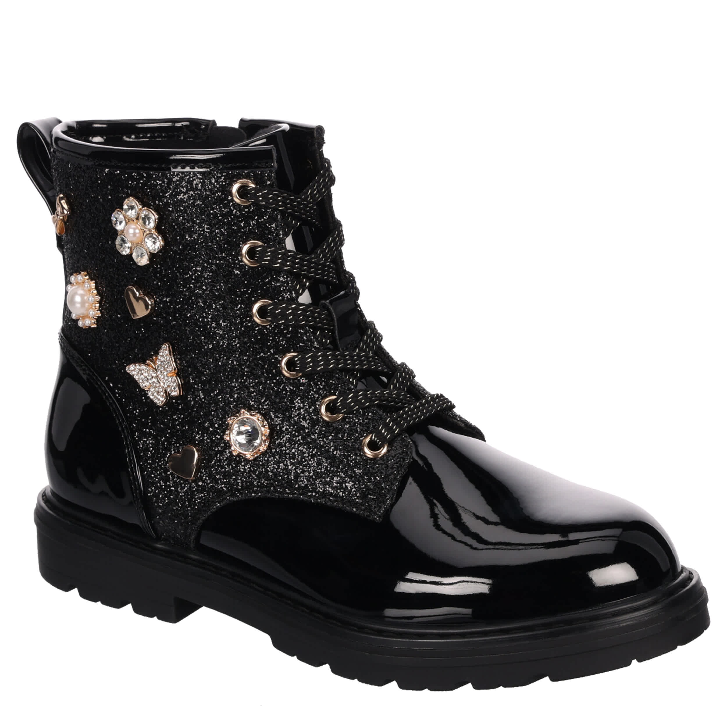 Get the total package in the Decor girls' combat boot from Cupcake Couture. With a glossy patent leather upper featuring decorative accents on the side and a glittery section with matching laces for extral style, this inside zip boot also has a convenient rear pull tab. The footbed soothes her foot while the lug outsole keeps her stable.