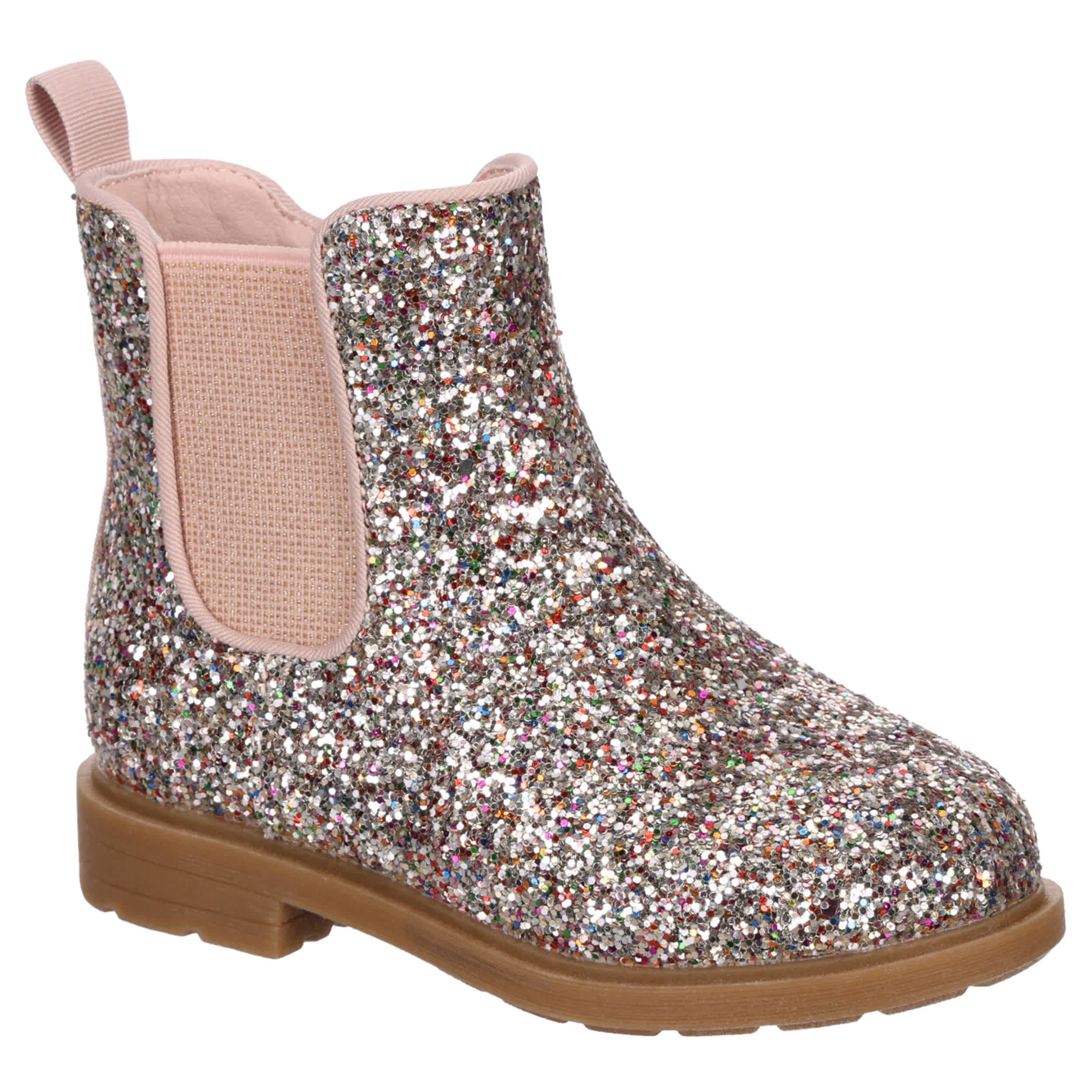Shine and cool with the Cupcake Couture Crishel infant girls' bootie. Featuring a glitter upper with an elastic panel and a rear pull tab for easy entry, these booties look great with all her little outfits. The footbed and synthetic outsole make sure she's comfortable and covered while enjoying the fall.