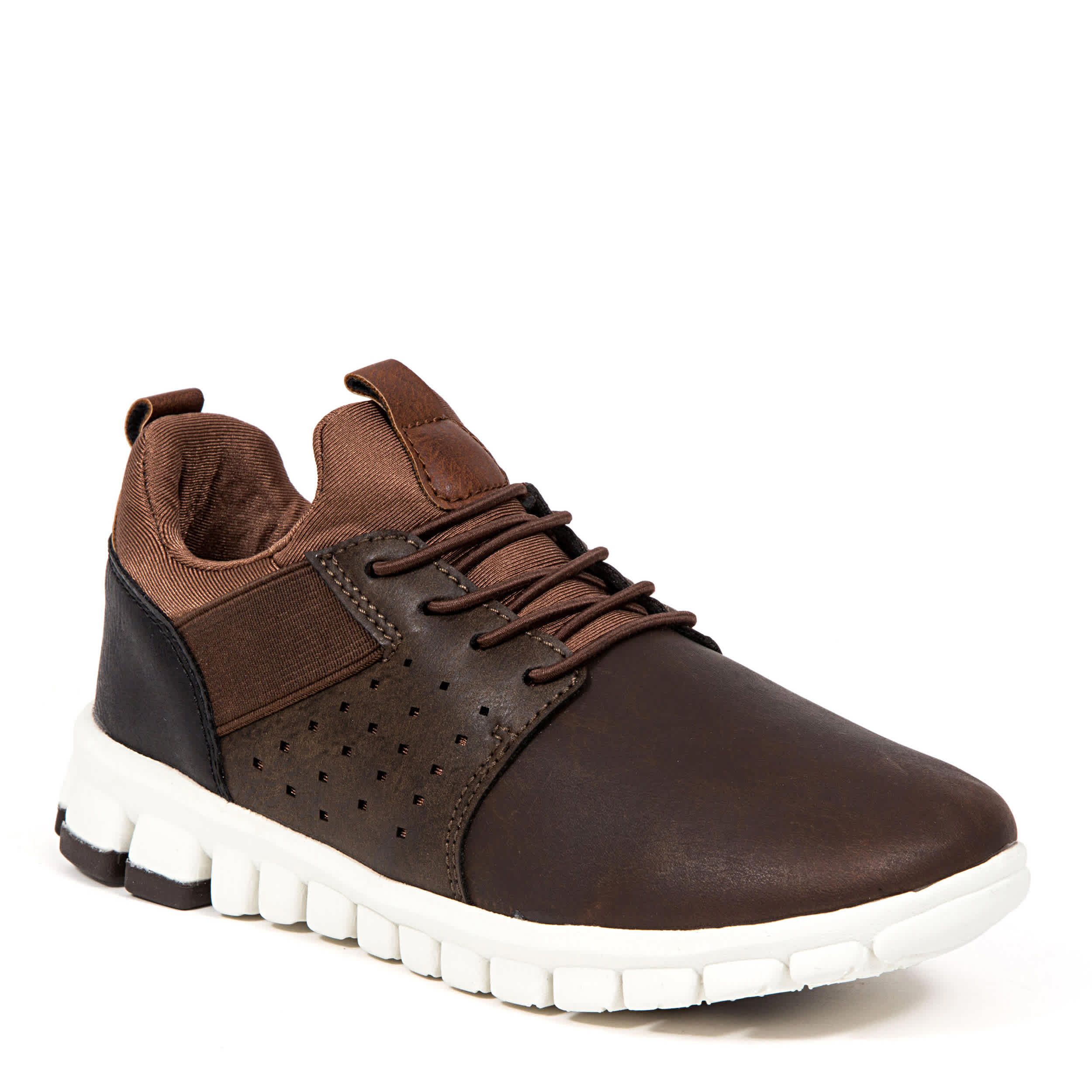 For more versatility with his styling, try the Betts Jr boy's sneaker from Deer Stags. Featuring a faux leather upper with a padded collar & tongue for comfort, this sneaker also has stretch laces for security. The Memory Foam insole cushions every step while the lightweight outsole adds supportive traction.