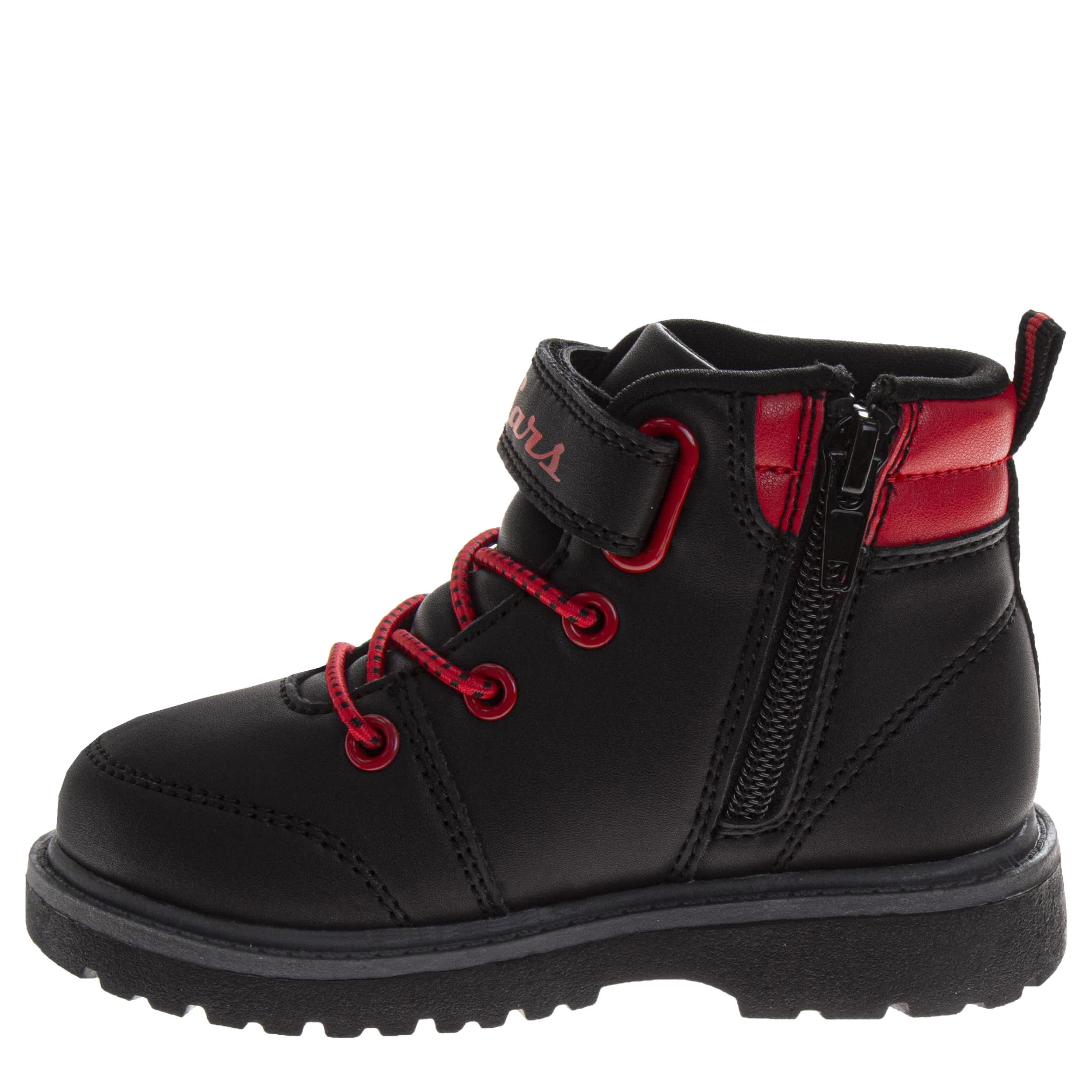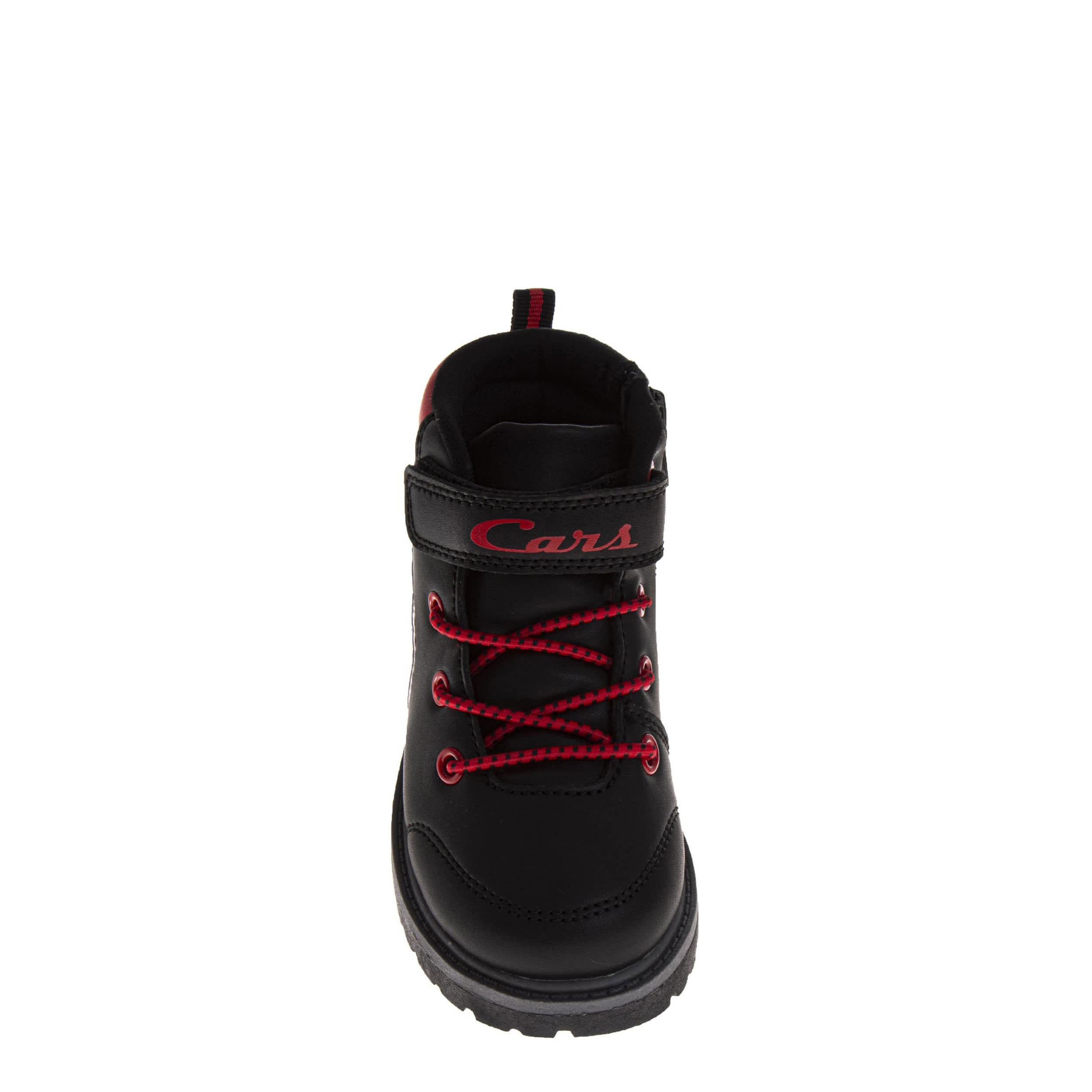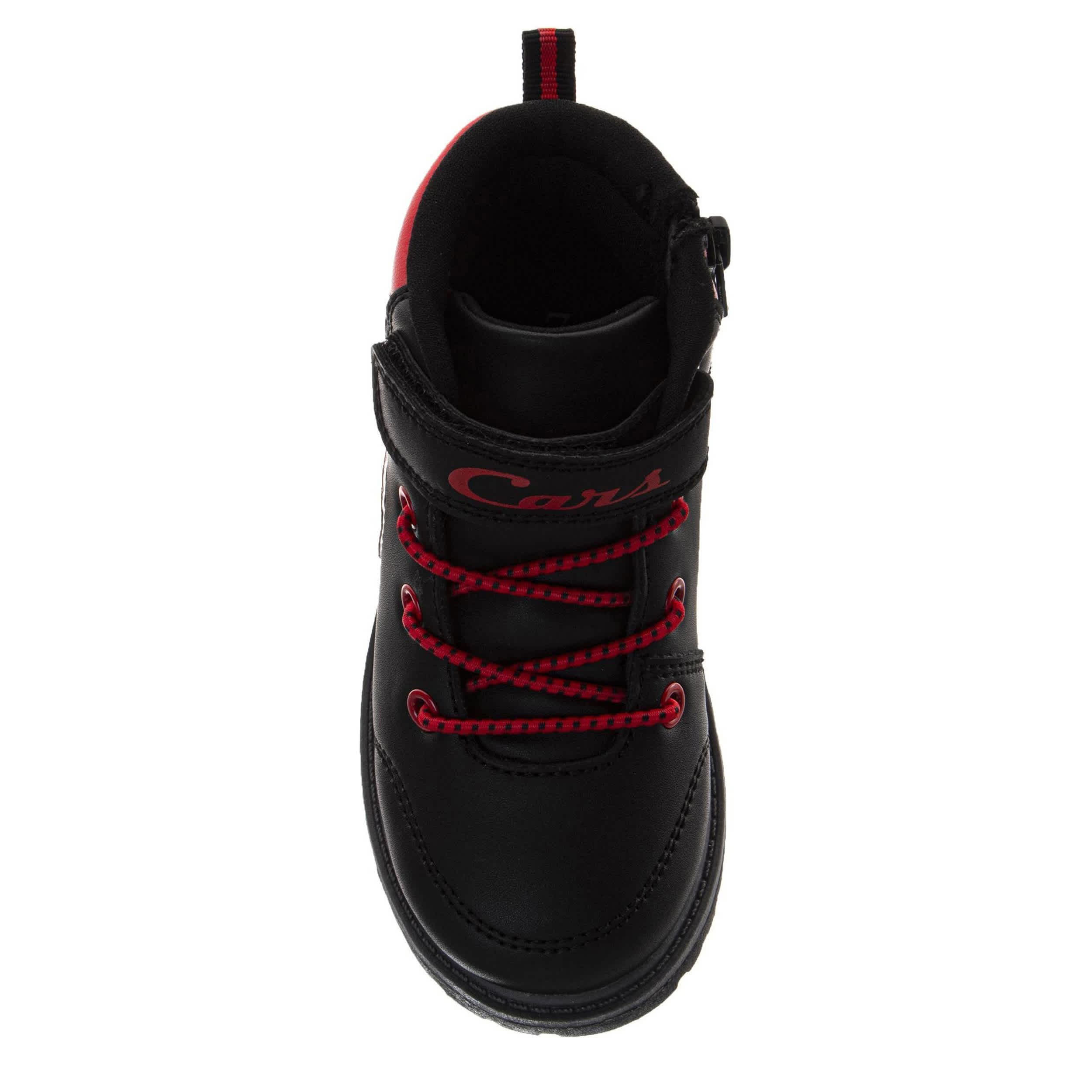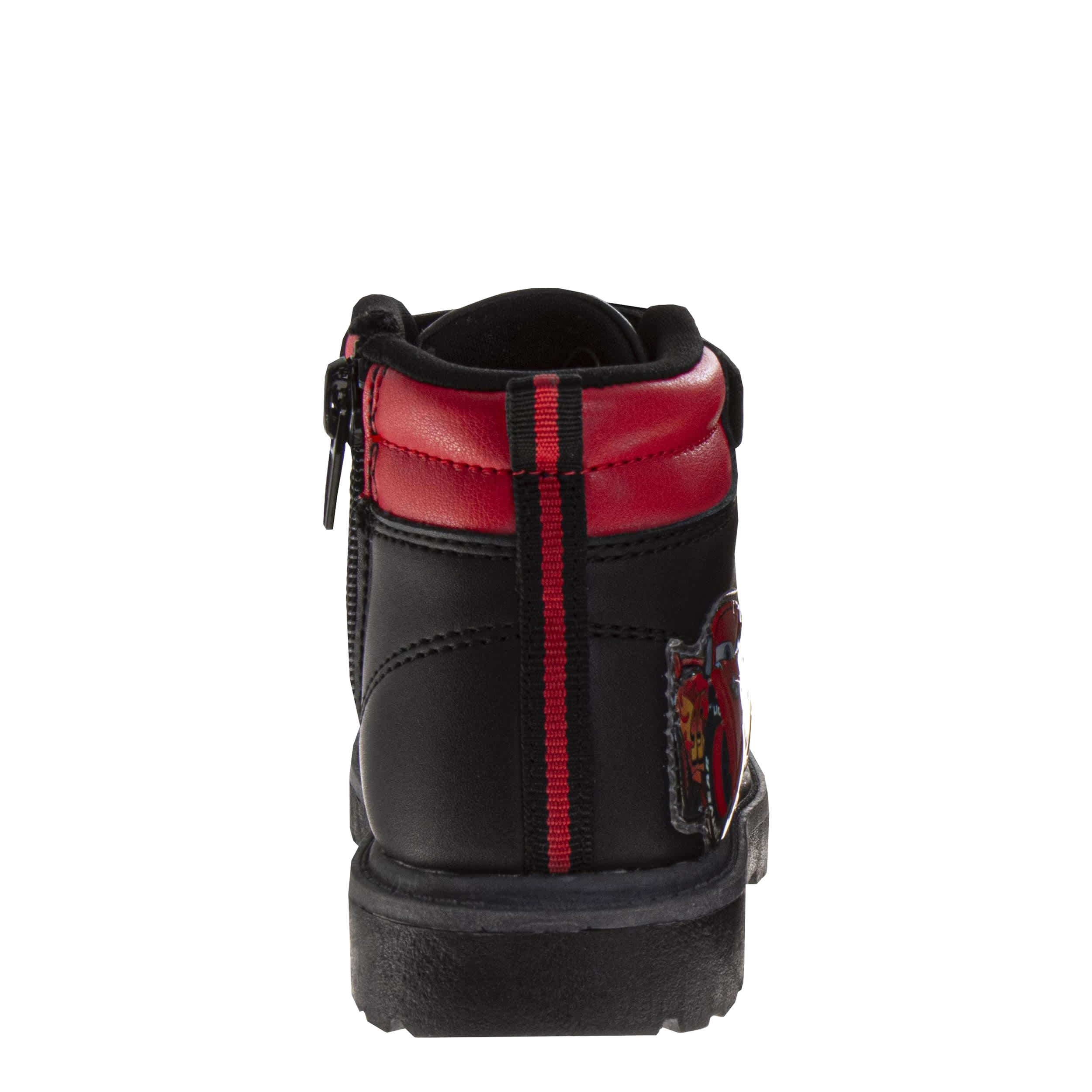 Dress him for the cold in the Cars toddler boys' boot by Disney. Featuring Lightning McQueen graphics with a padded collar & hook-and-loop ankle strap, this faux leather boot also has an inside zipper for easy entry. The racy laces and soft insole make sure he'll love them.