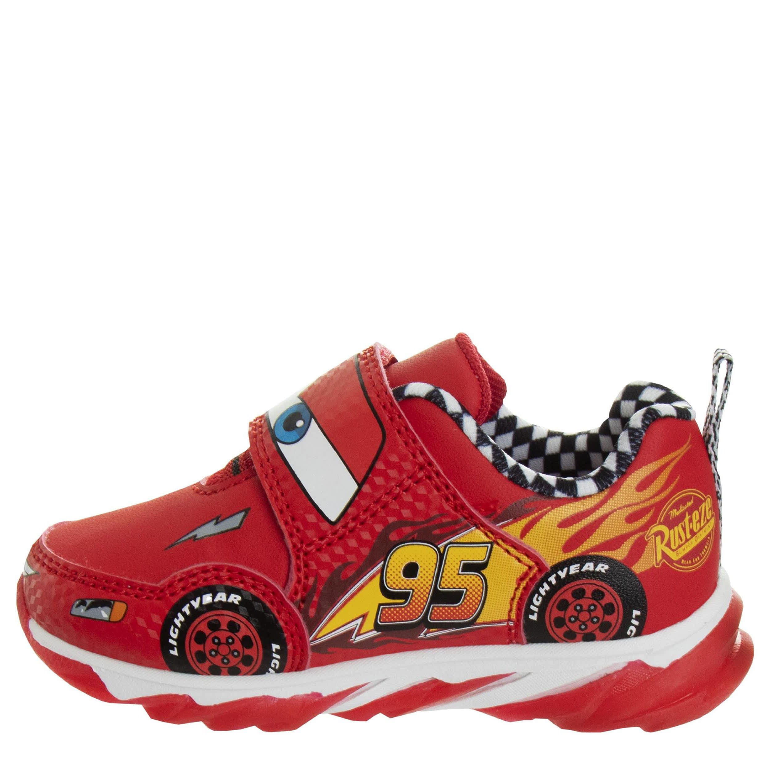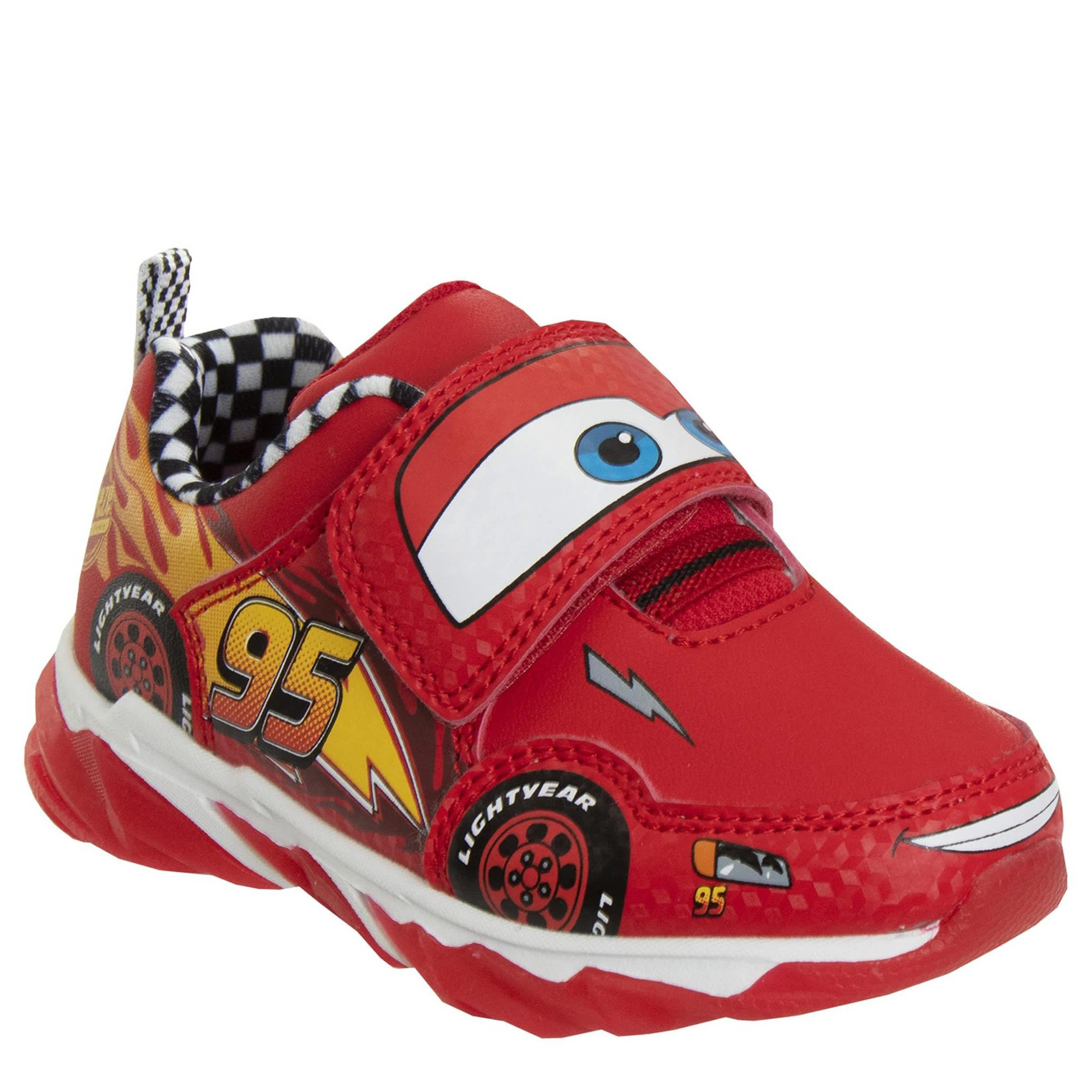 He can light up his play with the Disney Cars lighted sneaker. With a synthetic upper featuring Lightning McQueen graphics on the side for extra fun, this slip-on shoe also has lights for a cute finish. The cushioned footbed comforts his foot while the traction in the outsole ensures steady adventures on the move like his favorite race car.