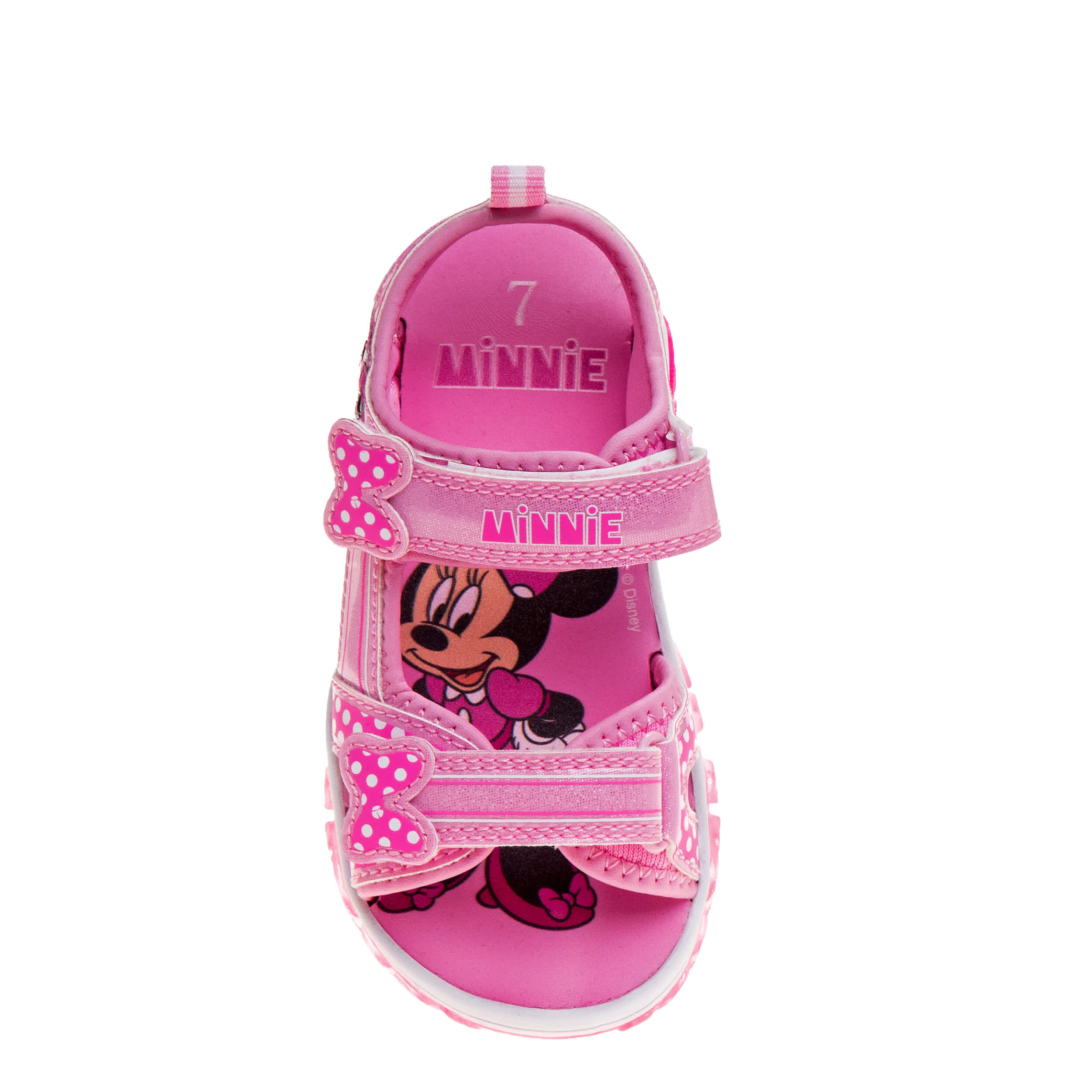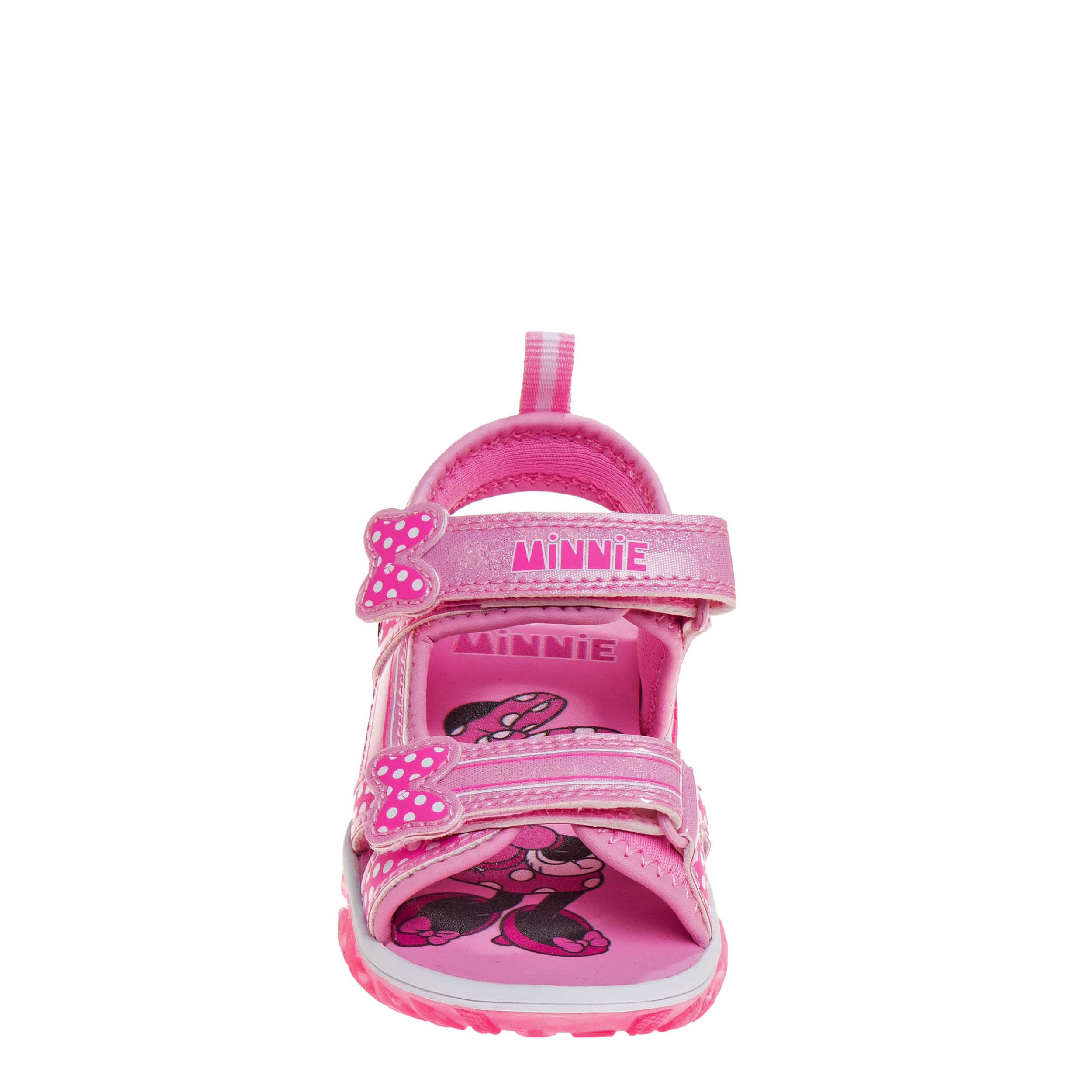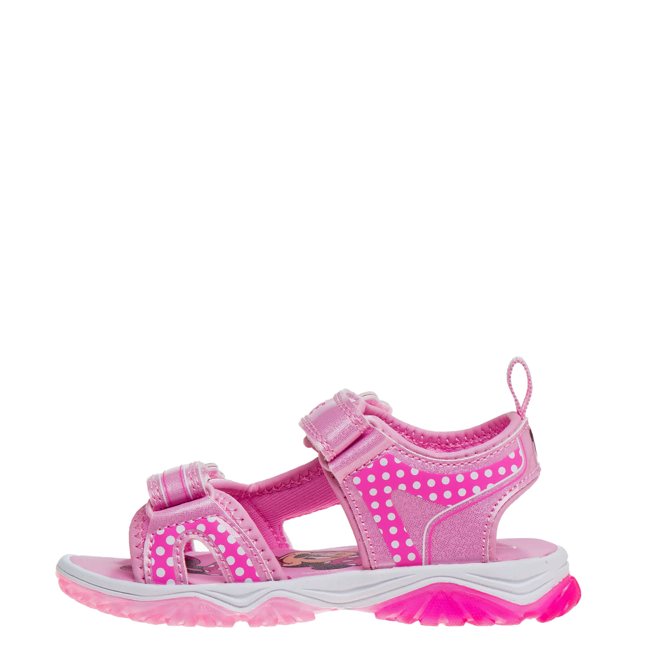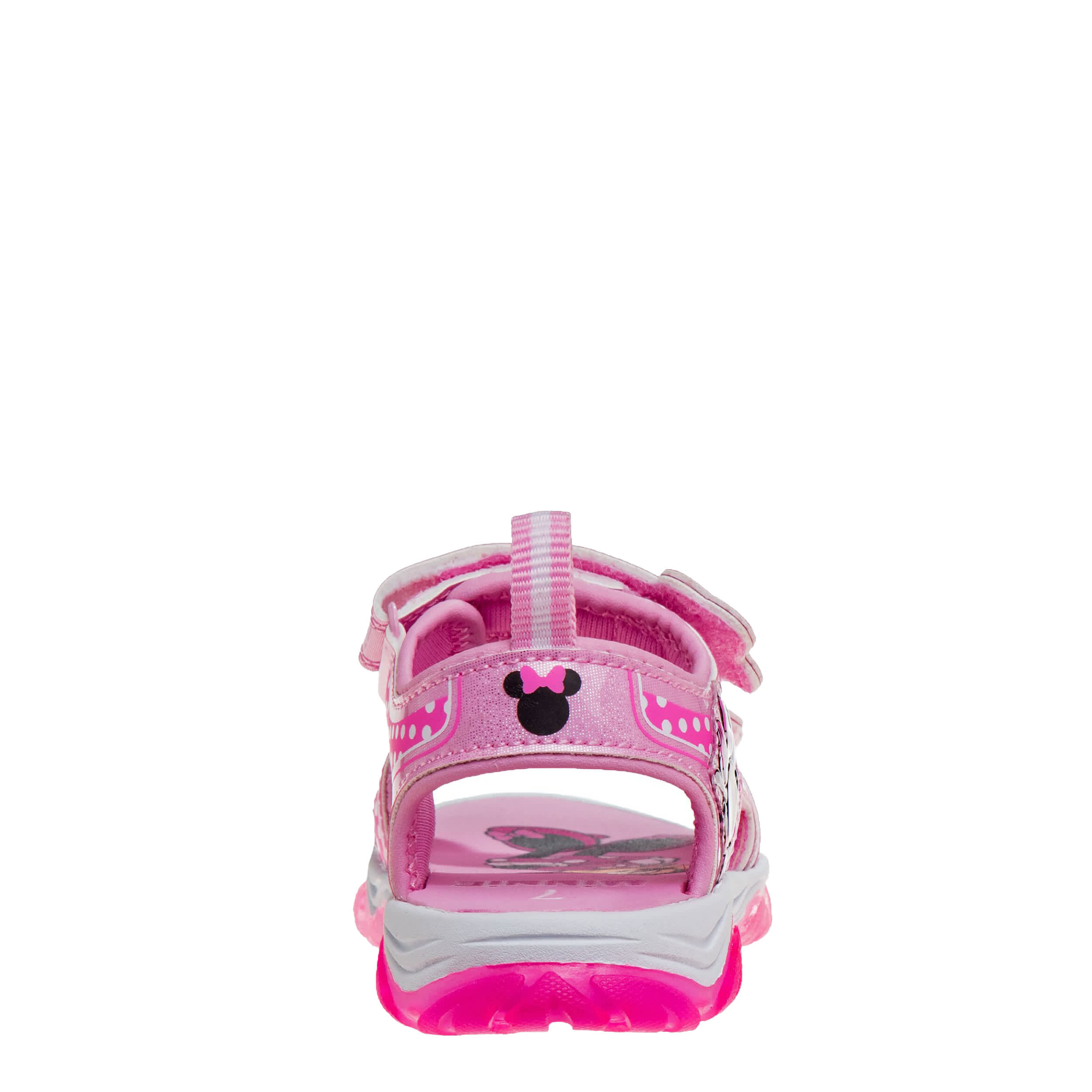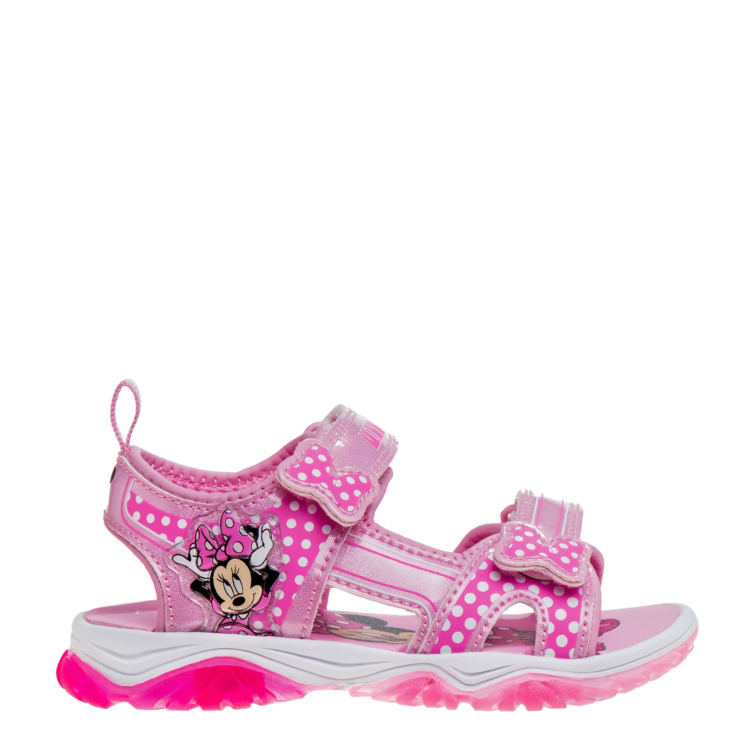 Have a ball this summer with the Minnie Mouse infant girls' sandal from Disney. Featuring her favorite Minnie Mouse graphics with easy hook-and-loop closures, this sandal works at the beach or on a road trip. The LED lights glow with each step and the outsole is durable.
