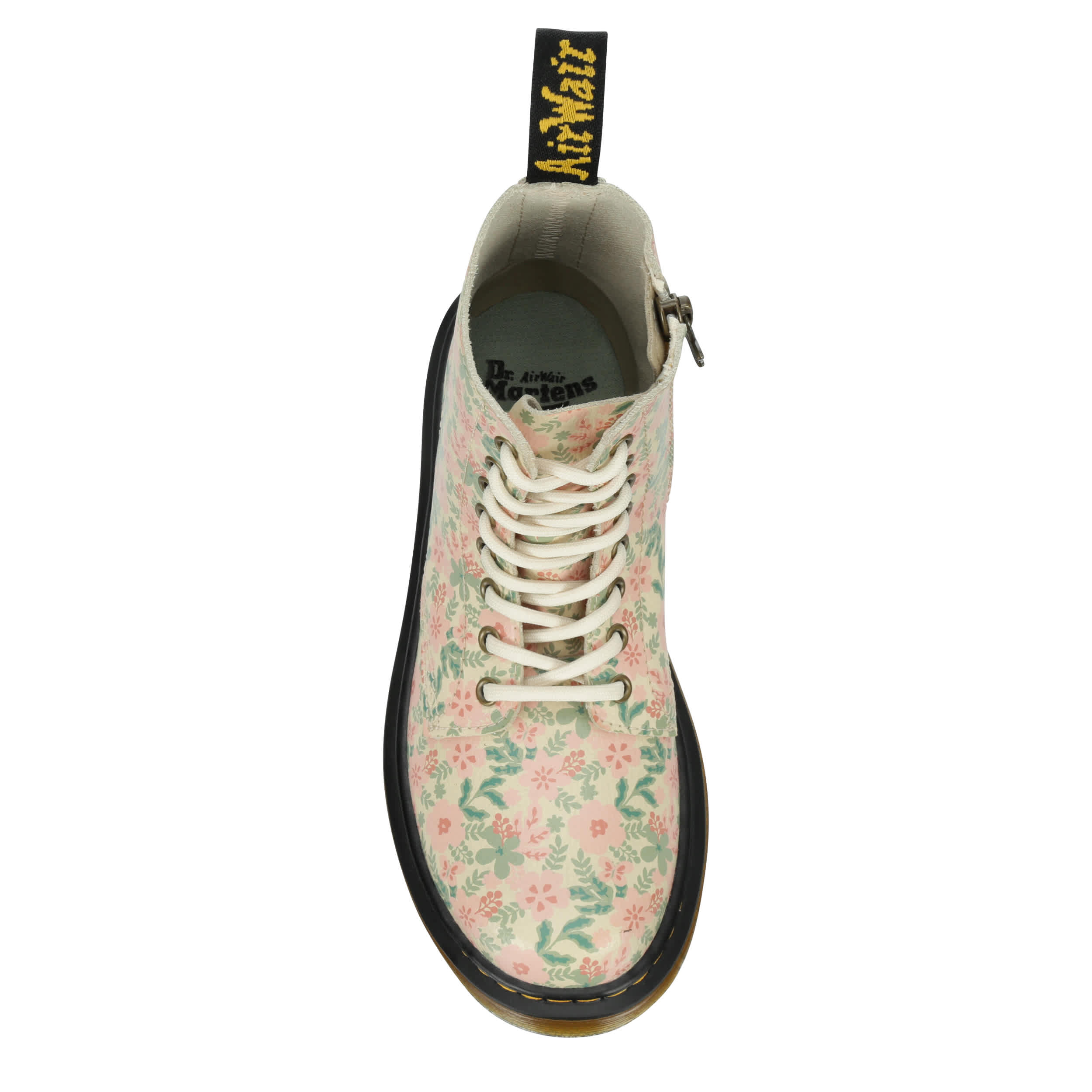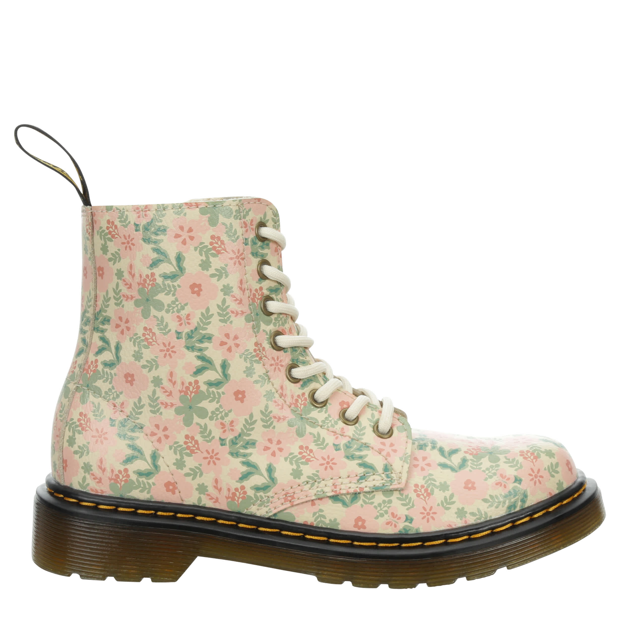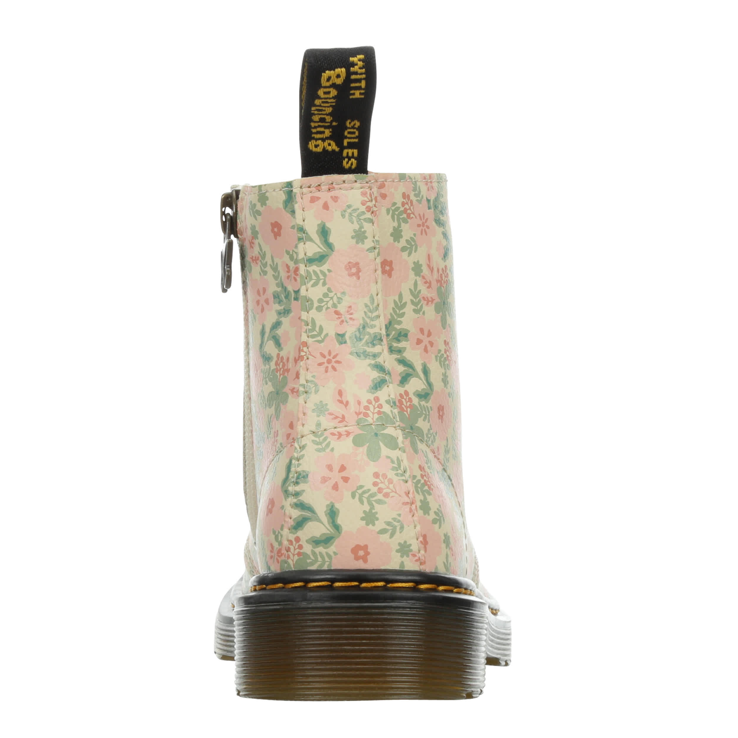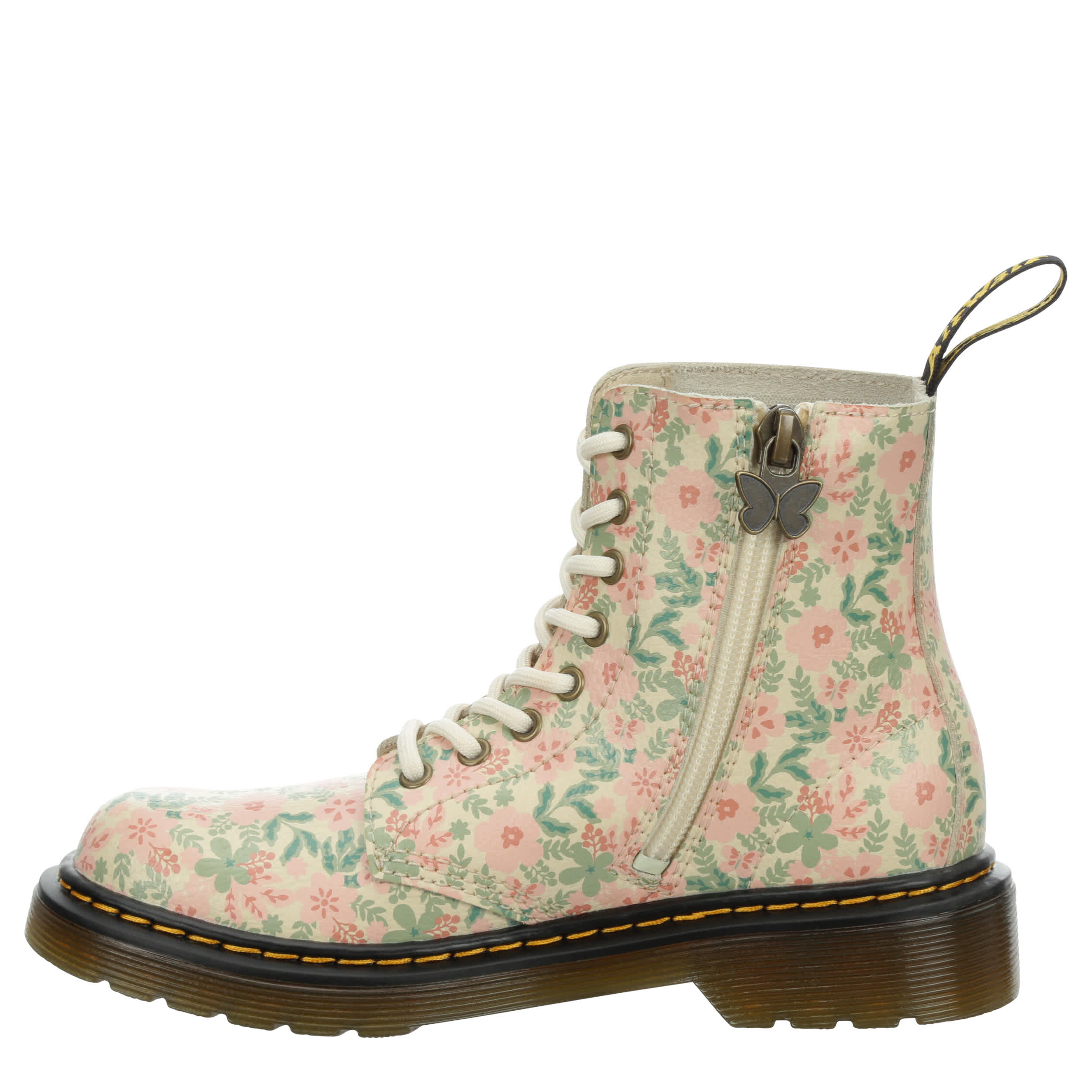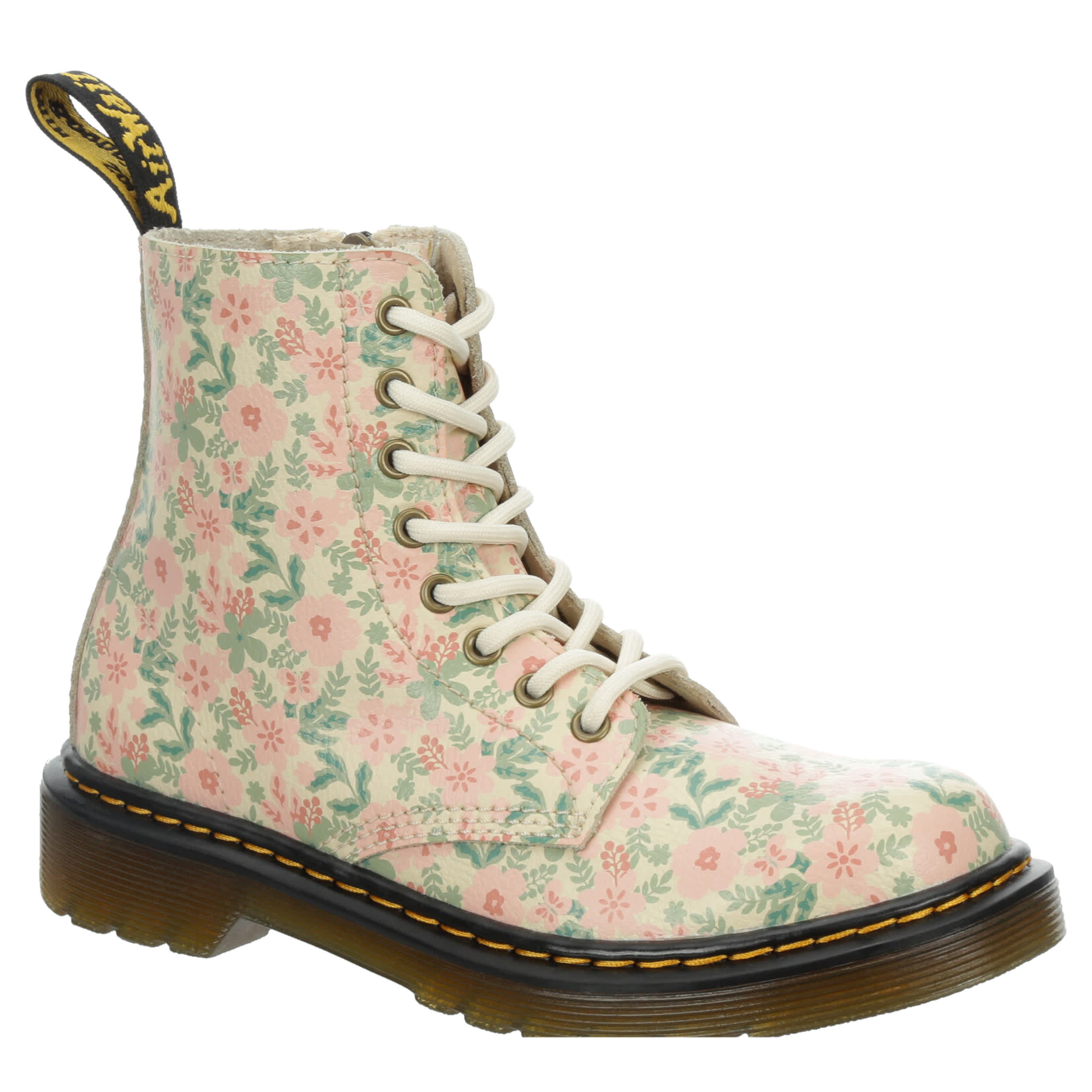 You'll love the rugged chic style of the Dr. Martens 1460 combat boot. With a floral print upper featuring the iconic yellow stitching & rear pull tab for easy entry, this inside zip boot has serious grunge glam. The cushioned insole comforts her feet, while the traction outsole is flexible enough to accomodate growing feet.