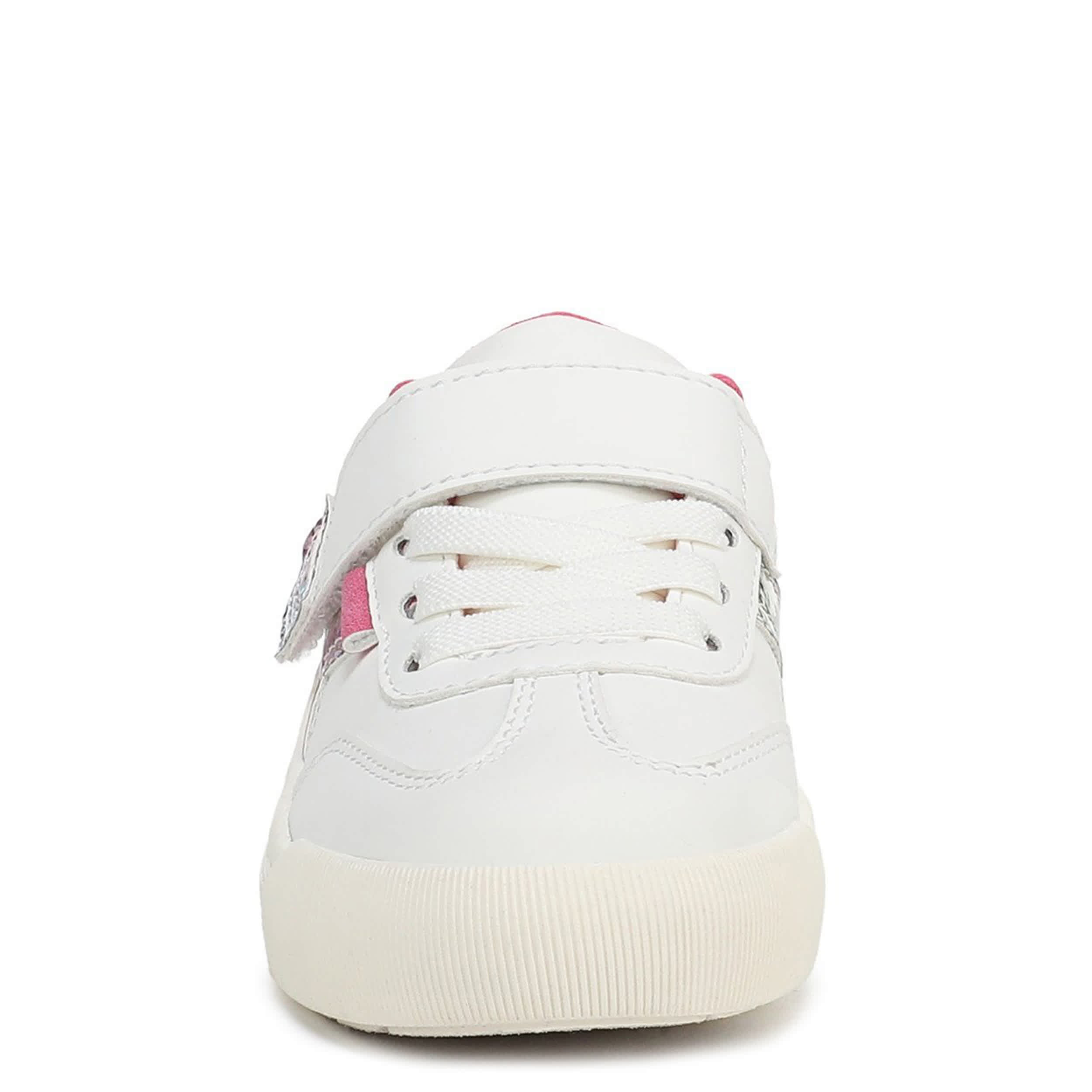 Fan fave gets a mini with the comfy Time Off Win infant girls' sneaker from Dr. Scholl's. With a microfiber, faux leather or faux nubuck upper featuring a chevron & stitch detailing for retro-inspired style, these hook-and-loop sneakers also has a padded collar & tongue. The Comfort Insole Technology offers cushioned support, while the sole keeps her grounded in style.