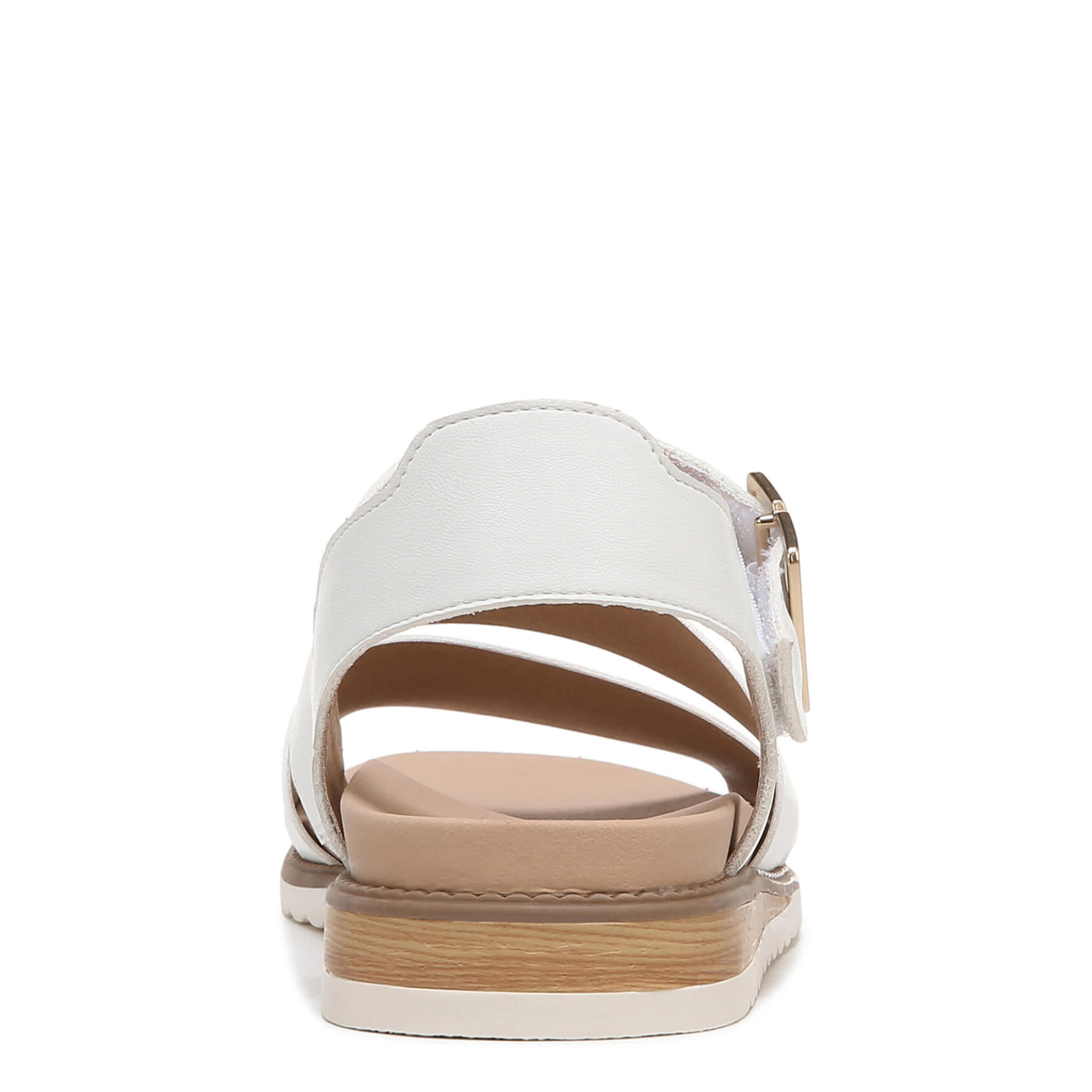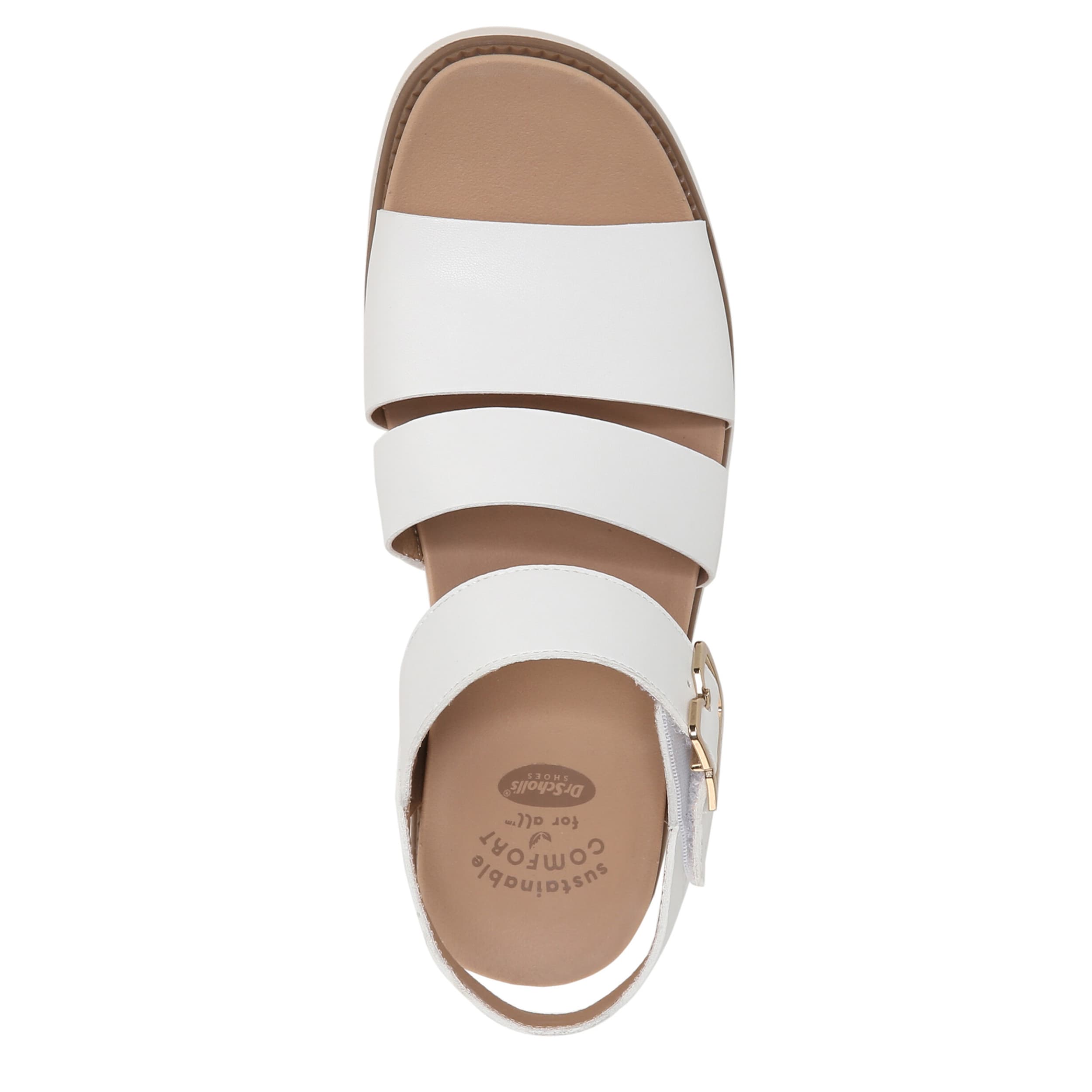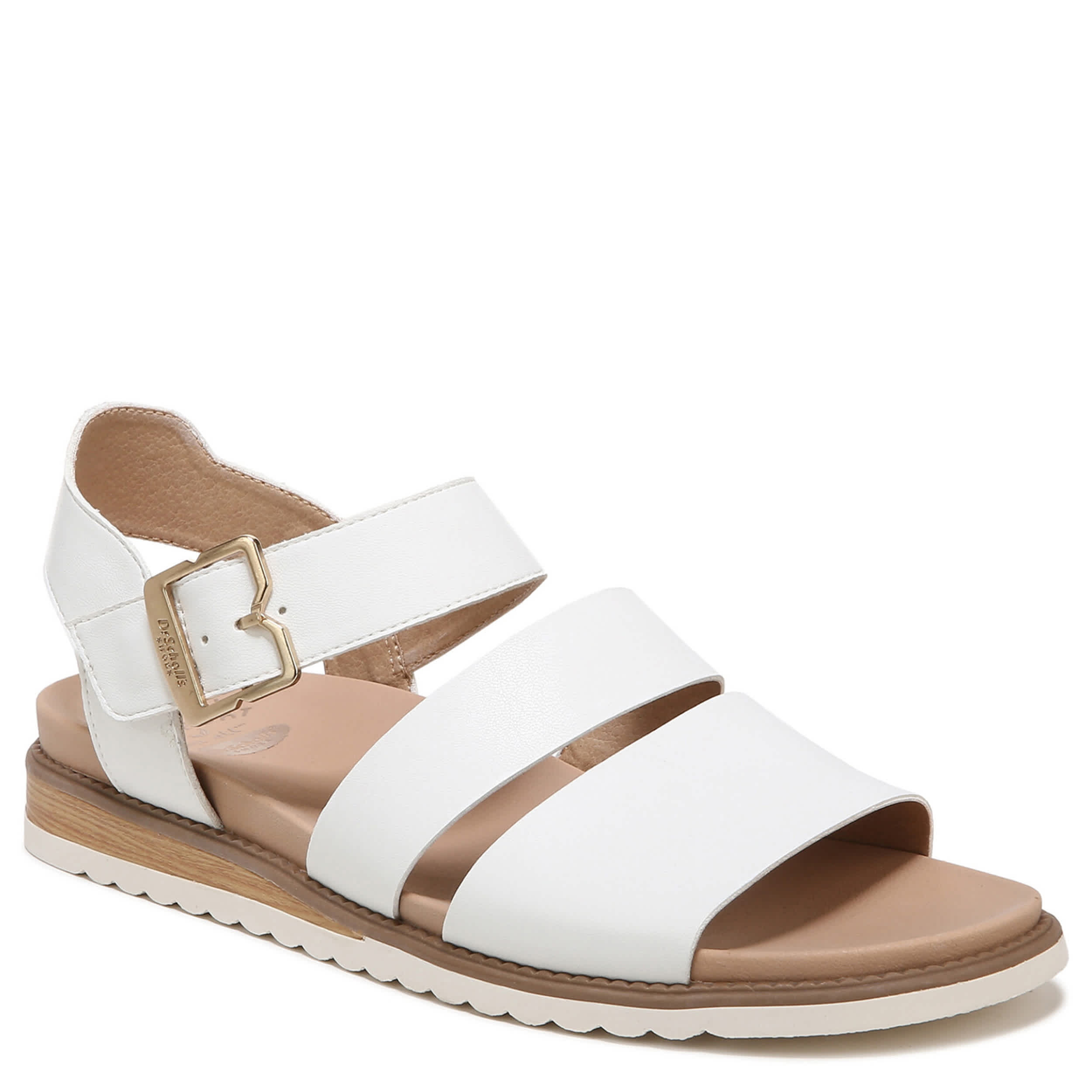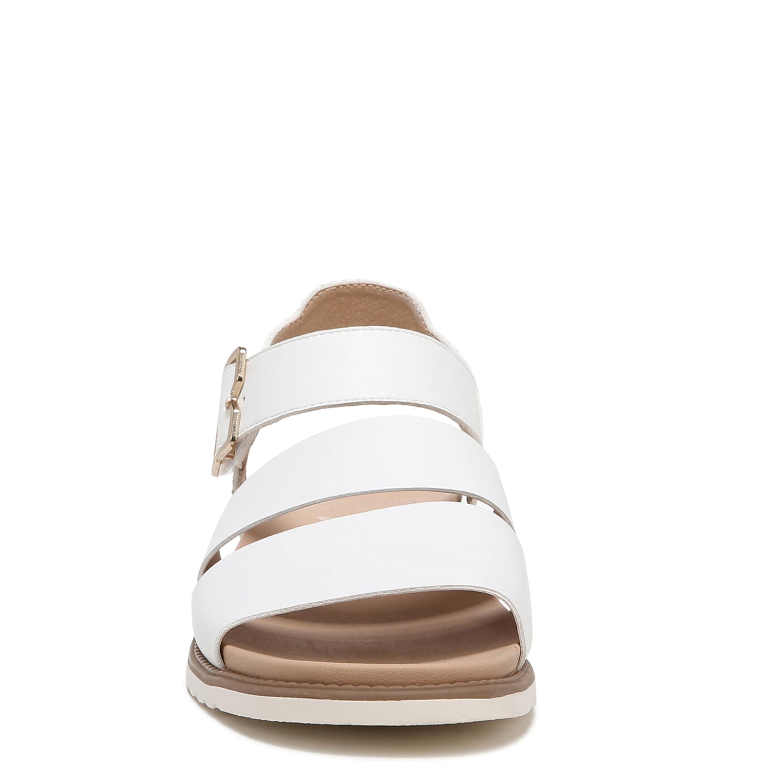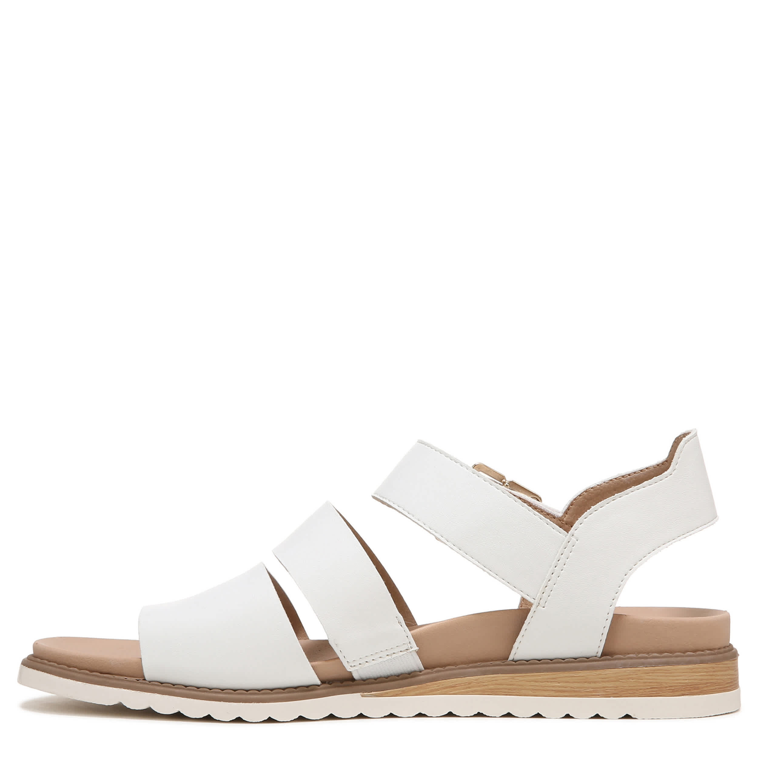 Catch a flight and don't look back in the Dr. Scholl's Island Glow women's wedge sandal. With a faux leather upper featuring a gold-tone buckle detail for extra style, this hook & loop strap sandal also has a slim, faux wood wedge heel and scalloped sole. The Insole Technology cushions every step while supporting your arch as well.