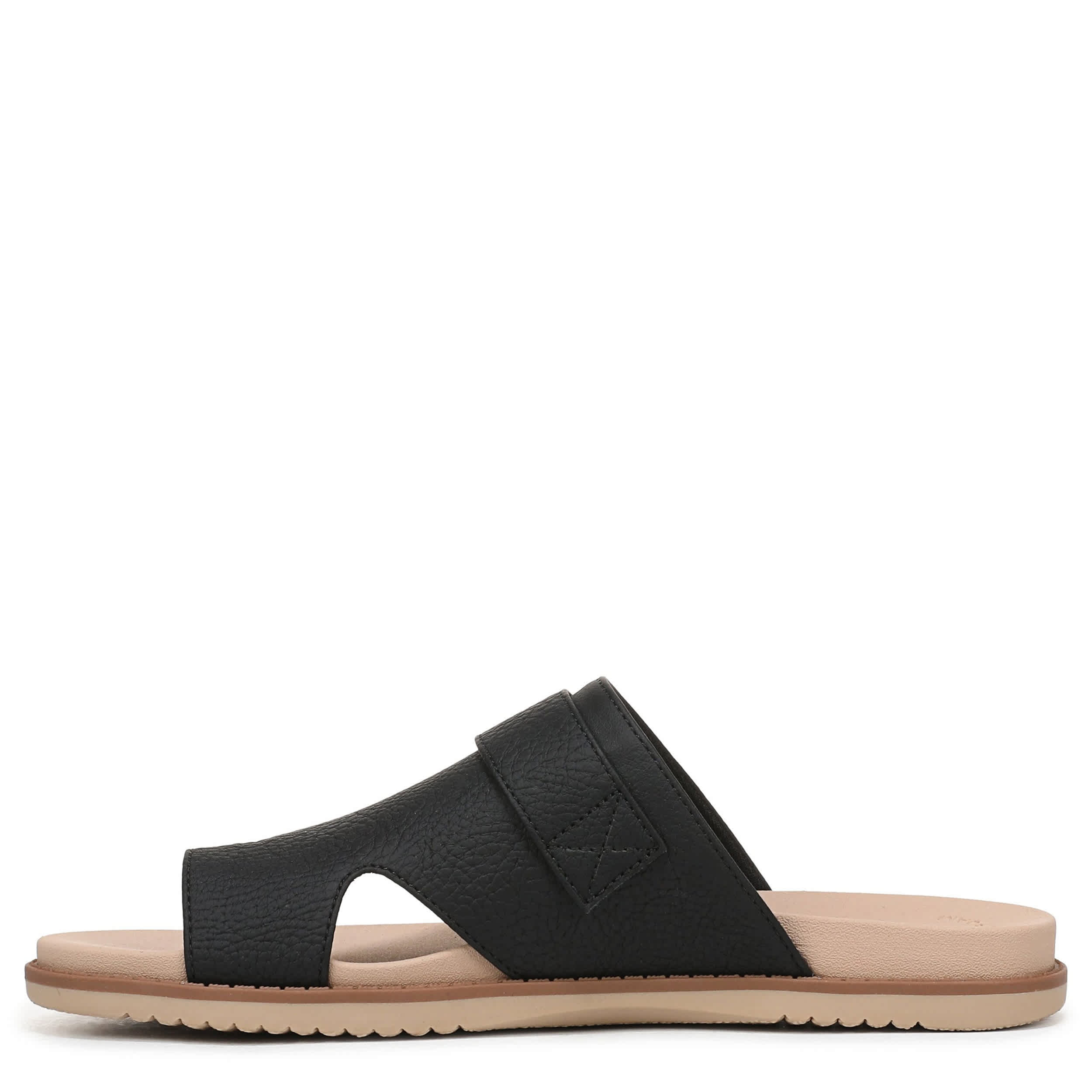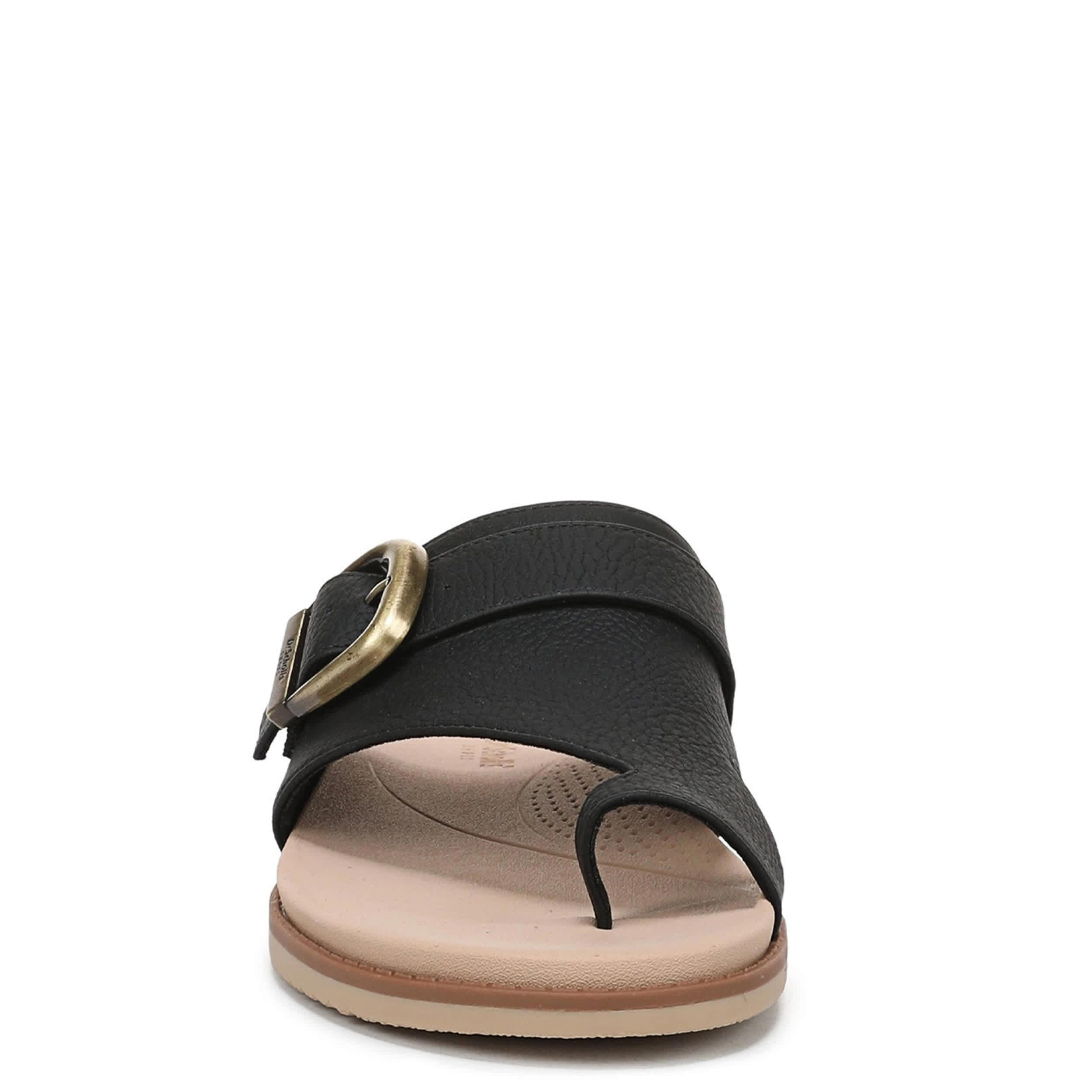 Add some modern energy with the So Clever flip flop sandal from Dr. Scholl's. Featuring a faux leather upper with wide strap and a side buckle for extra style, this slide is sure to be a favorite all summer. The Feel Good Foam technology puts less pressure on your feet for a lightweight feel that adds bounce to every step.
