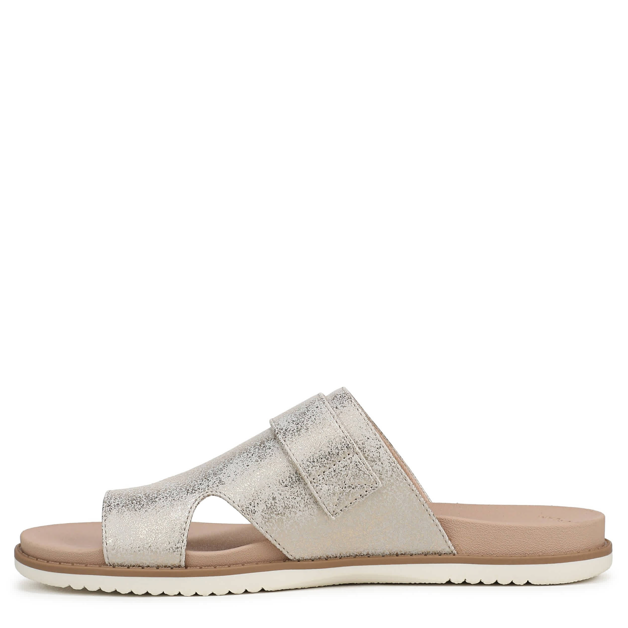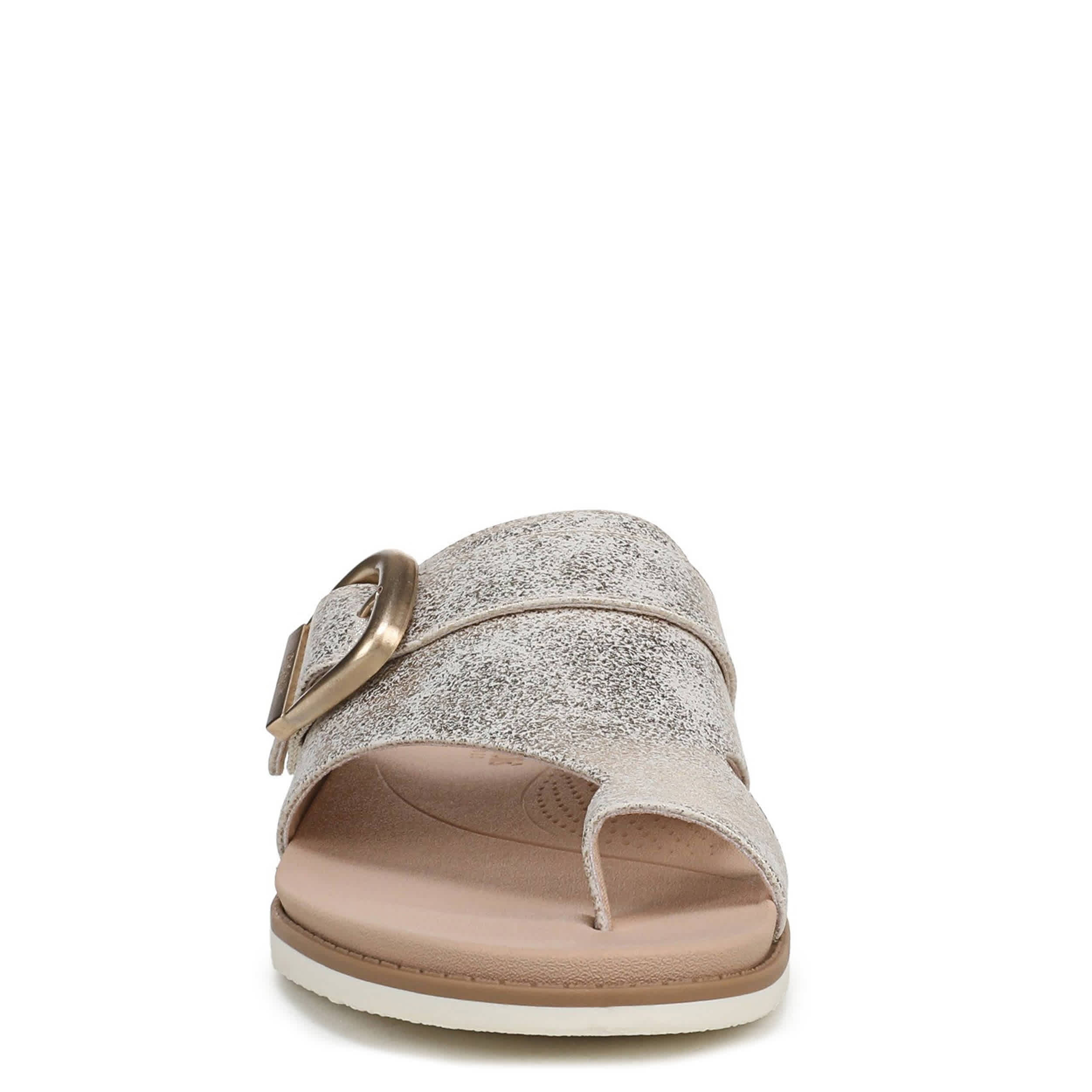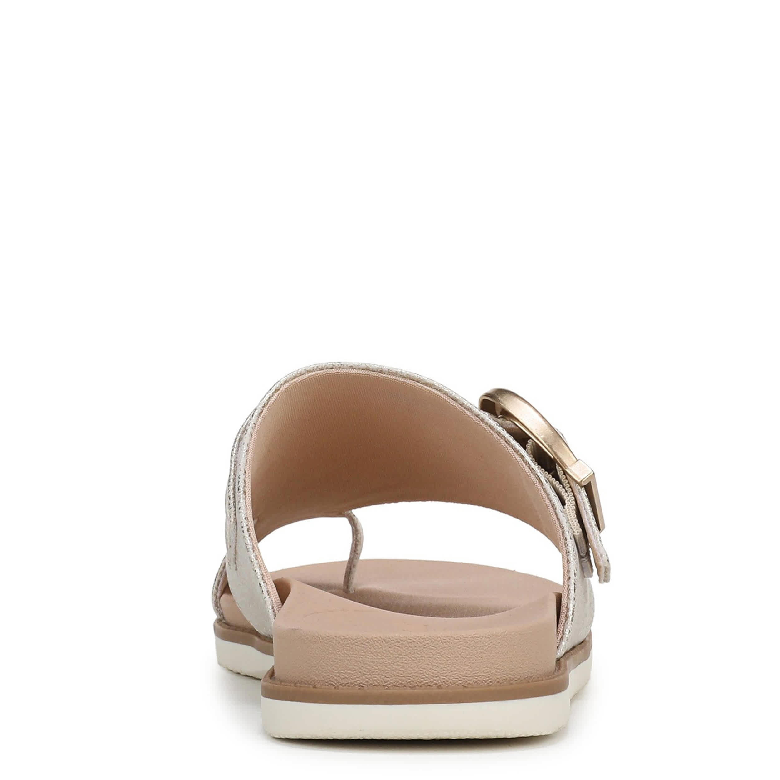 Add some modern energy with the So Clever flip flop sandal from Dr. Scholl's. Featuring a metallic faux leather upper with wide strap and a side buckle for extra style, this slide is sure to be a favorite all summer. The Feel Good Foam technology puts less pressure on your feet for a lightweight feel that adds bounce to every step.