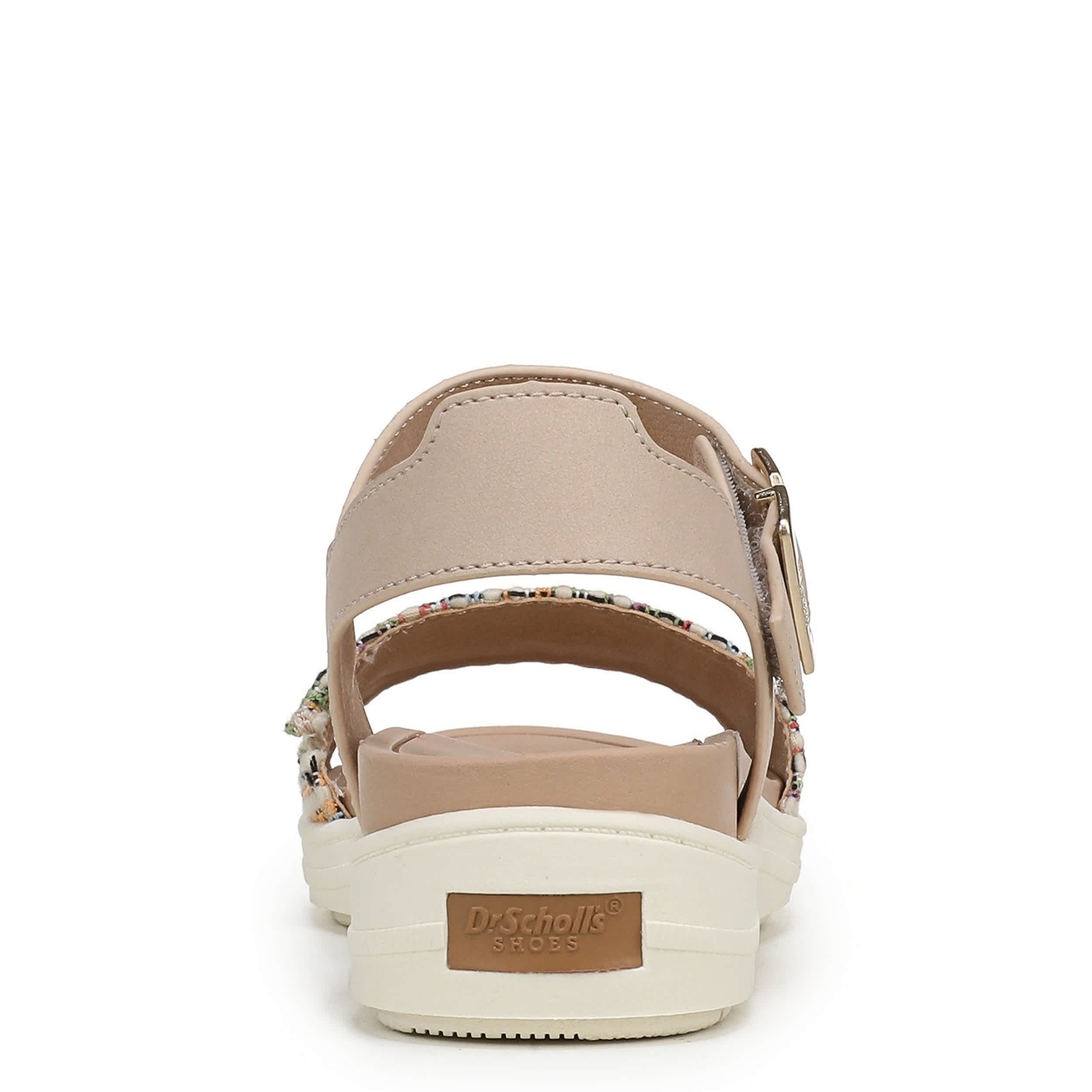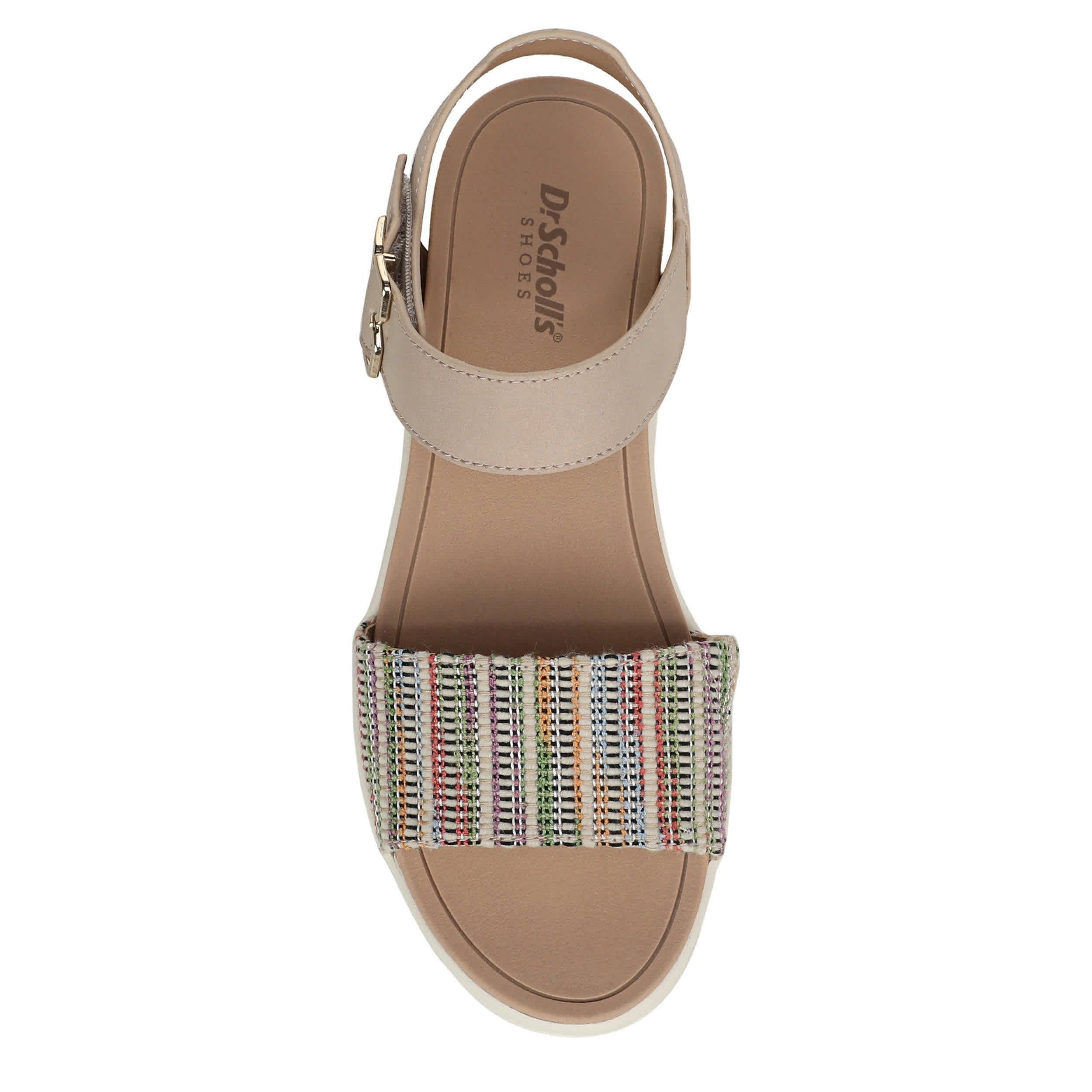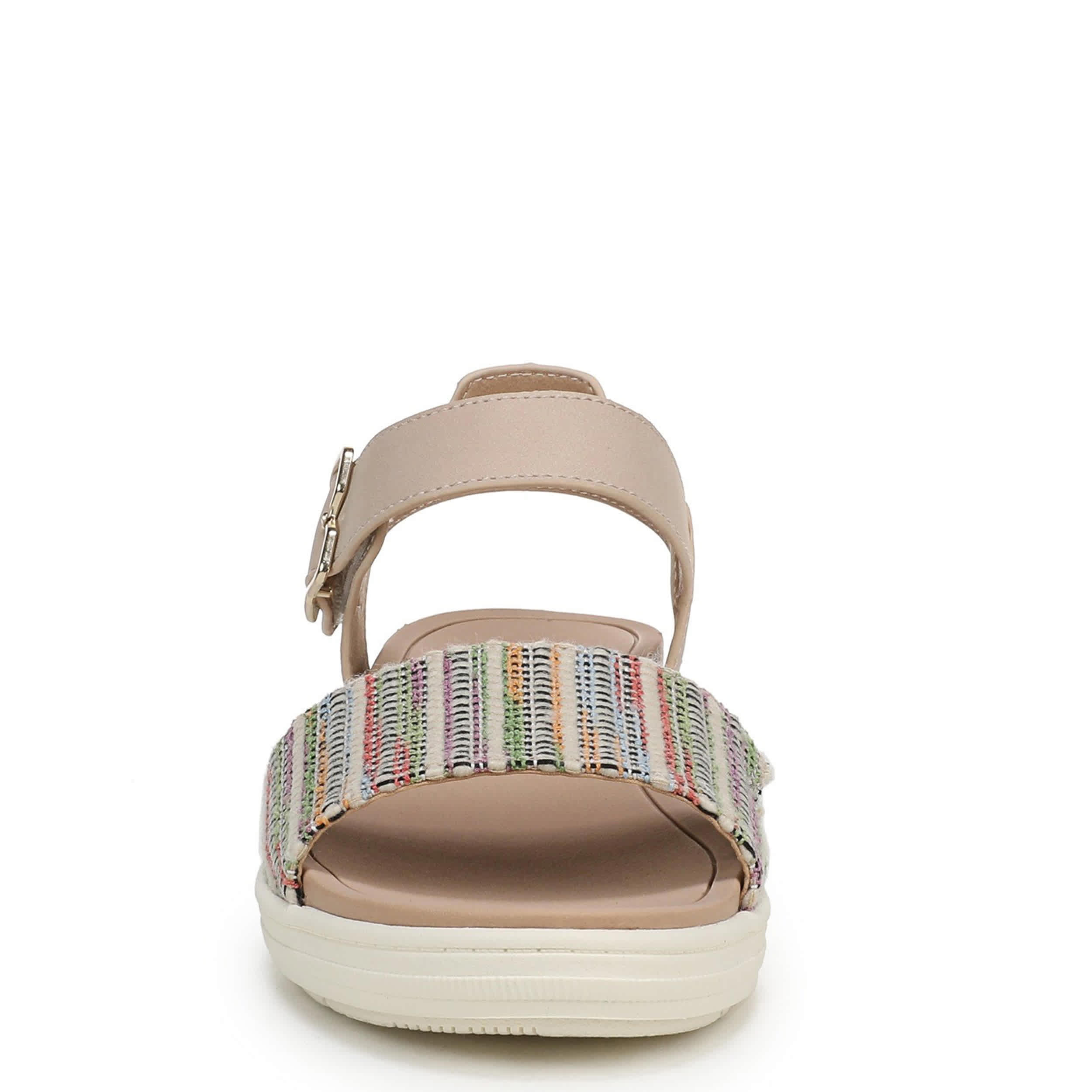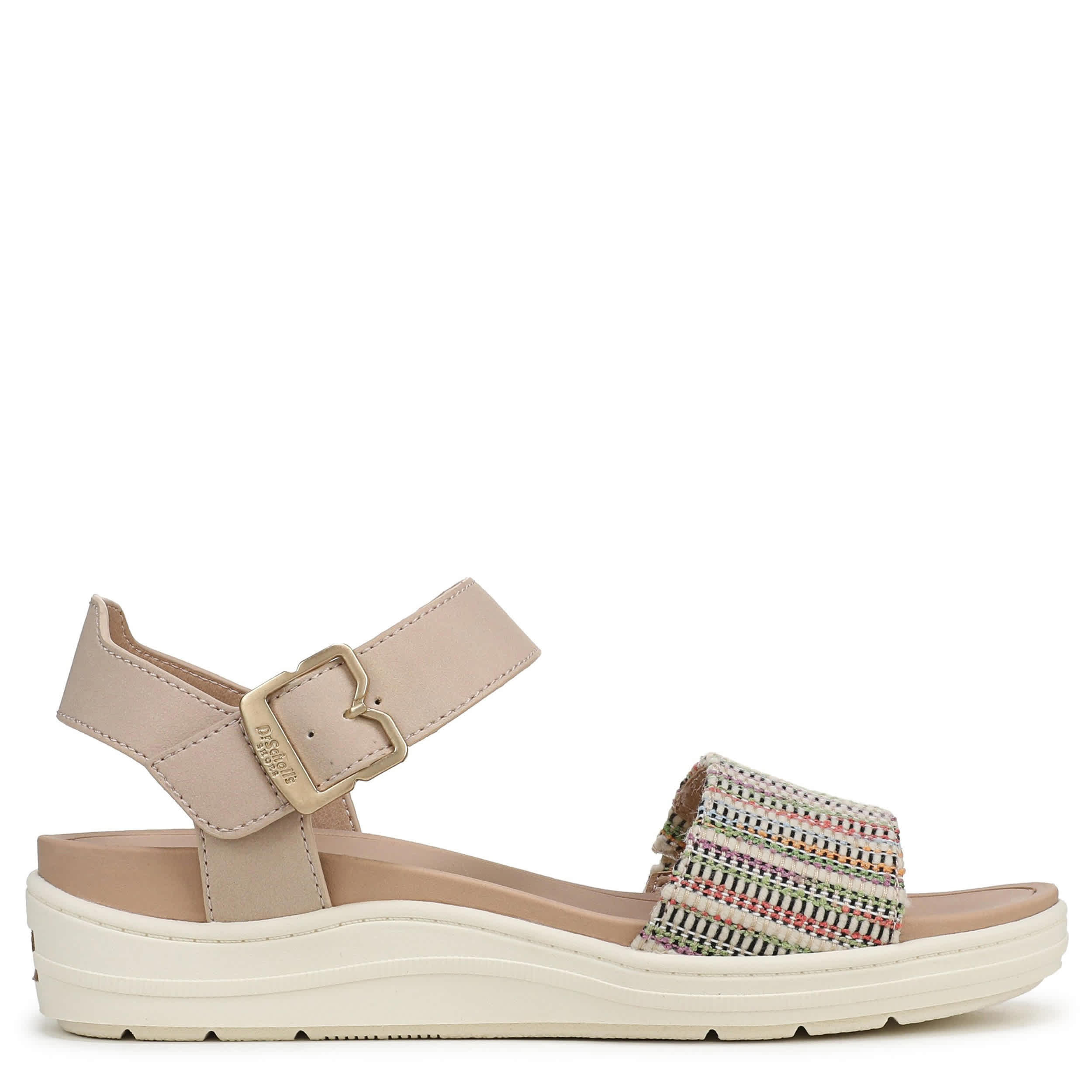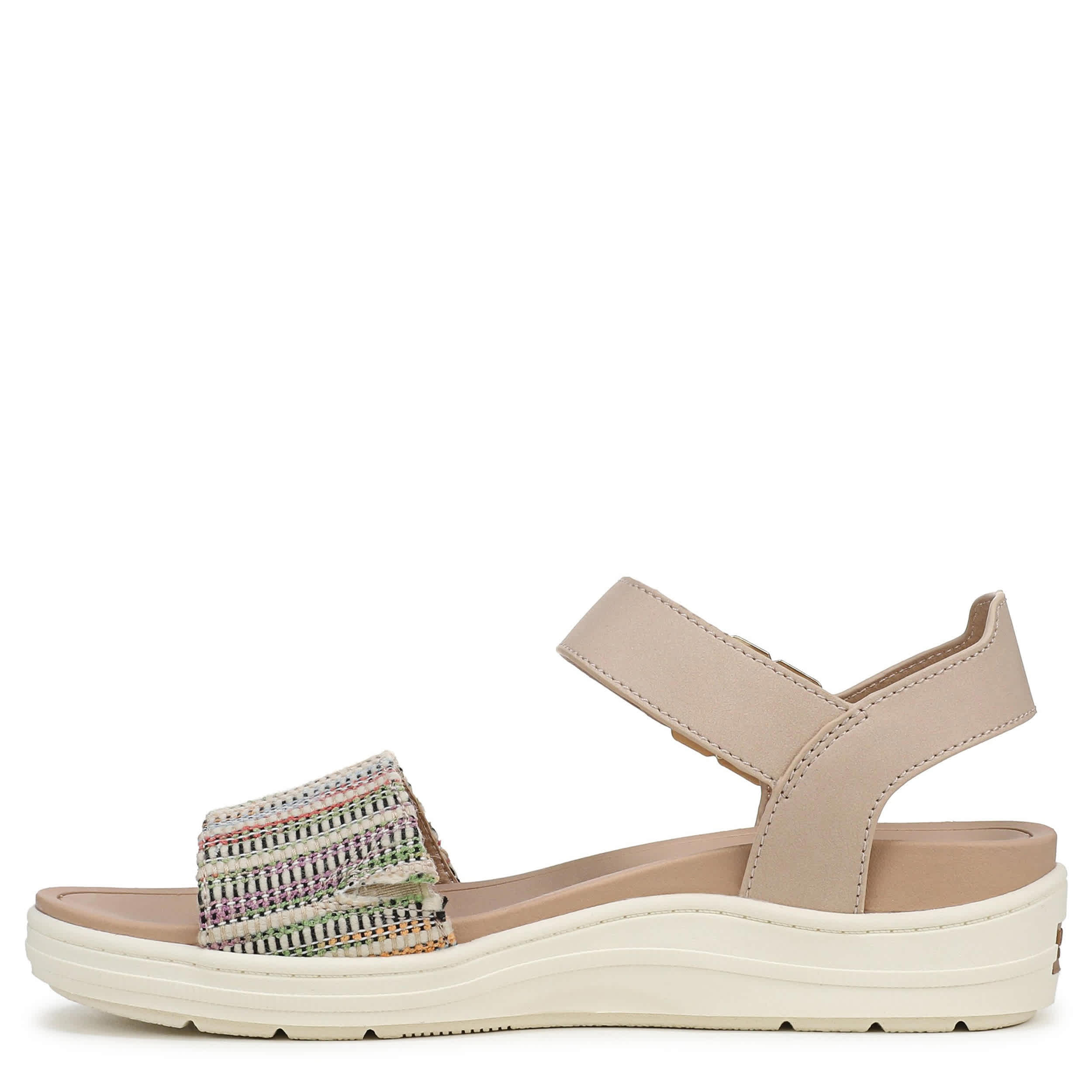 Everyday style that travels well in the Dr. Scholl’s Time Off Sky wedge sandal. Featuring a multicolored fabric & faux leather upper with an easy-on hook-and-loop ankle strap, the sky's the limit in this shoe. Anatomical cushioning, comfort, and arch support with built-in flex grooves on the lightweight sole for flexible movement.