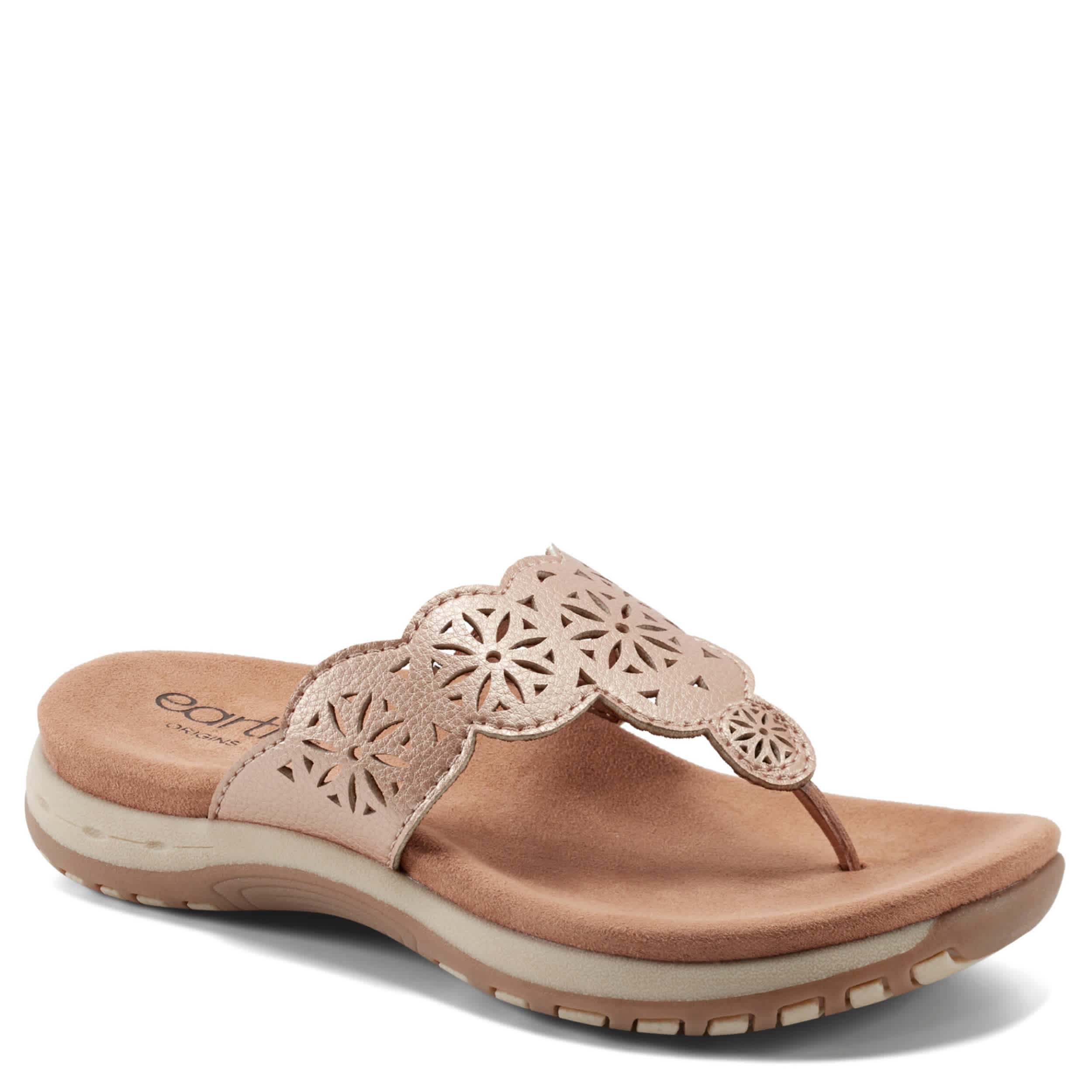 Enjoy your nighttime stroll by the shoreline in the Sadie women's flat sandal from earth. Featuring a metallic faux leather upper with a cute chopout design, this T-strap sandal also boasts arch support. The lightweight footbed cushions and absorbs shock, while the flexible sole adds to the comfort.