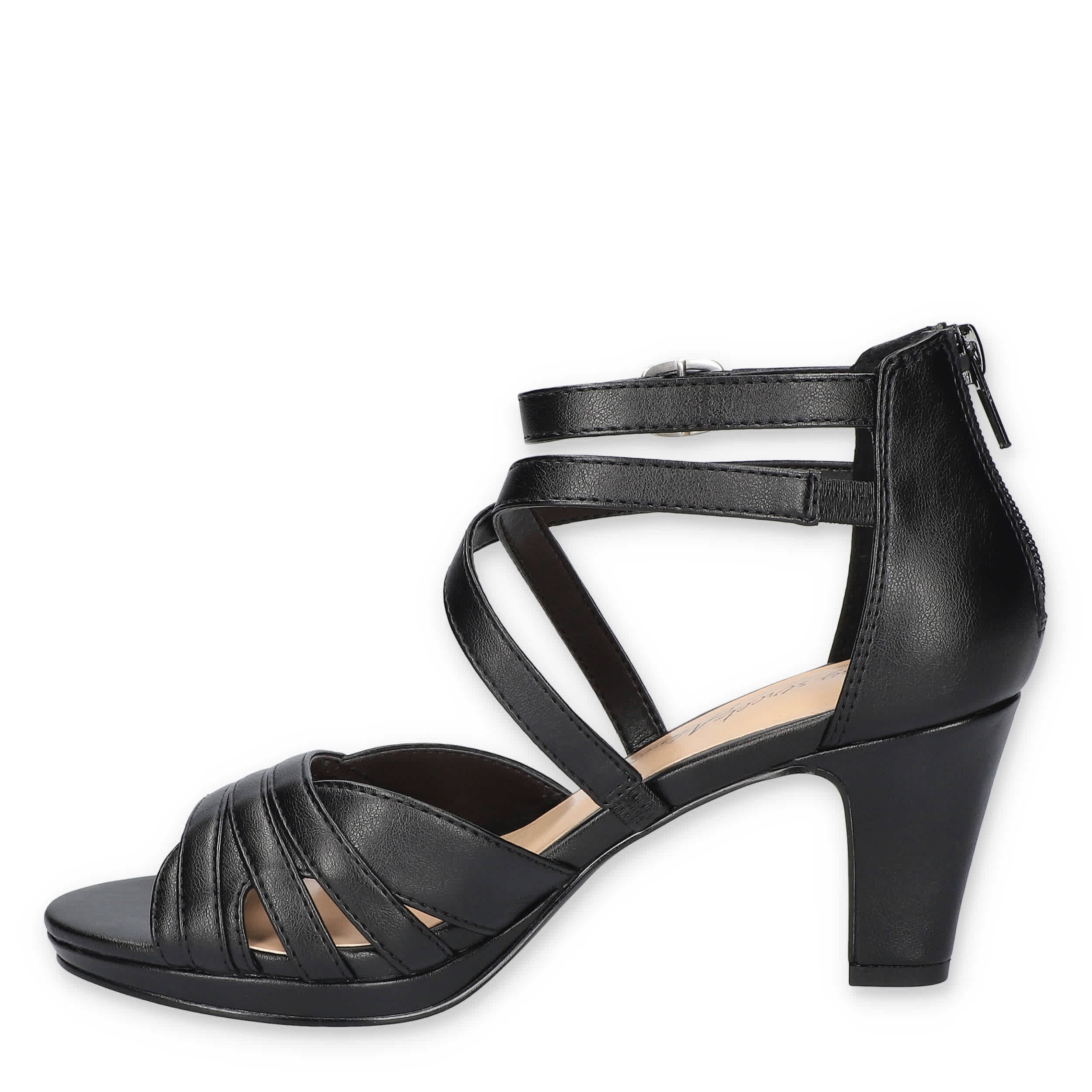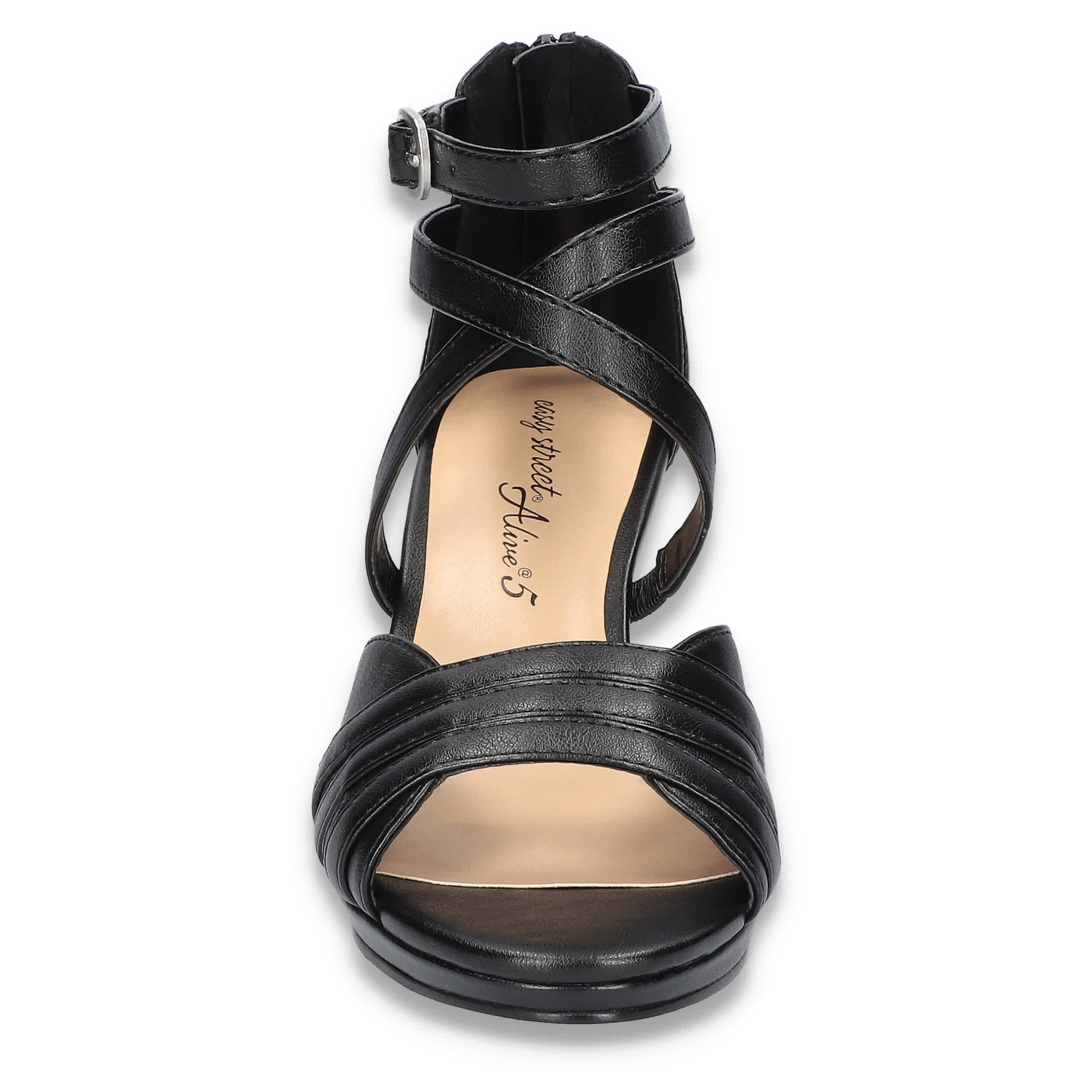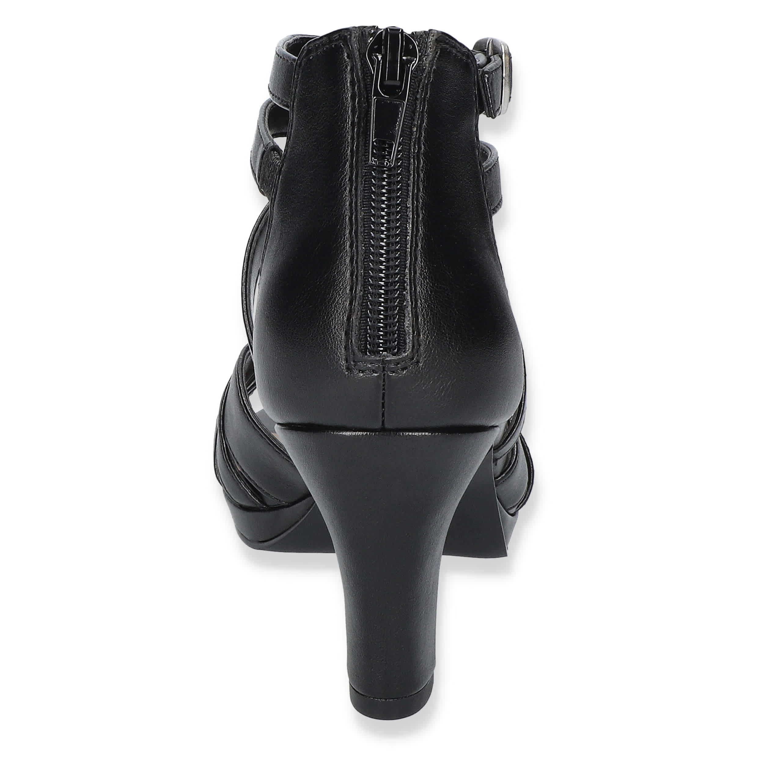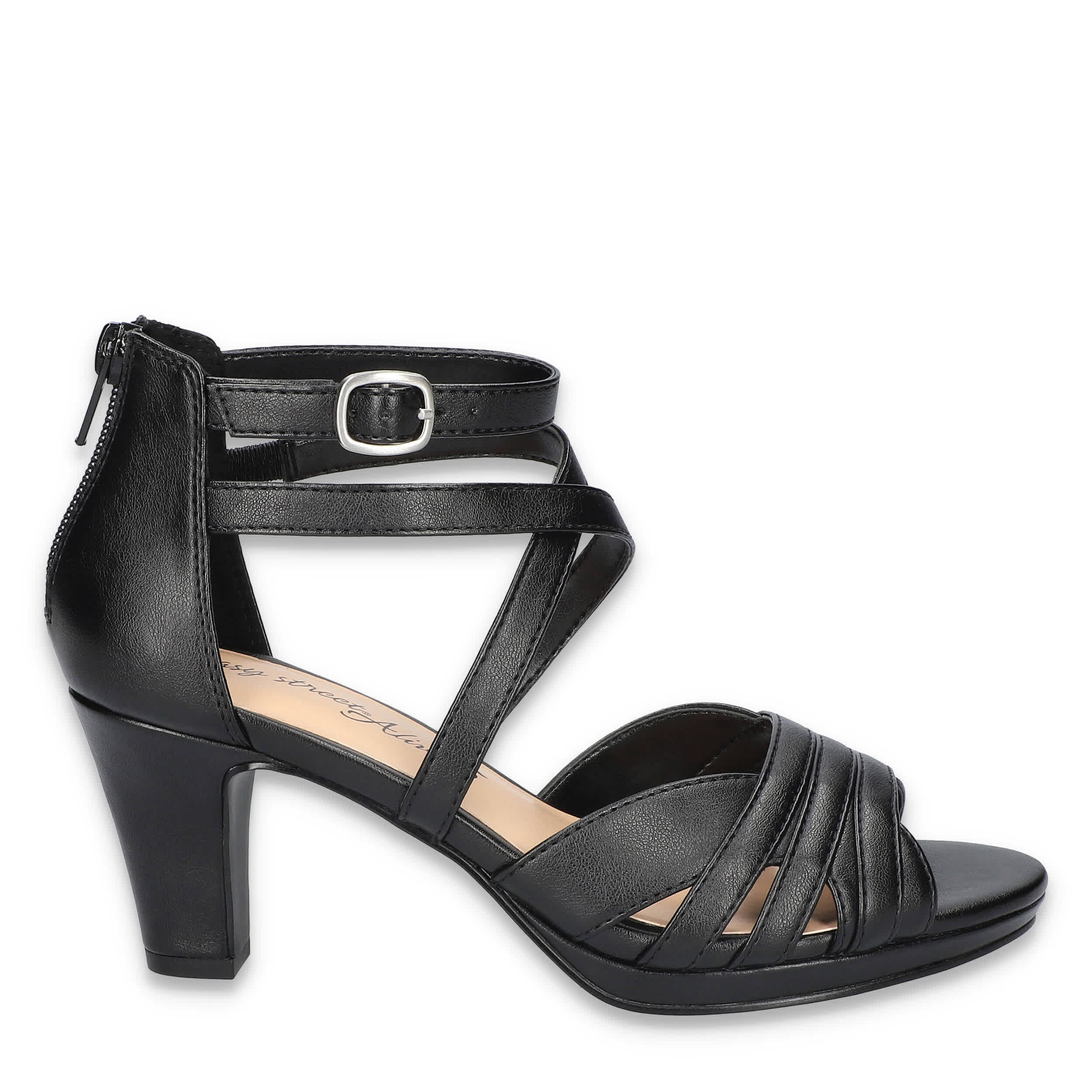 Show your style in the Crissa women's sandal from Easy Street. Featuring a faux leather upper with a multi-strap vamp and buckled strap for extra flair, this rear zip shoe is sophisticated with a hint of edge. The footbed cushions every step while the rubber sole supports the block heel.