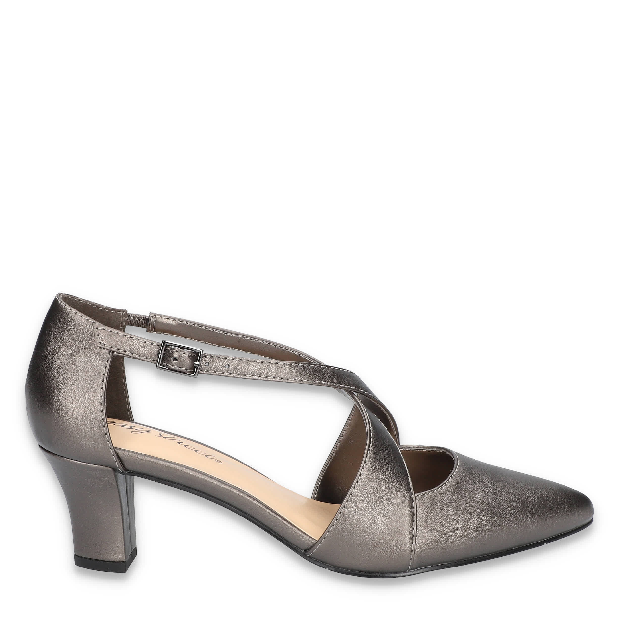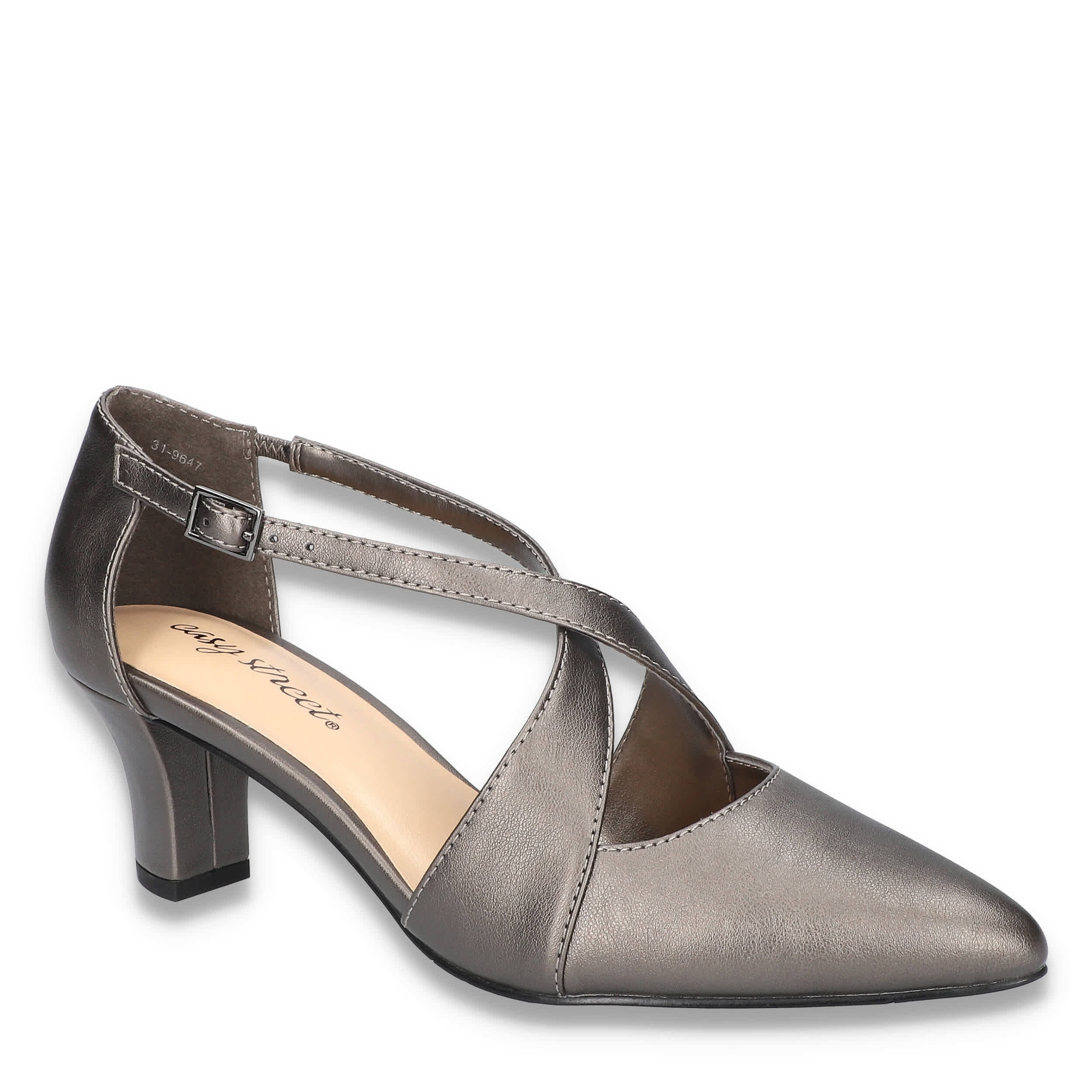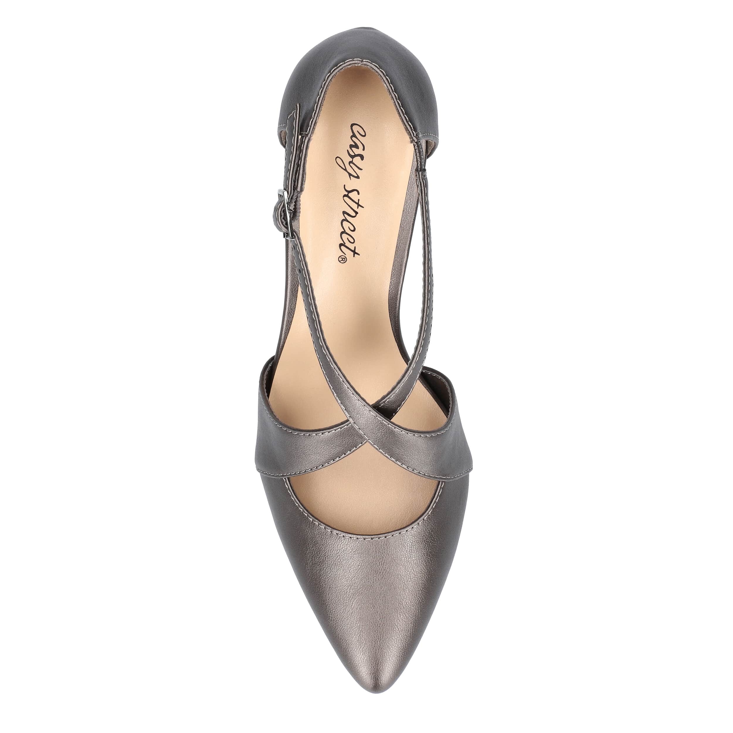 Put your sophistication forward in the Elegance women's pump from Easy Street. With a faux leather upper featuring a crossover vamp design and pointed toe for extra style, this ankle buckle strap shoe enhances your look. The footbed & flexible sole comfortably support every step on the just high enough heel.