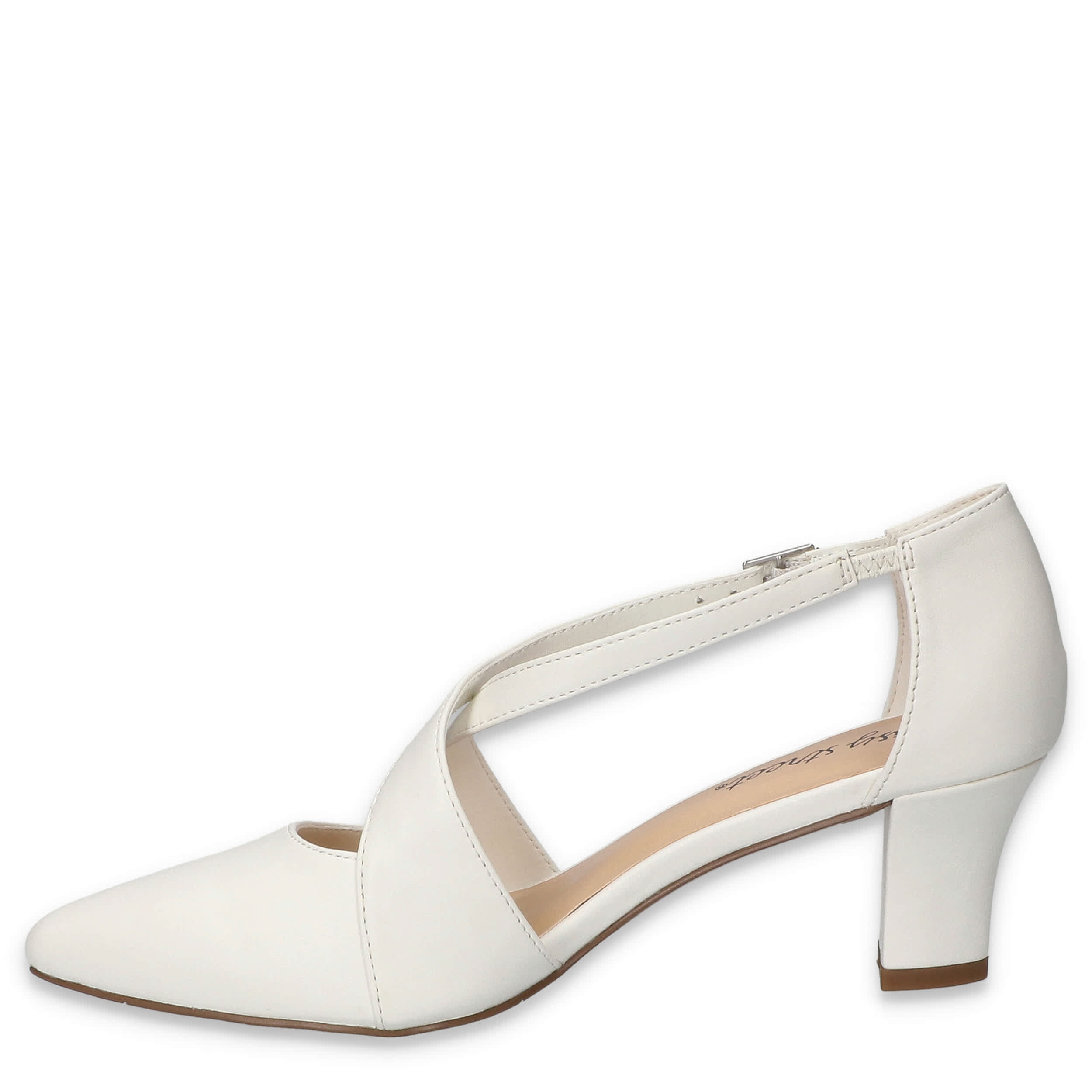 Put your sophistication forward in the Elegance women's pump from Easy Street. With a faux leather upper featuring a crossover vamp design and pointed toe for extra style, this ankle buckle strap shoe enhances your look. The footbed & flexible sole comfortably support every step on the just high enough heel.