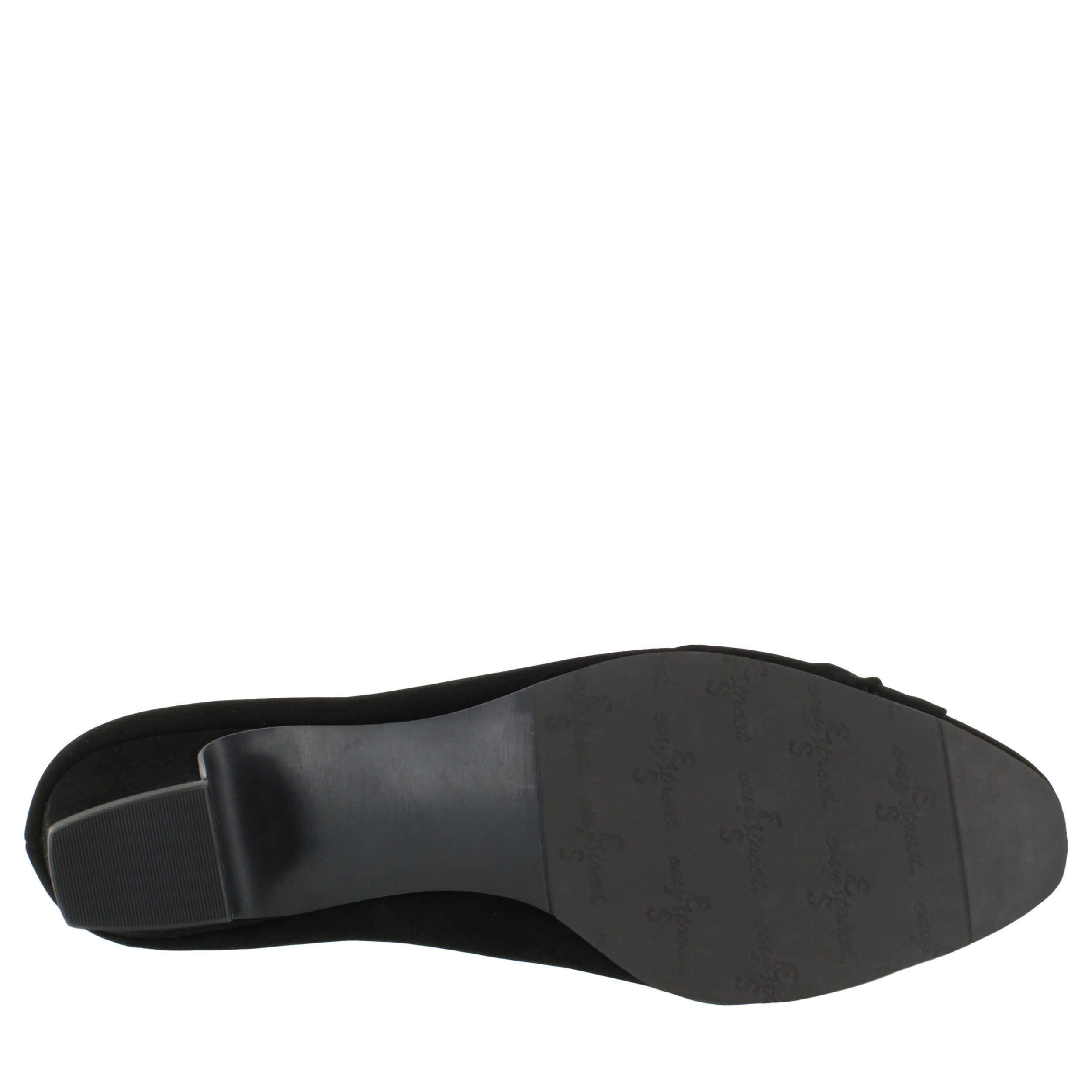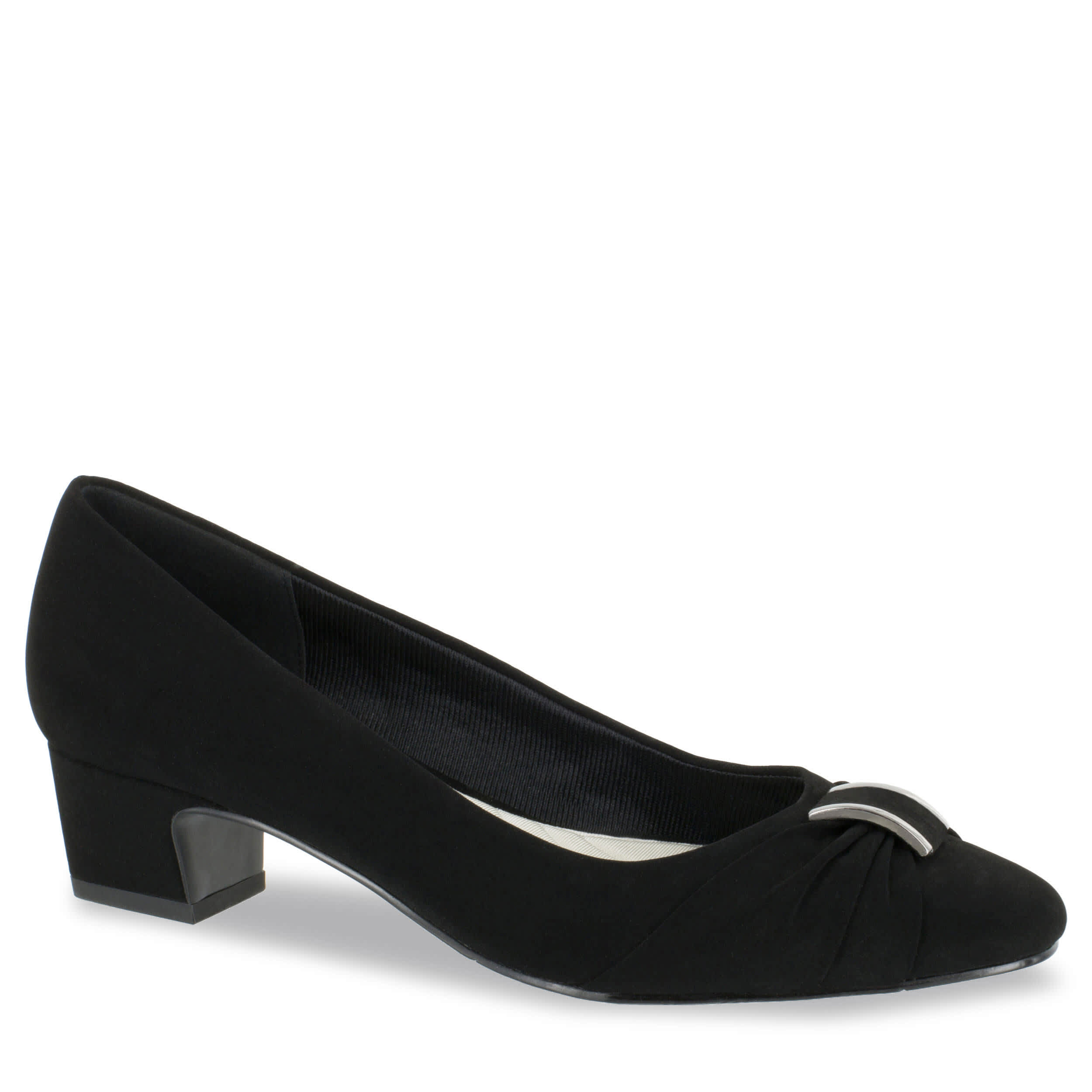 Dress it up with the Eloise pump from Easy Street. With a satin upper featuring vamp ruching with rhinestones for extra style, this slip-on shoe also has an almond toe. The insole cushions your steps while the short kitten heel offers just enough lift to elevate your look.