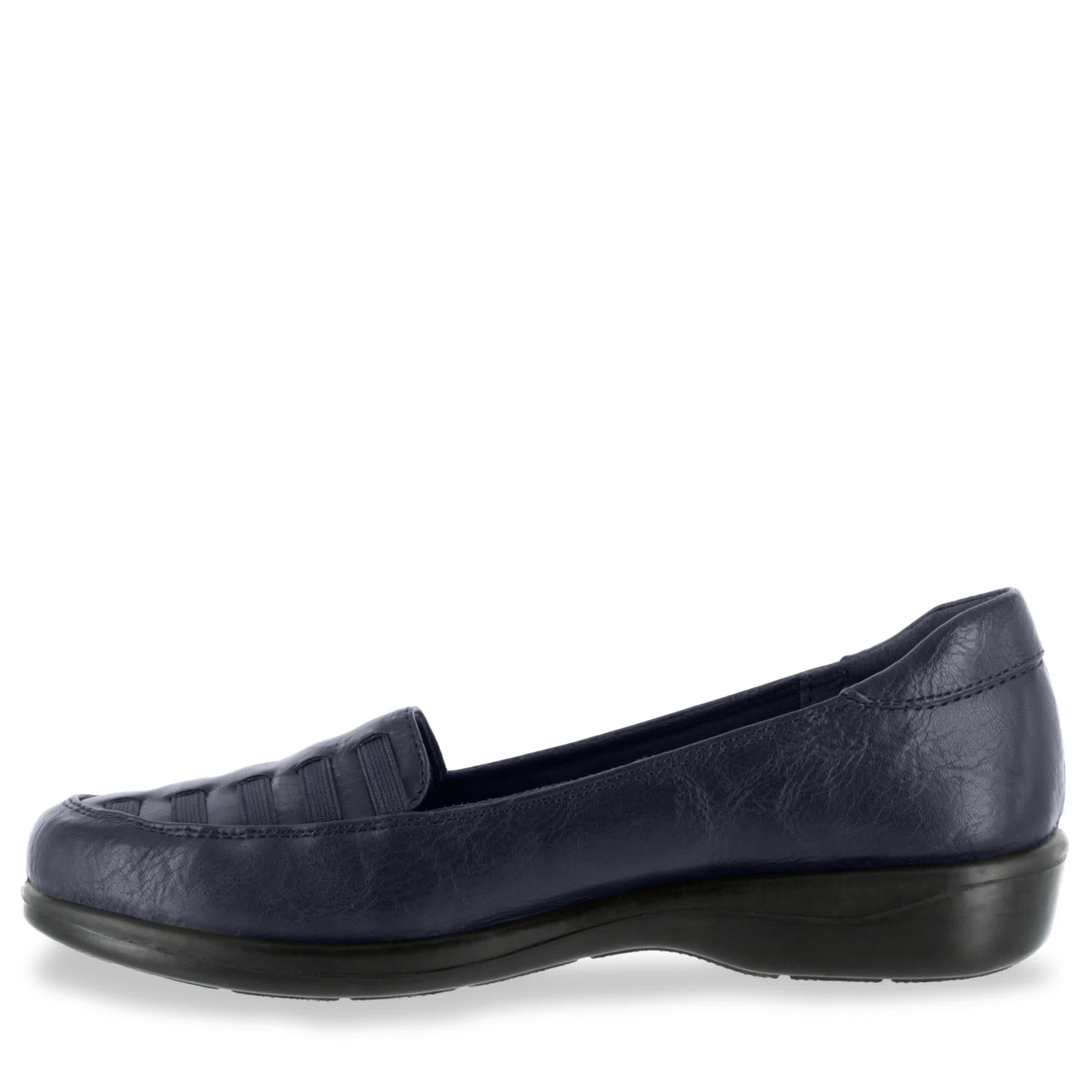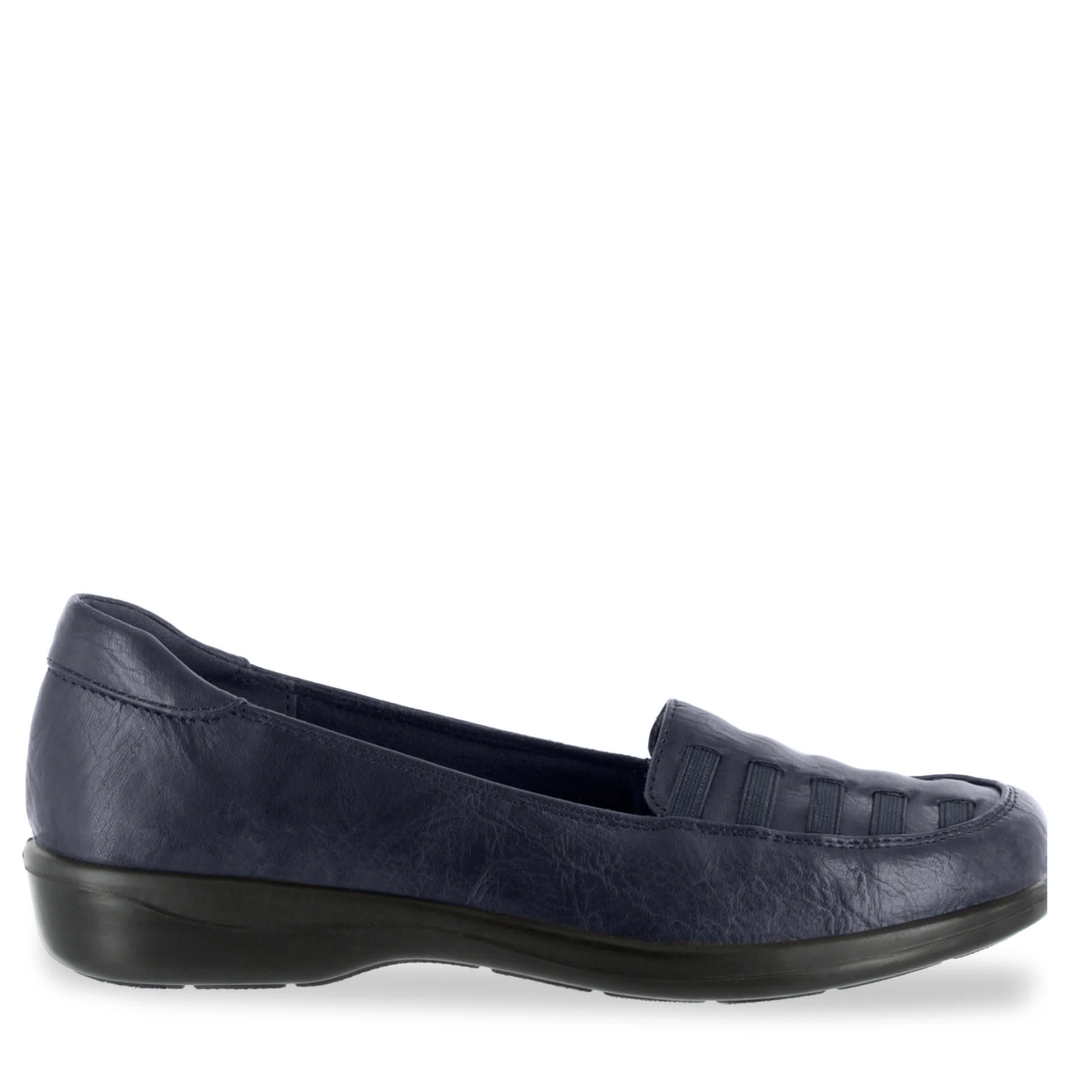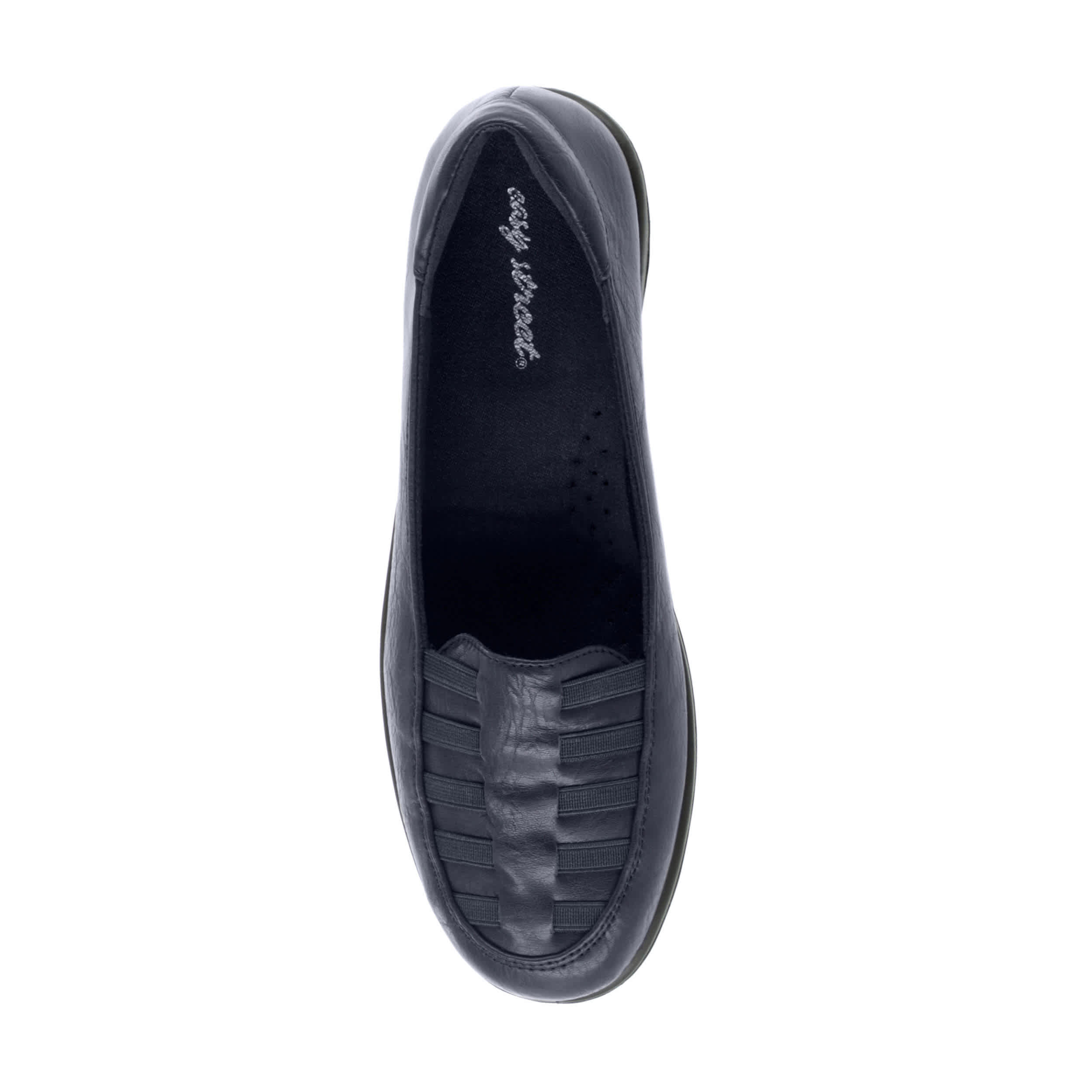 Comfortable and casually stylish, try the Easy Street Genesis women's flat. With a faux leather upper and decorative elastic straps along the vamp, this slip-on flat will look great with jeans and slacks. The synthetic lining and sole soothes your foot and adds stability as you take on your day.