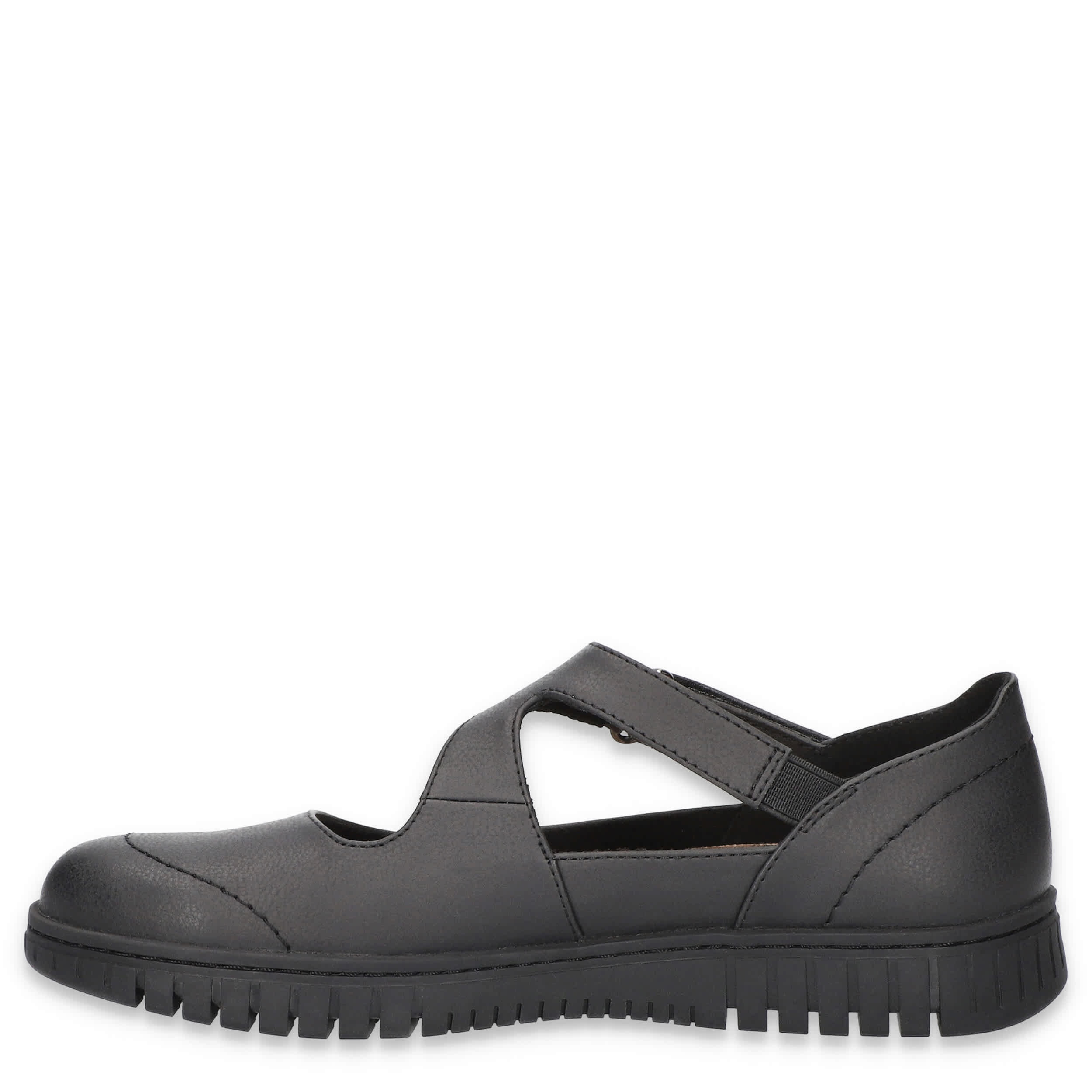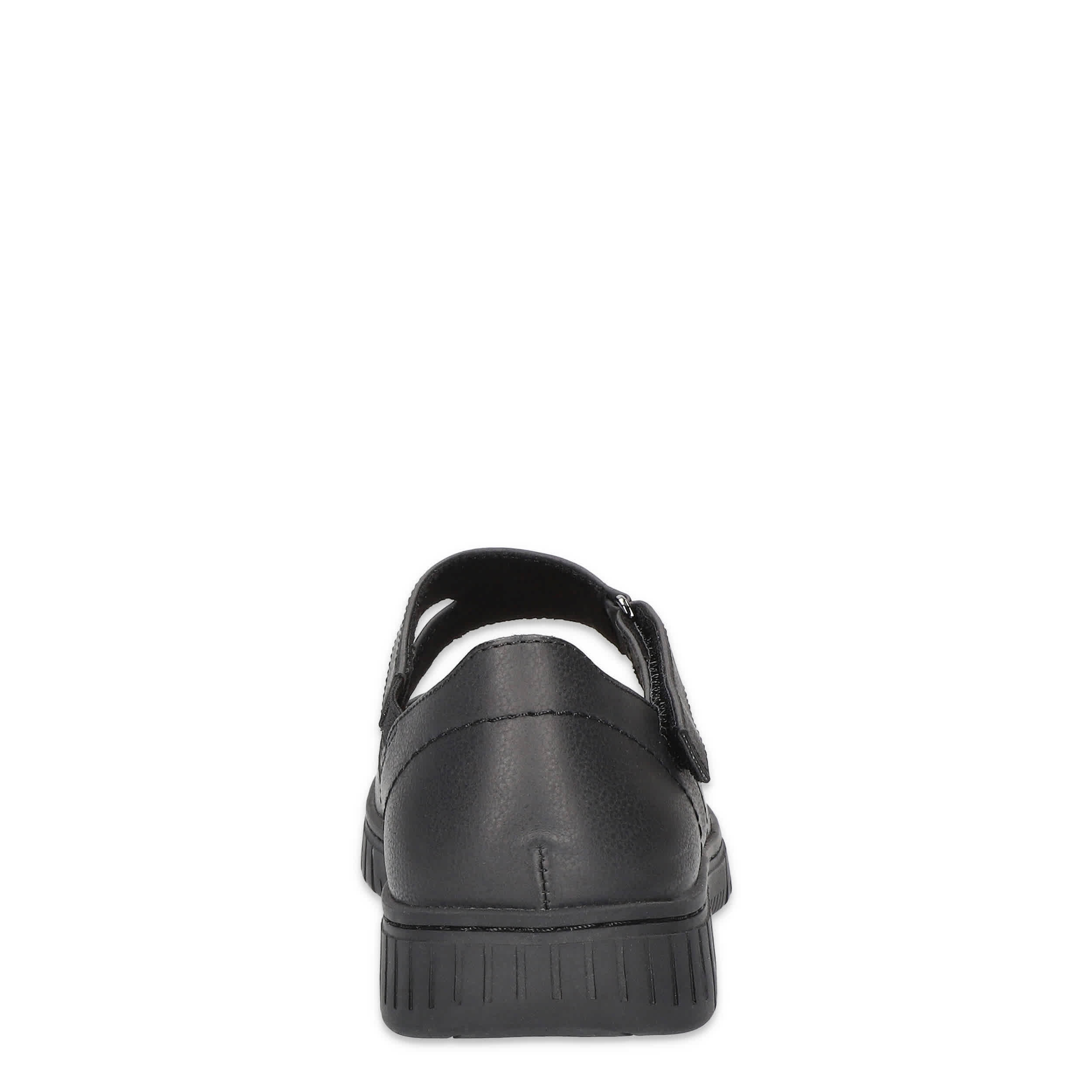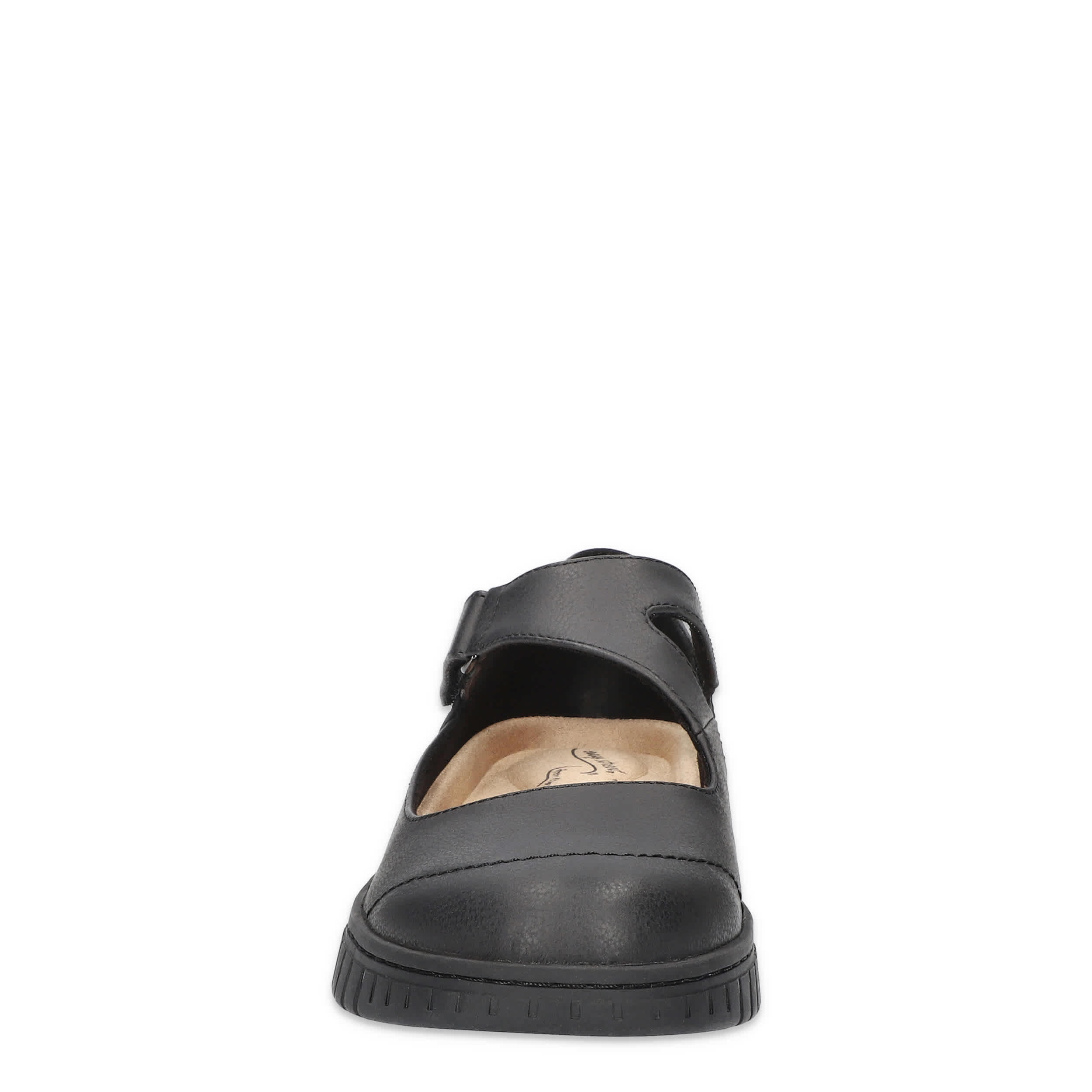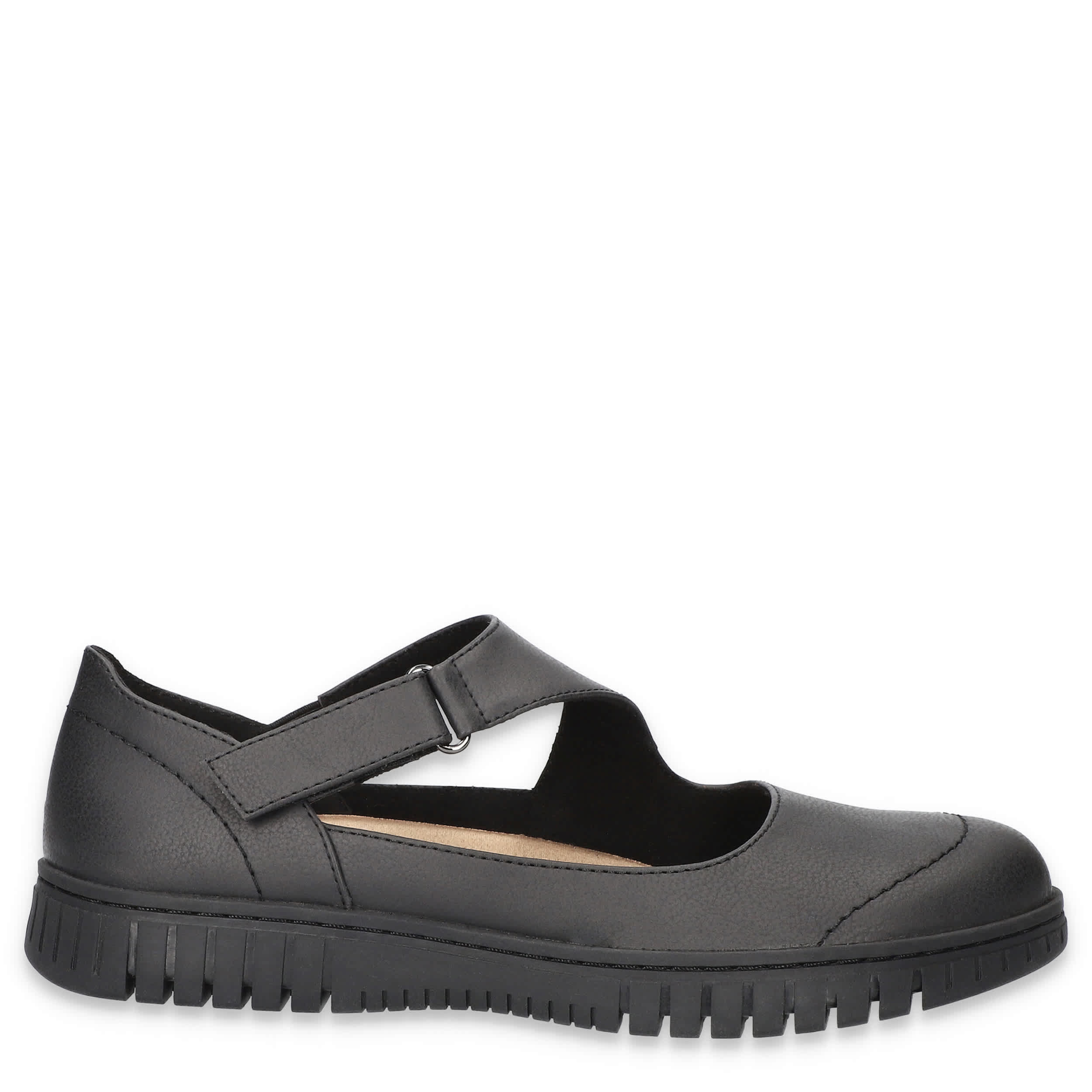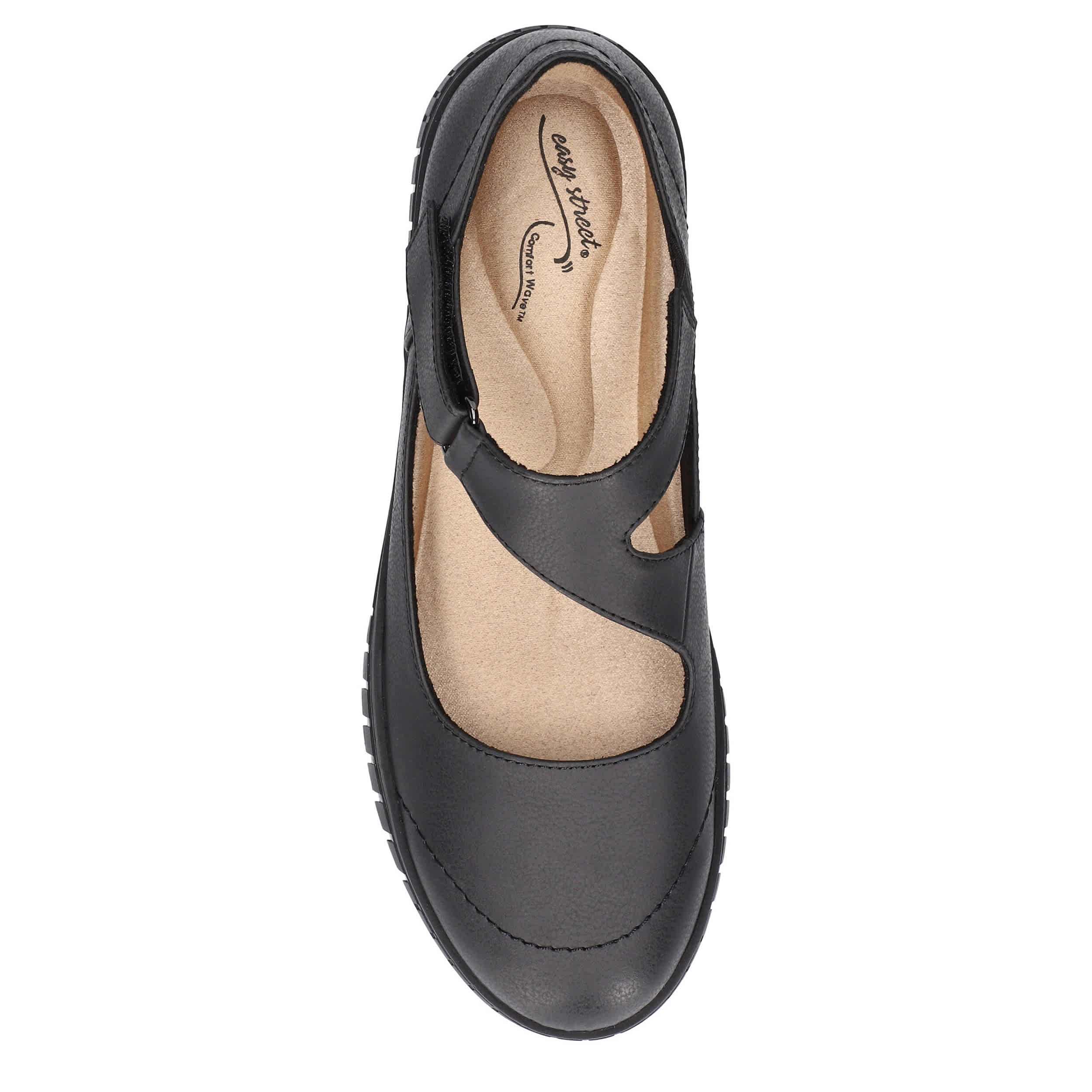 Travel to work or out of town in the Easy Street Joyful Mary Jane women's flat. With a faux leather upper featuring an asymmetrical strap design, this hook-and-loop strap Mary Jane-styled flat is perfect for running errands or taking a walk.The removable Easy Motion insole enhanced with Comfort Wave construction provides all-day support and cushioning.