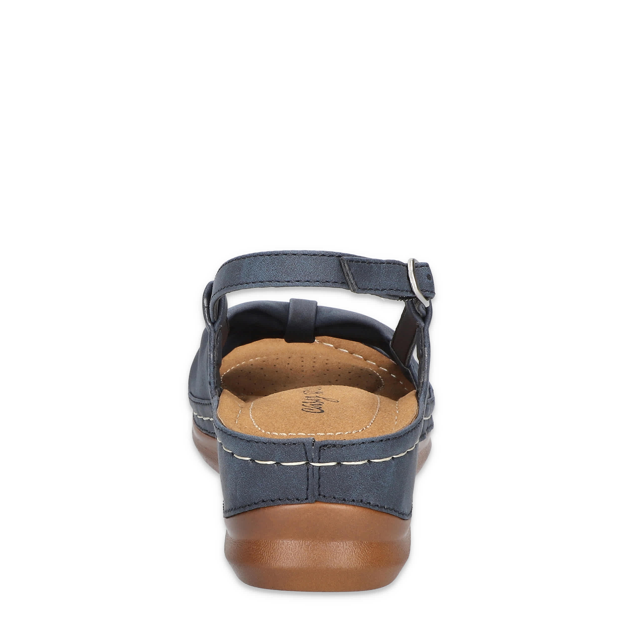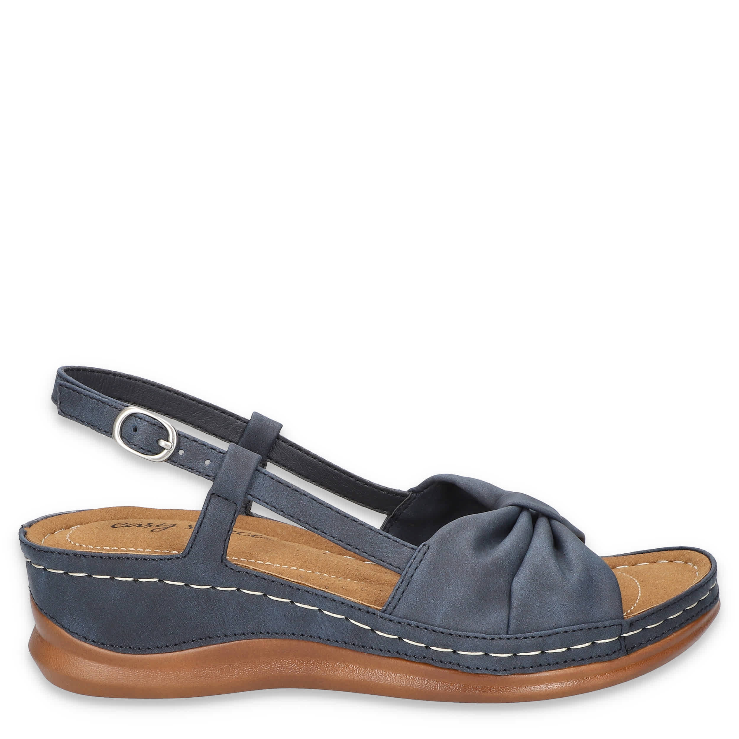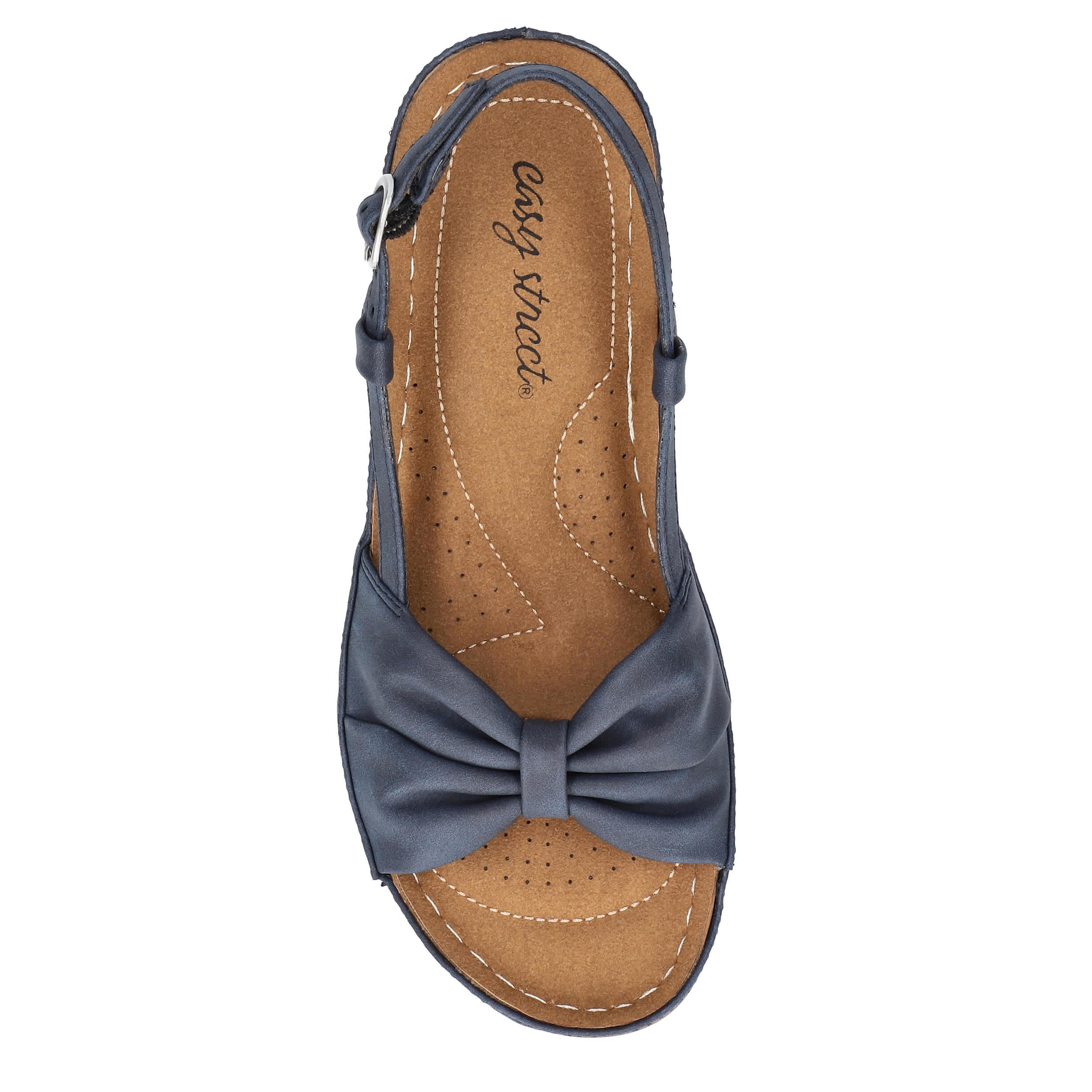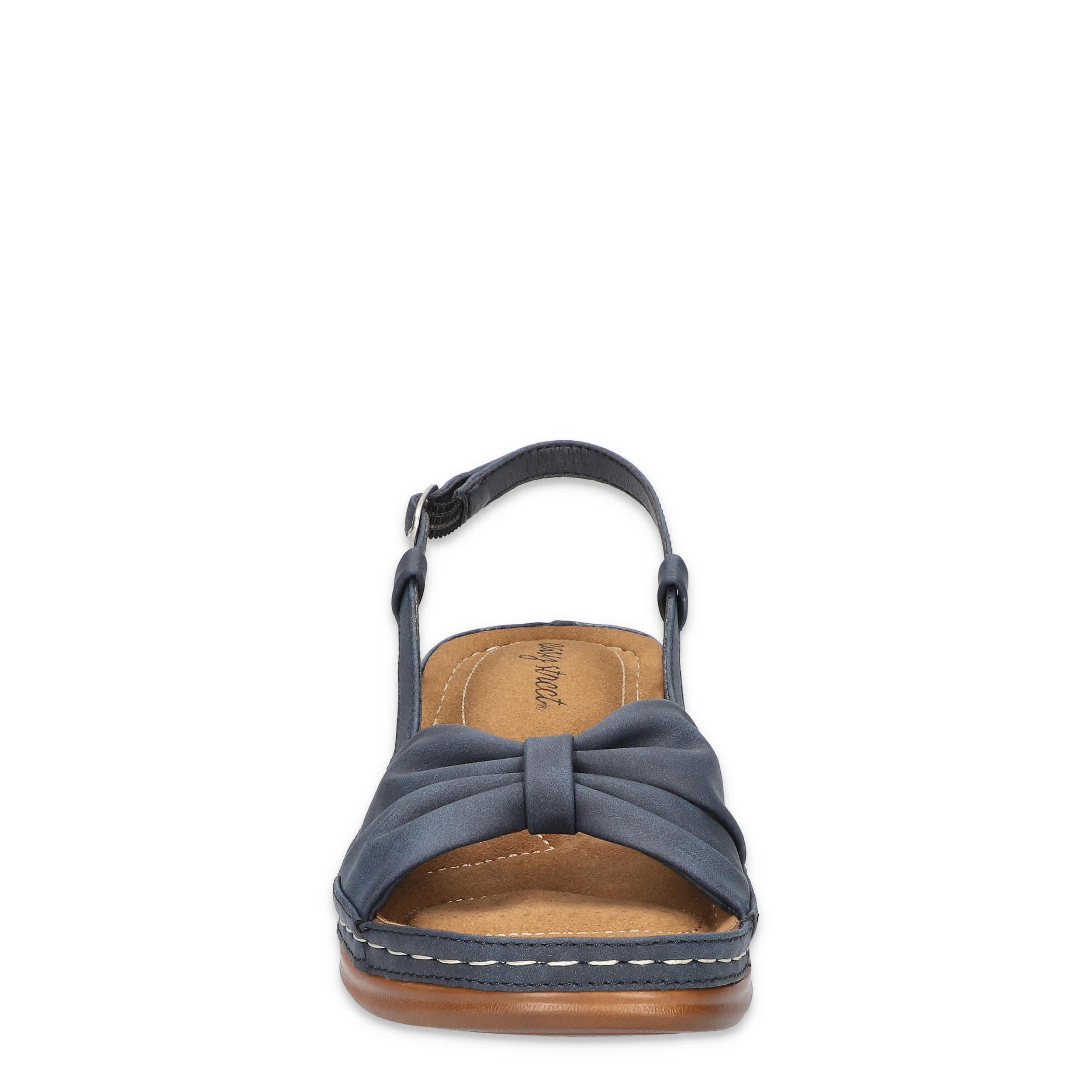 Stellar style starts with the Jupiter women's wedge sandal from Easy Street. Featuring a synthetic upper with a knotted vamp, this sandal's slingback silhouette is great in the heat. The stitched footbed cushions from heel-to-toe, while the wedge heel adds a little lift.