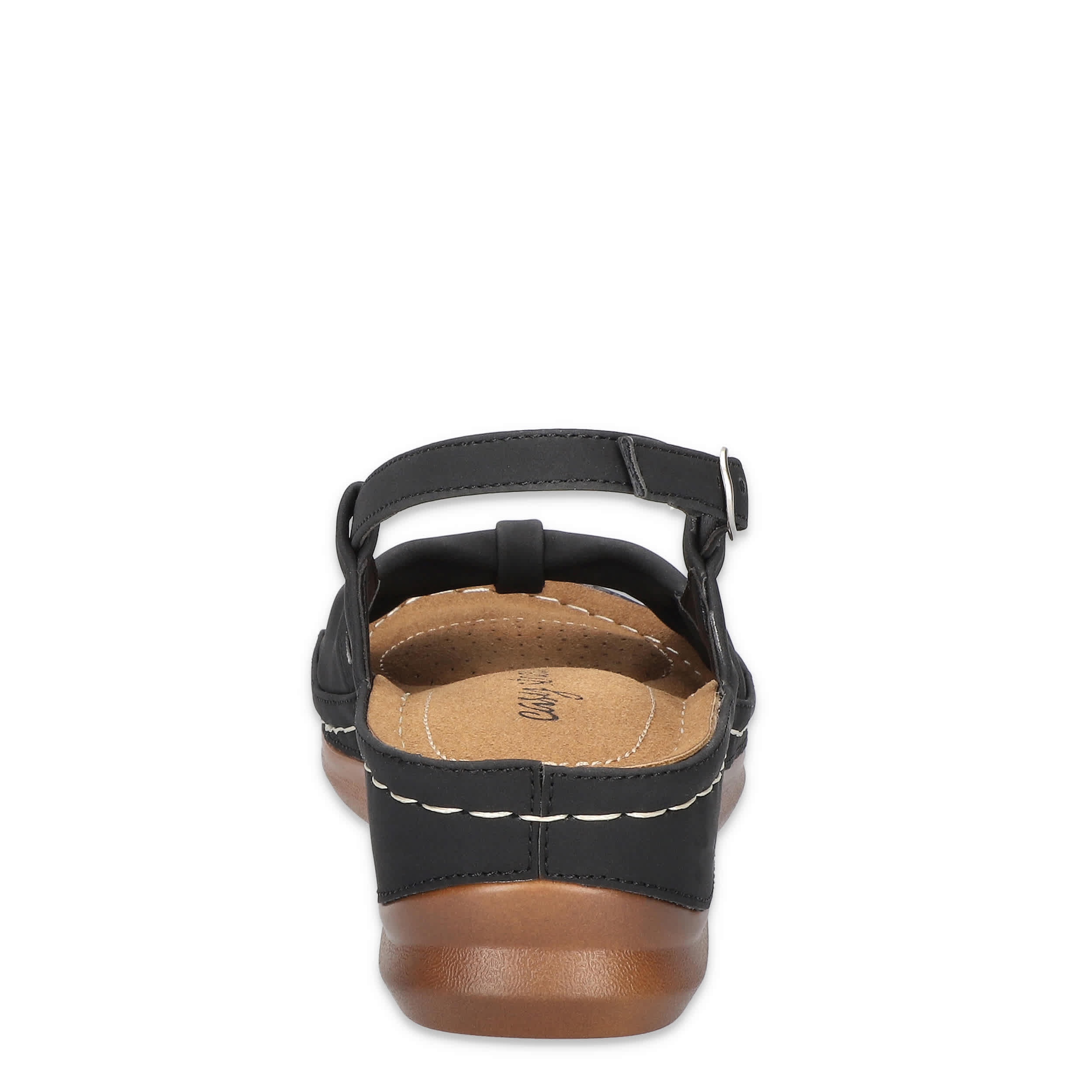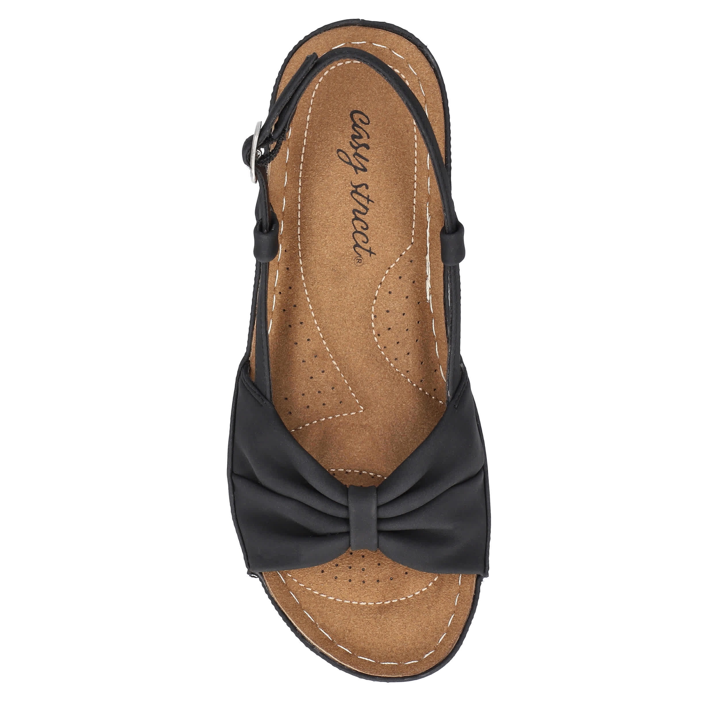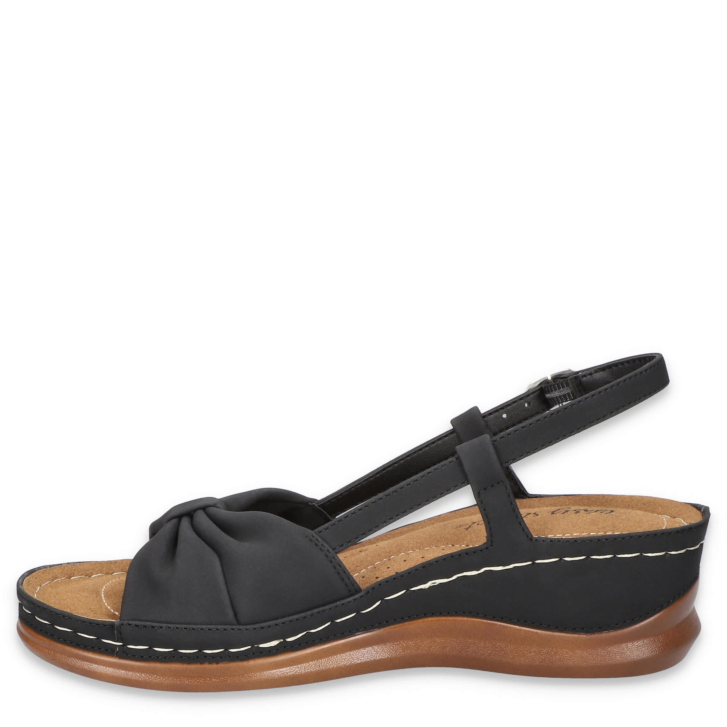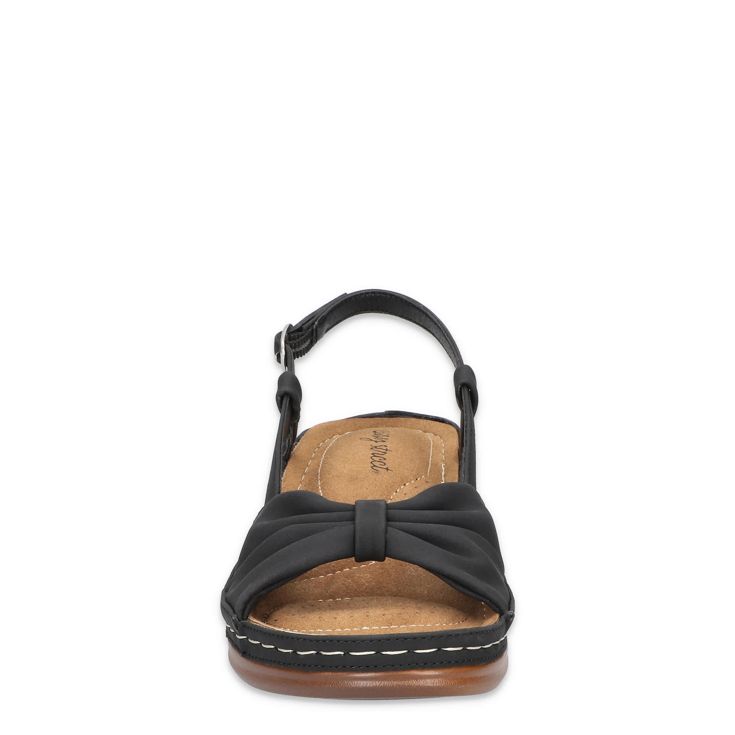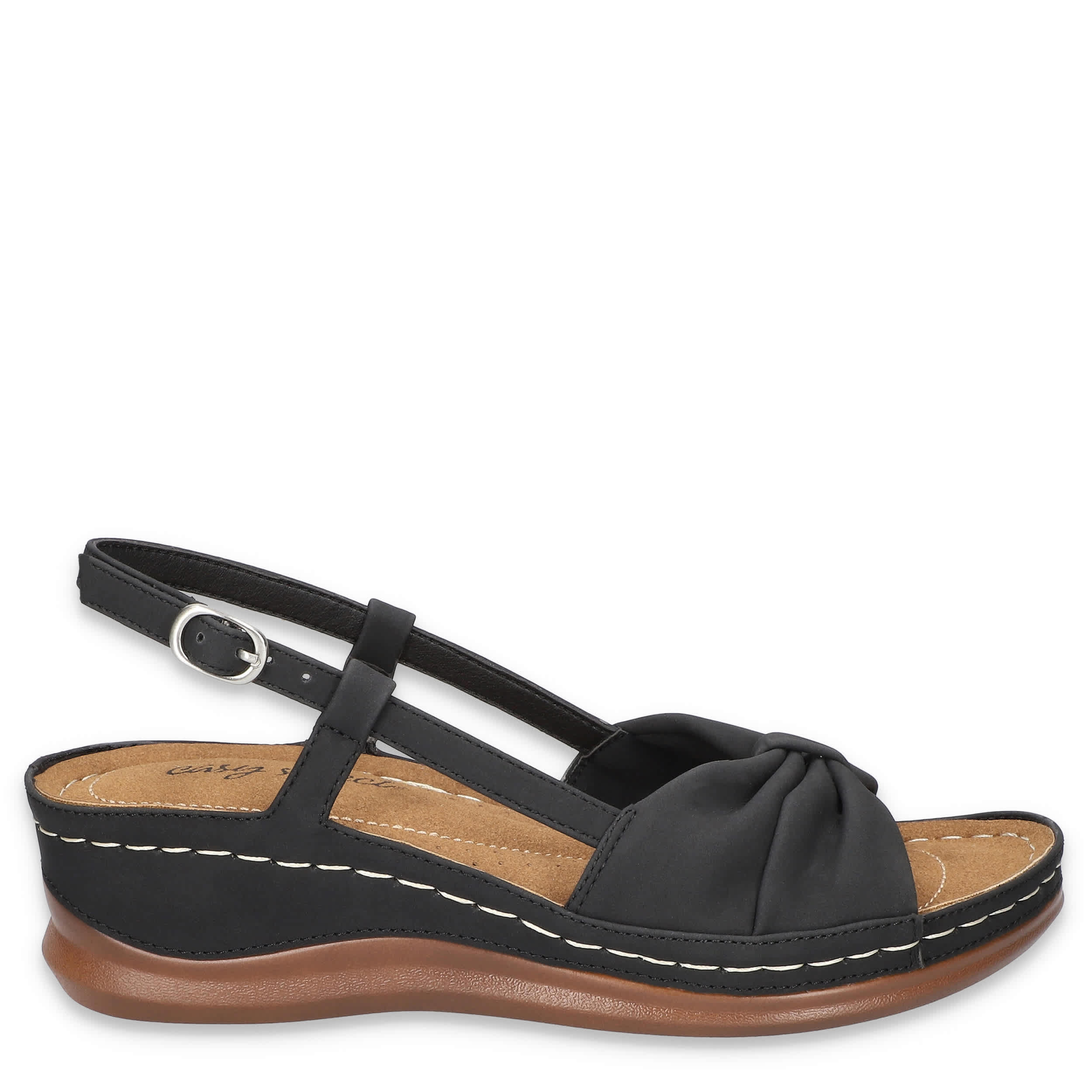 Stellar style starts with the Jupiter women's wedge sandal from Easy Street. Featuring a synthetic upper with a knotted vamp, this sandal's slingback silhouette is great in the heat. The stitched footbed cushions from heel-to-toe, while the wedge heel adds a little lift.