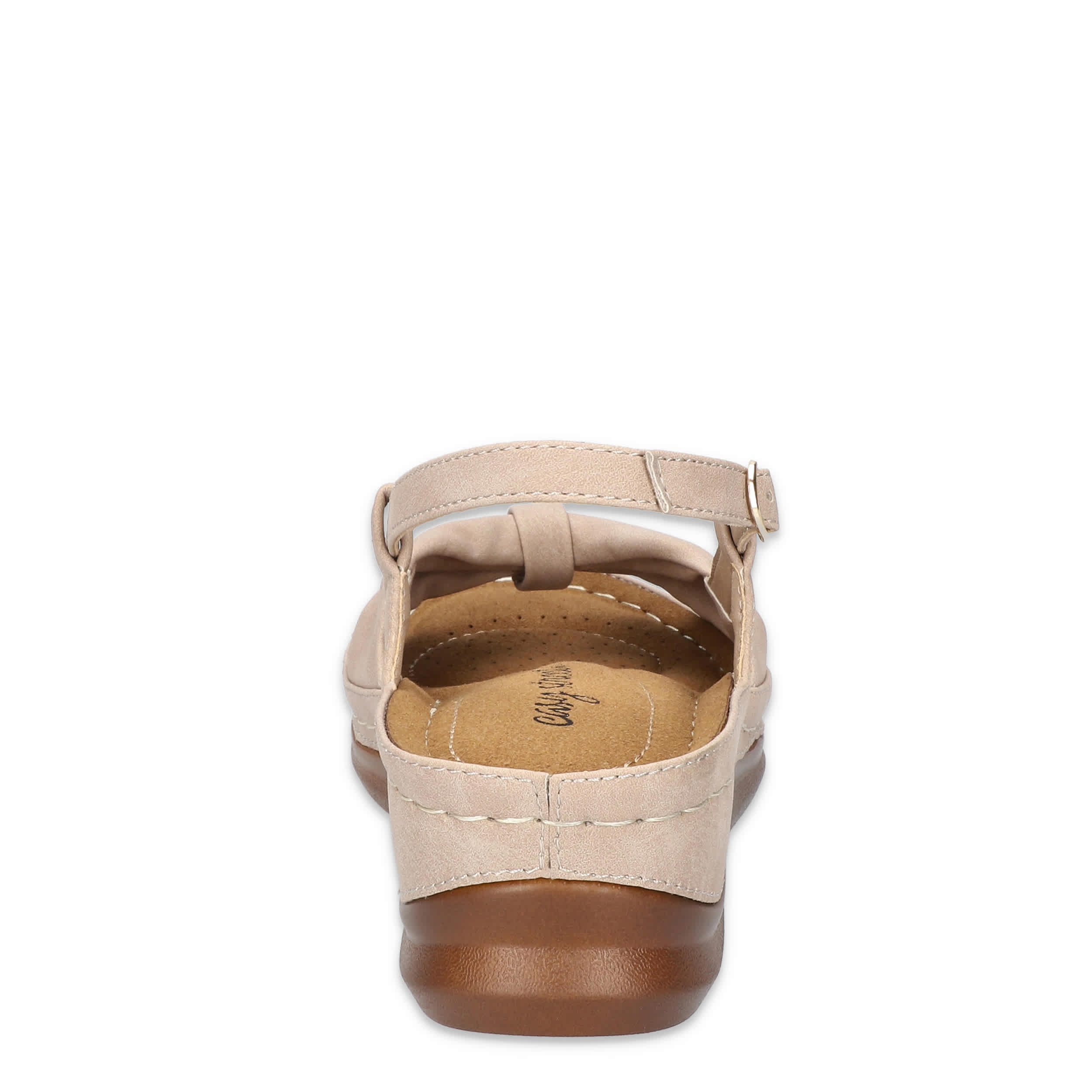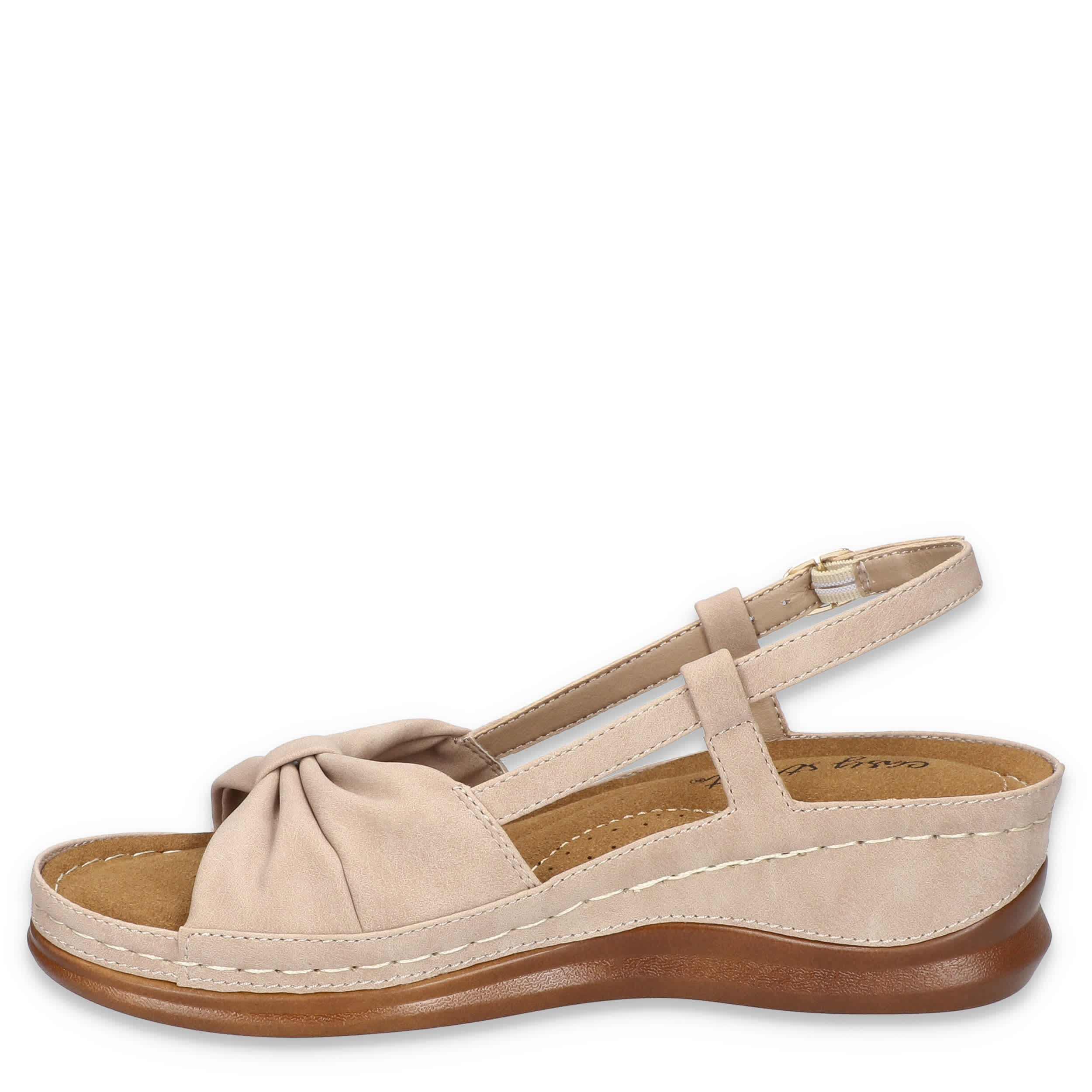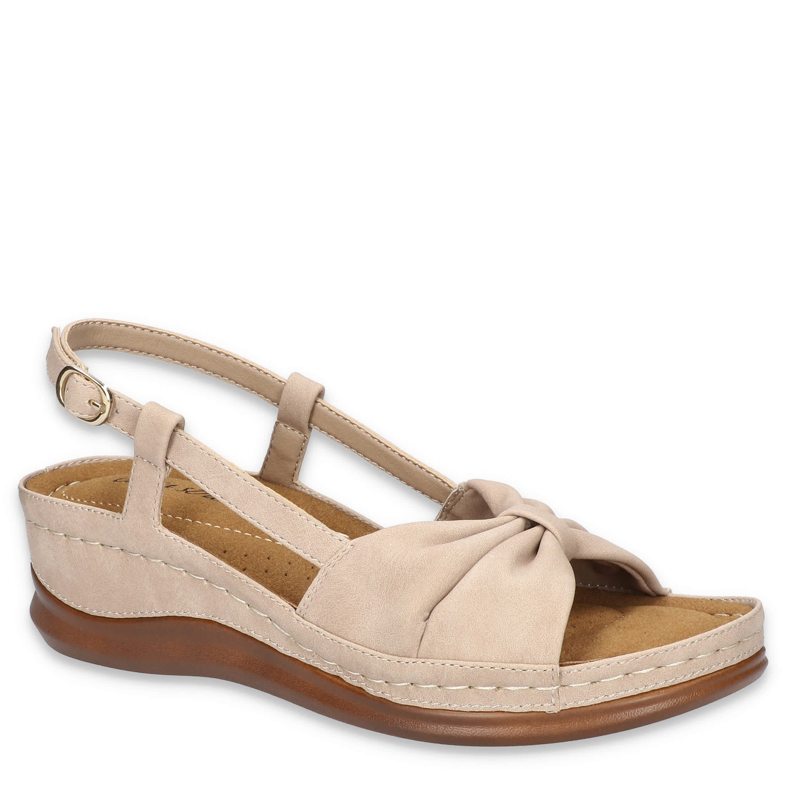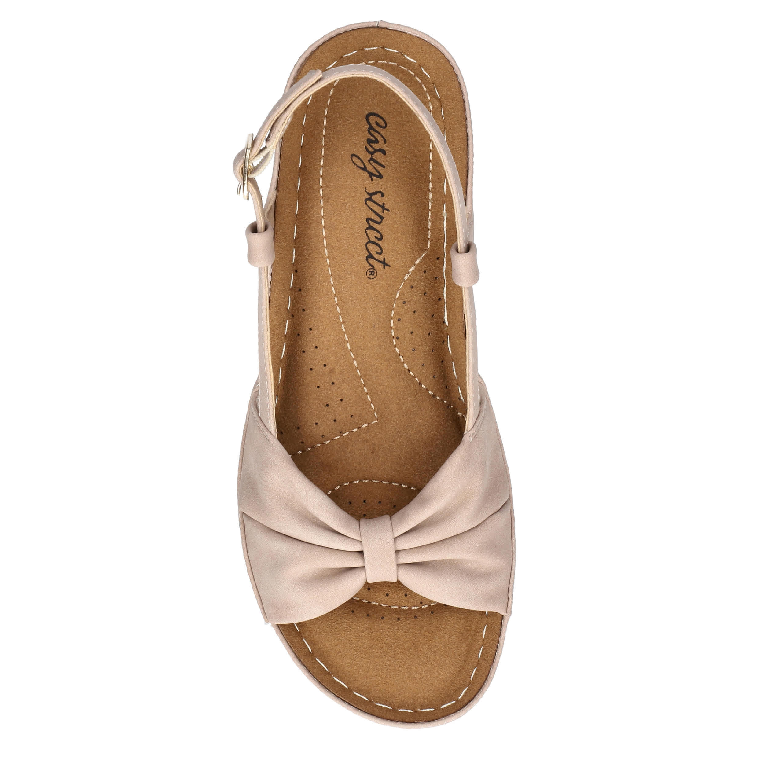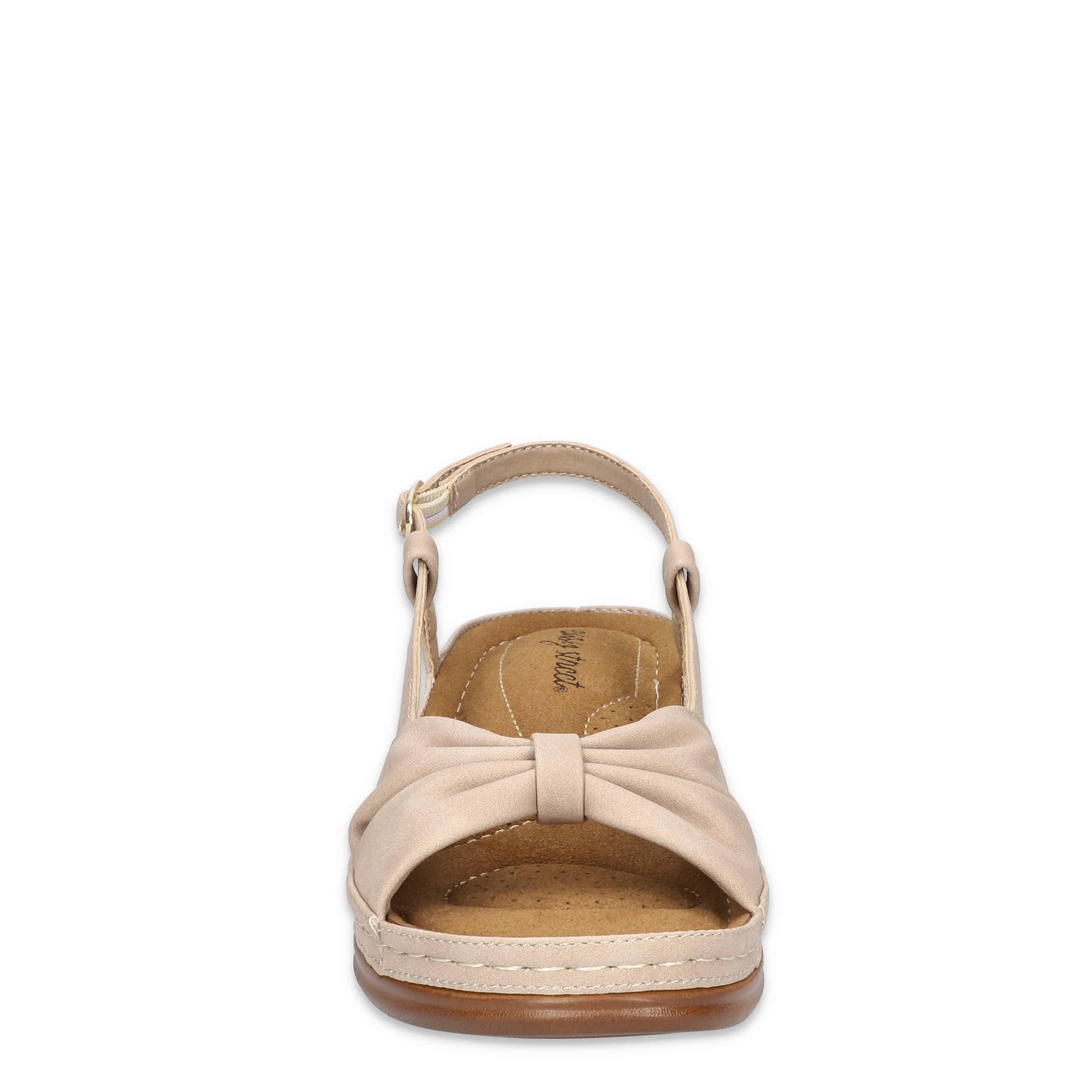 Stellar style starts with the Jupiter women's wedge sandal from Easy Street. Featuring a synthetic upper with a knotted vamp, this sandal's slingback silhouette is great in the heat. The stitched footbed cushions from heel-to-toe, while the wedge heel adds a little lift.