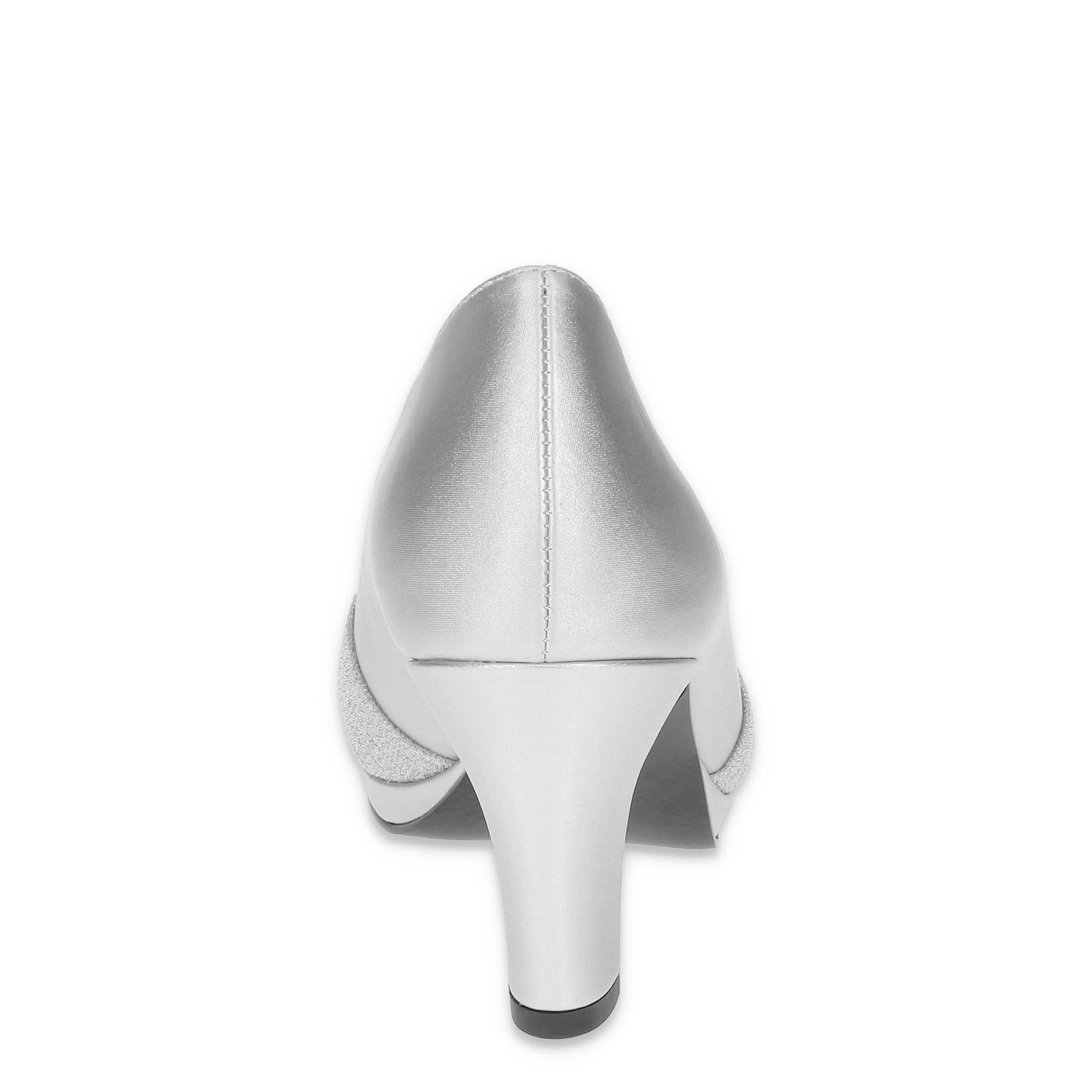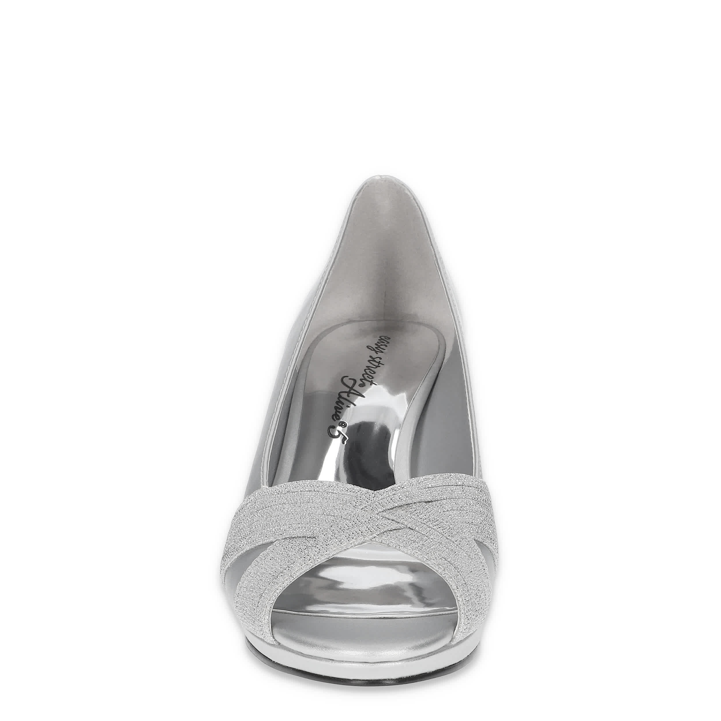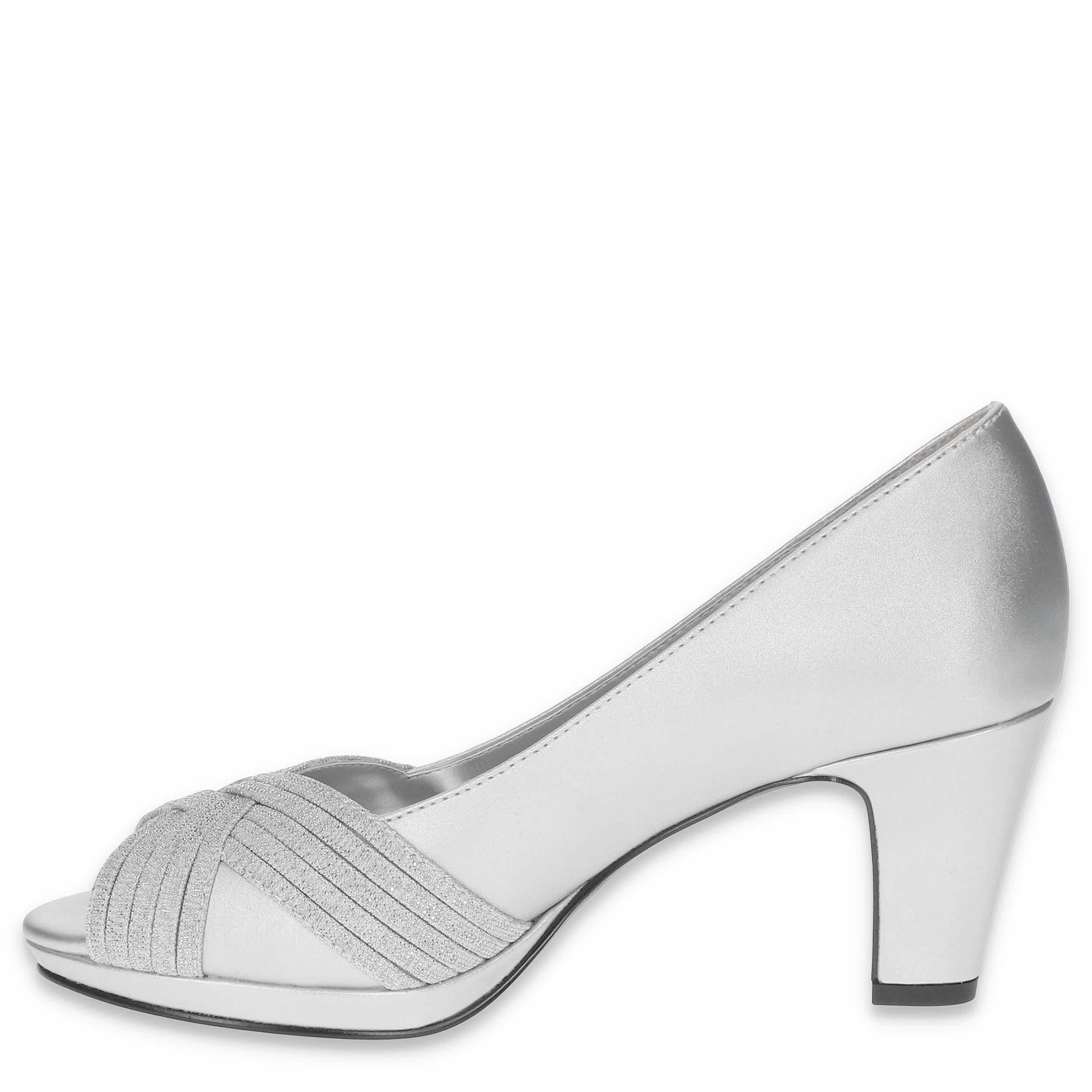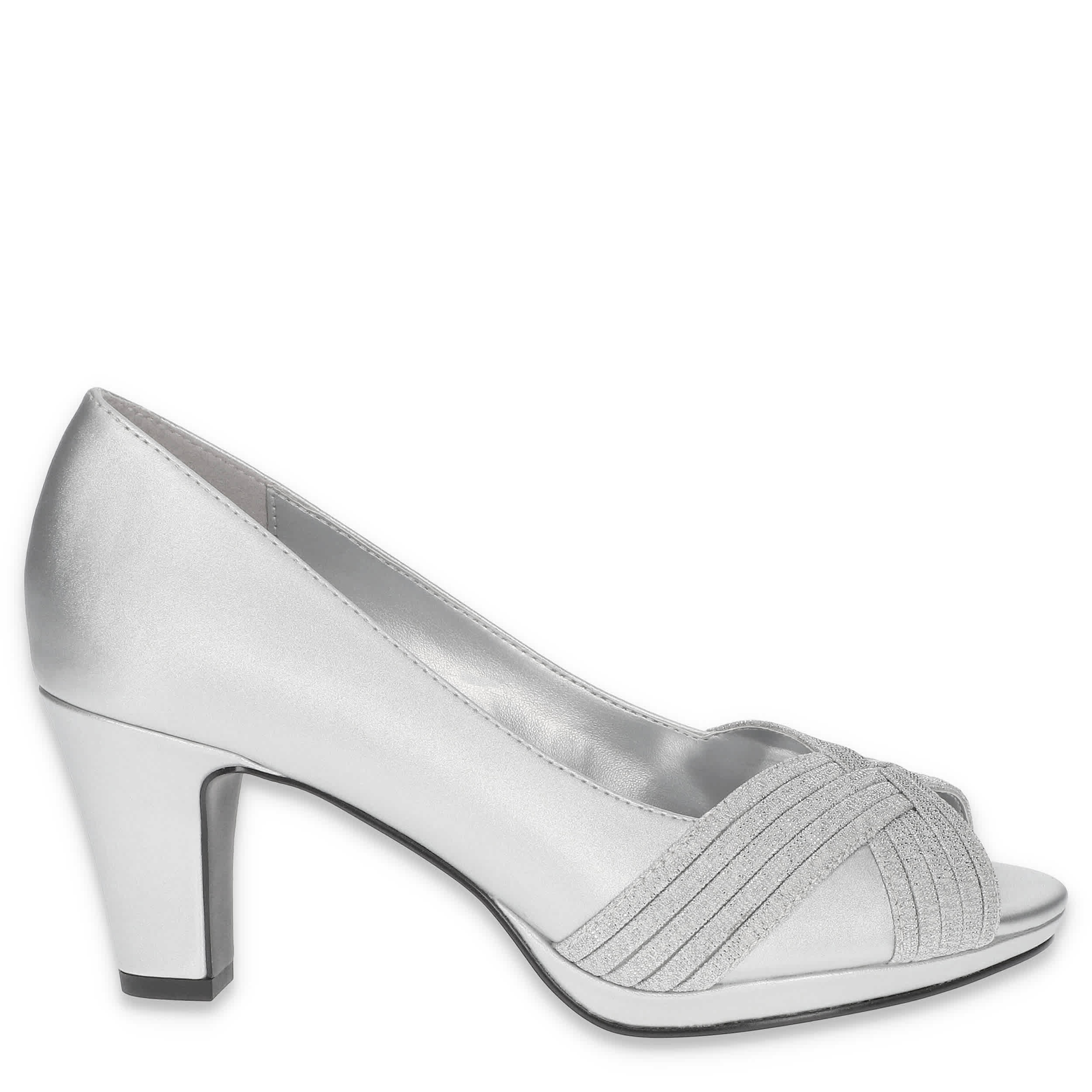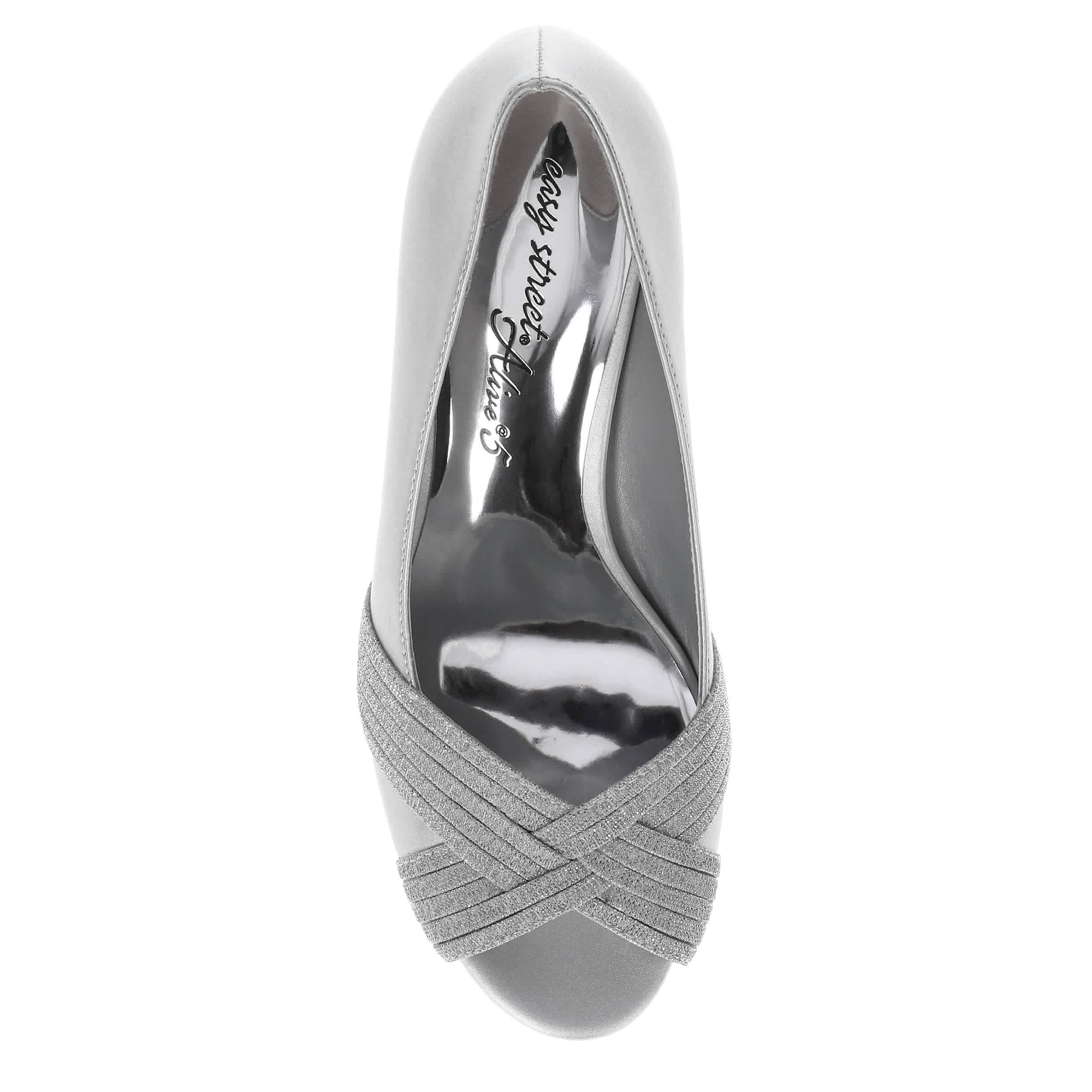 Dress elegantly on-trend in the Lavish pump from Easy Street. With a satin upper featuring a multi-material strip overlay, this peep-toed shoe is perfect for a special evening. The insole cushions, while the block heel offer just enough stable lift.