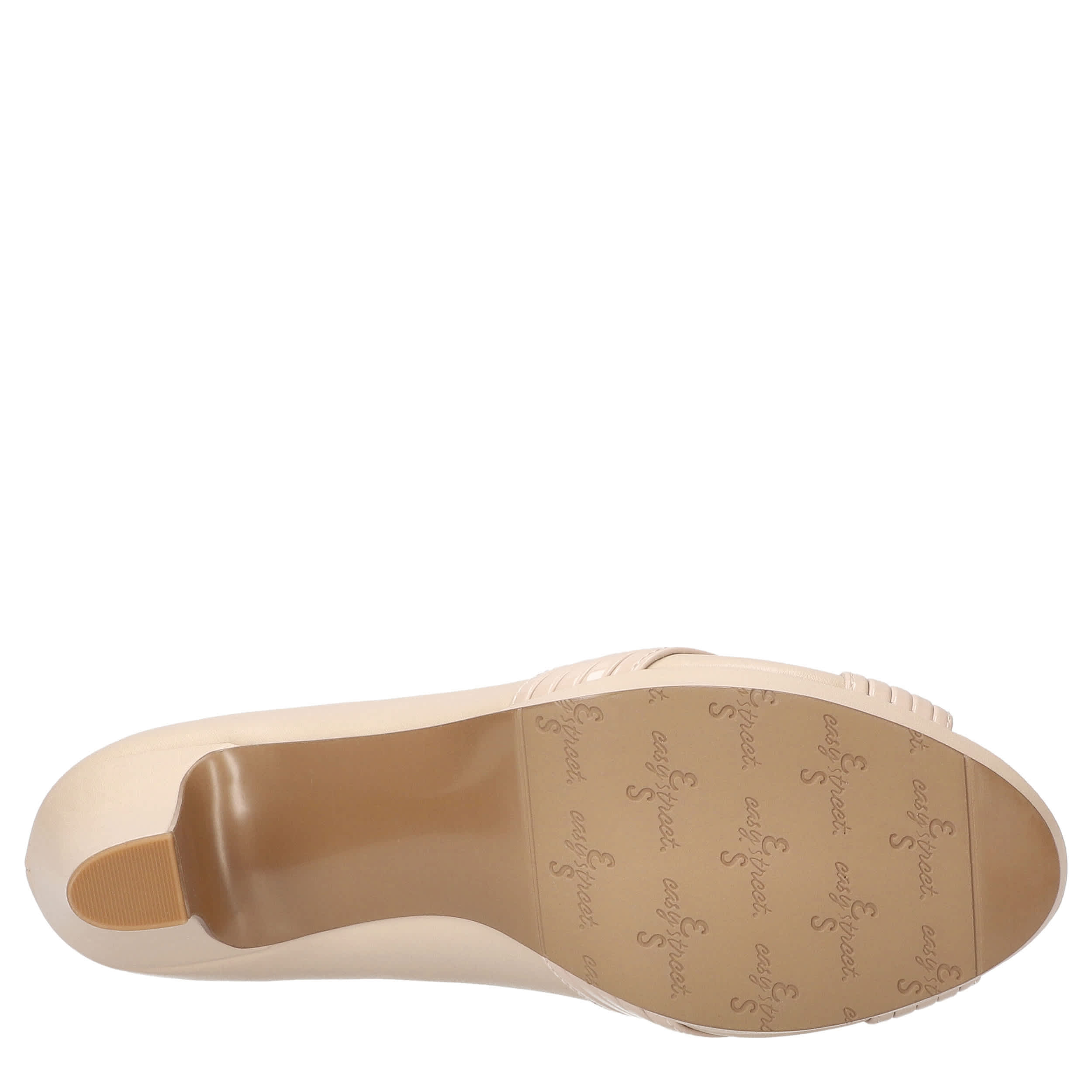 Dress elegantly on-trend in the Lavish pump from Easy Street. With a faux leather upper featuring a patent leather strip overlay, this peep-toed shoe is perfect for a special evening. The insole cushions, while the block heel offer just enough stable lift.