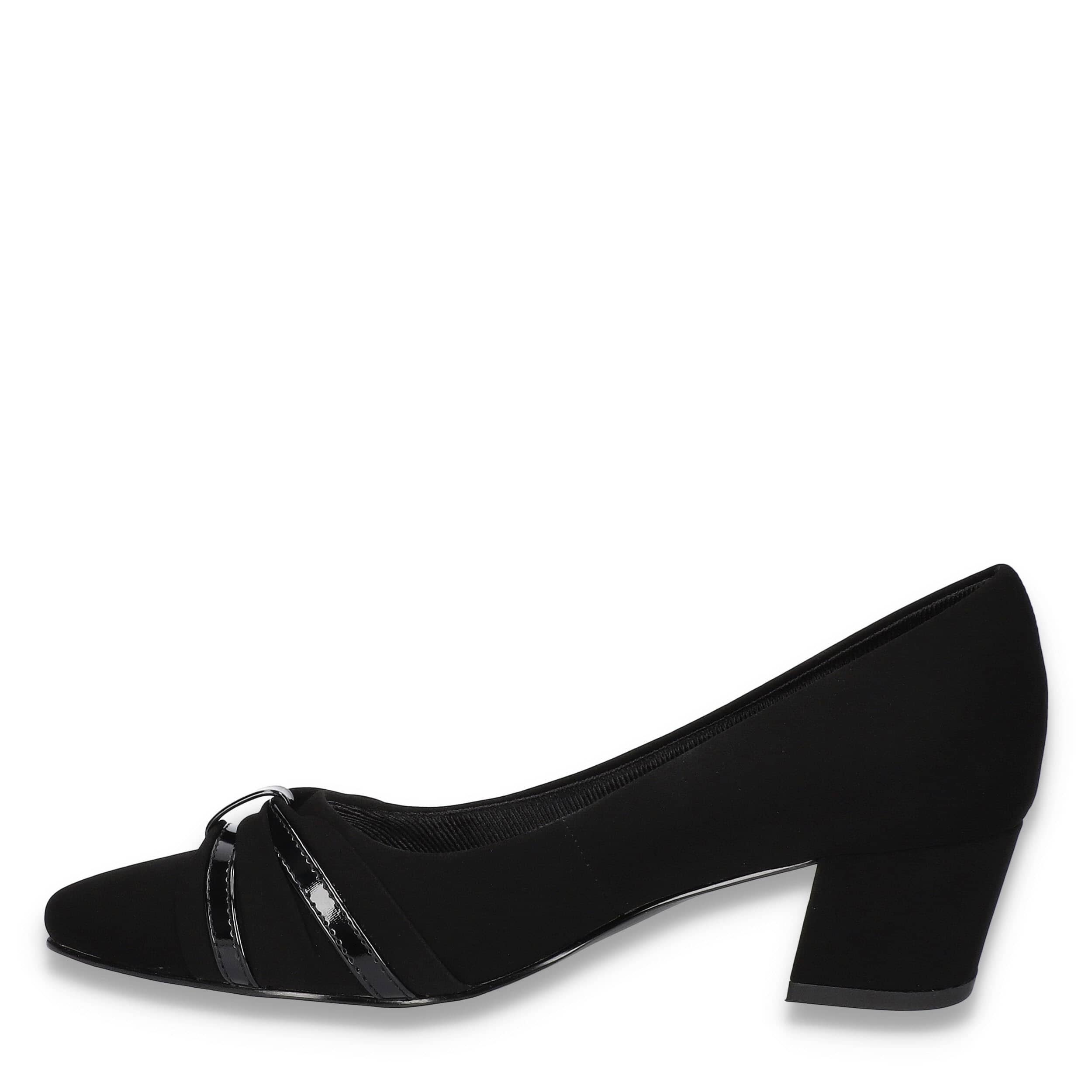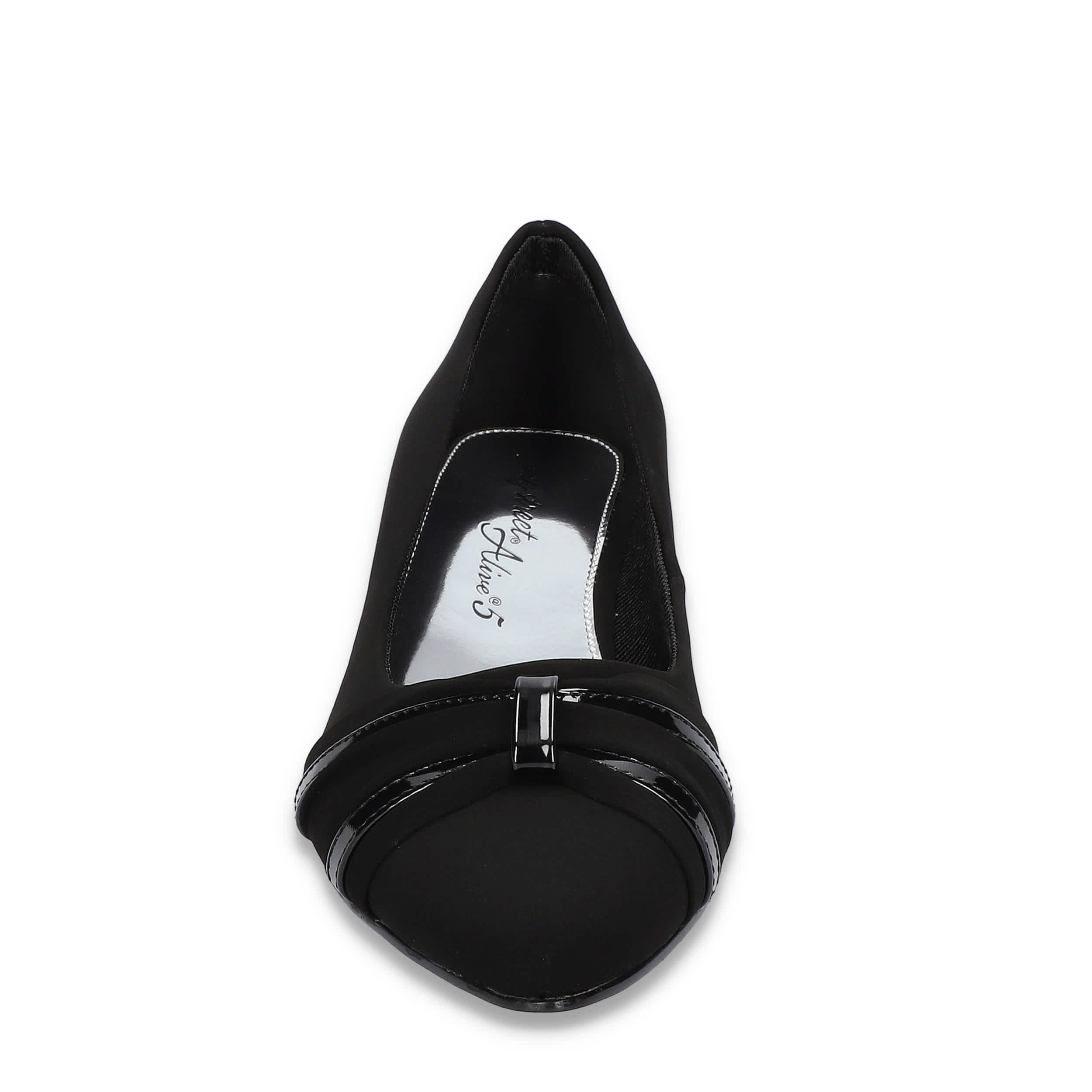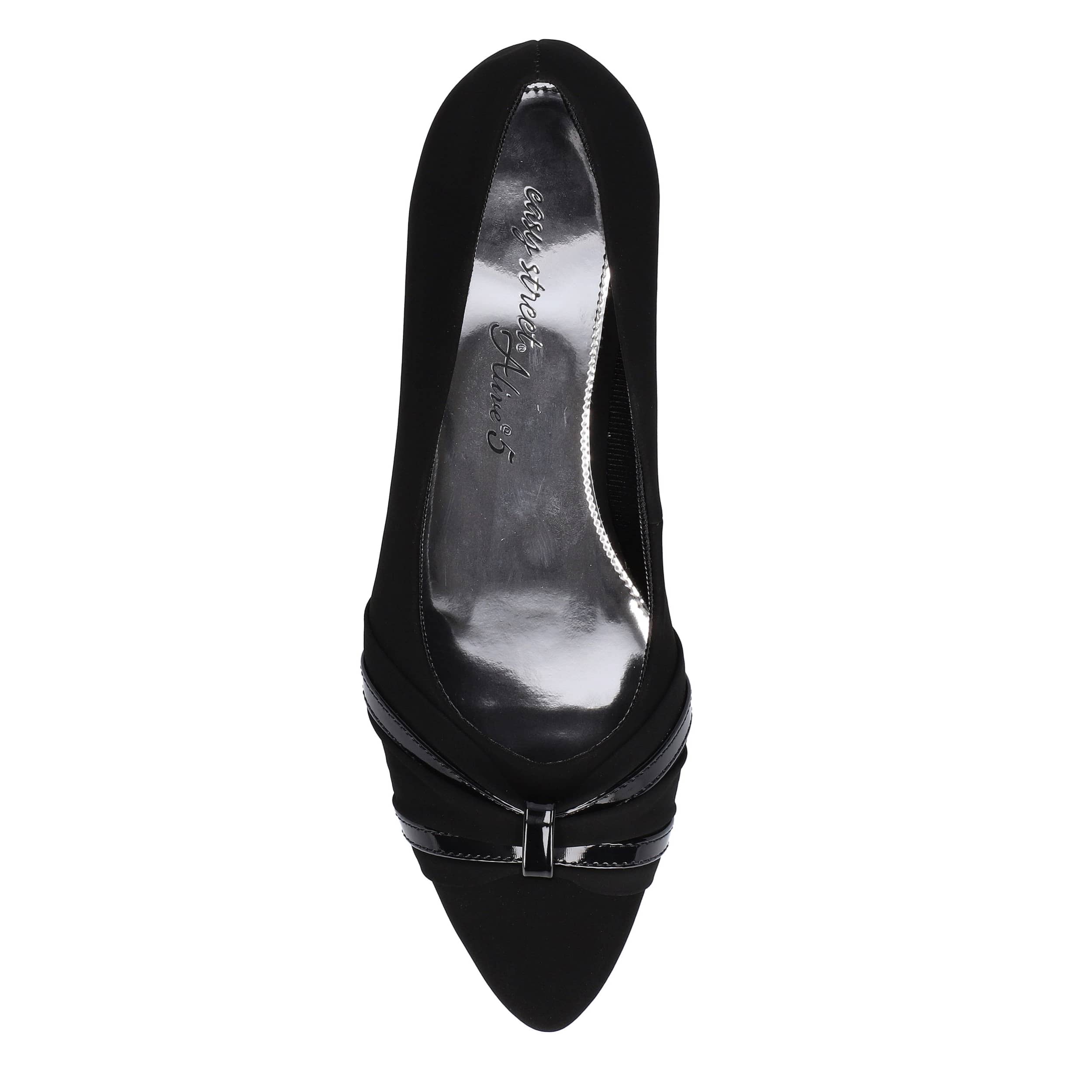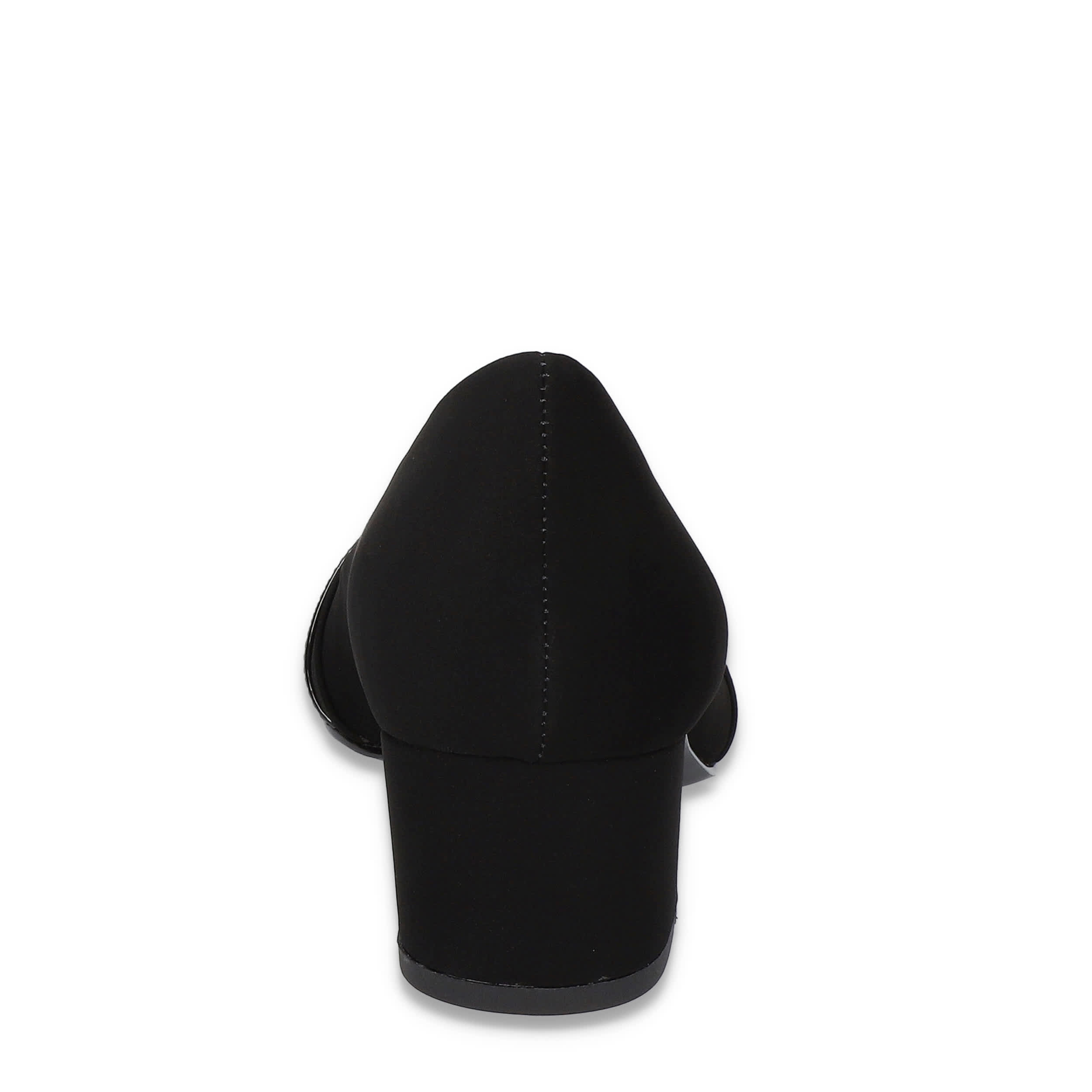 Head to the office in style with the Millie women's pump from Easy Street. With a faux suede upper featuring a ruched overlay bow with patent detailing, this elegant pump, with its almond-toe silhouette, has plenty of seasonal versatility. A padded footbed cushions every step, while the 1¾" covered block heel offers stability.