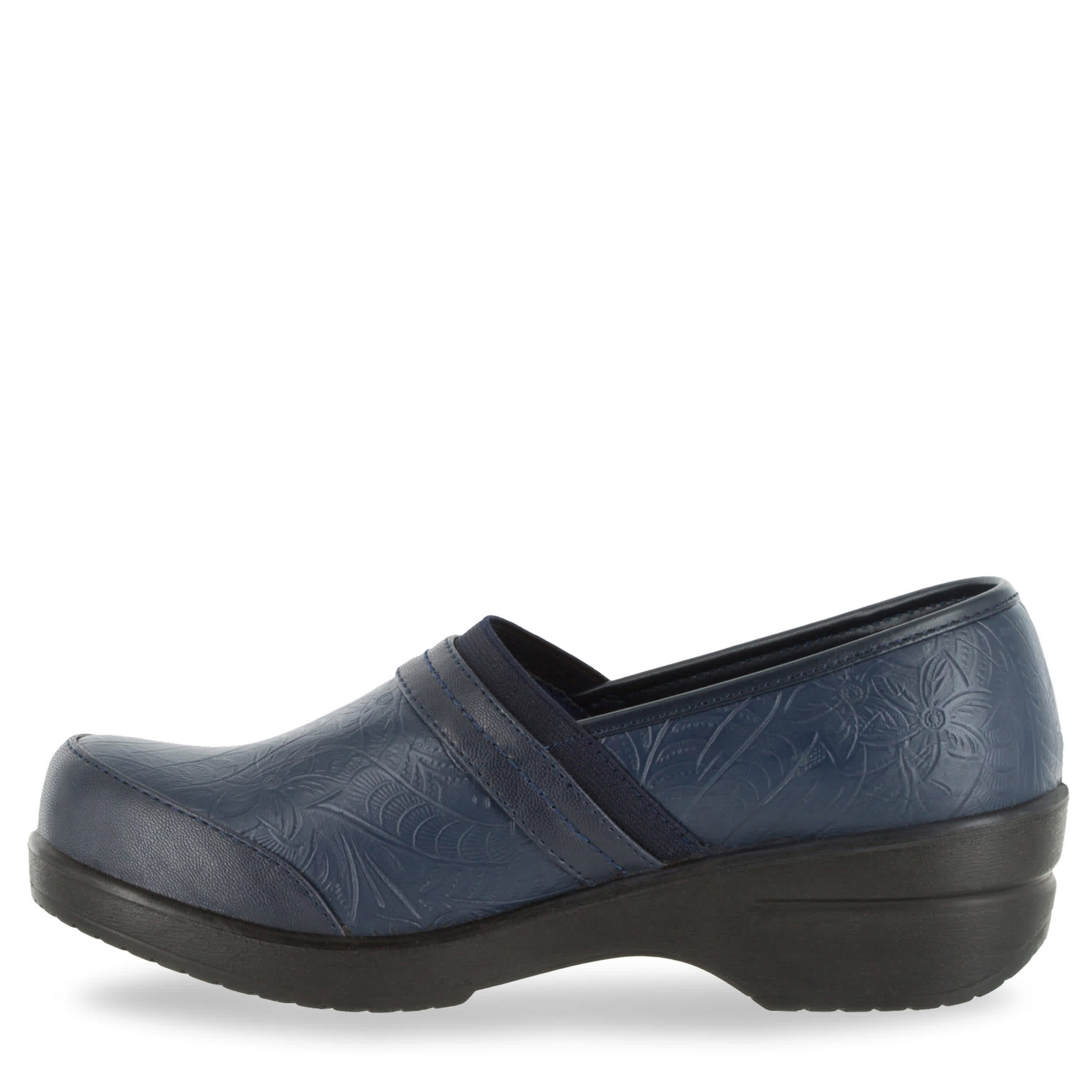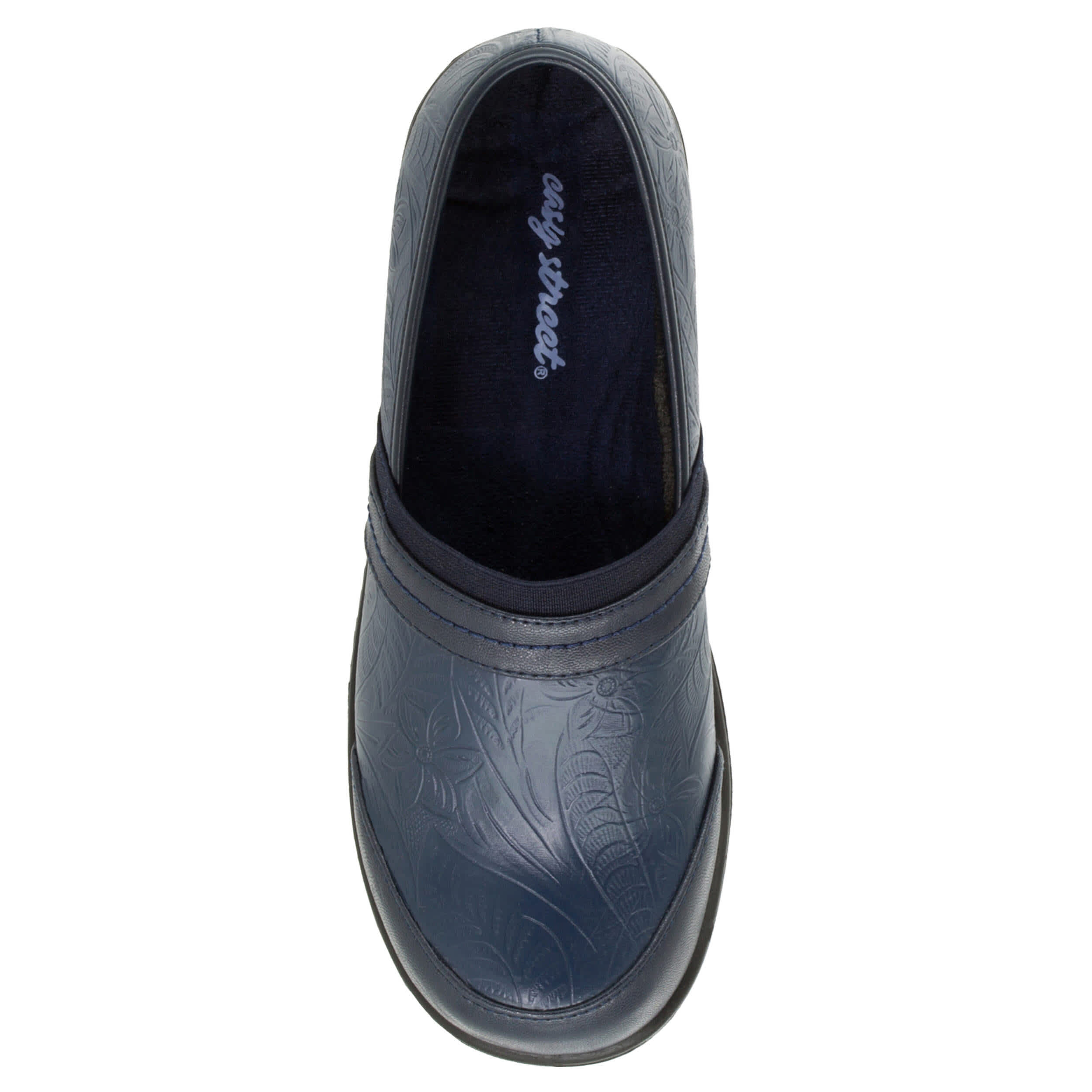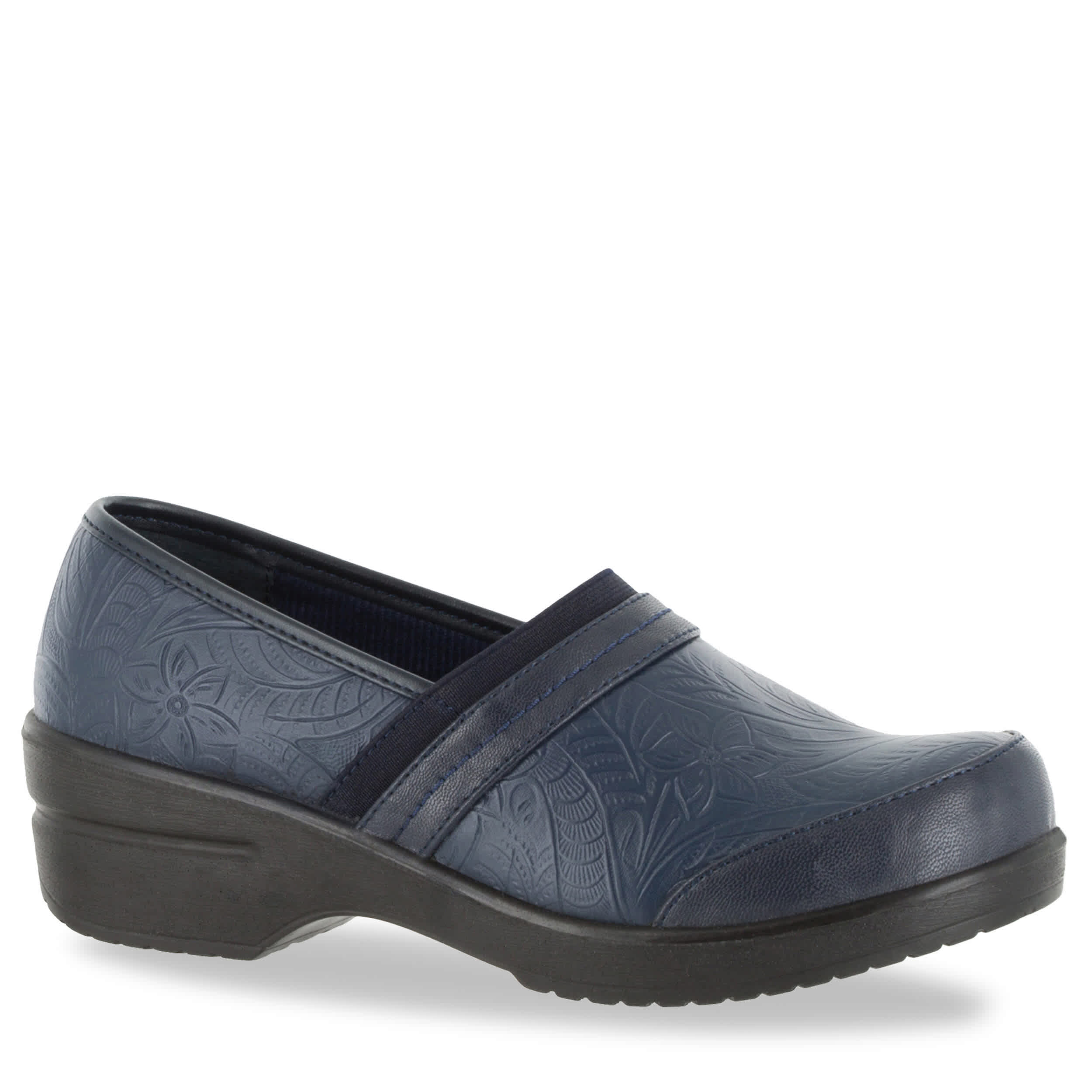Hike the urban jungle in style with the Easy Street Origin women's clog. With a faux leather upper featuring embossed accents and a stretch gore topline, these slip-on clogs are great for exploring the city or staying close to home. The padded insole and synthetic sole offer cushioning and stability on your journey.