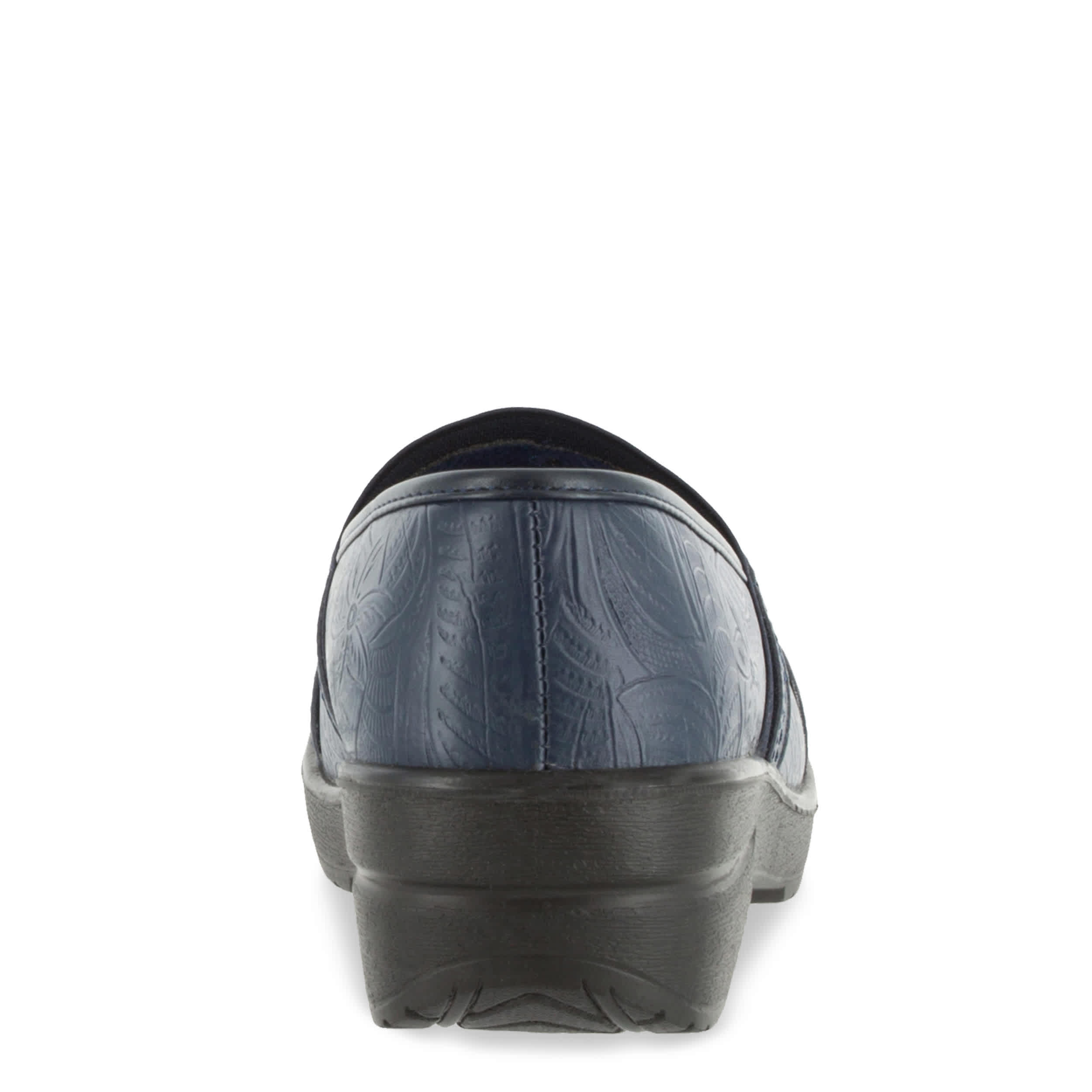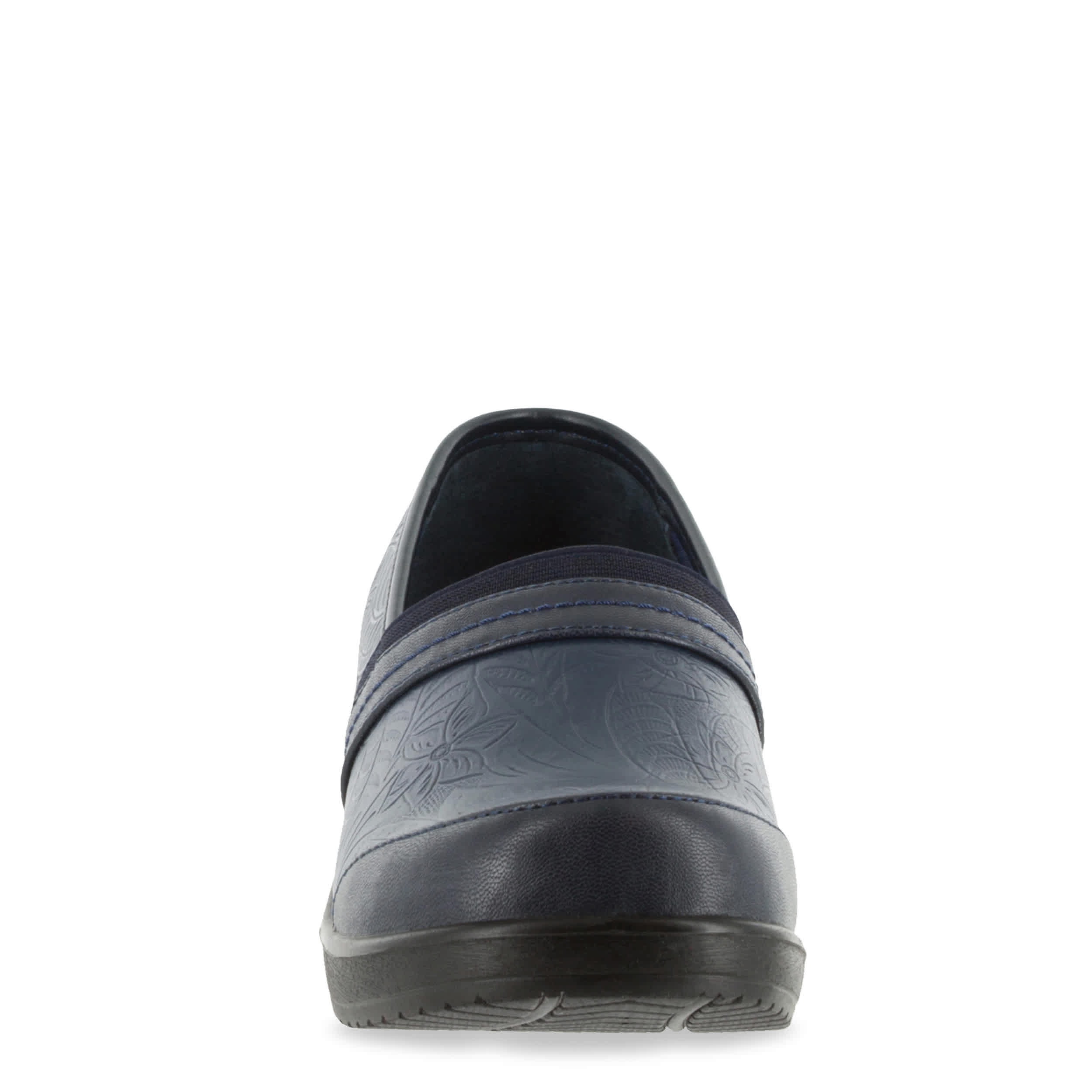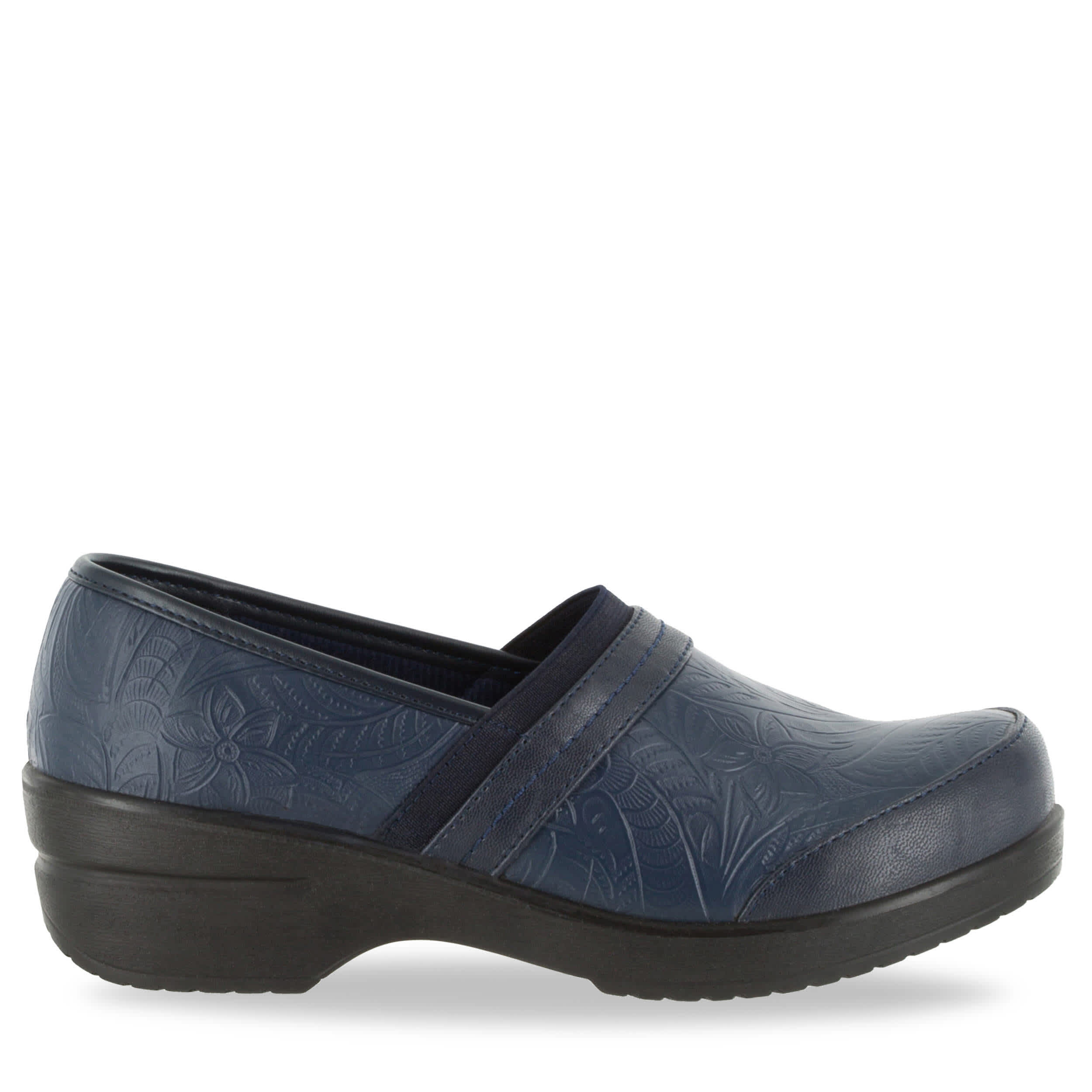 Hike the urban jungle in style with the Easy Street Origin women's clog. With a faux leather upper featuring embossed accents and a stretch gore topline, these slip-on clogs are great for exploring the city or staying close to home. The padded insole and synthetic sole offer cushioning and stability on your journey.