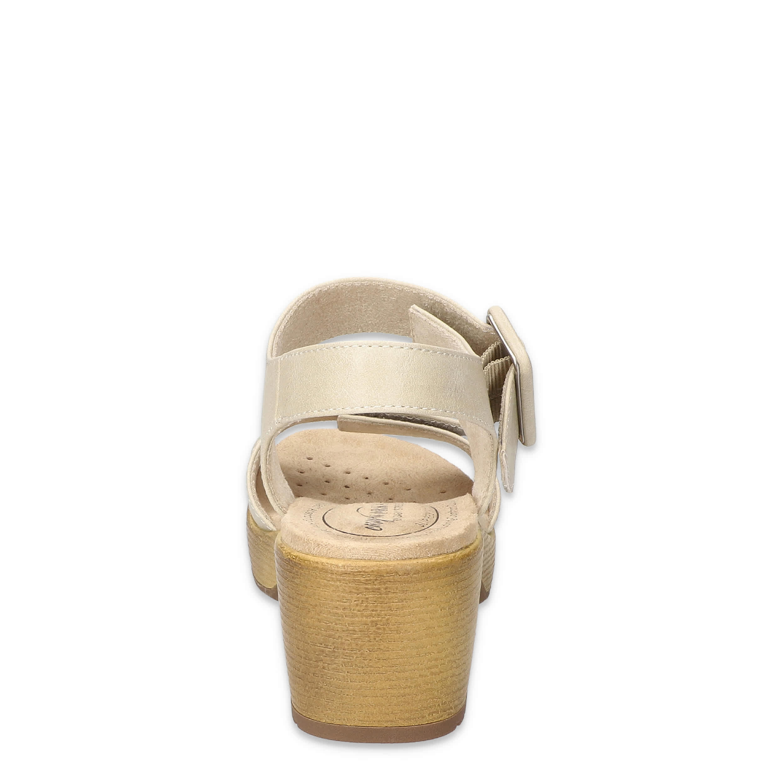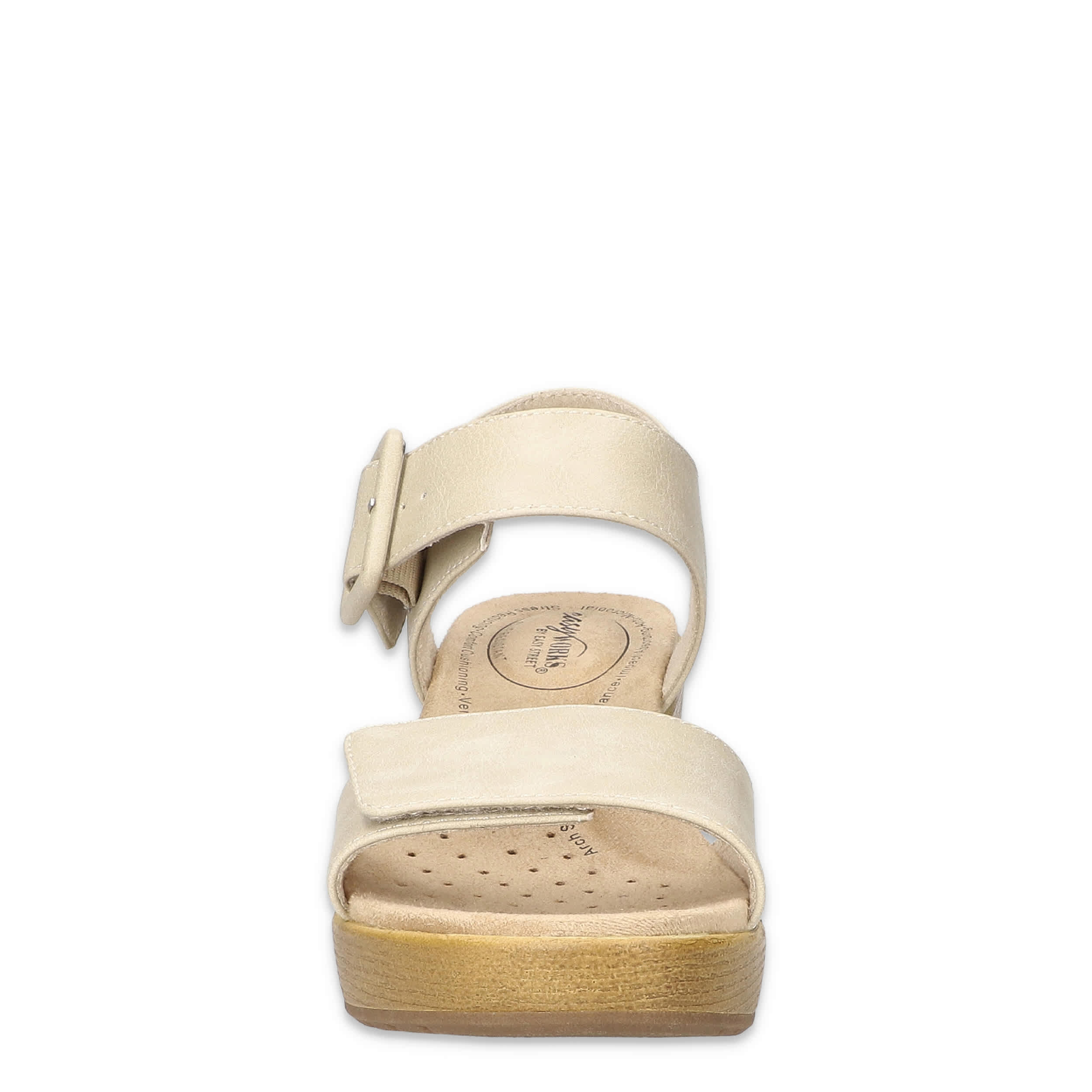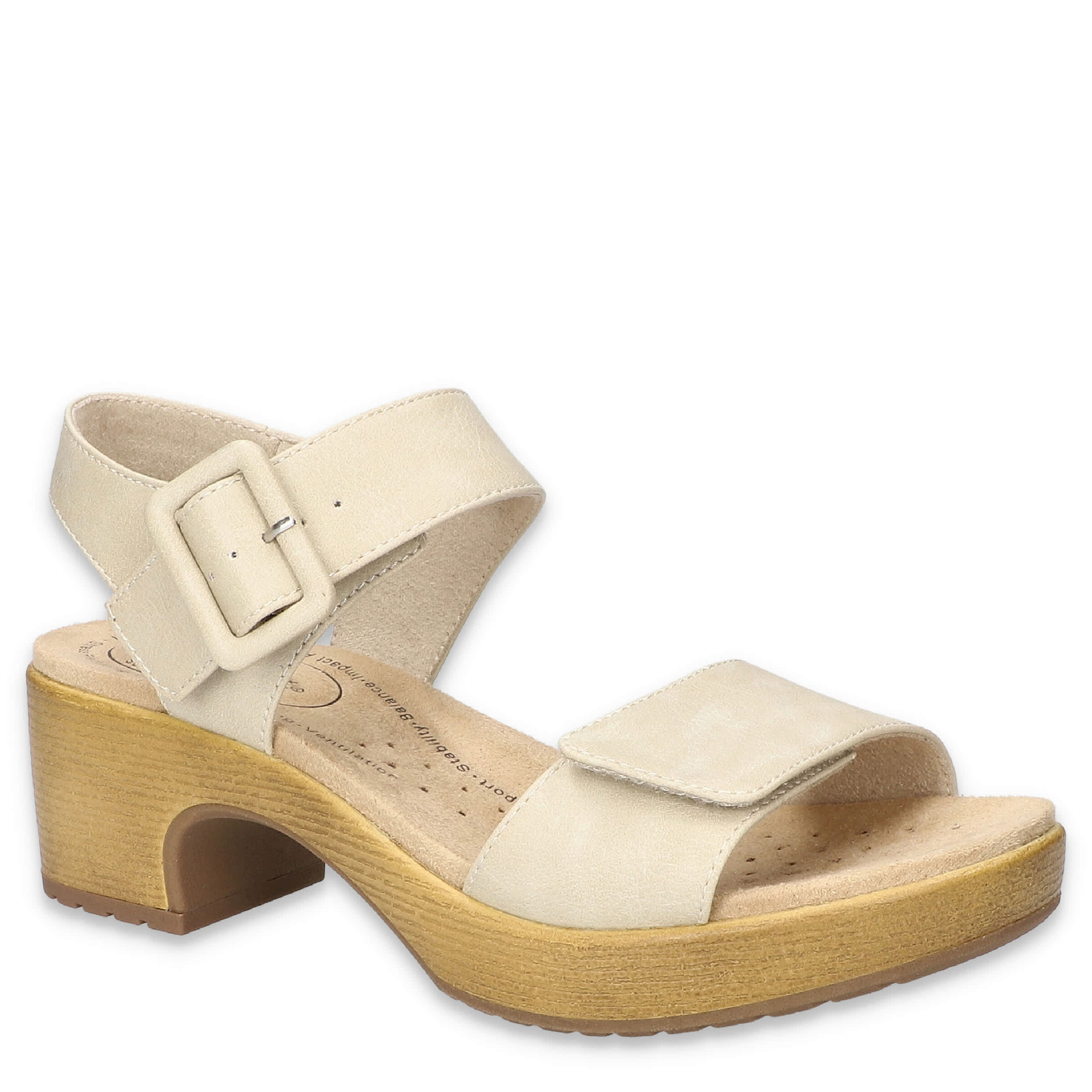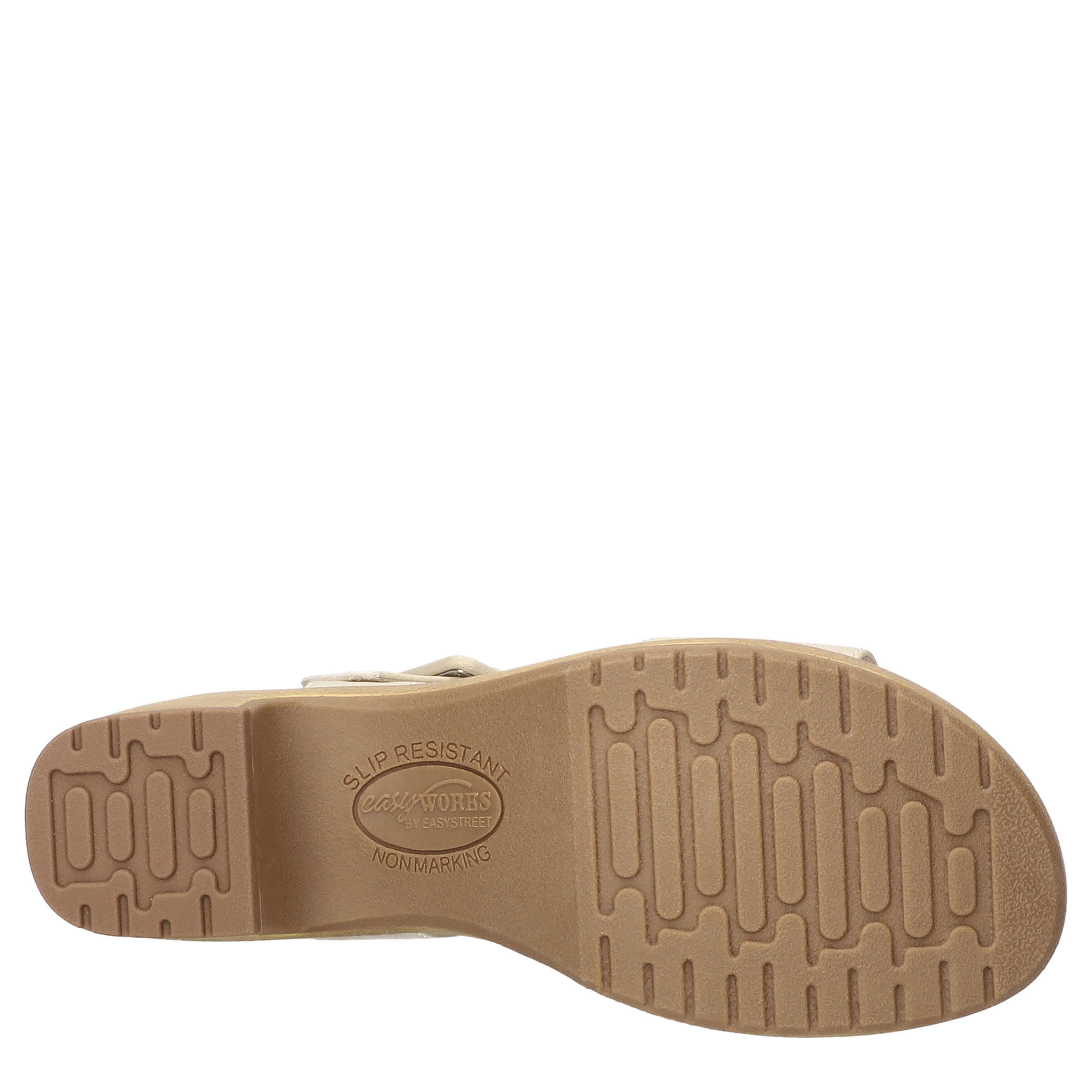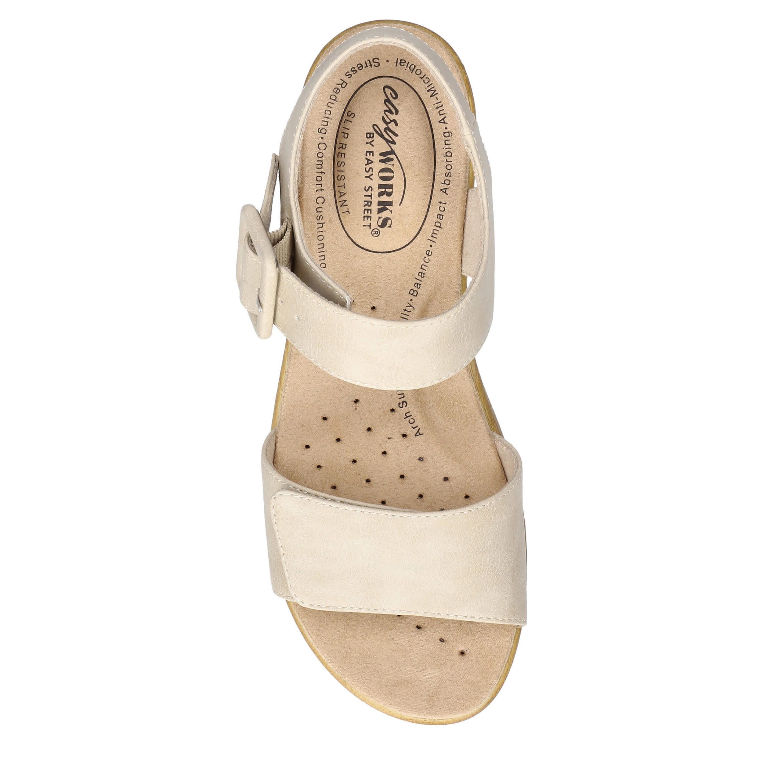 Stun all season long in the Easy Works Marva wedge sandal. Featuring a faux leather upper with a dual strap design, this shoe keeps you stylishly on trend with its versatility. With Easy Motion Pro Comfort System technology, the padded insole gives exceptional arch support. The stable block heel gives the perfect final touch with a decent lift.