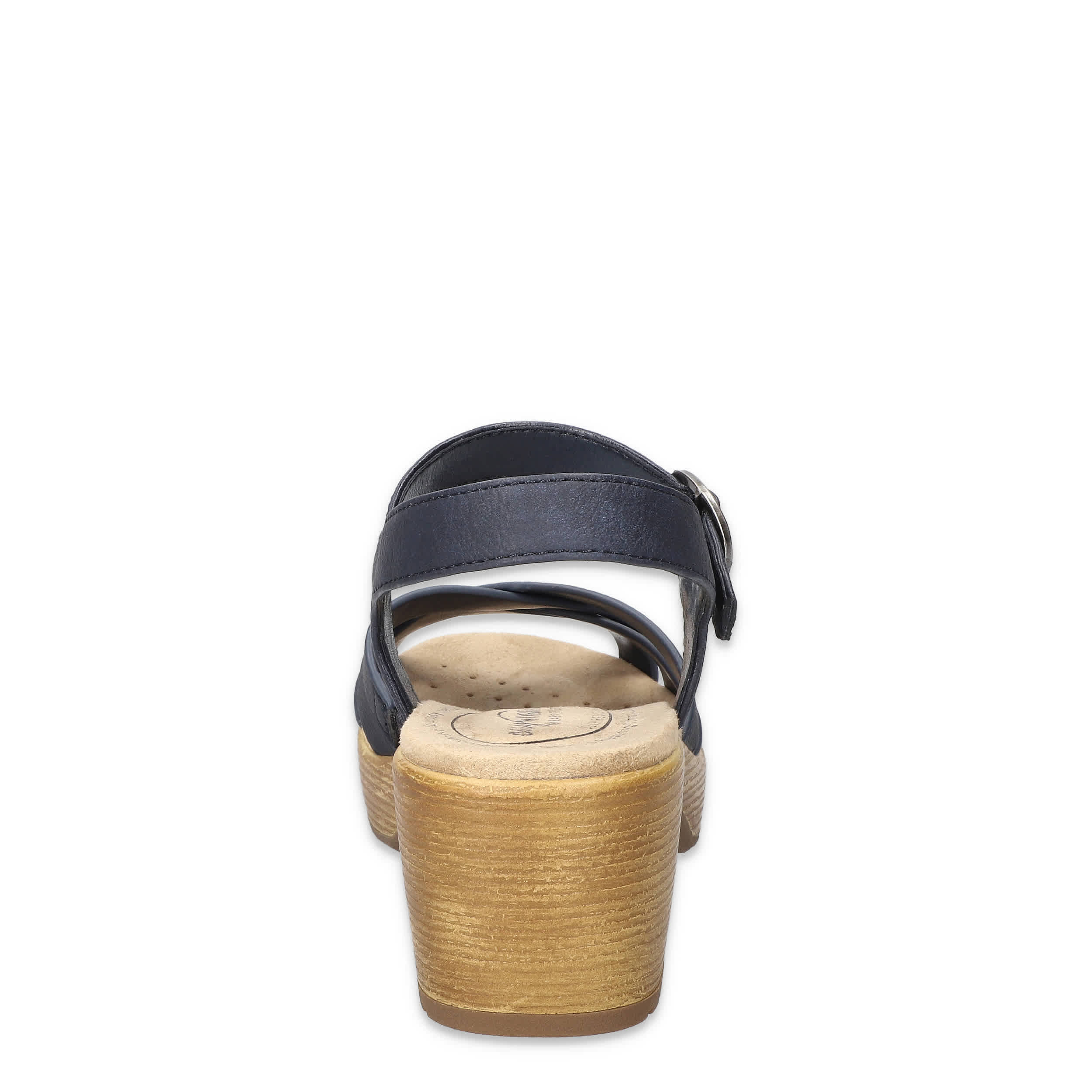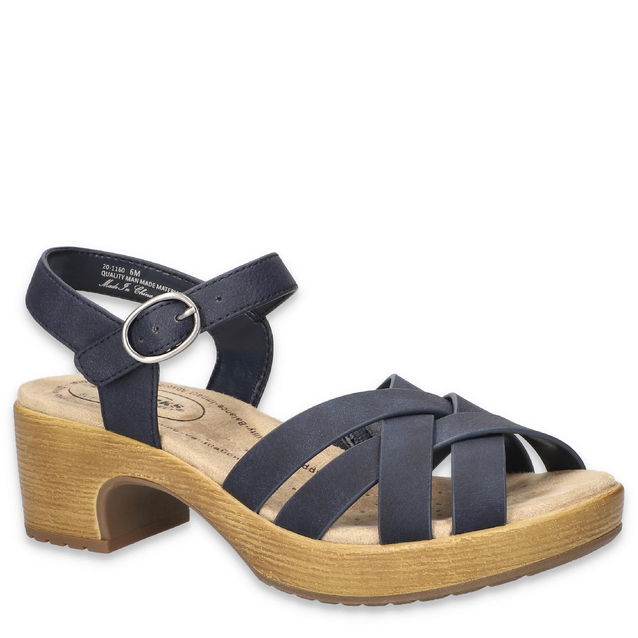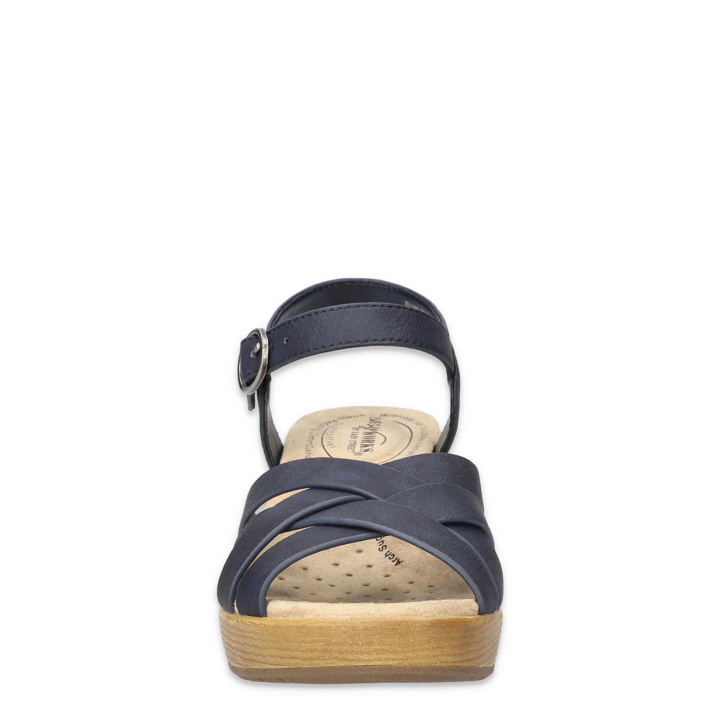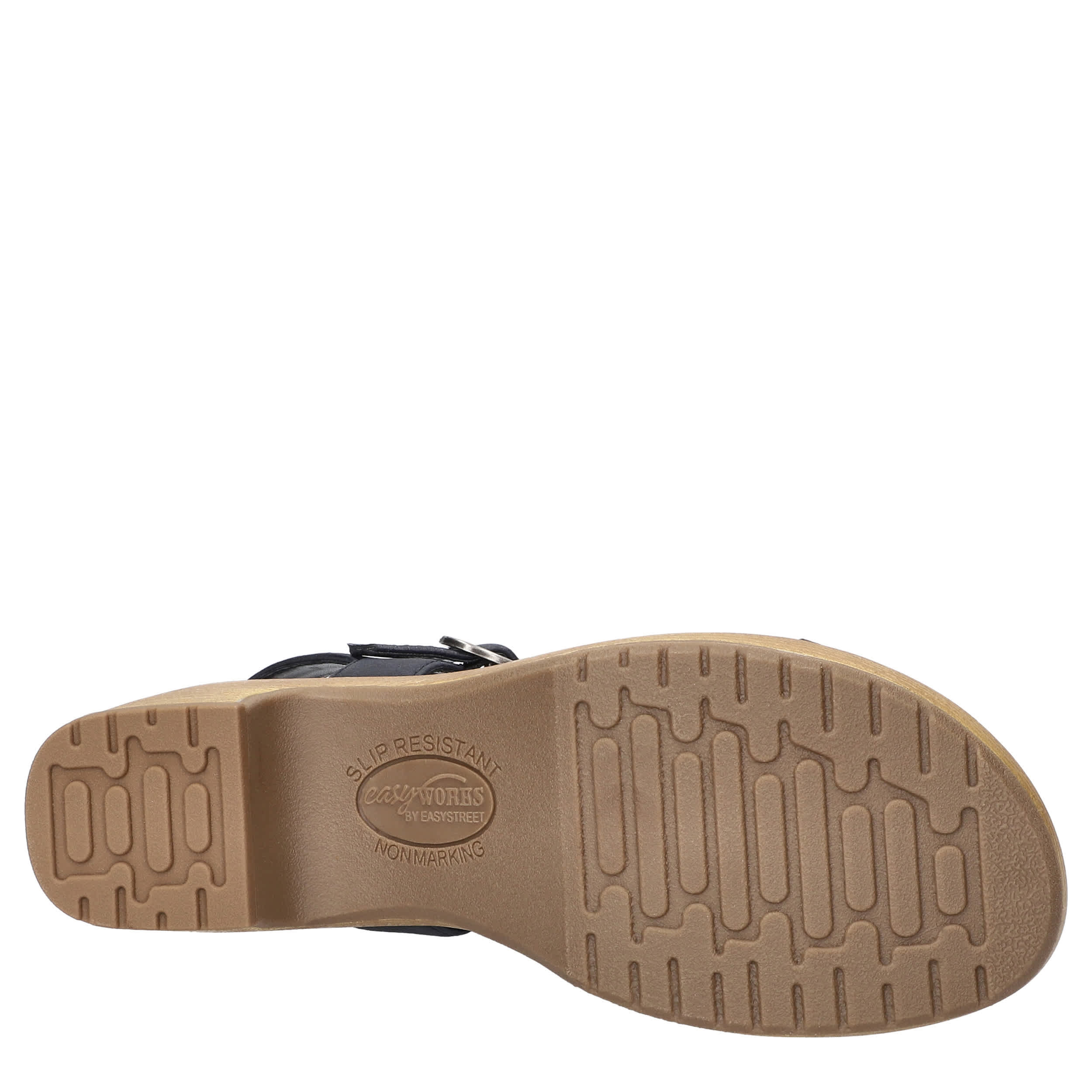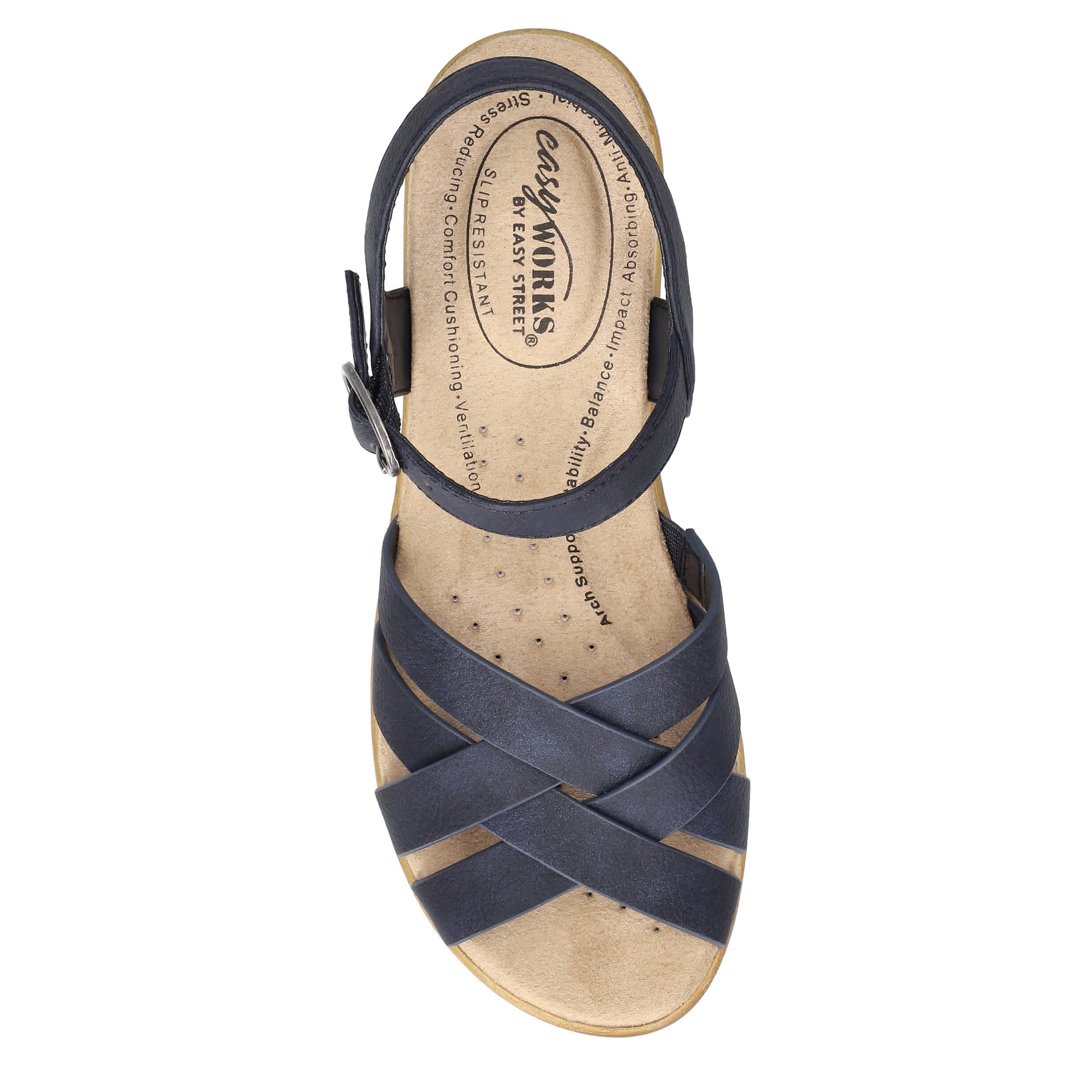 Polish up your look with the Miyah wedge sandal from Easy Works. With a faux leather upper in a crisscross strap design, this shoe has an adjustable buckle strap for a secure, personalized fit. The Easy Motion Pro Comfort system insole and rubber outsole ensure supported steps, while the block heel gives a nice elevation.