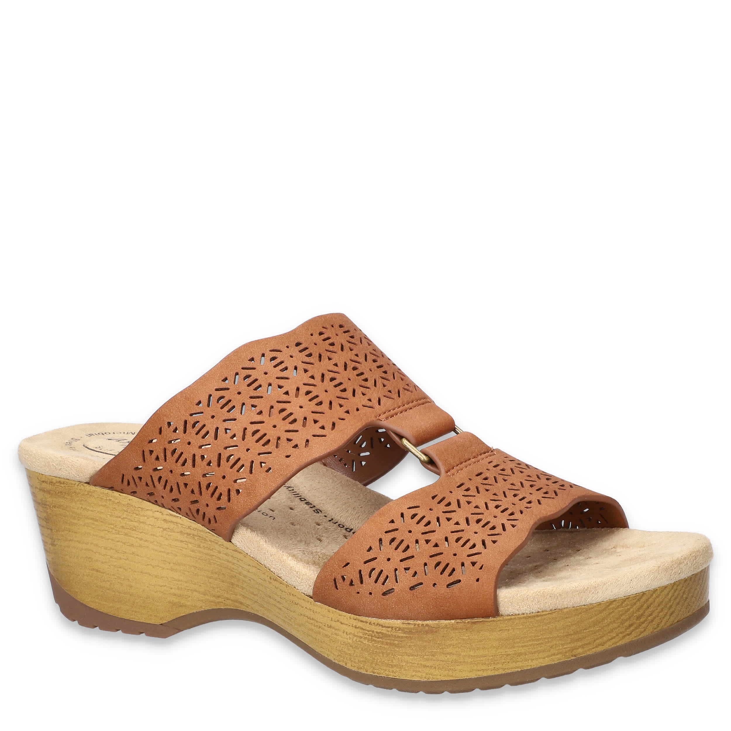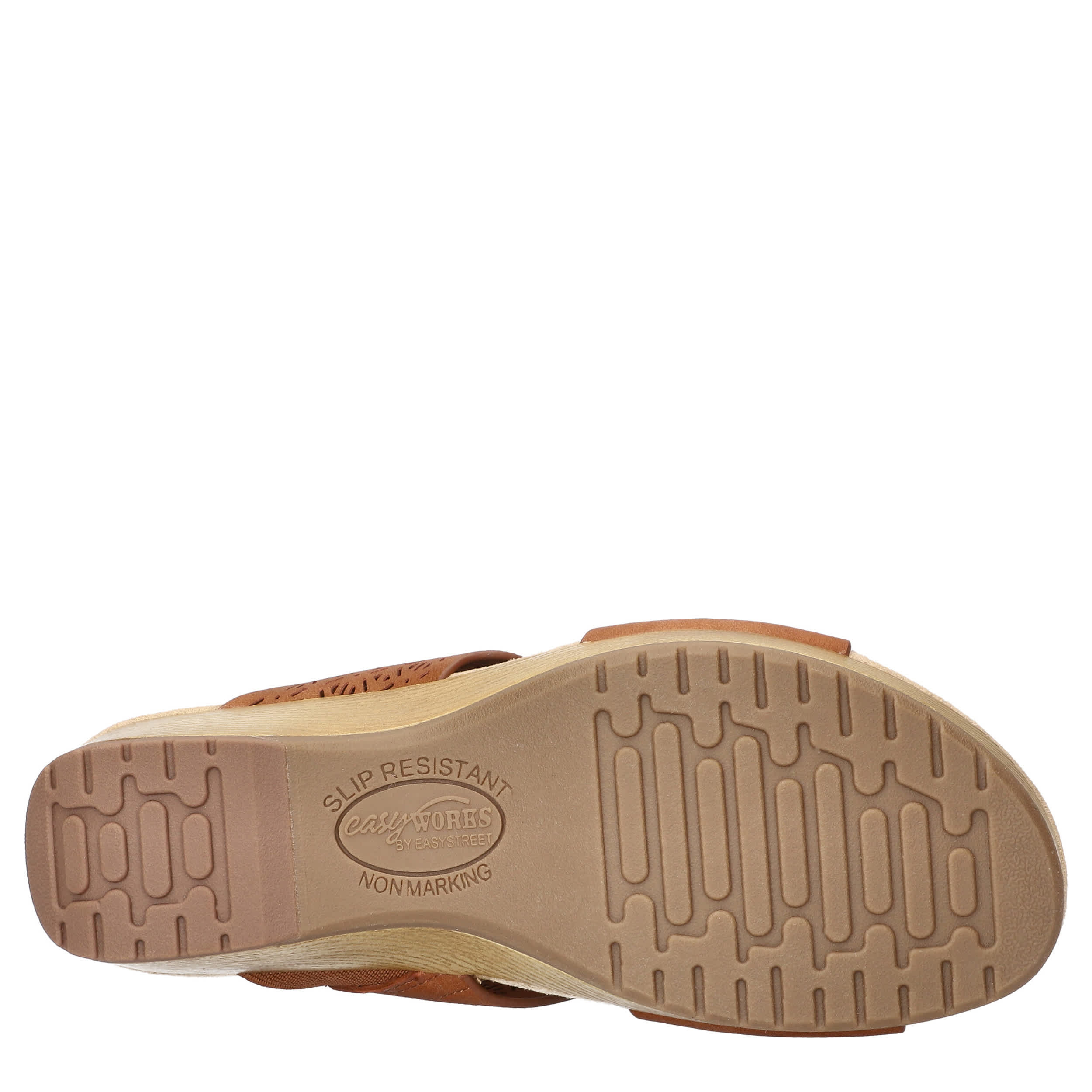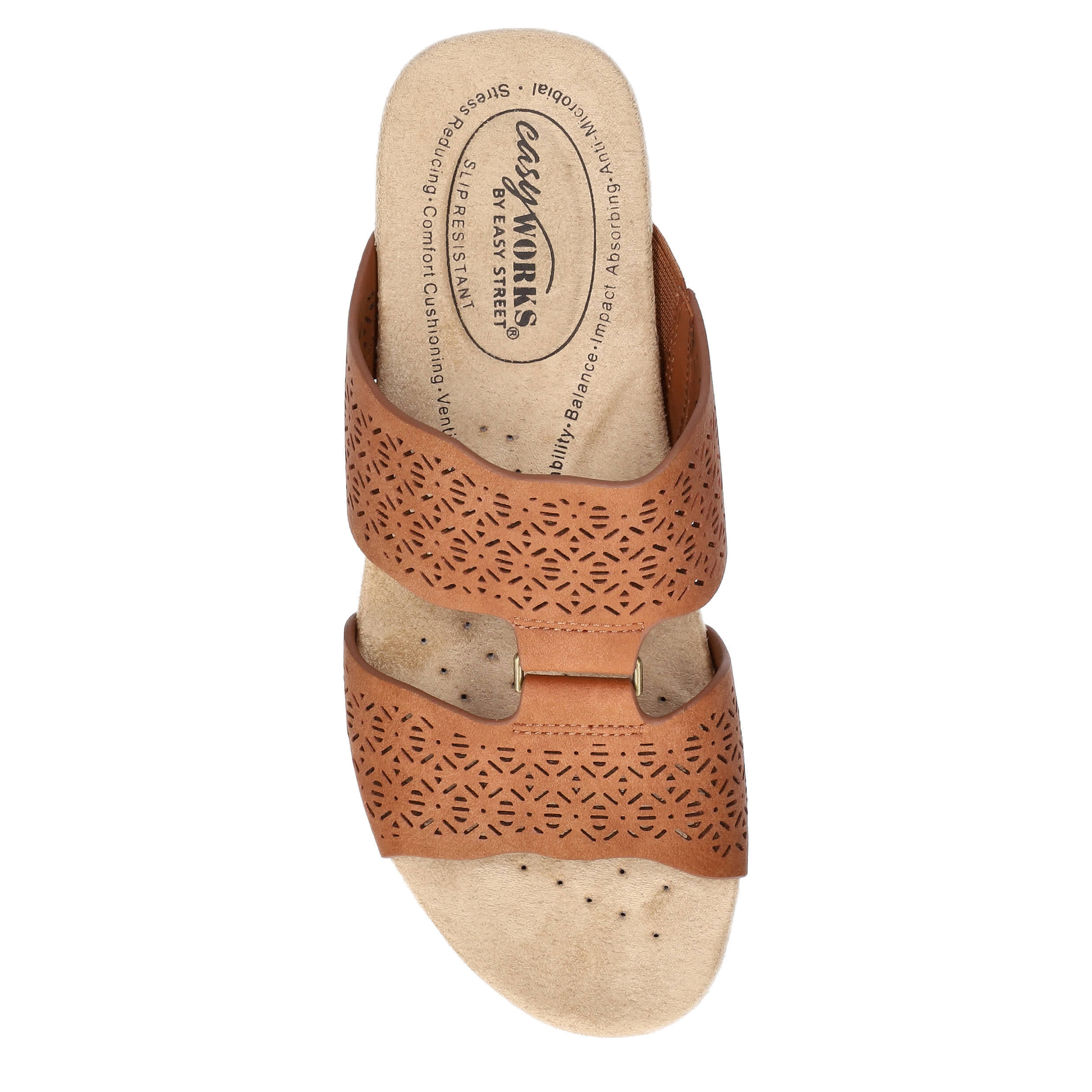 Elevate your casual style with the Easy Works Rin slide sandal. A perforated faux leather upper in a dual strap design makes this shoe a perfect summer staple. The Easy Motion Pro Comfort System footbed and rubber outsole offer exceptional support, while the block heel gives a sturdy lift.