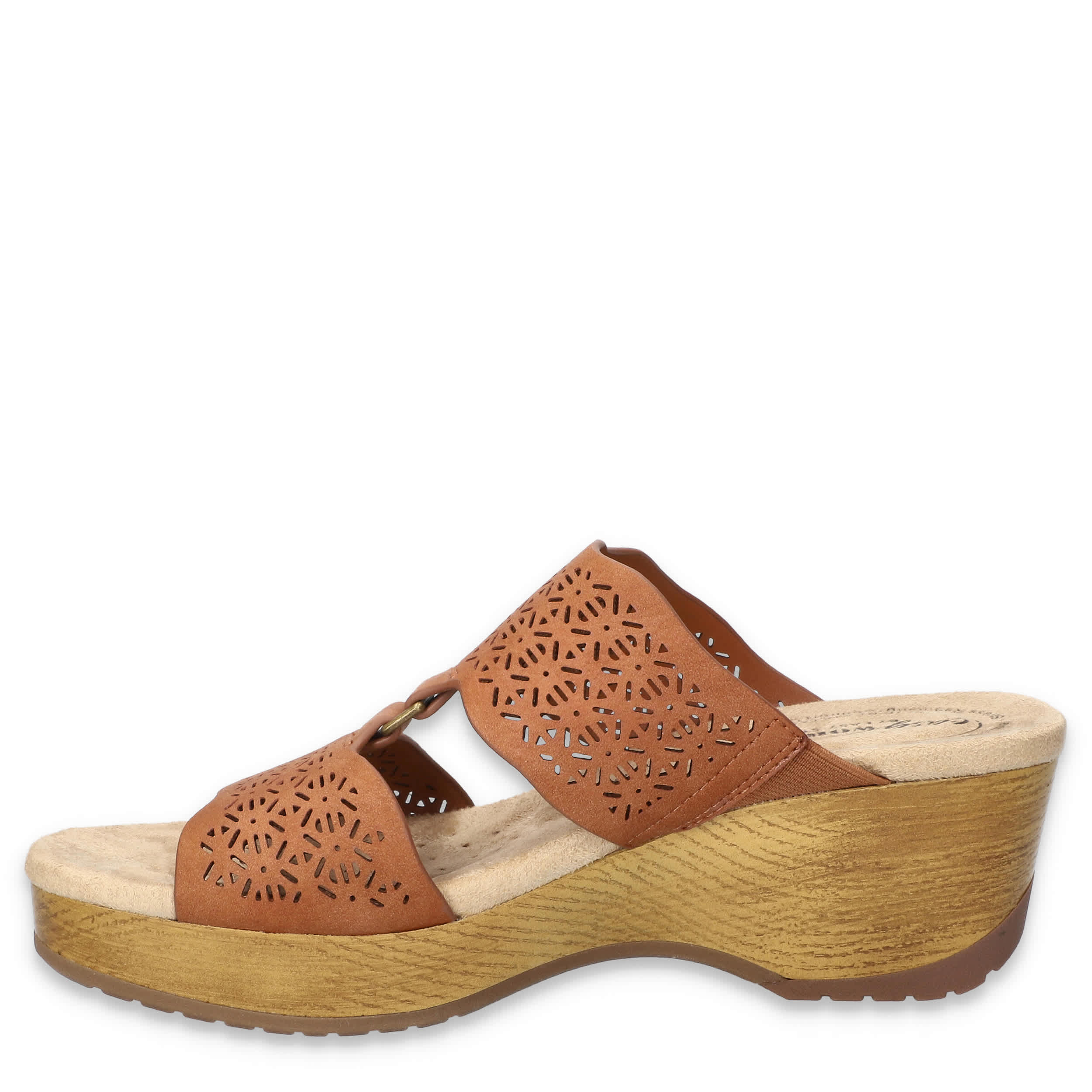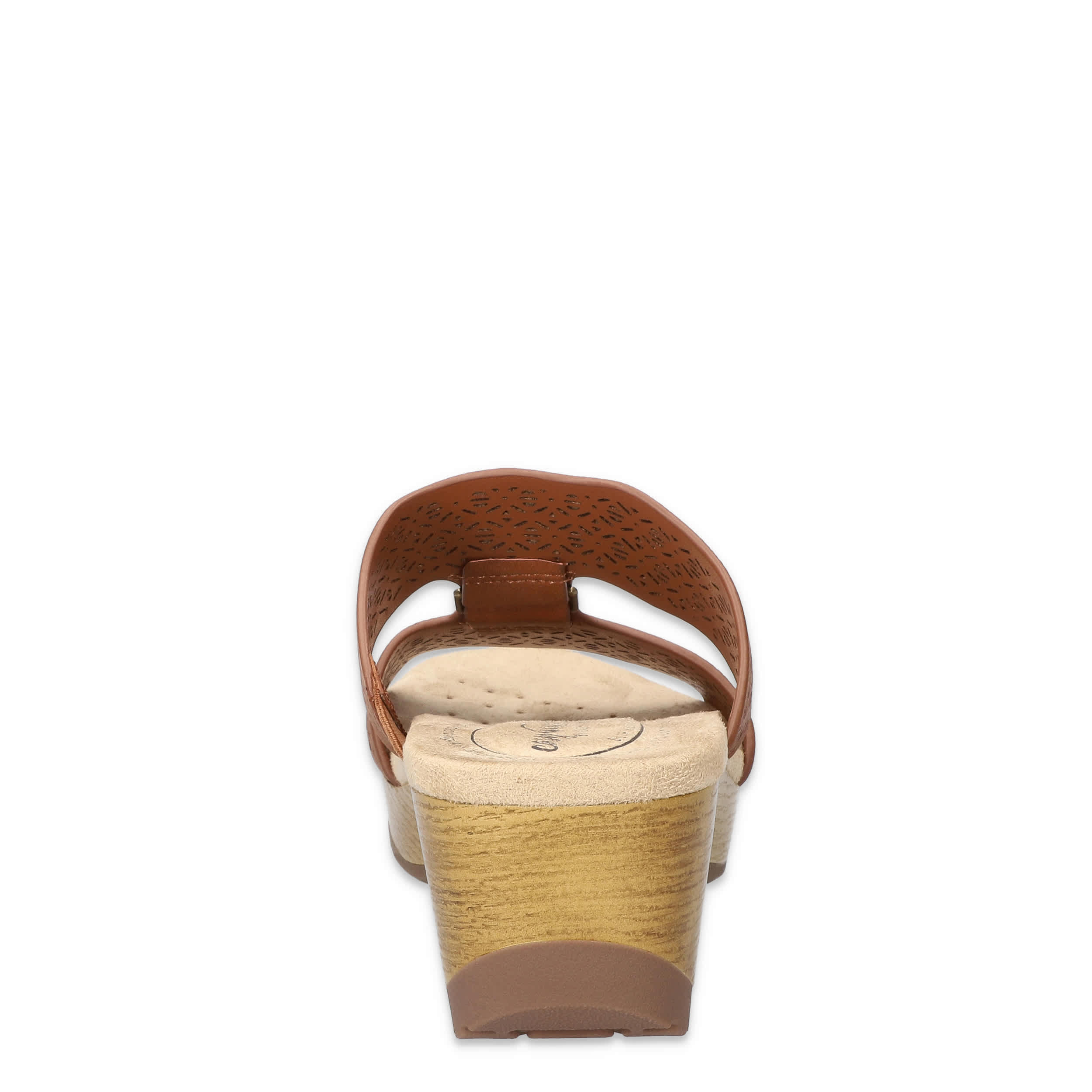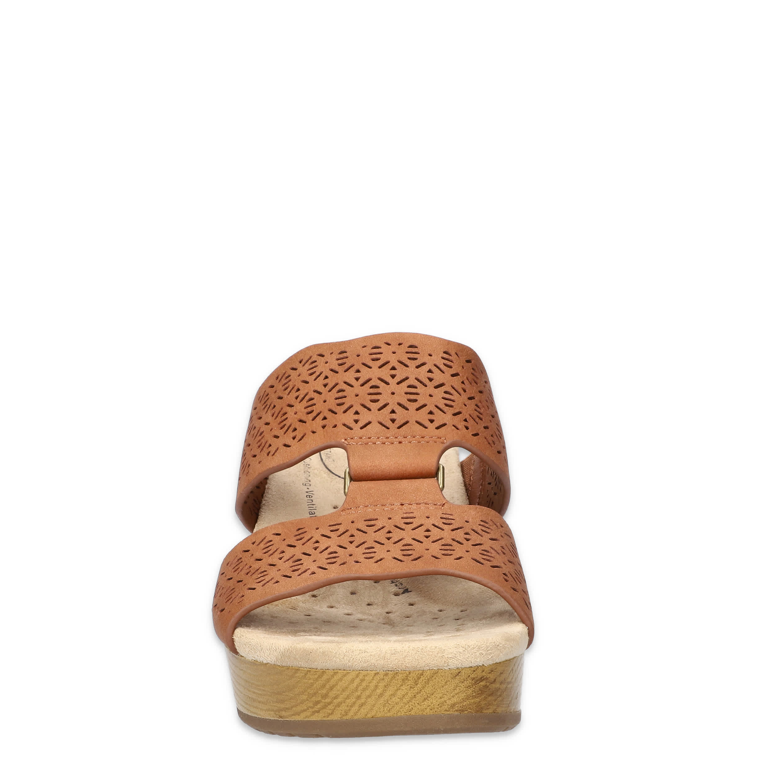 Elevate your casual style with the Easy Works Rin slide sandal. A perforated faux leather upper in a dual strap design makes this shoe a perfect summer staple. The Easy Motion Pro Comfort System footbed and rubber outsole offer exceptional support, while the block heel gives a sturdy lift.