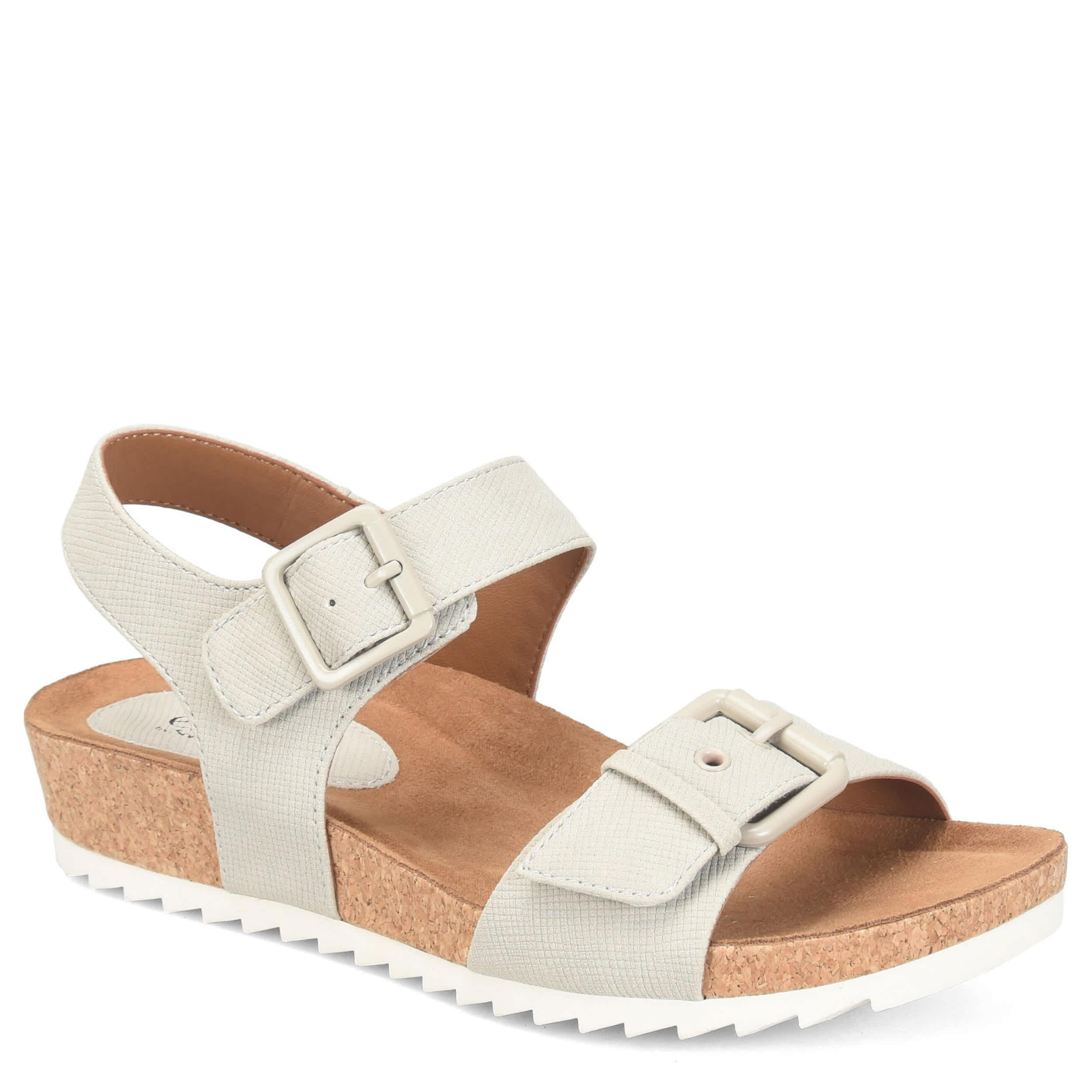 Travel in style with the summery Glinda sandal from Eurosoft. Featuring a textured faux leather upper, this sandal cradles your foot with foam. The laid-back comfort, plus a cute cork wedge and traction equals all the support you'll need.