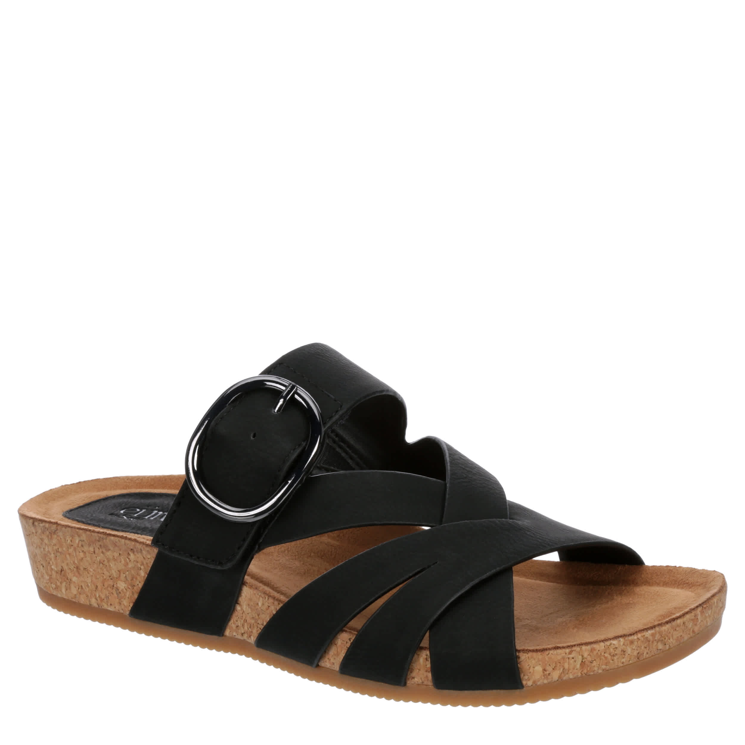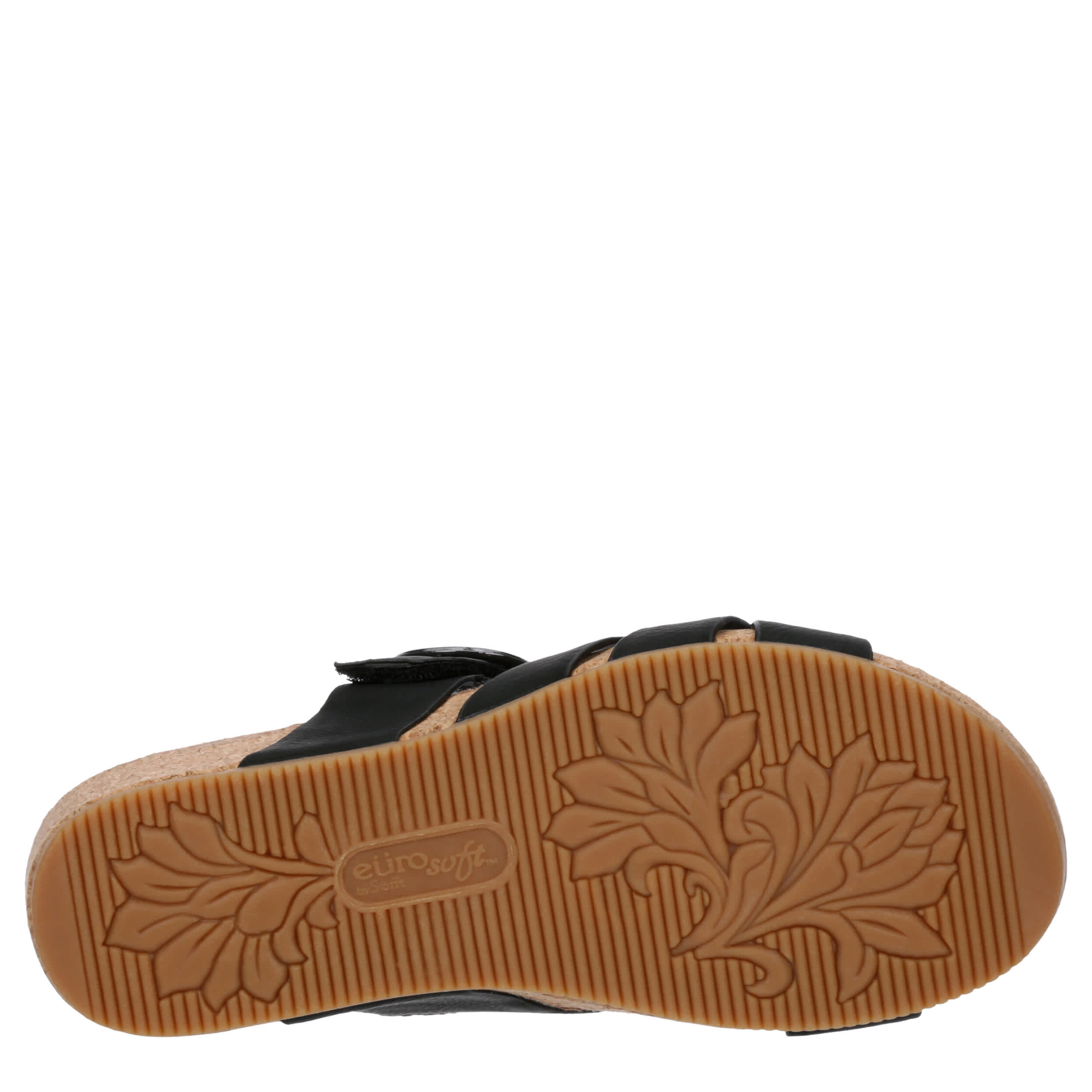Start your summer fashion show with the Eurosoft Gwenda women's sandal. Featuriing a faux leather upper with a gore insert for a secure fit, this wedge slide has a stylish, large buckle accent. The footbed supports every step with Memory Foam and arch support, while the cork-inspired heel offers nice lift.