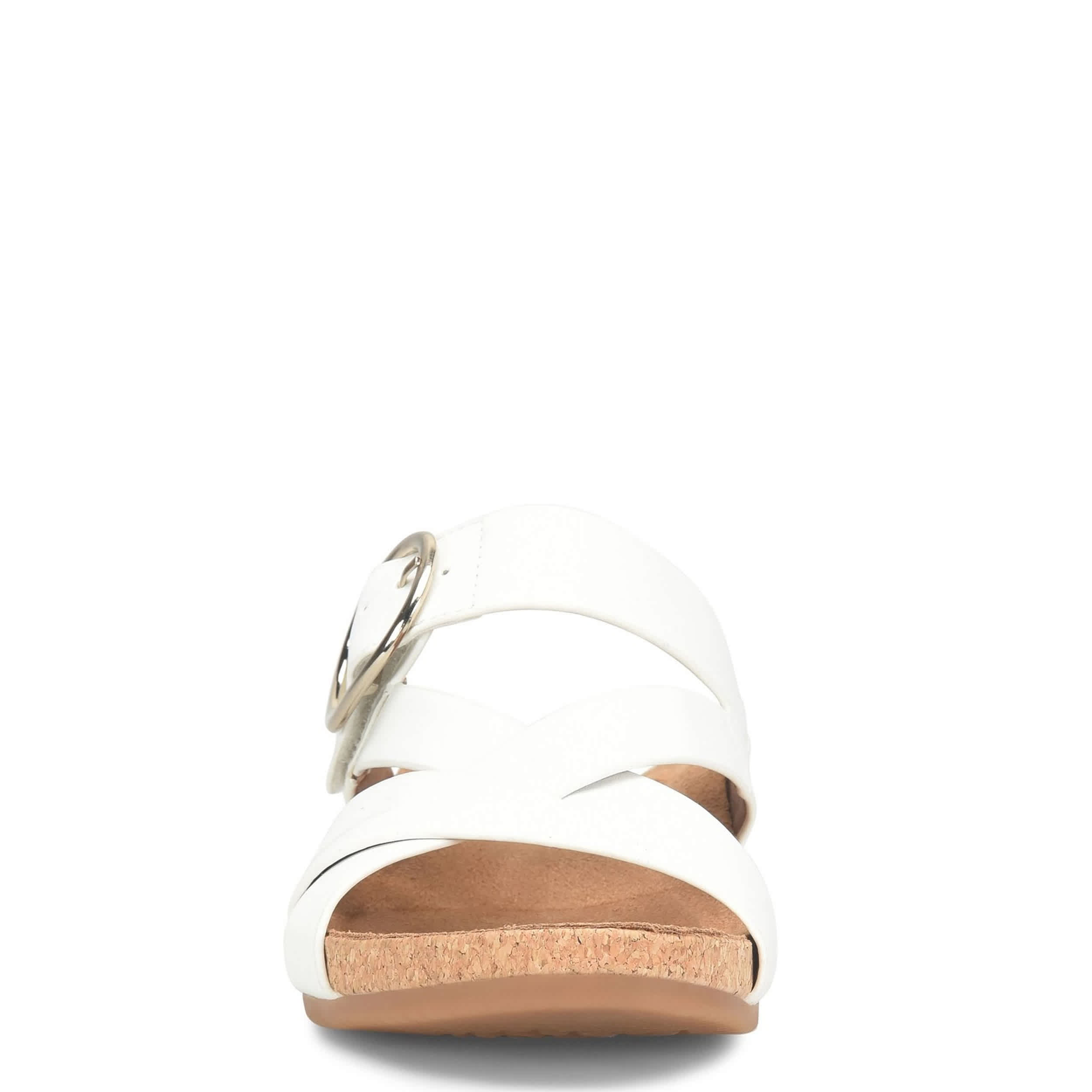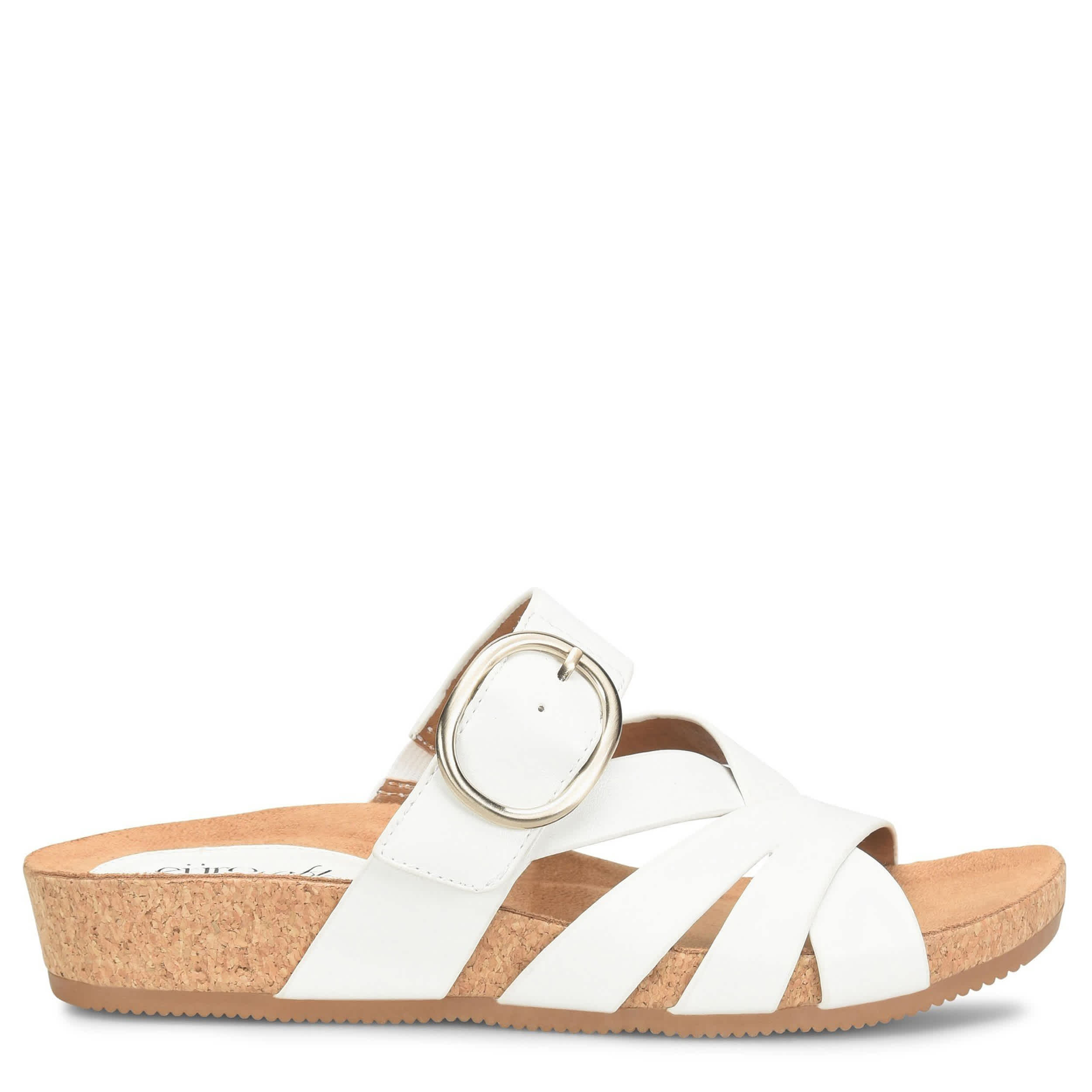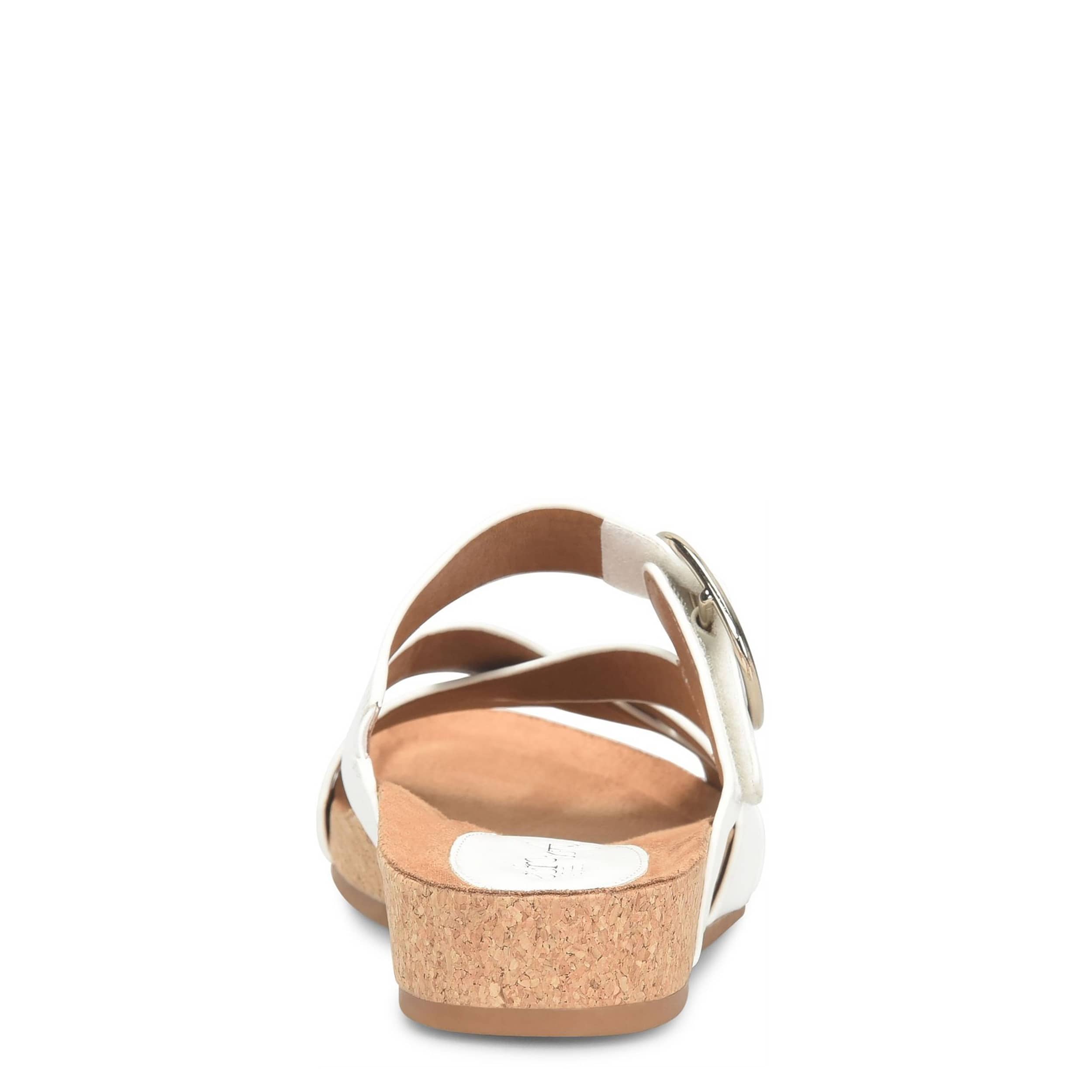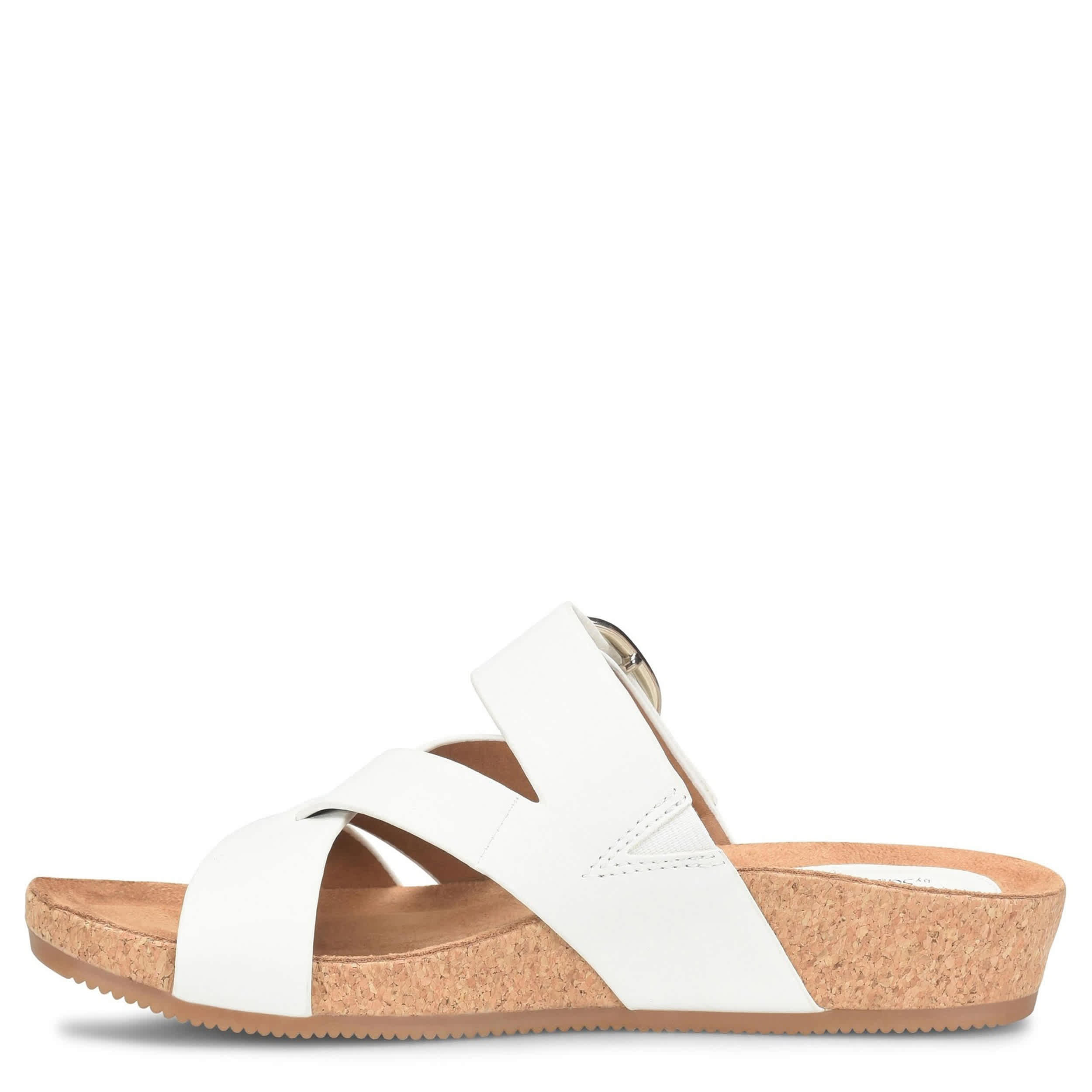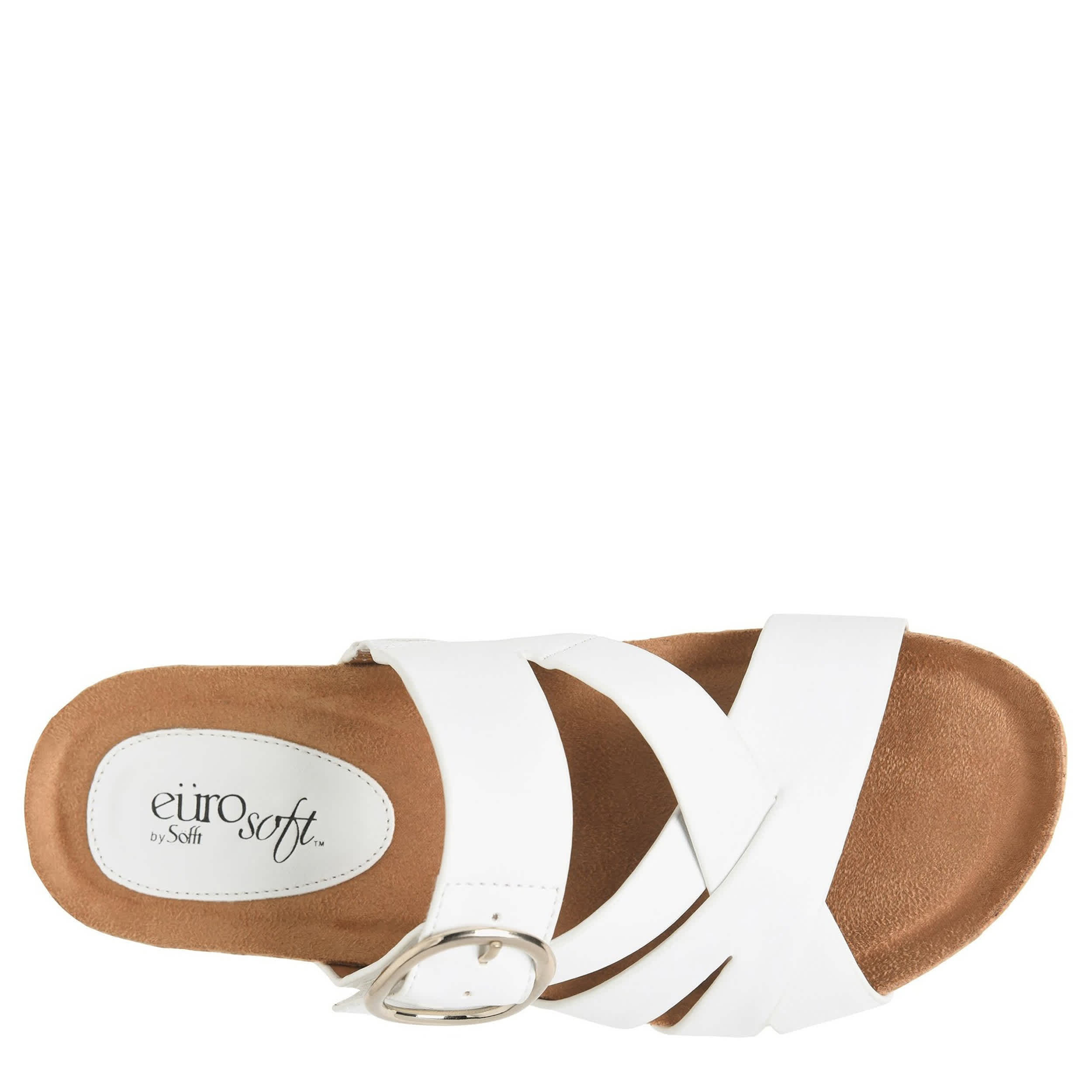 Start your summer fashion show with the Eurosoft Gwenda women's sandal. Featuriing a faux leather upper with a gore insert for a secure fit, this wedge slide has a stylish, large buckle accent. The footbed supports every step with Memory Foam and arch support, while the cork-inspired heel offers nice lift.