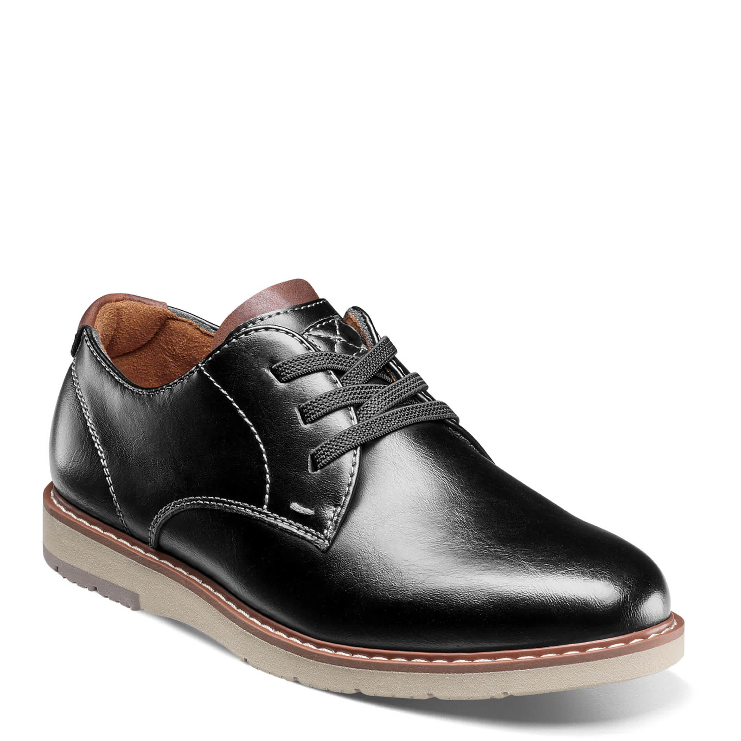 Keep that dressy energy everyday in the Vibe Jr oxford from Florsheim. With a faux leather upper featuring breathable textile linings, this shoe feels good with 24-hour comfort. The removable Comfortech footbed cushions every step, while the rubber traction pods & Flexsole technology make for even more comfort right away.