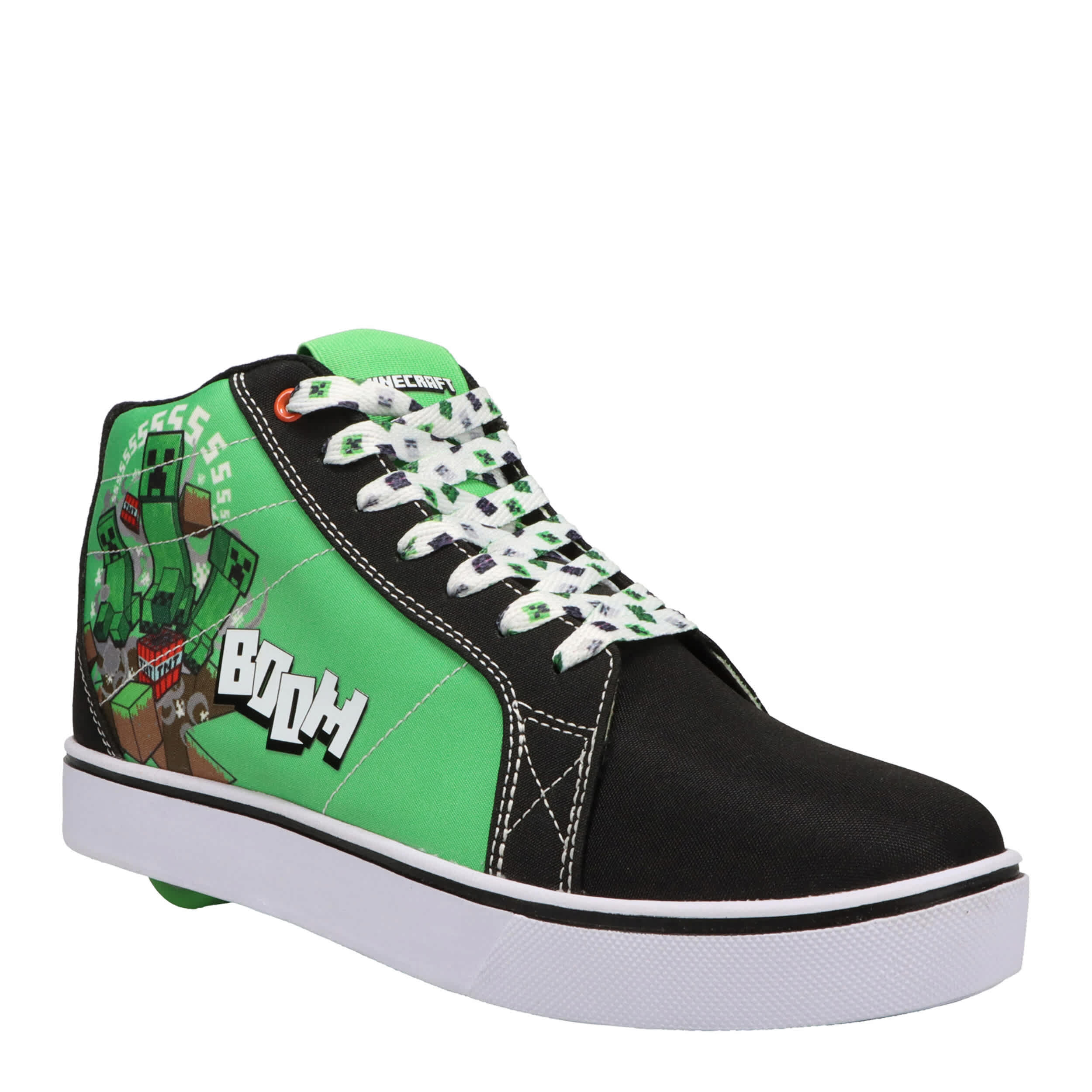 Boost his style level with the versatile Heelys x Minecraft Racer 20 Mid boys' sneaker. Featuring screen-printed Minecraft graphics with built-in skate option, this lace-up skate shoe also has a removable wheel with a brake pad included in the heel. The padded footbed provides comfort while the outsole helps with durability.