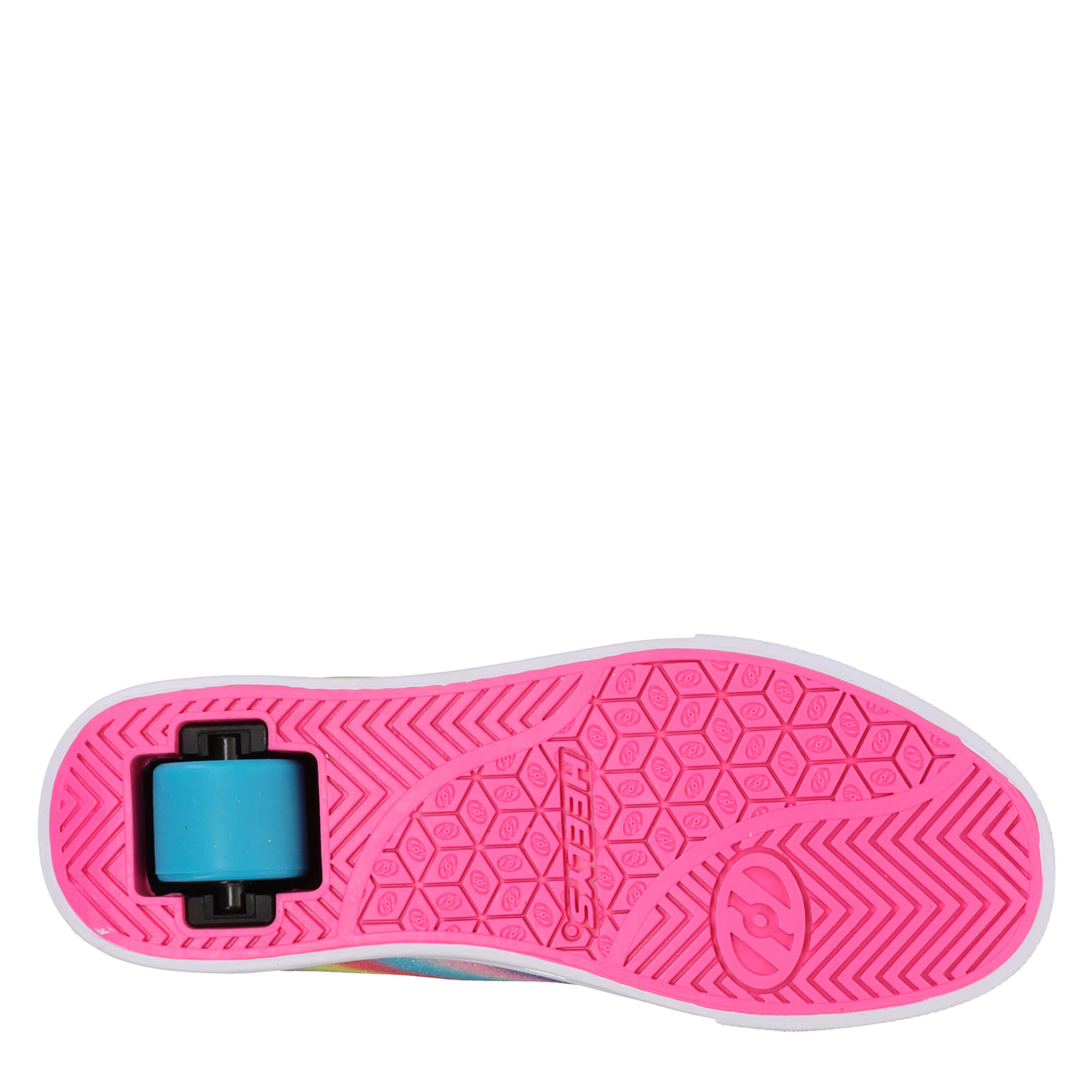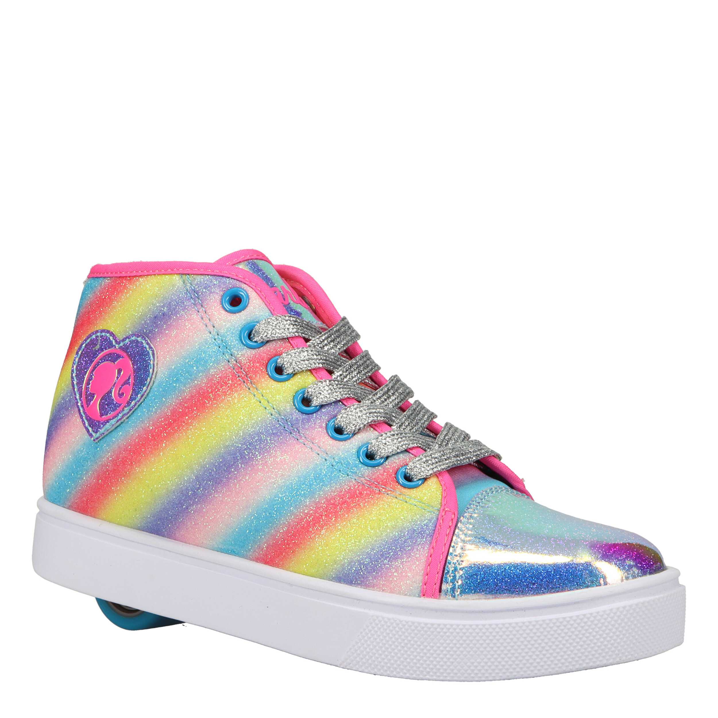 Support her fandom with the Heelys Veloz Barbie girls' sneaker. Featuring a glittery rainbow Barbie-patched upper with built-in skate option, this lace-up skate shoe also has a synthetic cap toe. The padded footbed provides comfort while the outsole helps with durability.