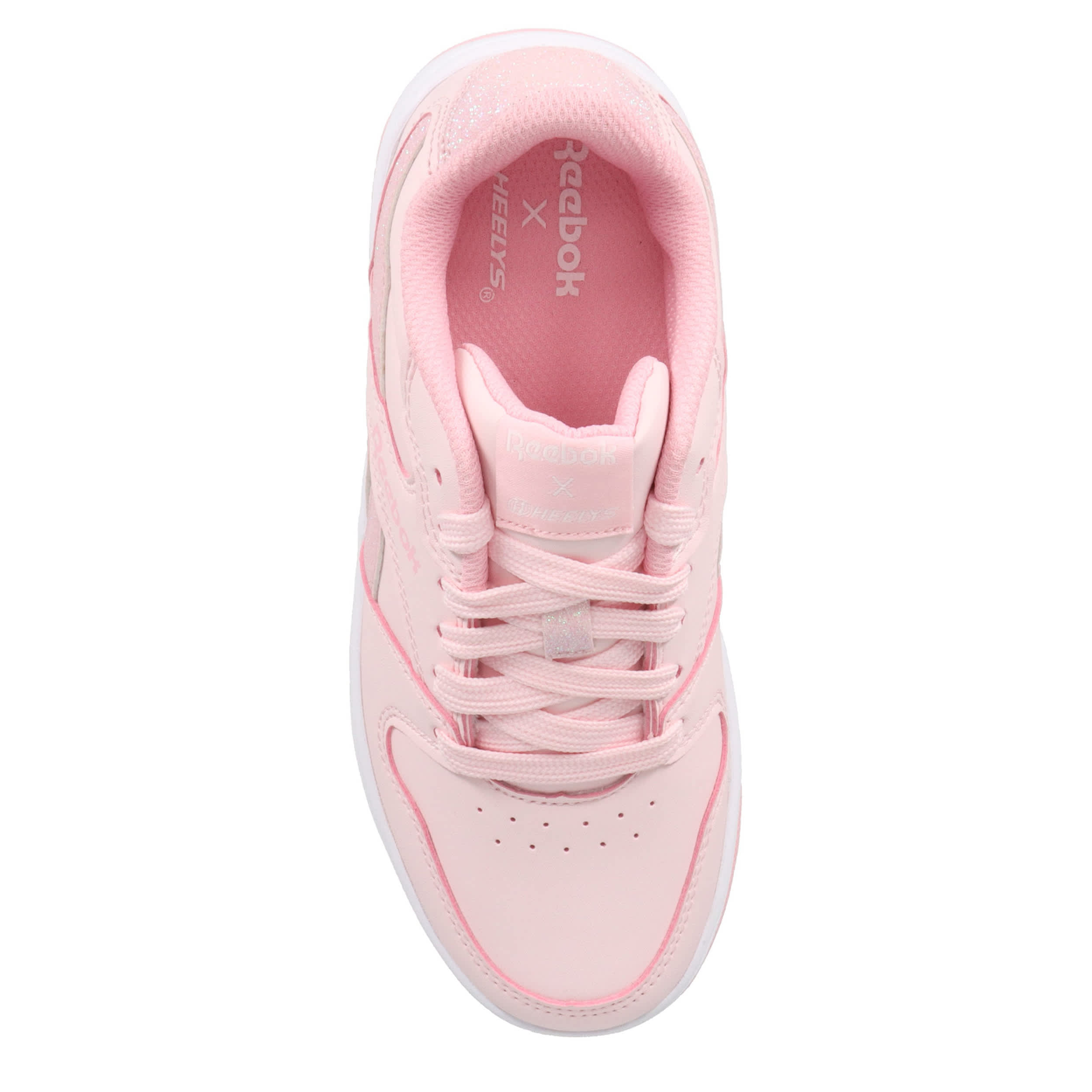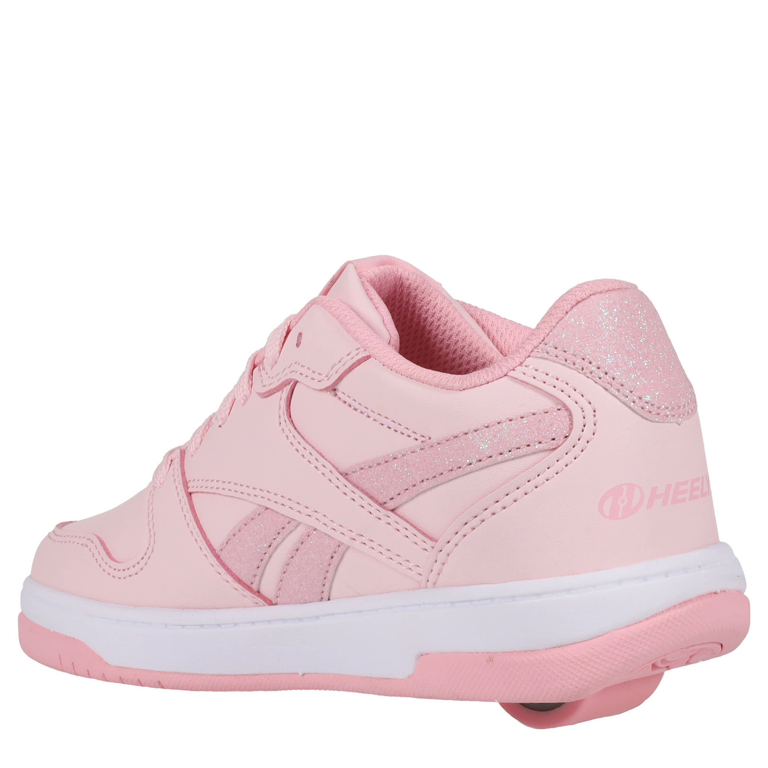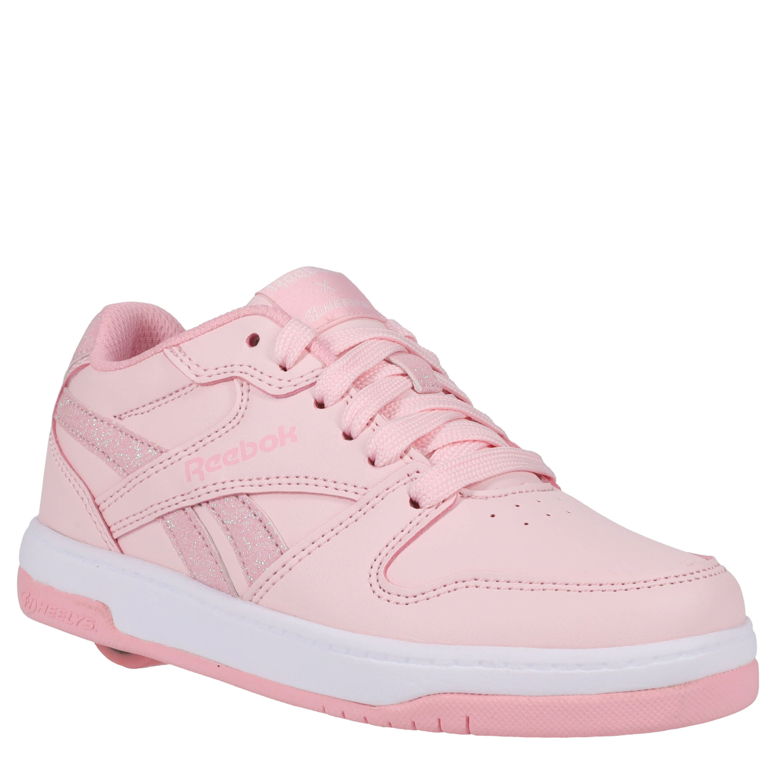 She'll love the Heelys Reebok Bb4500 Low girls' sneaker. With a Reebok-styled upper featuring a perforated toe and a low-profile rubber wheel, these shoes are fun with pops of glitter. Padding around the collar and tongue provides comfort while also securing the foot.
