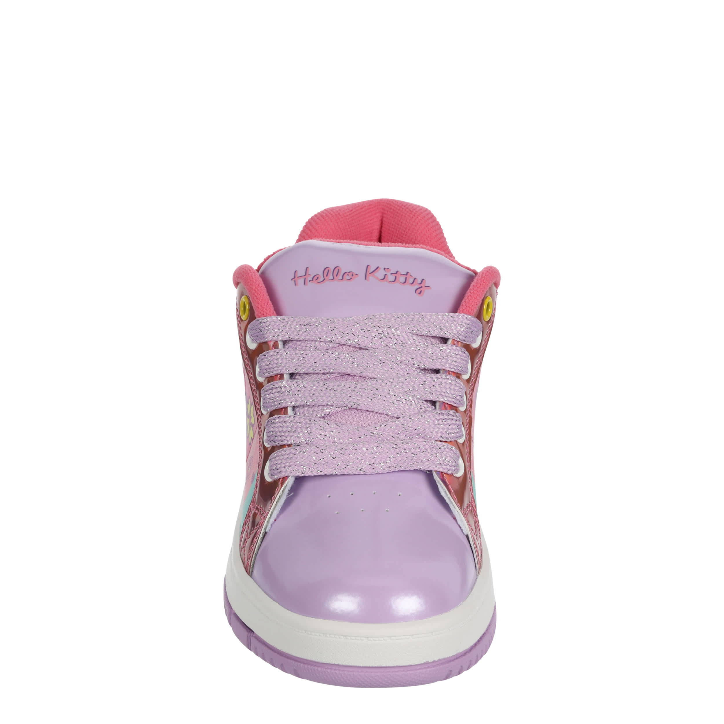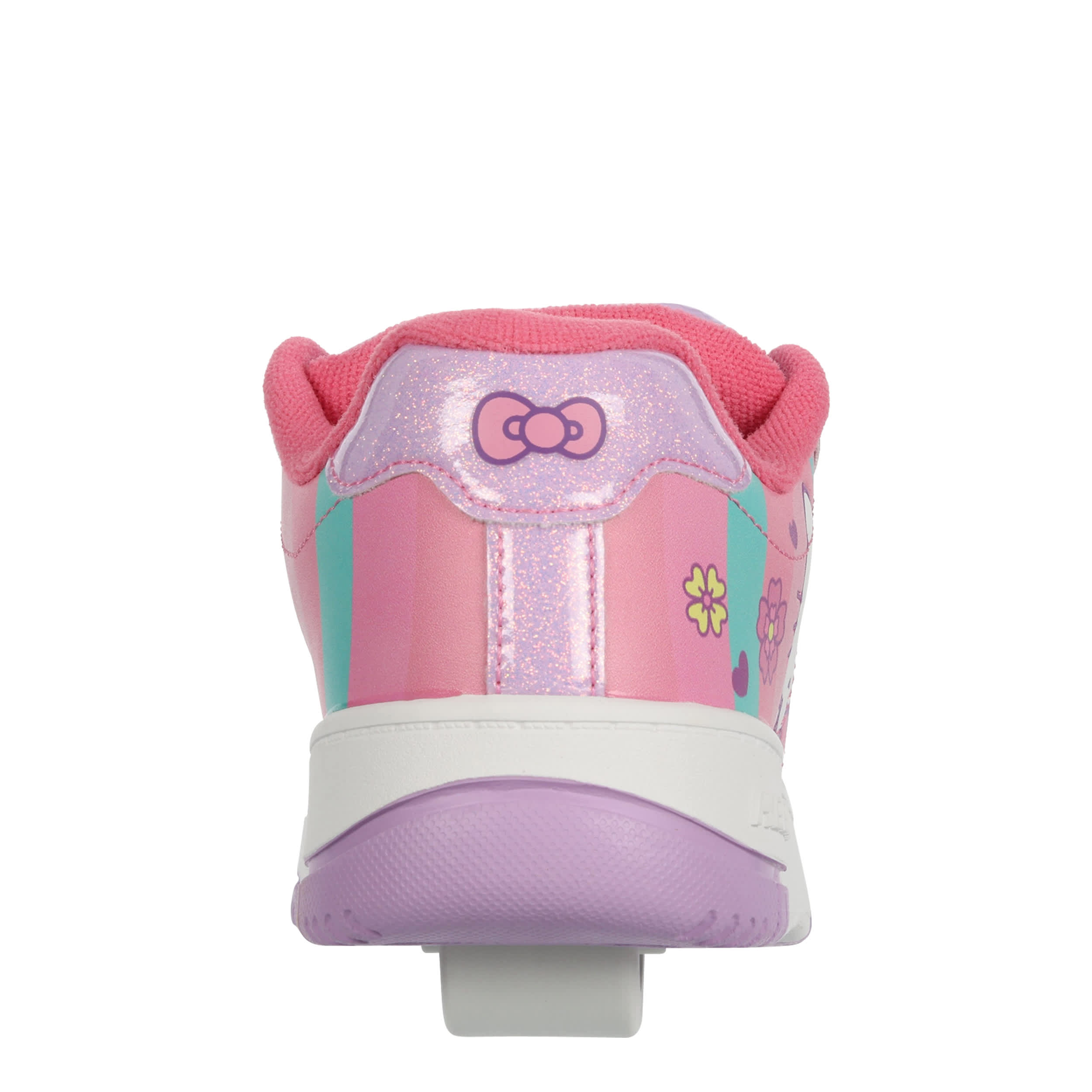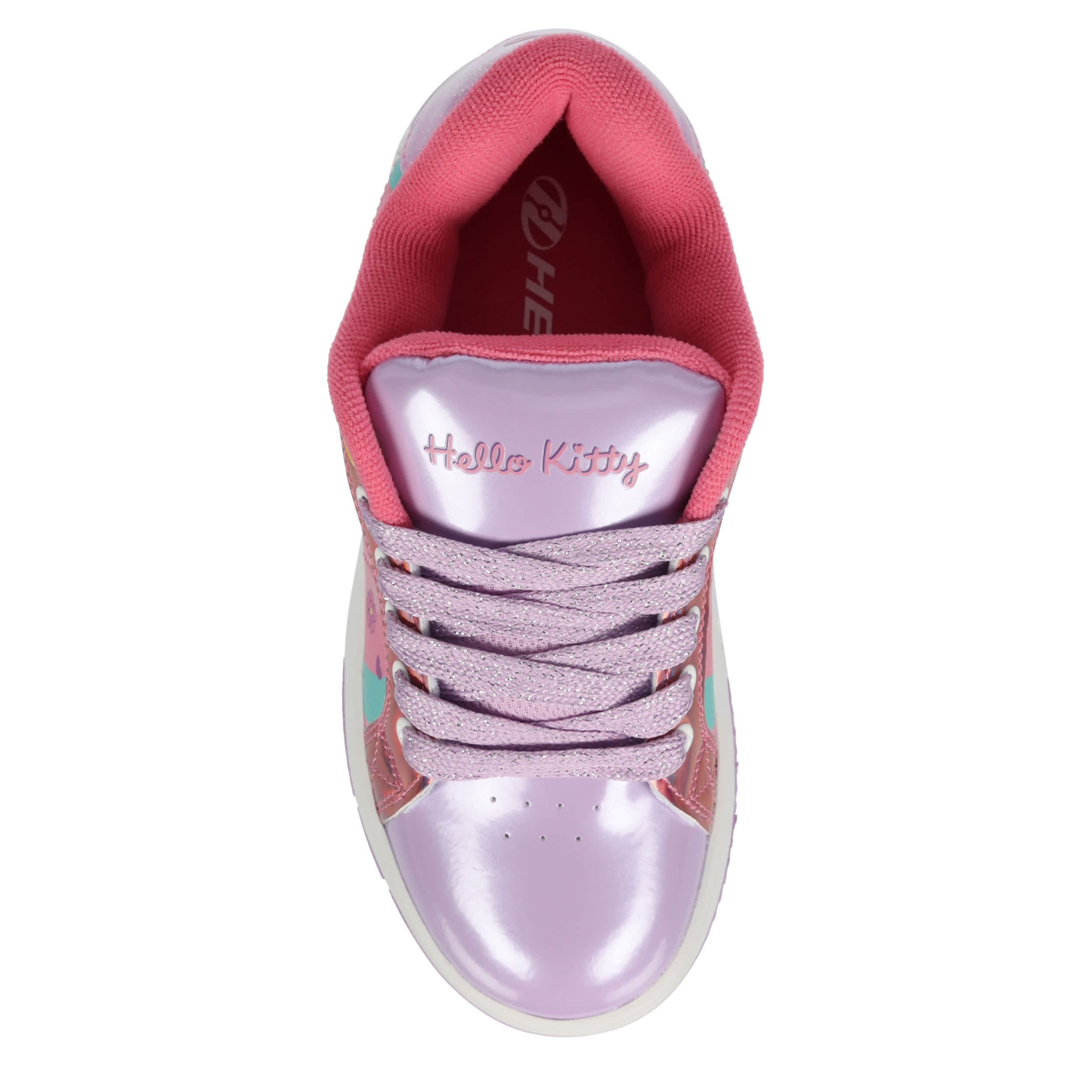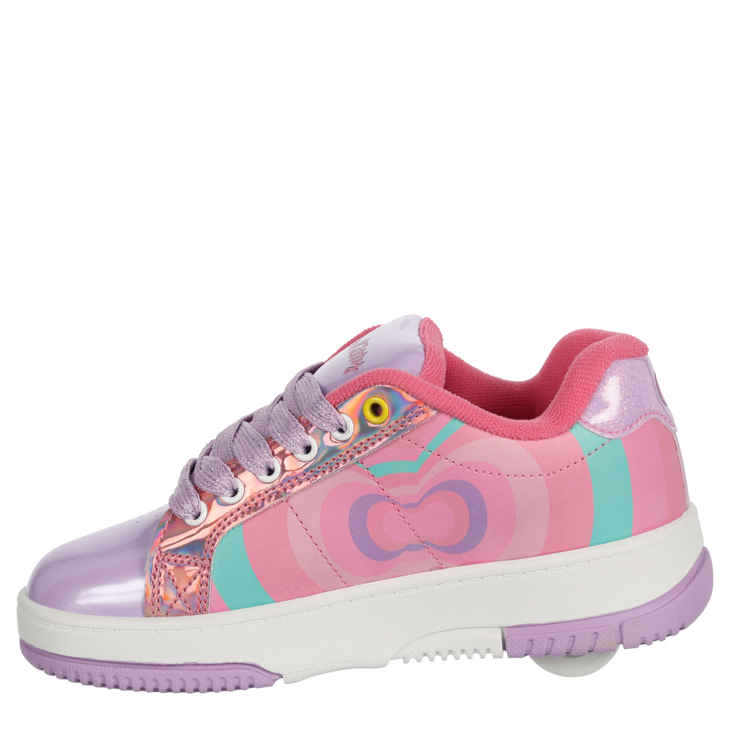 She'll have a blast in the Heelys Hello Kitty Kolect girls' sneaker. Featuring a screenprinted Hello Kitty graphic and glittery patent leather heel accent, this court-styled skate shoe has a low-profile rubber wheel and cute glittery laces. Padding around the collar and tongue provides comfort while also securing the foot.