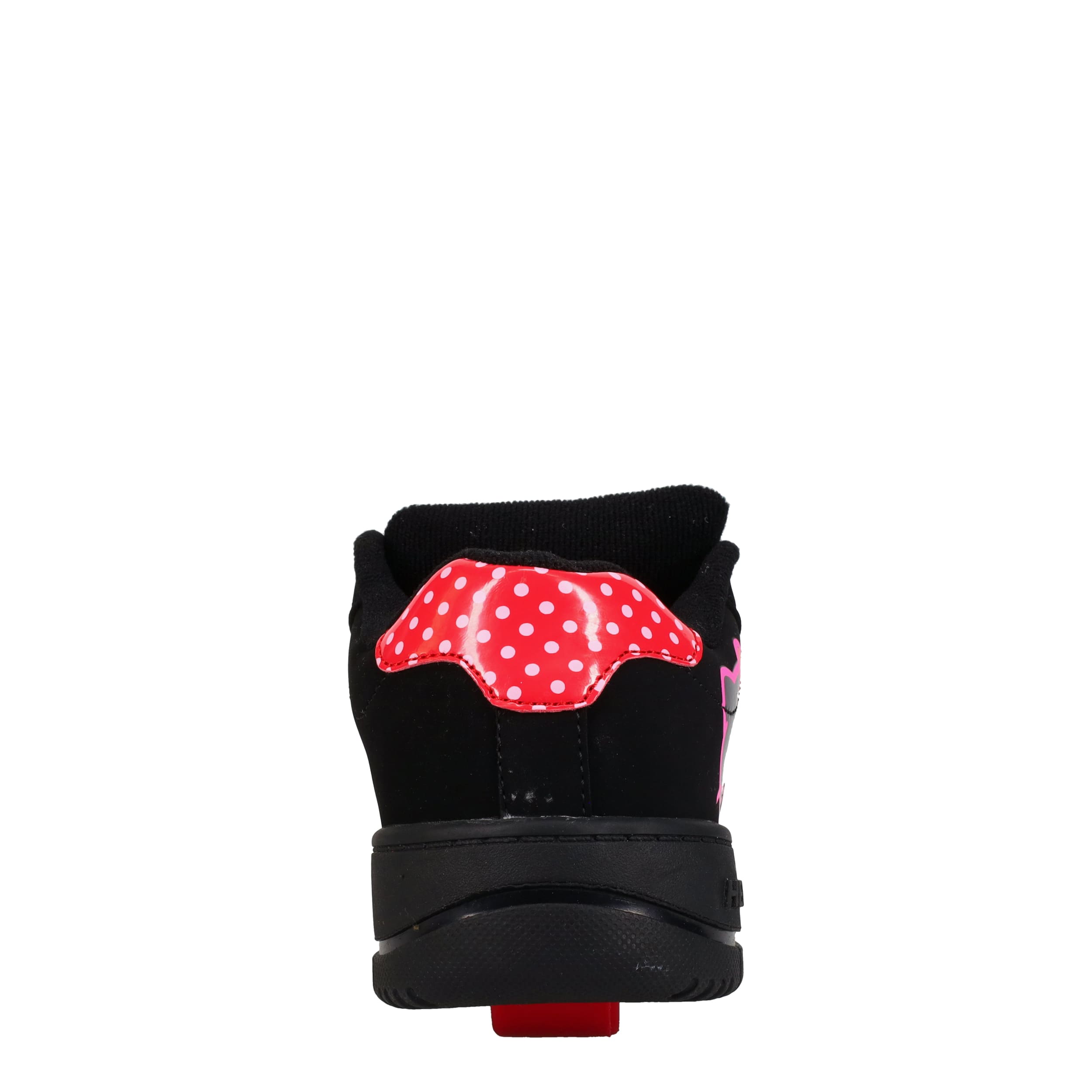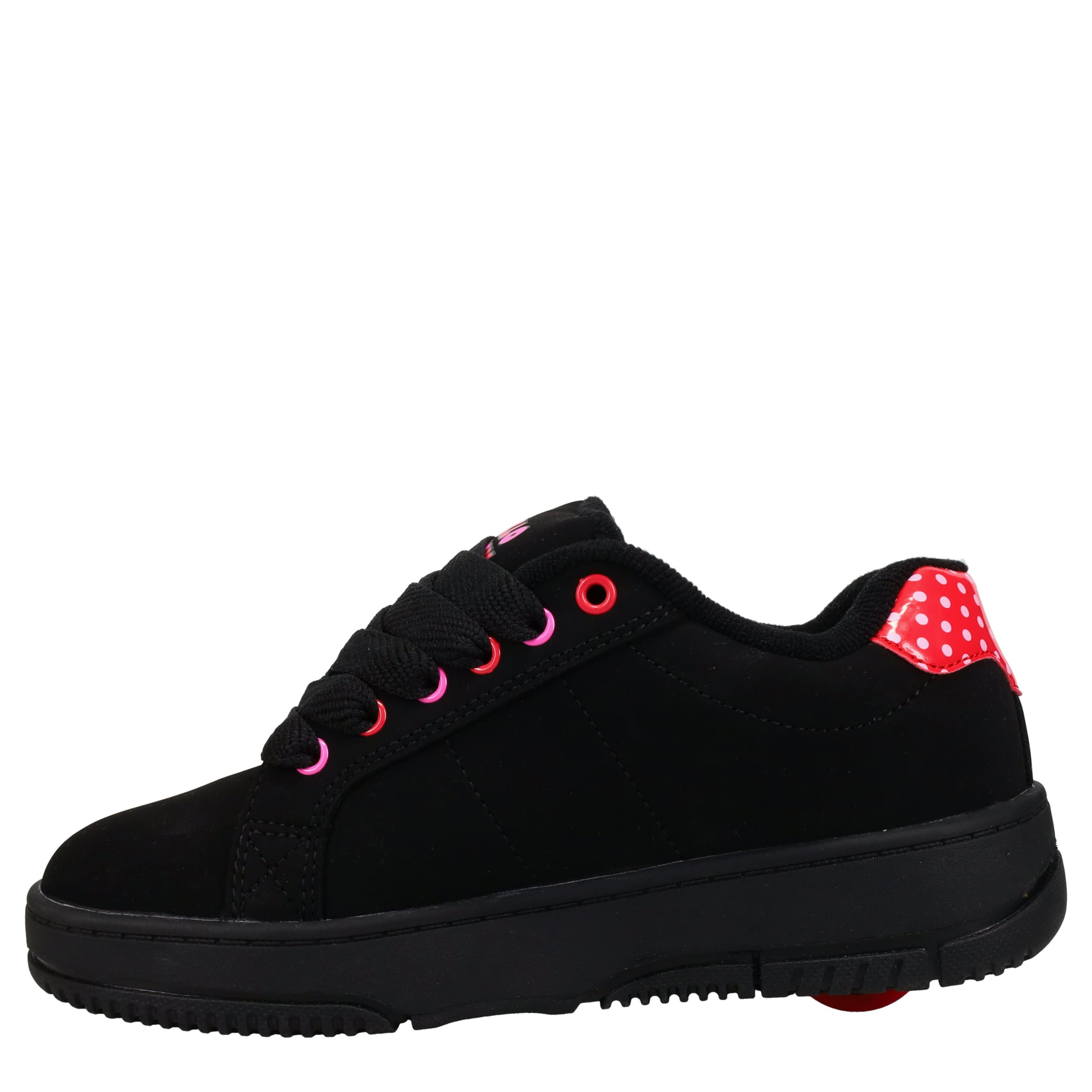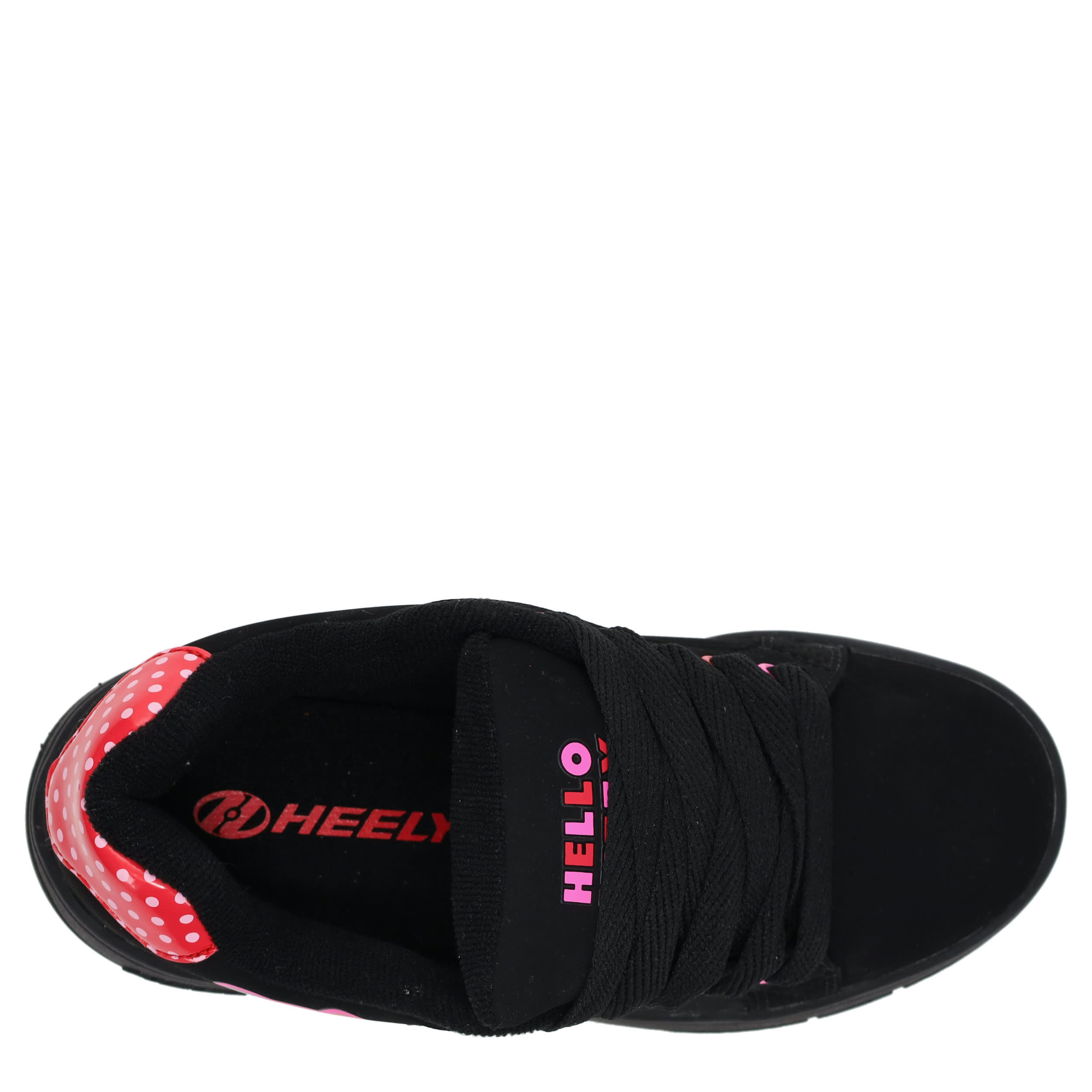She'll have a blast in the Heelys Hello Kitty Kolect girls' sneaker. Featuring a screenprinted Hello Kitty graphic and polka dotted patent leather heel accent, this court-styled skate shoe has a low-profile rubber wheel and all-black laces. Padding around the collar and tongue provides comfort while also securing the foot.